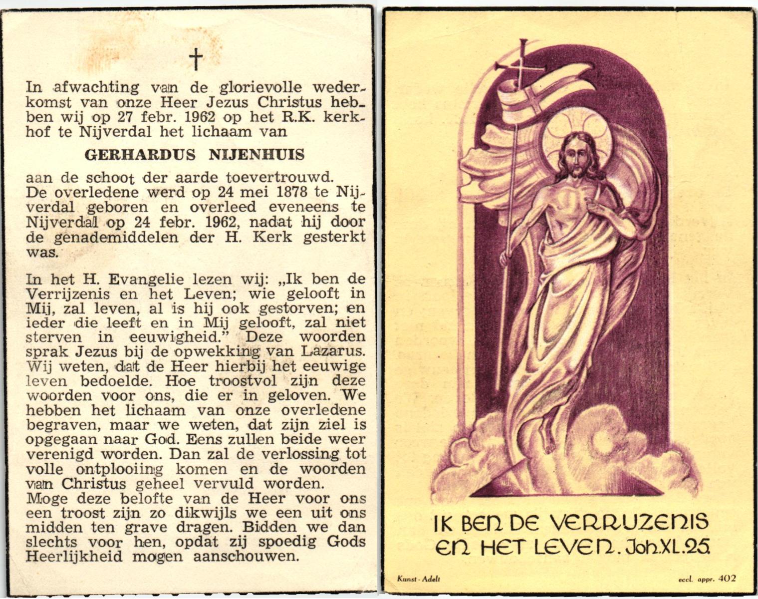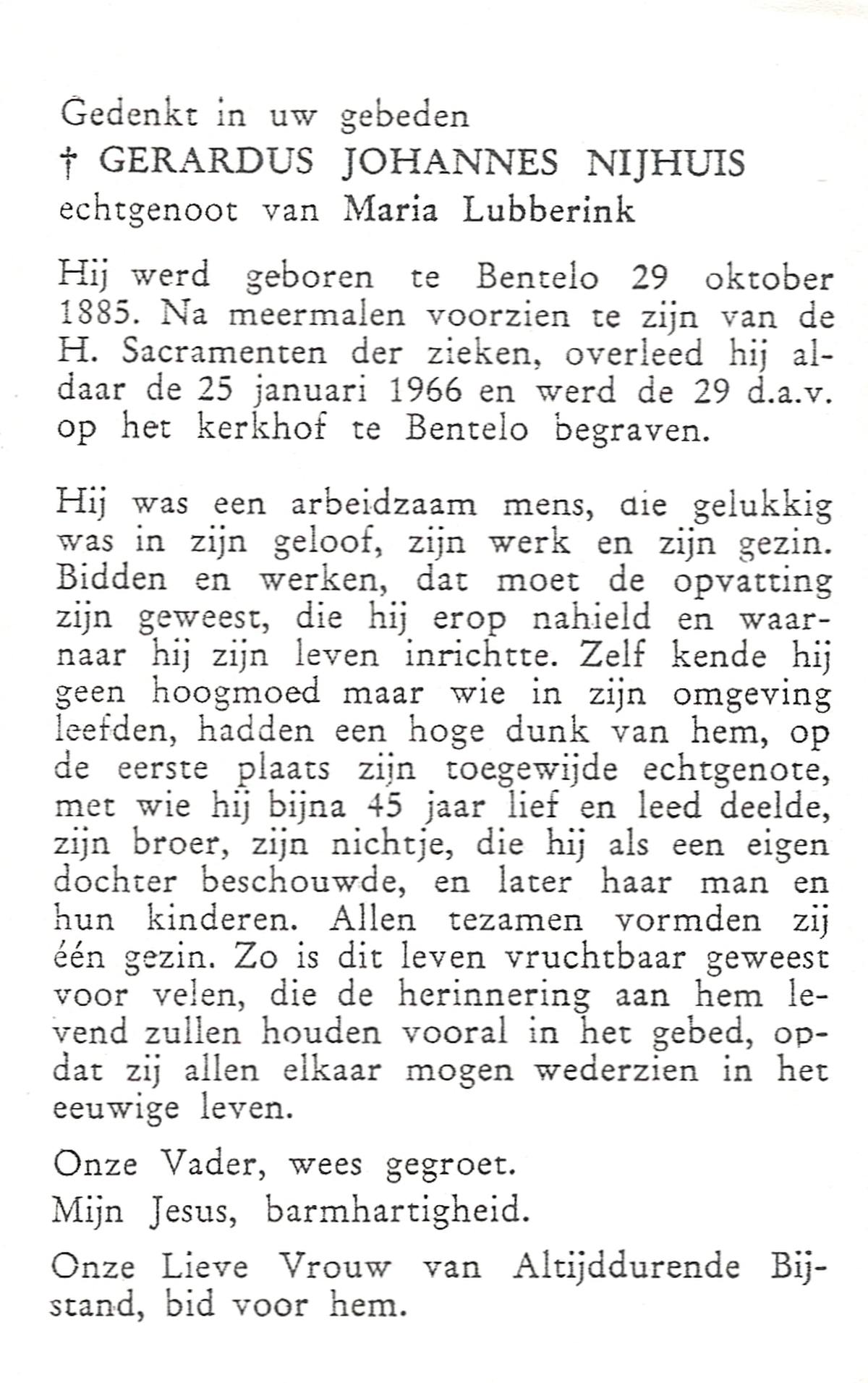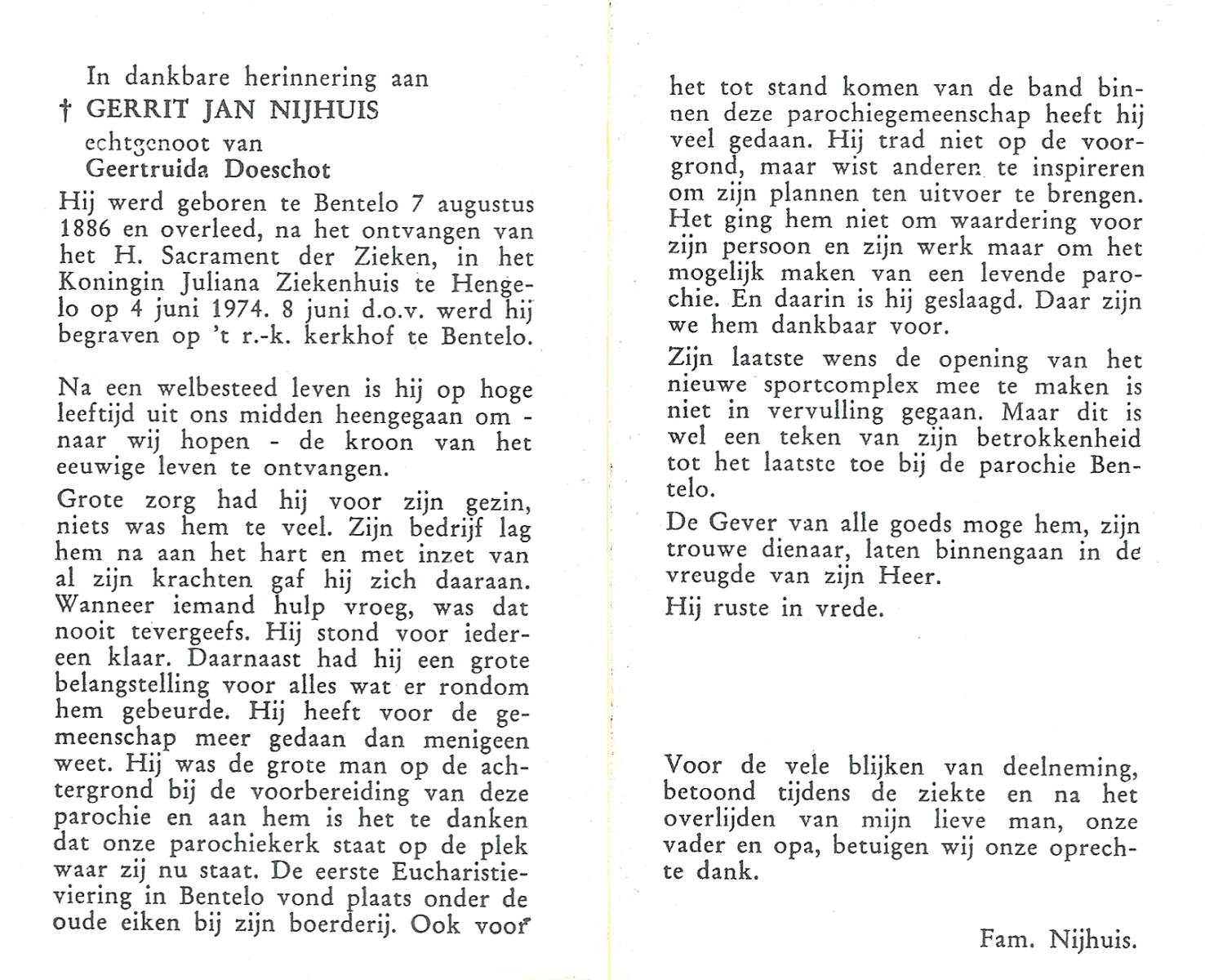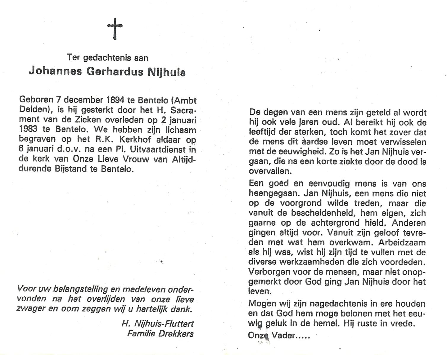 NIJHUIS, Johannes Gerhardus, geboren op 07-12-1894 te Bentelo, overleden op 2-1-1983 te Bentelo op 88-jarige leeftijd, begraven op 6-1-1983 te Bentelo.