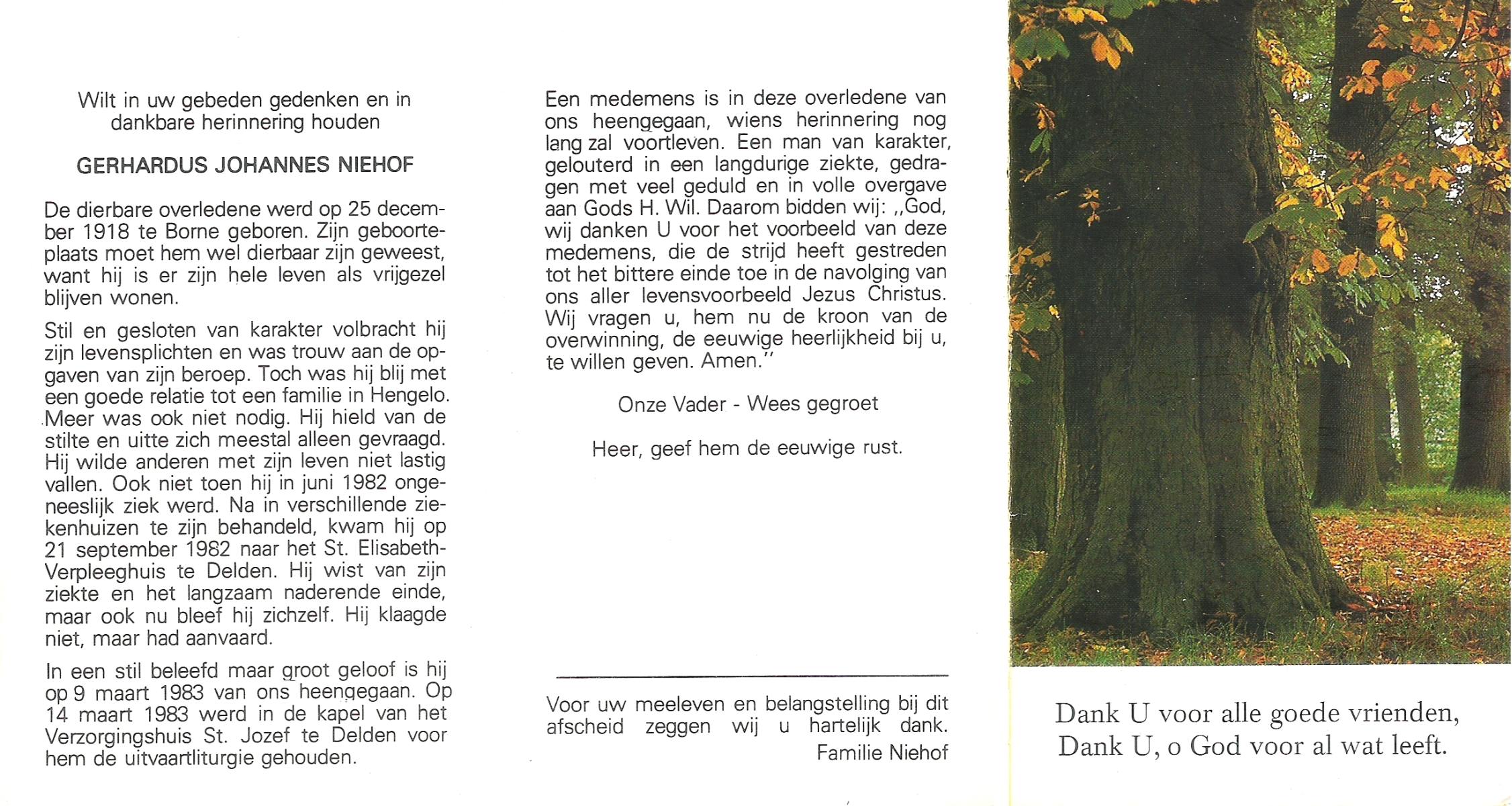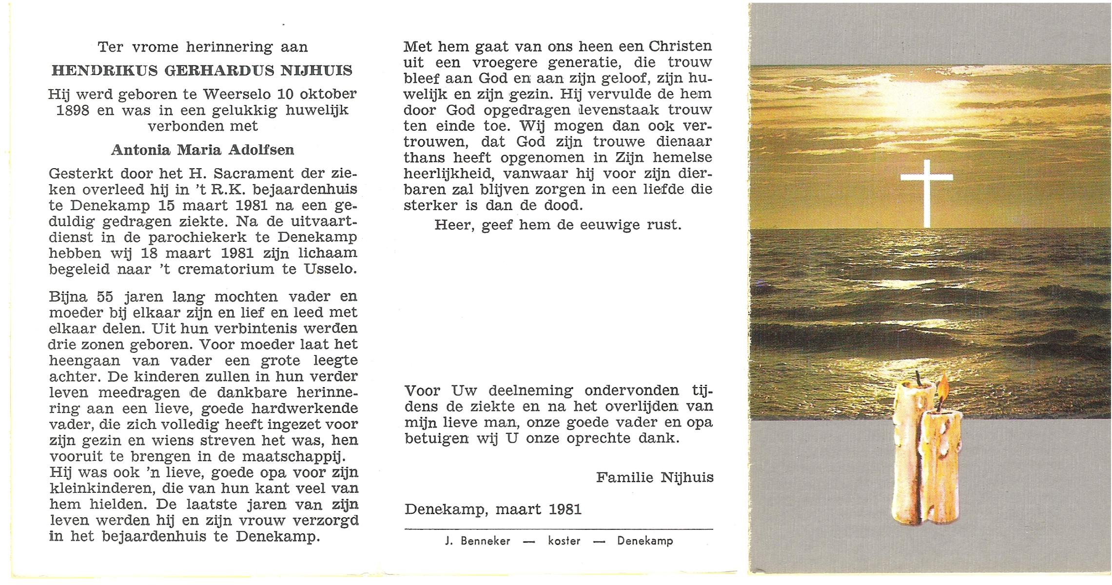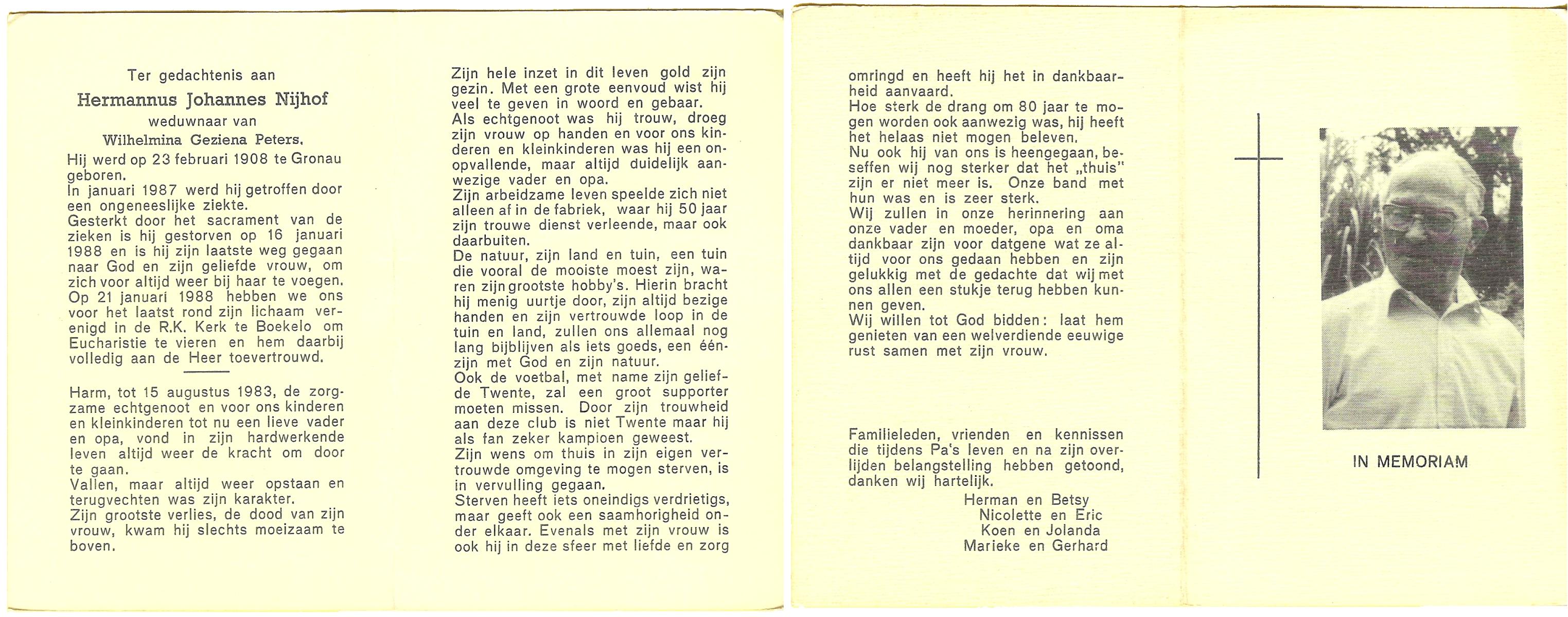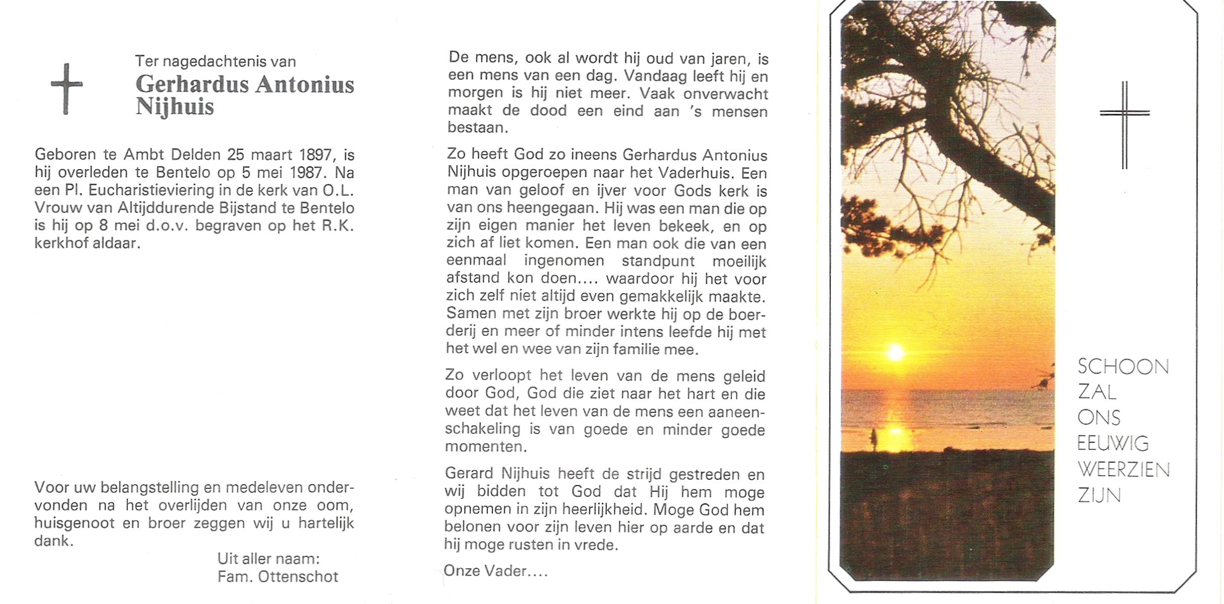 NIJHUIS, Johannes Gerhardus, geboren op 07-12-1894 te Bentelo, overleden op 2-1-1983 te Bentelo op 88-jarige leeftijd, begraven op 6-1-1983 te Bentelo.