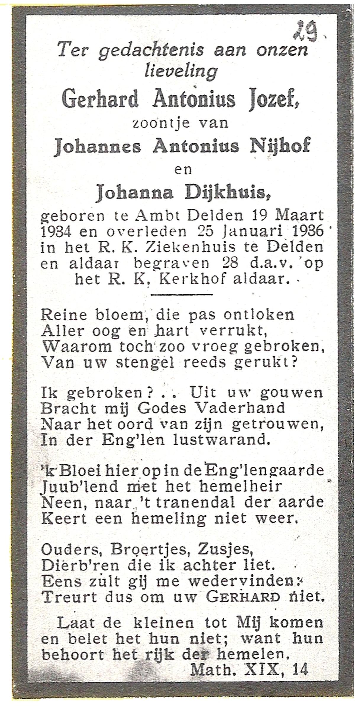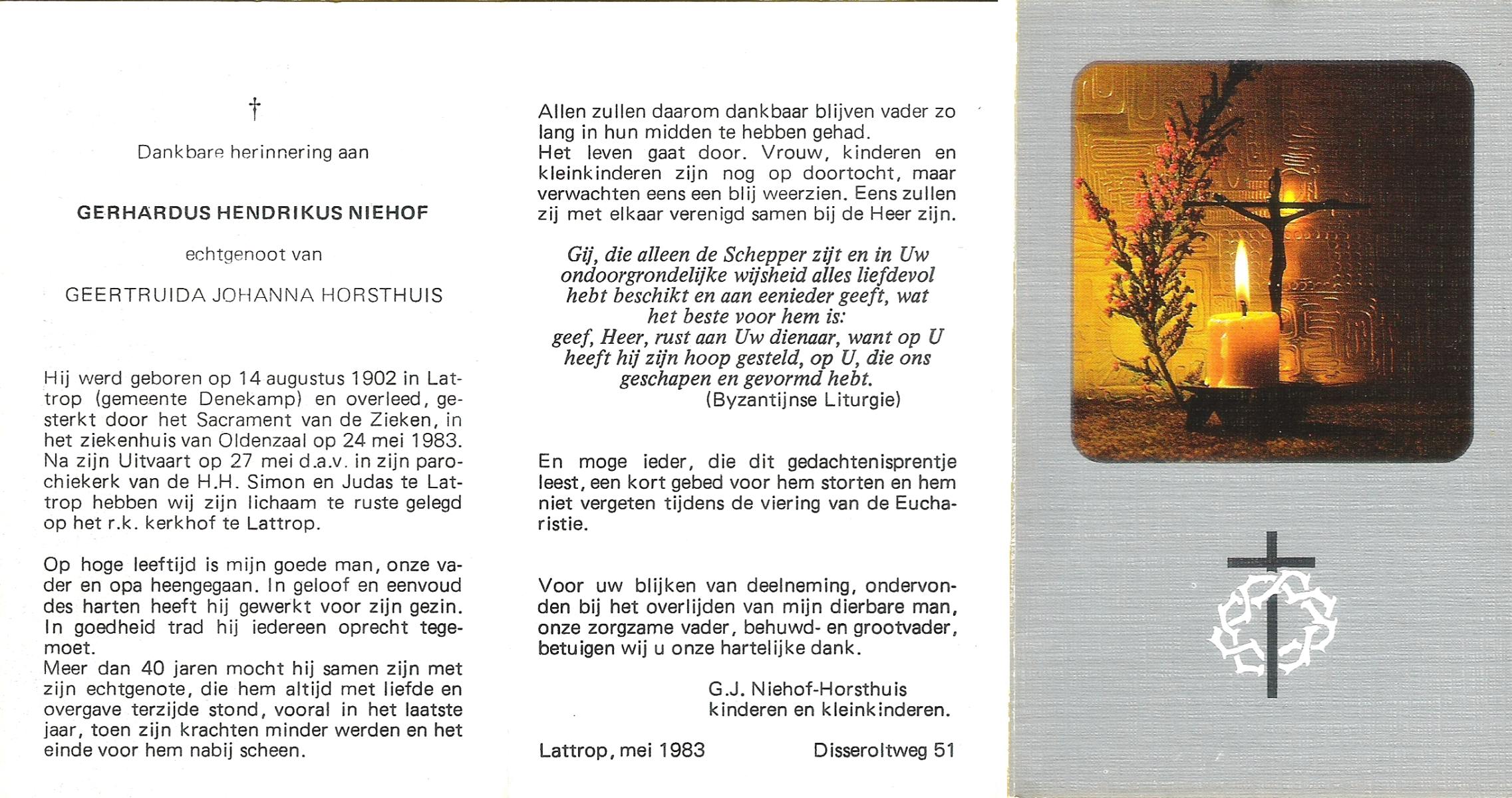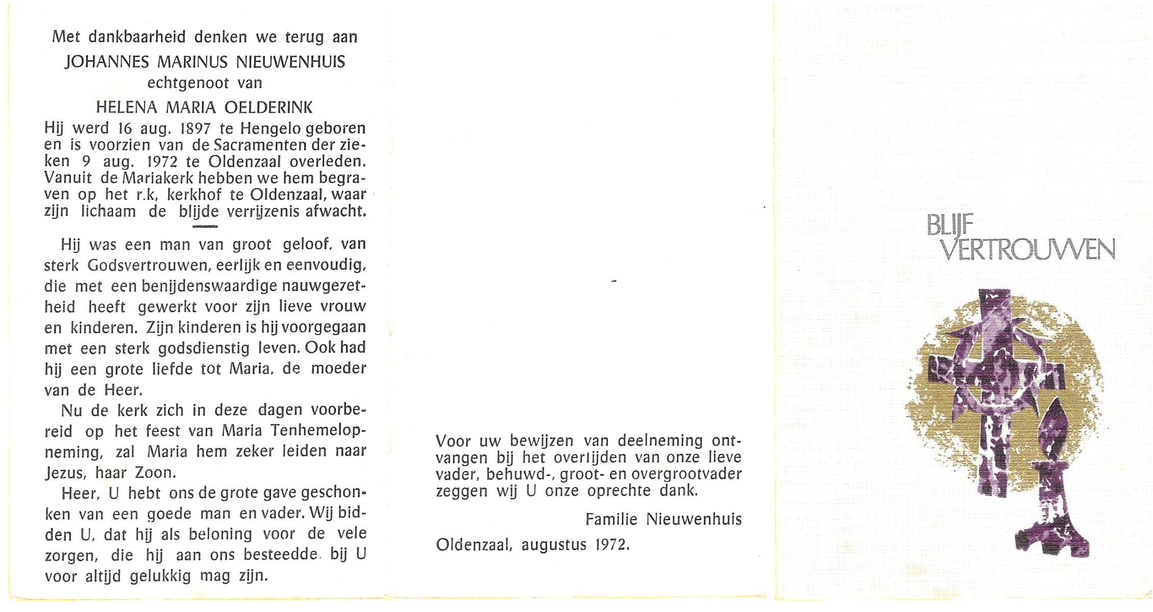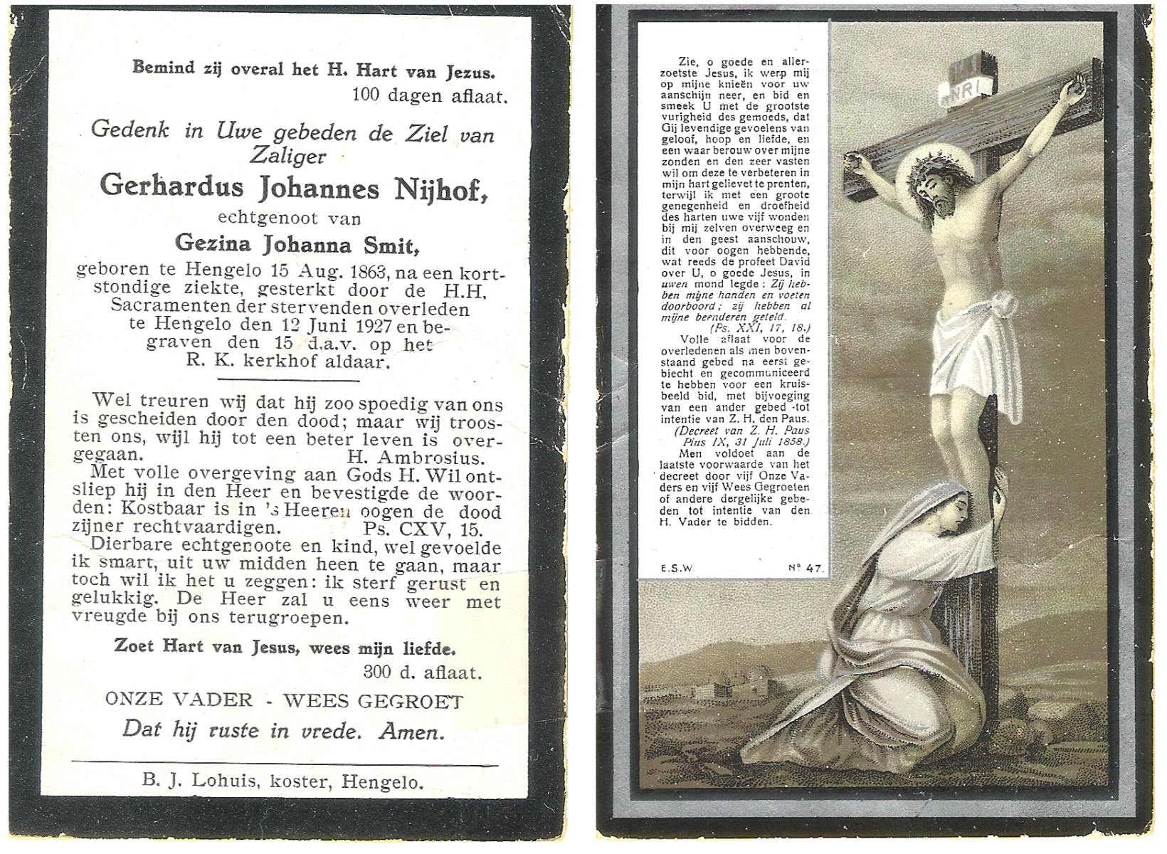 NIJHUIS, Johannes Gerhardus, geboren op 07-12-1894 te Bentelo, overleden op 2-1-1983 te Bentelo op 88-jarige leeftijd, begraven op 6-1-1983 te Bentelo.