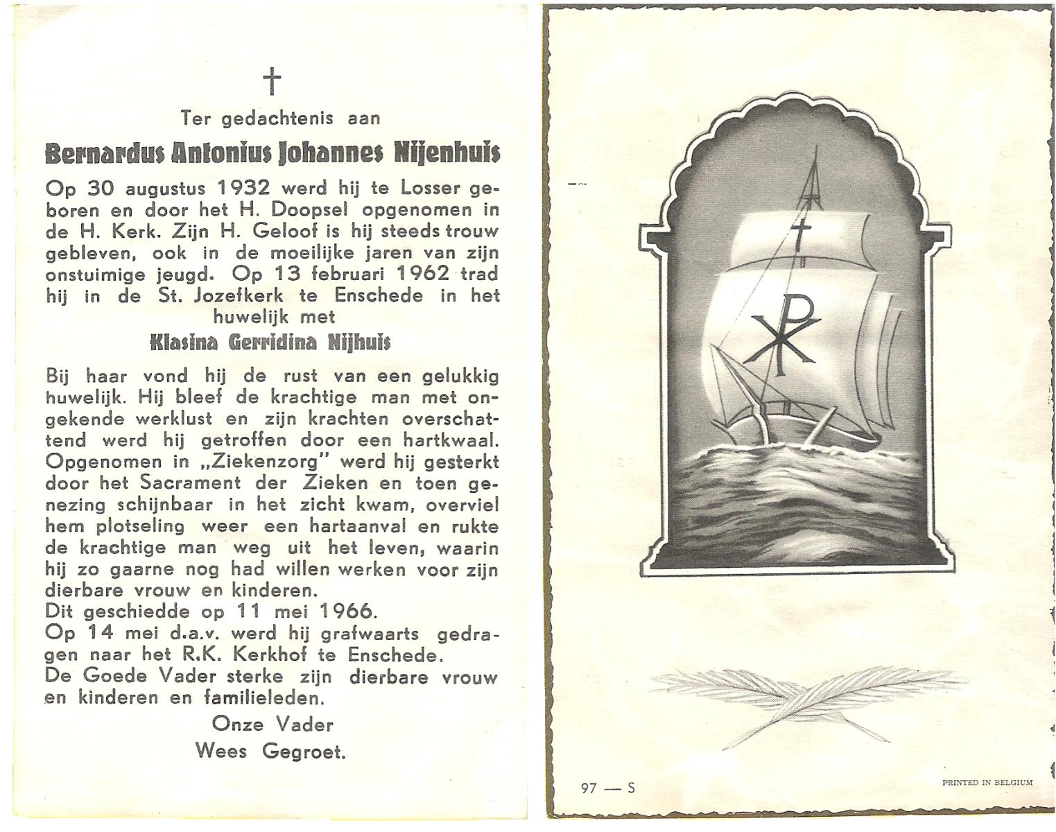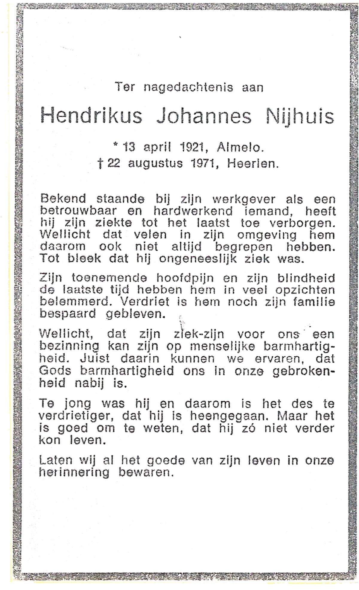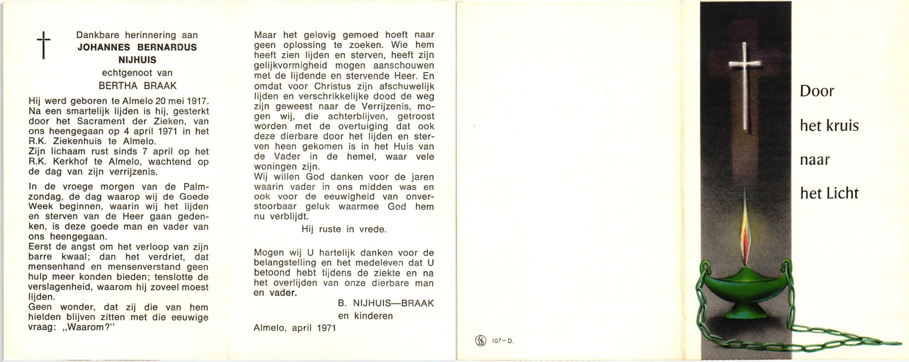 NIJHUIS, Johannes Bernardus, geboren op 20-5-1917 te Almelo, overleden op 4-4-1971 te Almelo, ziekenhuis op 53-jarige leeftijd, begraven op 7-4-1971 te Almelo.