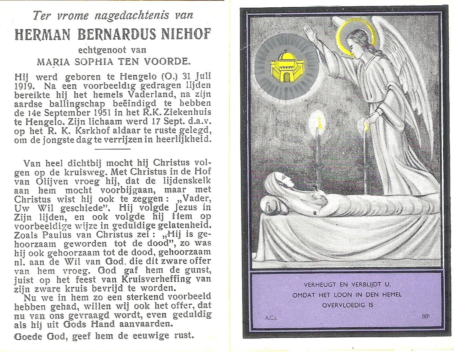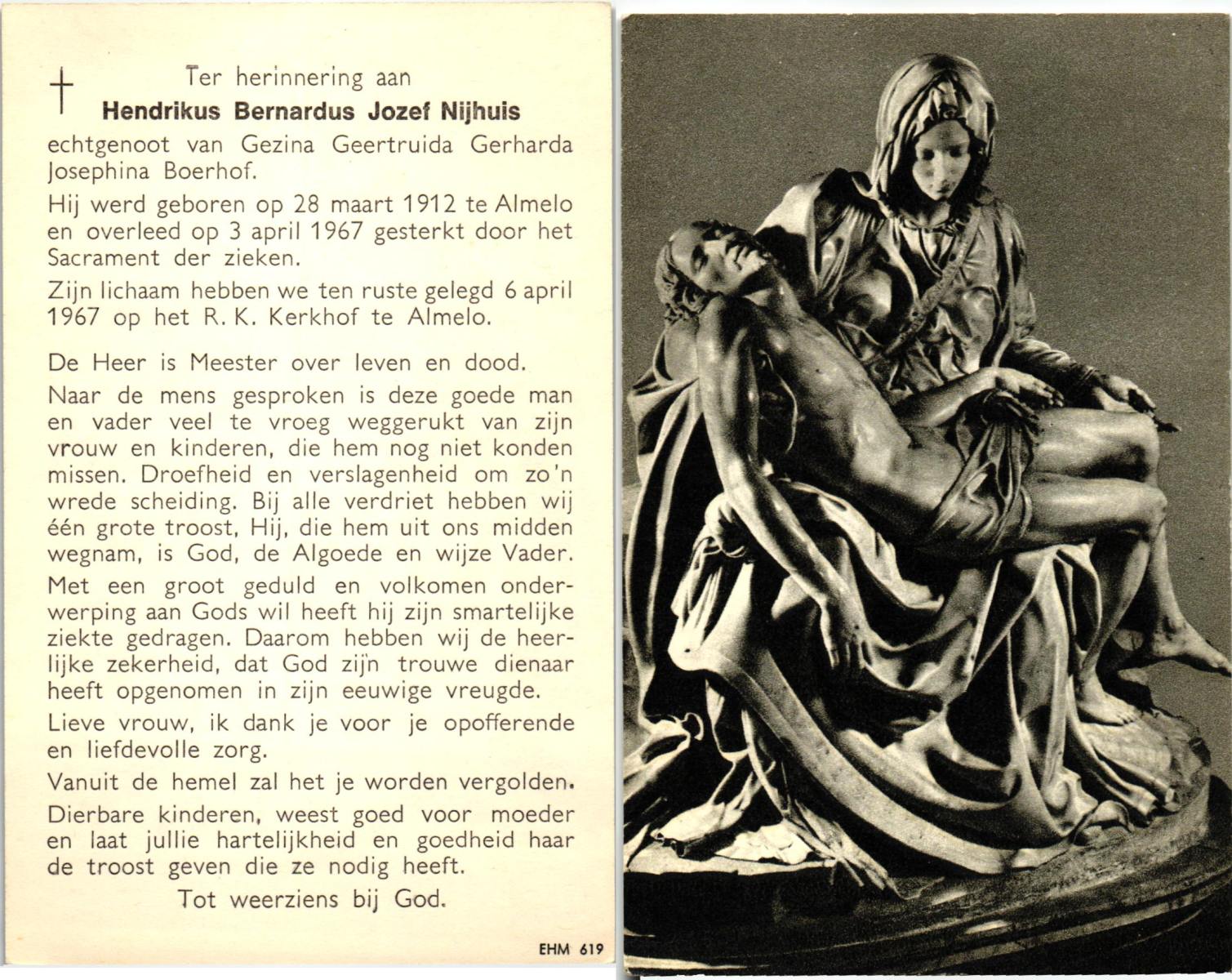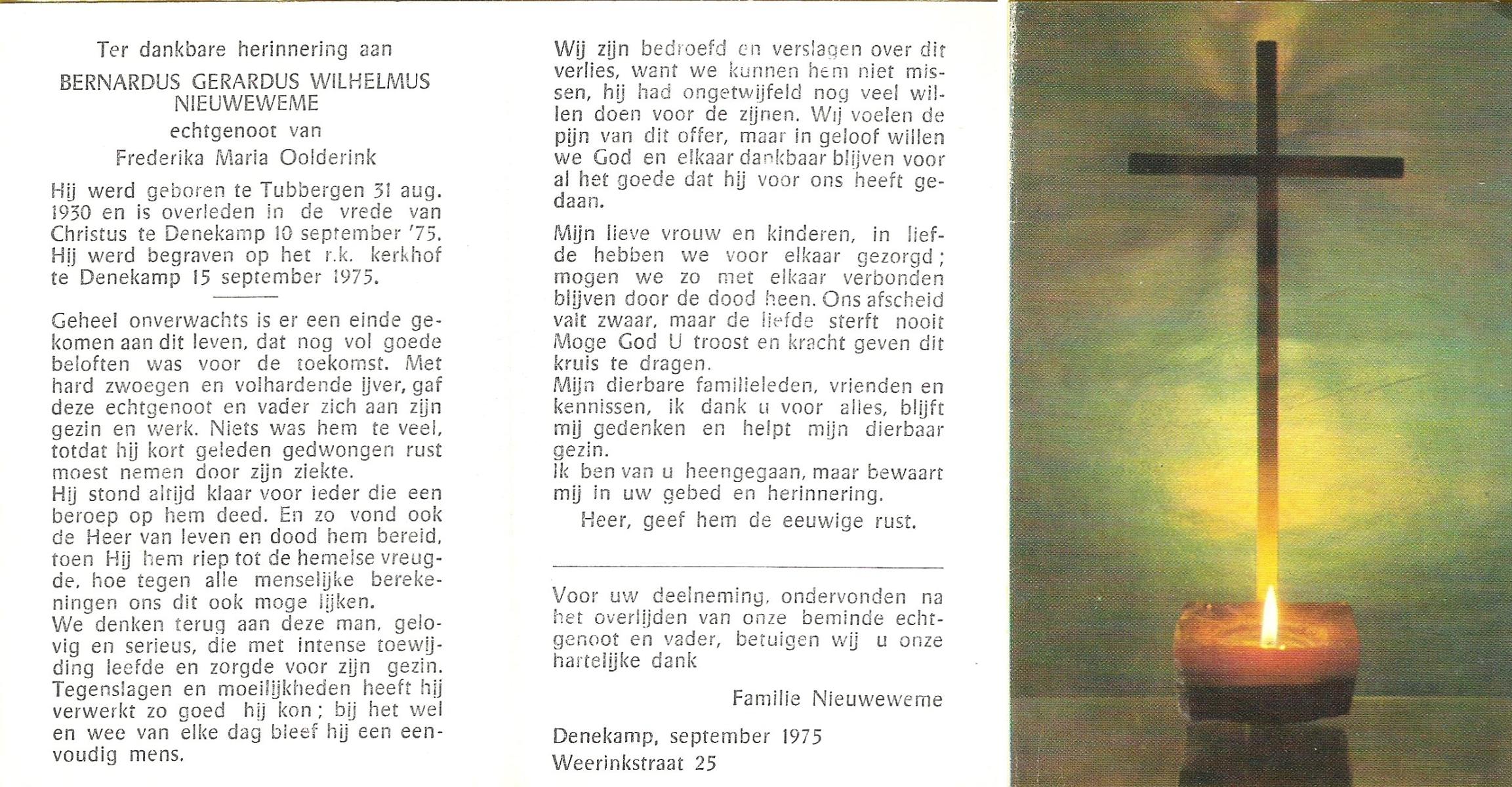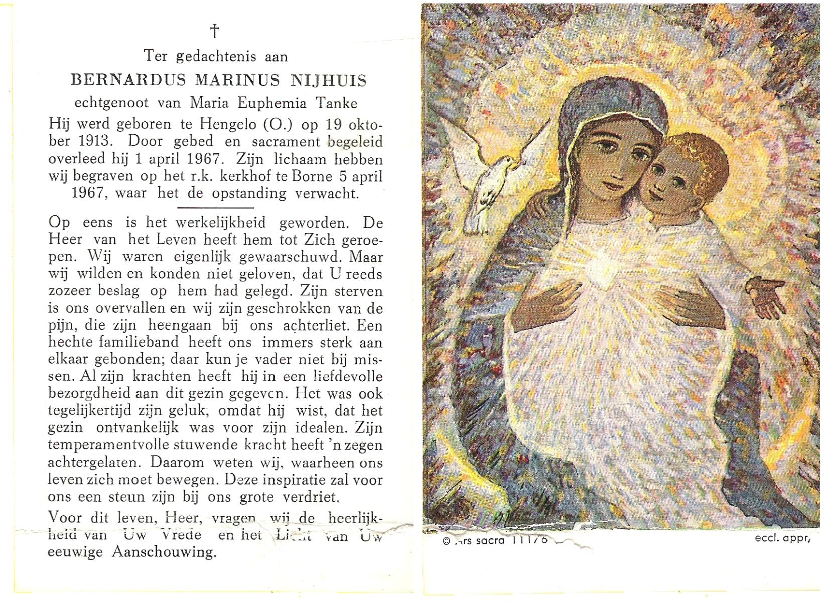 NIJHUIS, Johannes Bernardus, geboren op 20-5-1917 te Almelo, overleden op 4-4-1971 te Almelo, ziekenhuis op 53-jarige leeftijd, begraven op 7-4-1971 te Almelo.