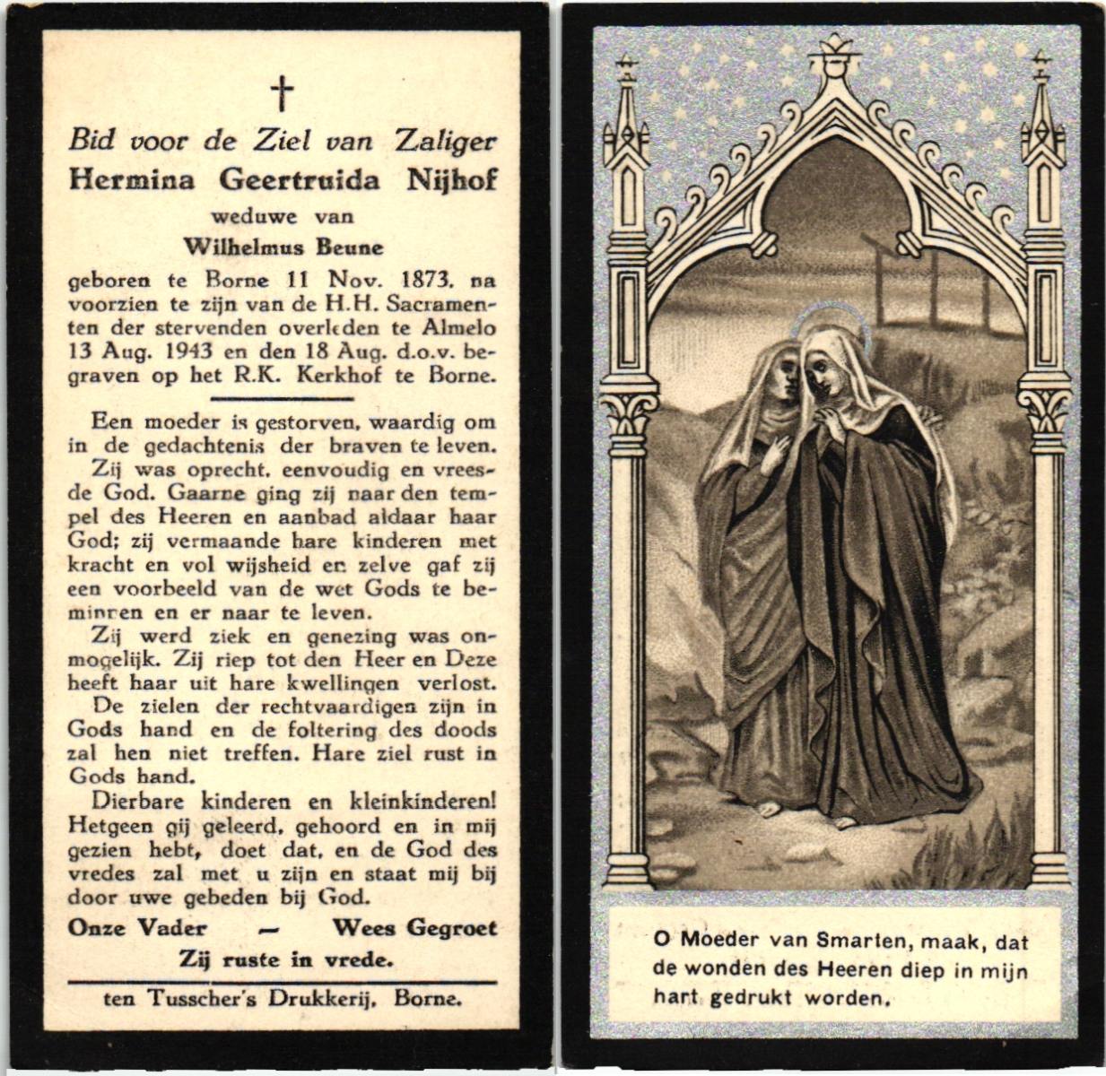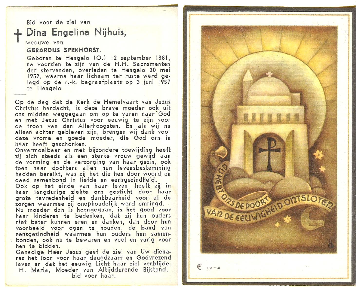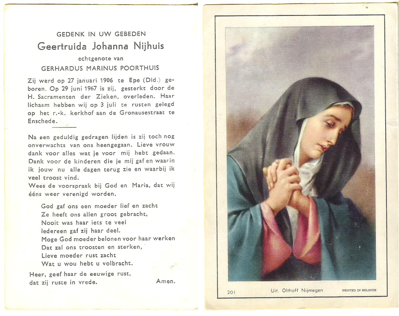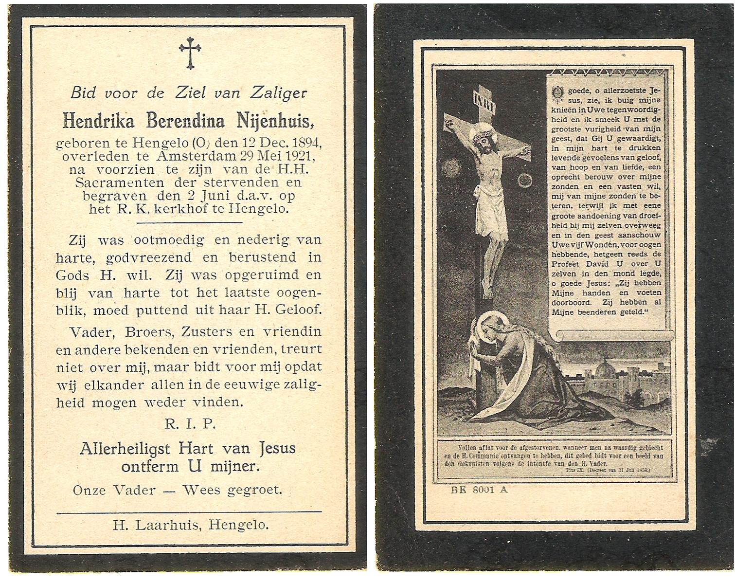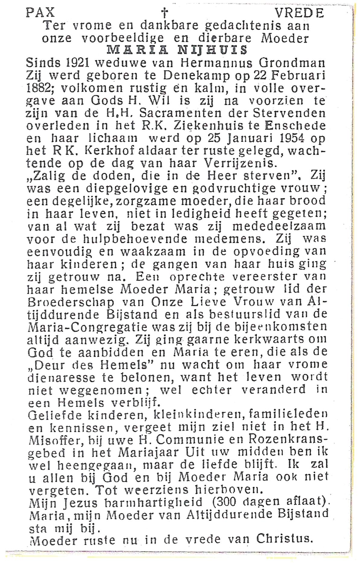 NIJHUIS, Maria, geboren op 22-02-1882 te Denekamp, overleden te Enschede op 71-jarige leeftijd, begraven op 25-1-1954 te Enschede.