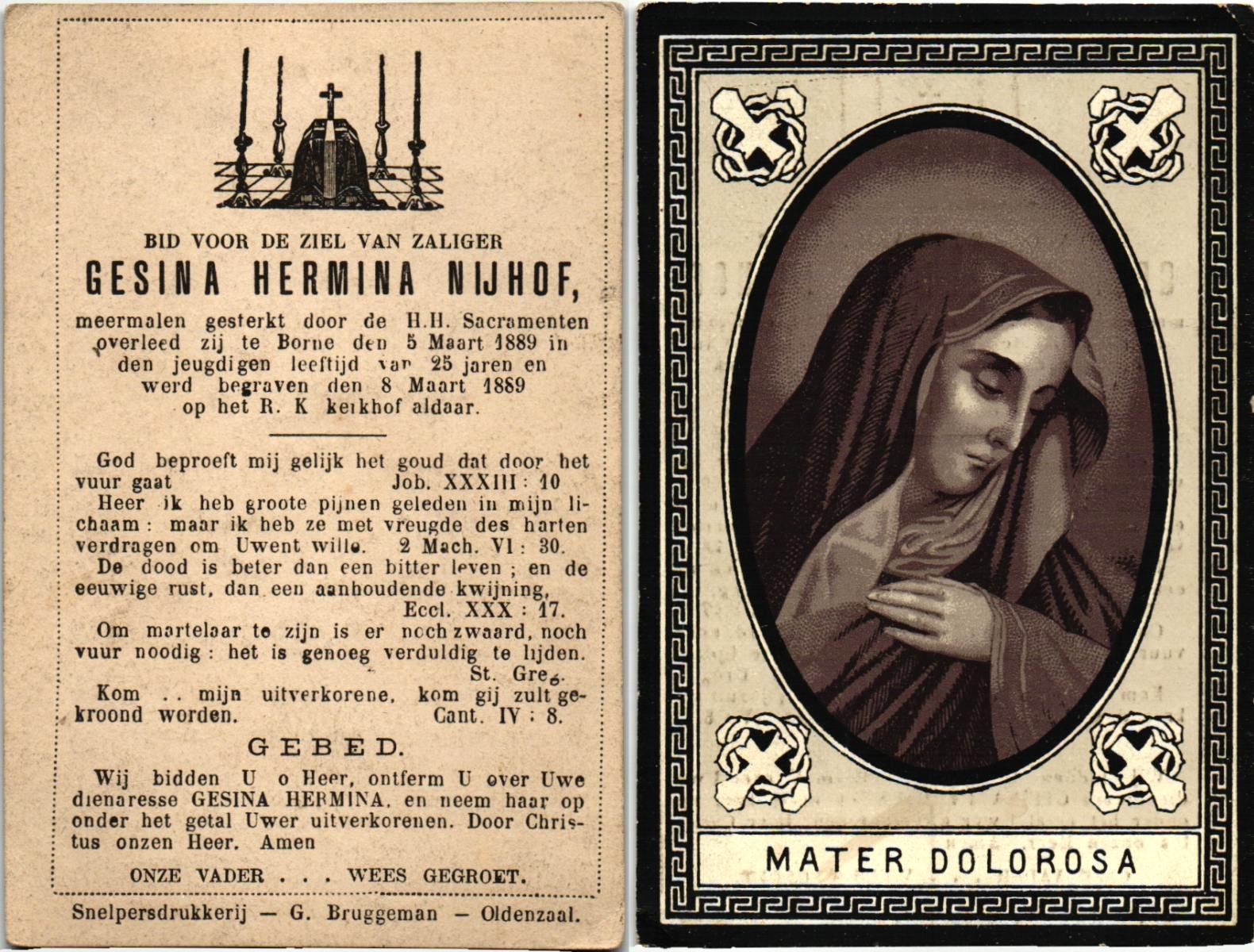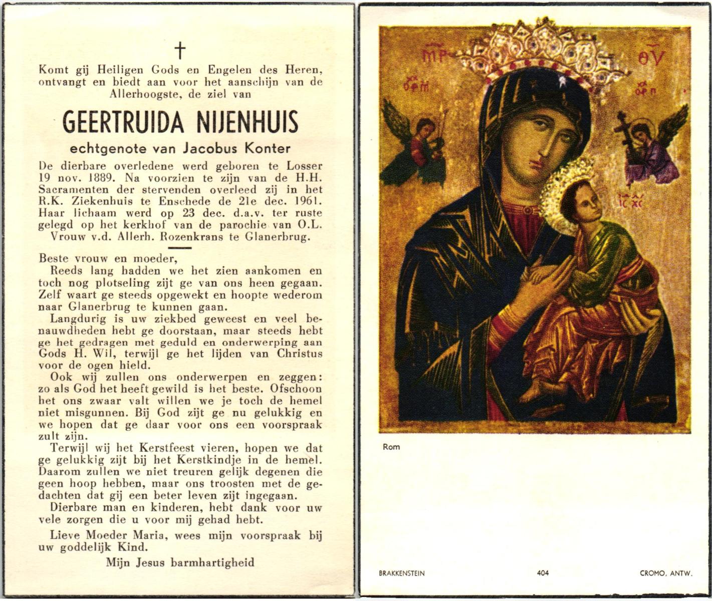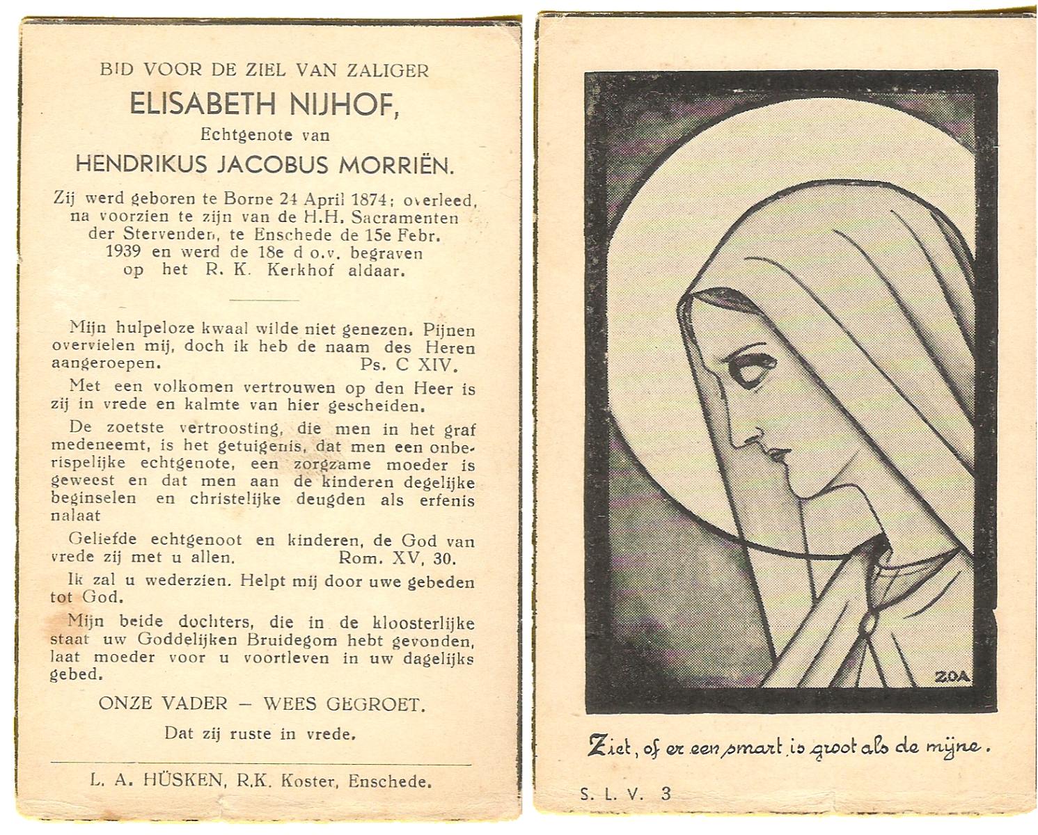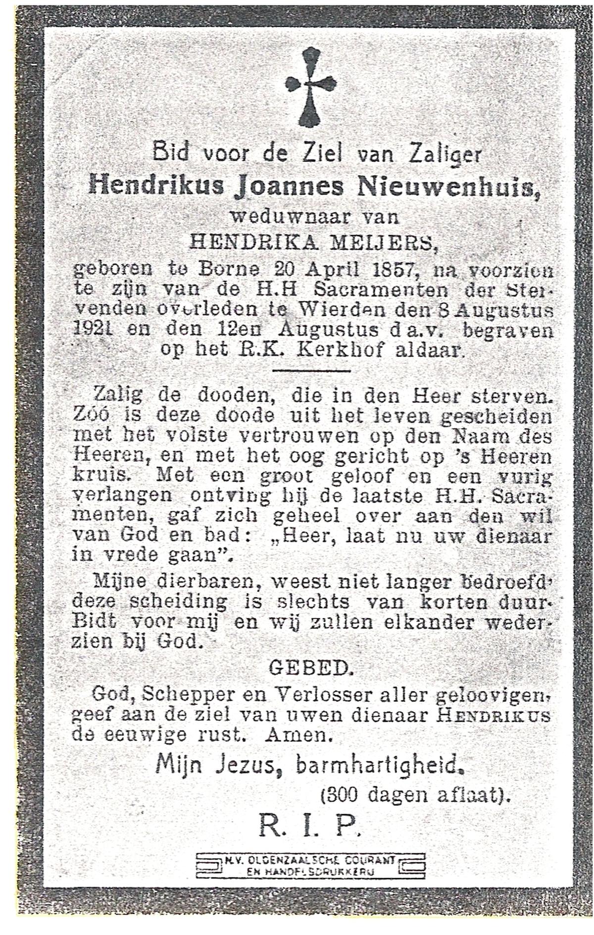 NIJHUIS, Maria, geboren op 22-02-1882 te Denekamp, overleden te Enschede op 71-jarige leeftijd, begraven op 25-1-1954 te Enschede.