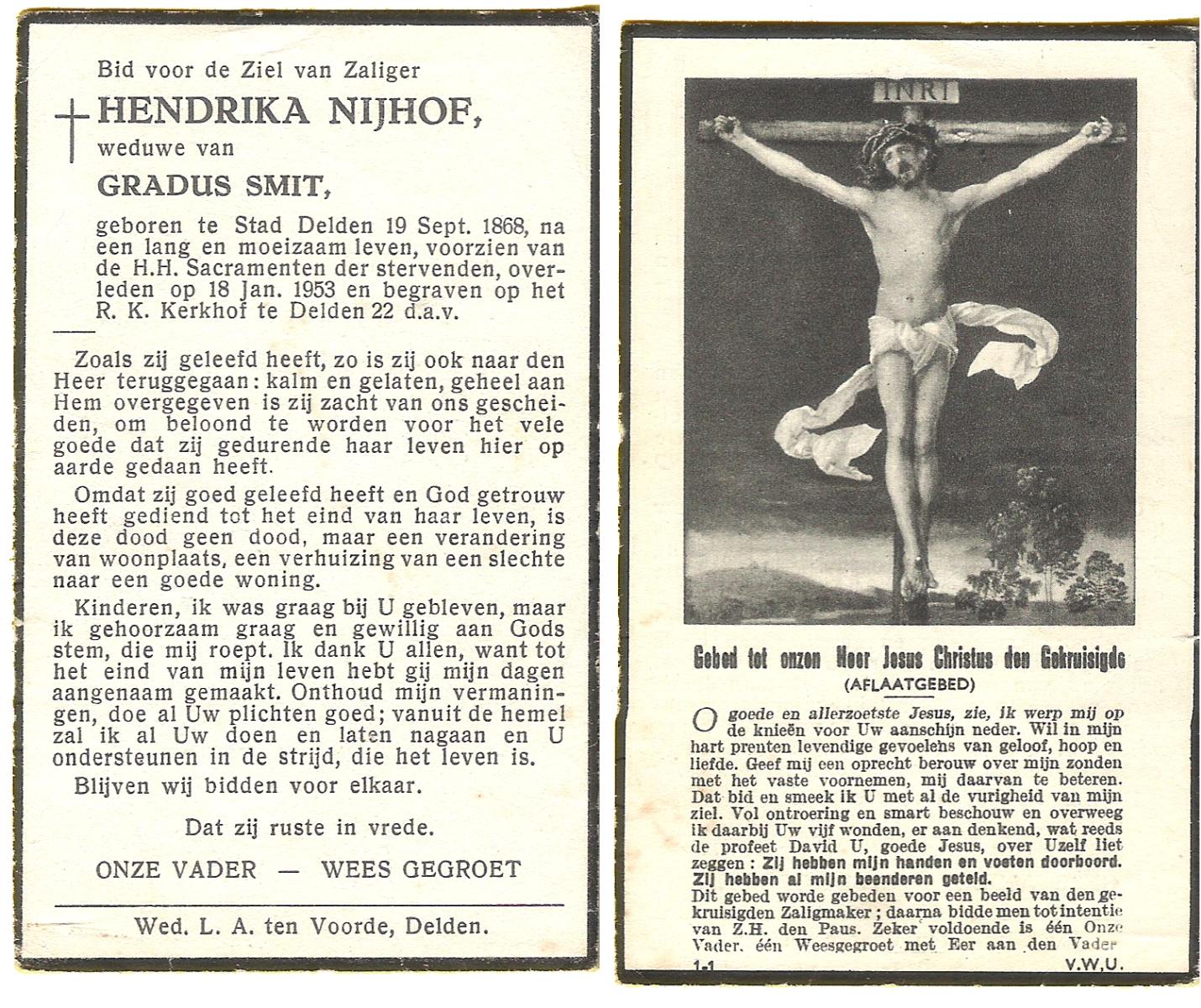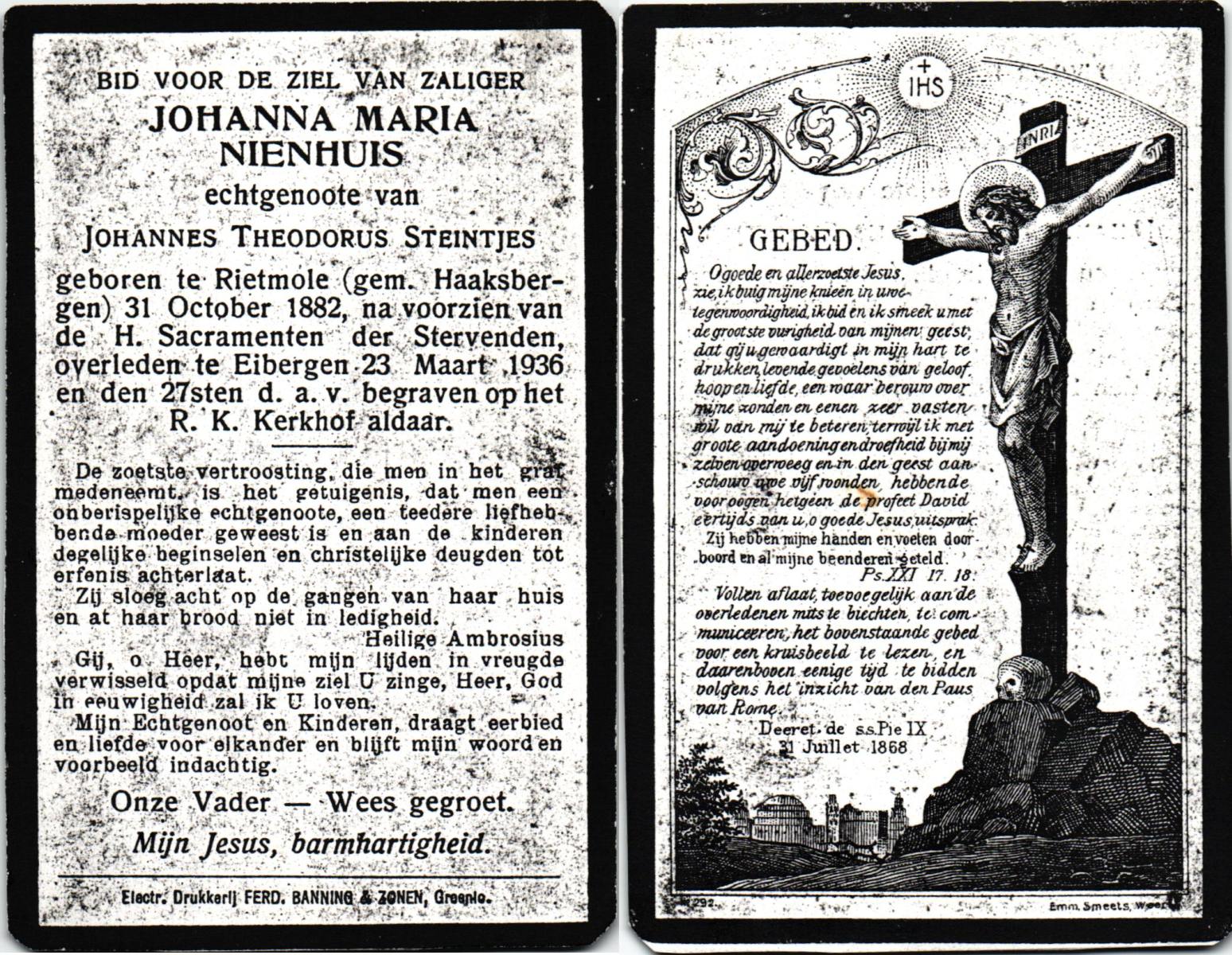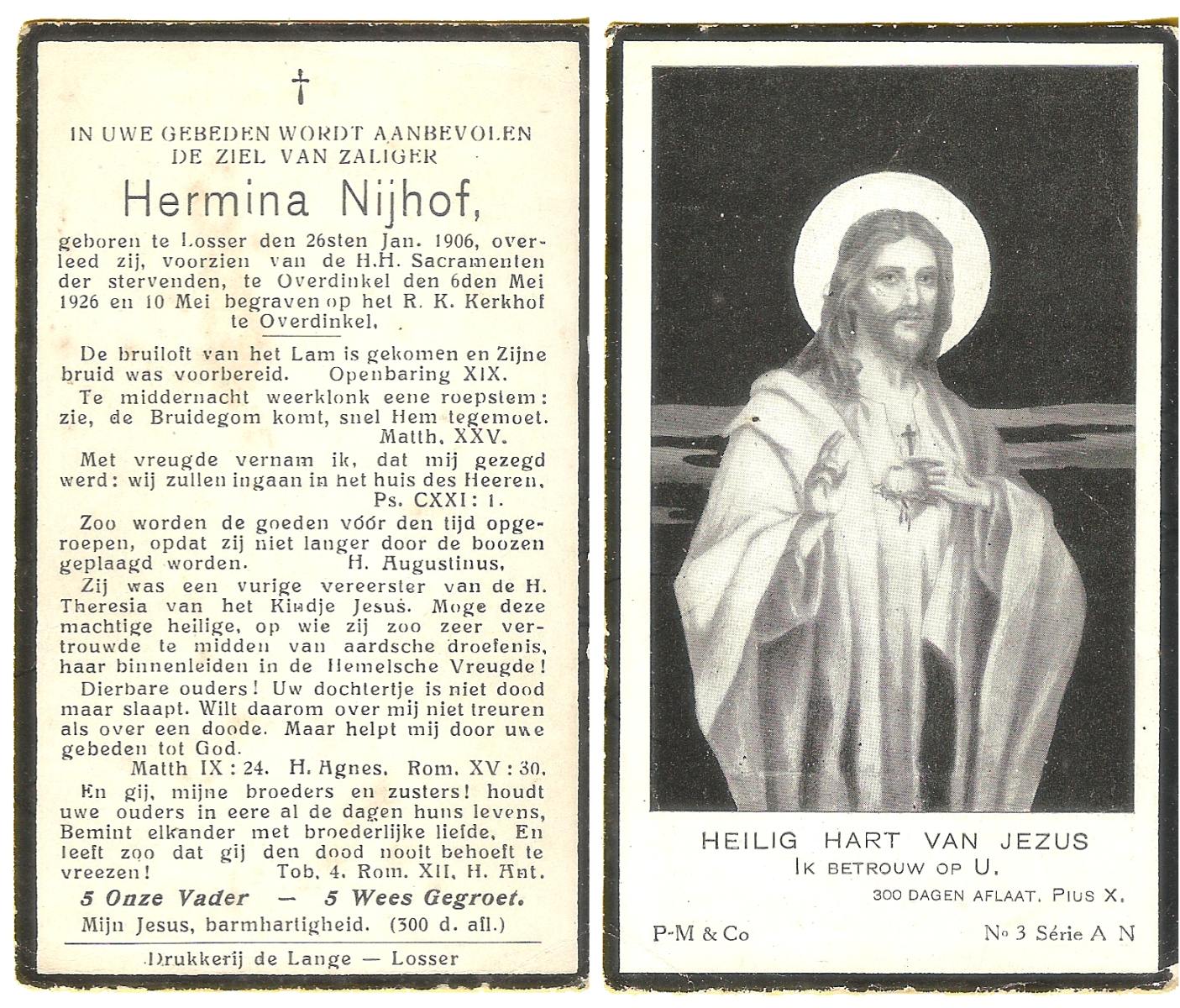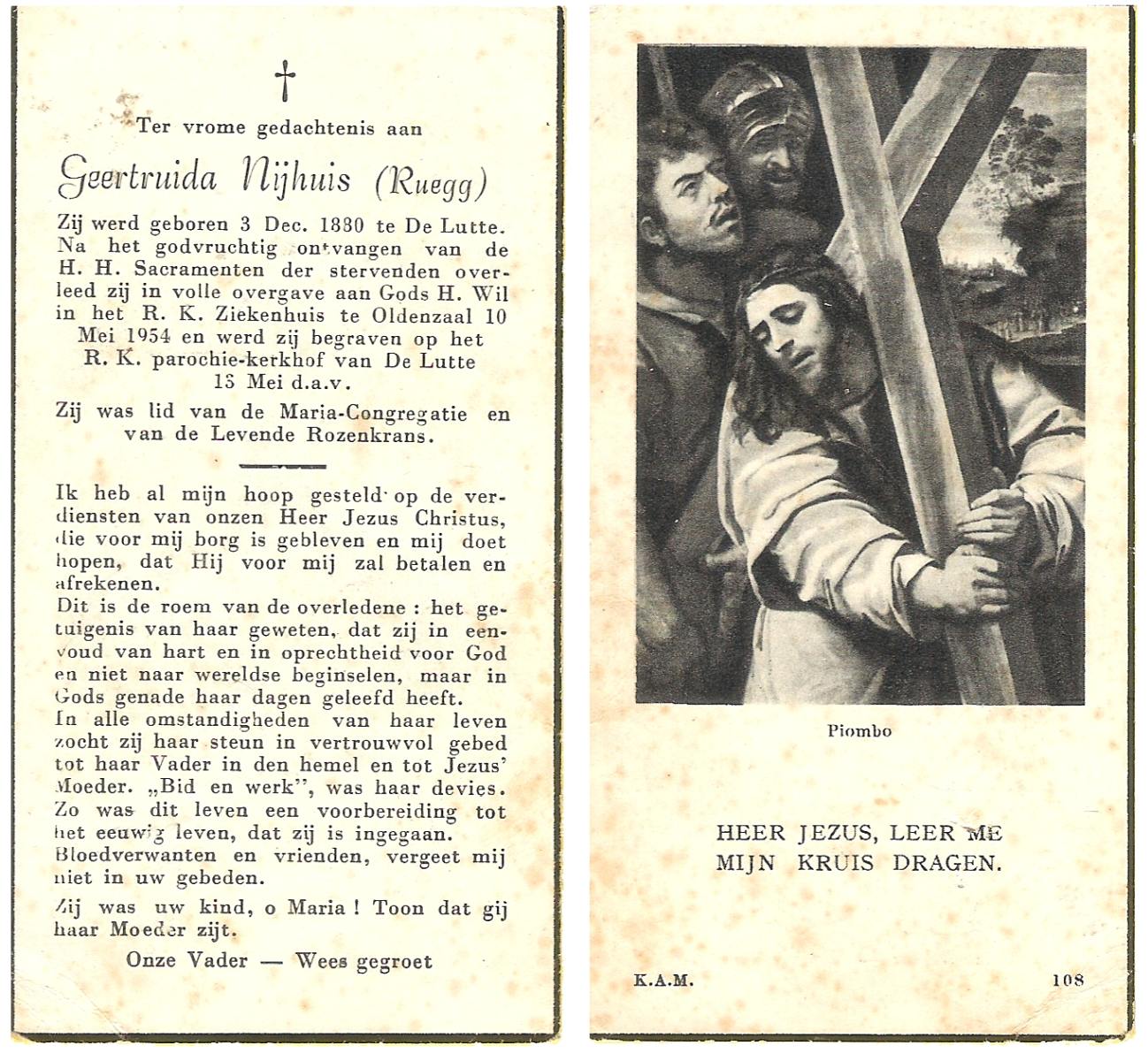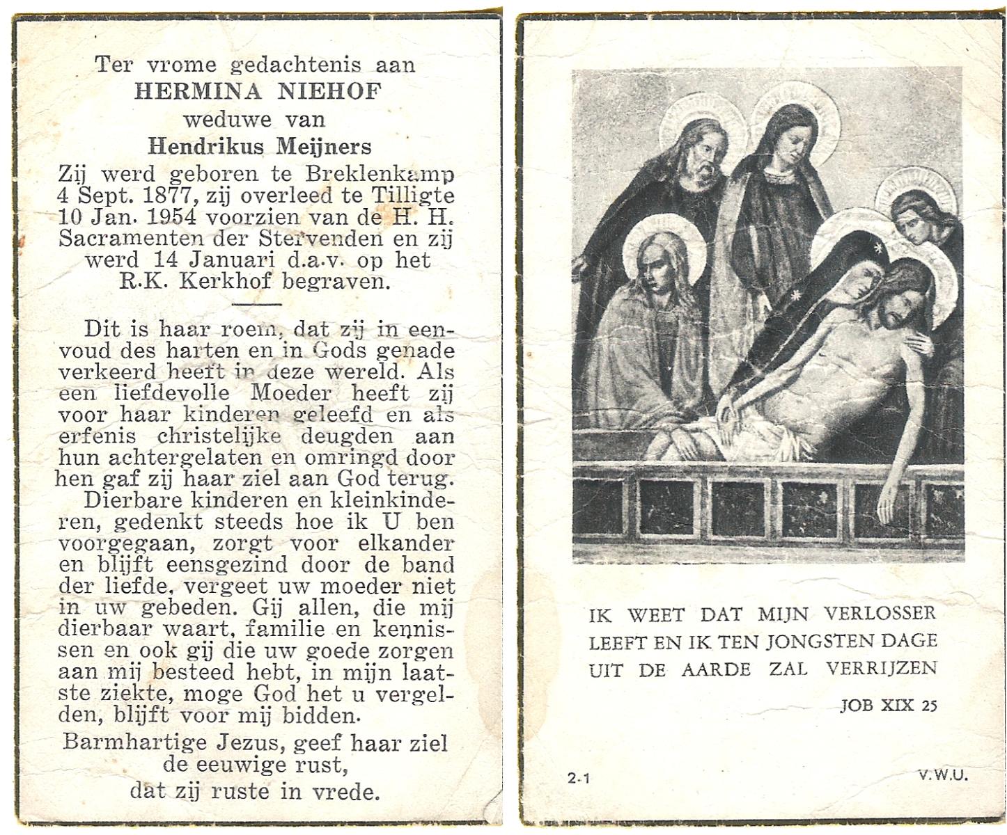 NIJHUIS, Maria, geboren op 22-02-1882 te Denekamp, overleden te Enschede op 71-jarige leeftijd, begraven op 25-1-1954 te Enschede.