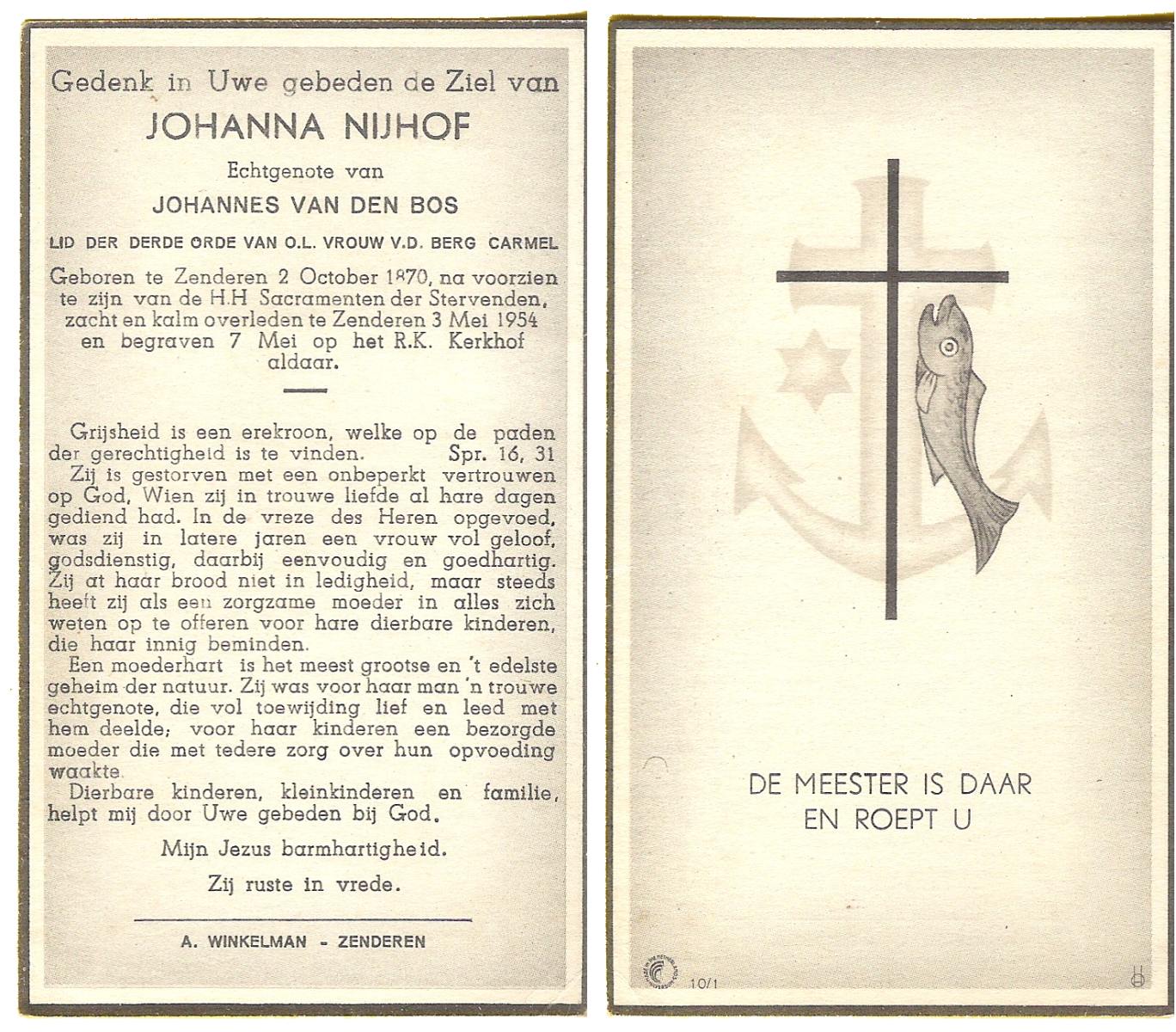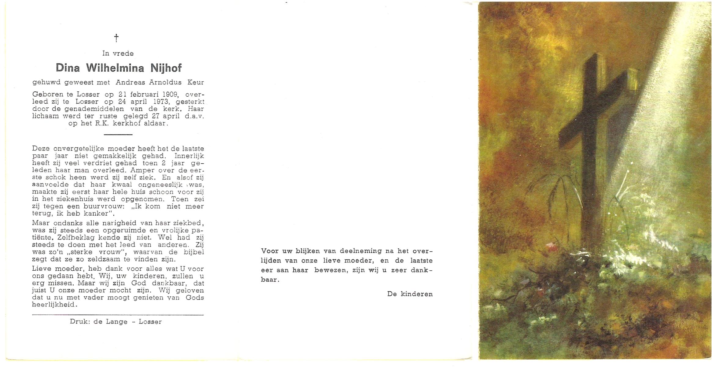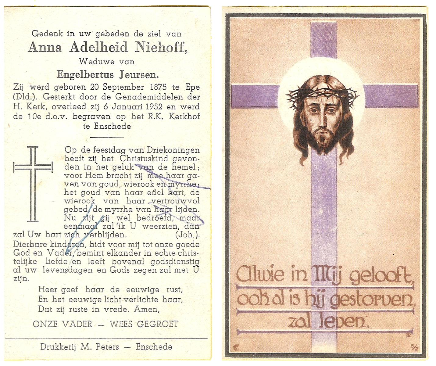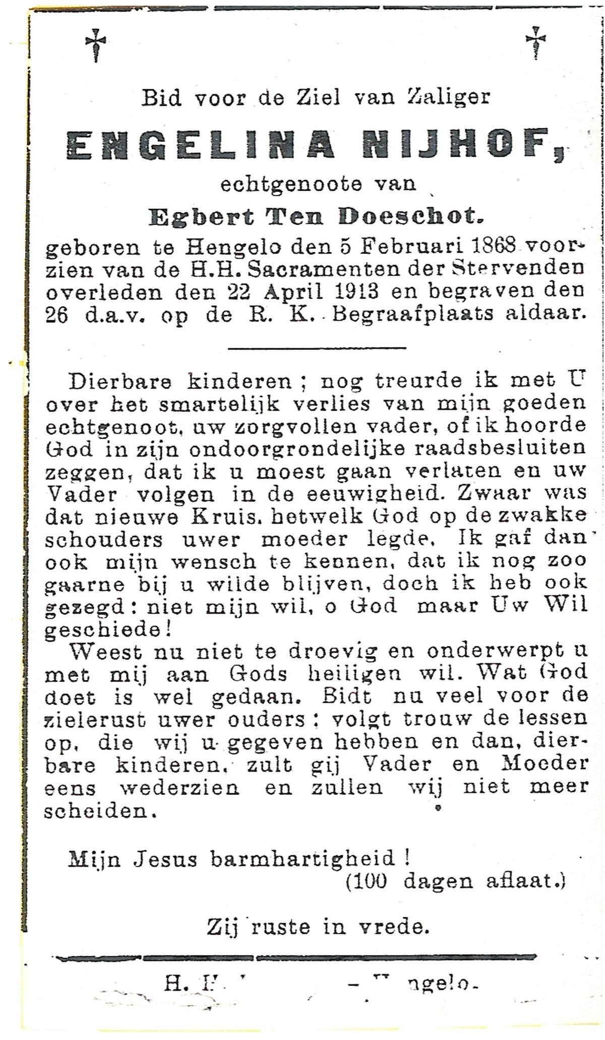 NIJHUIS, Maria, geboren op 22-02-1882 te Denekamp, overleden te Enschede op 71-jarige leeftijd, begraven op 25-1-1954 te Enschede.