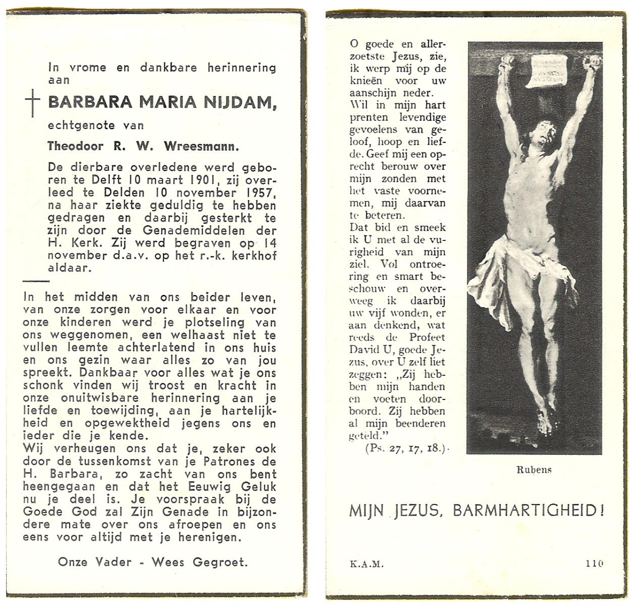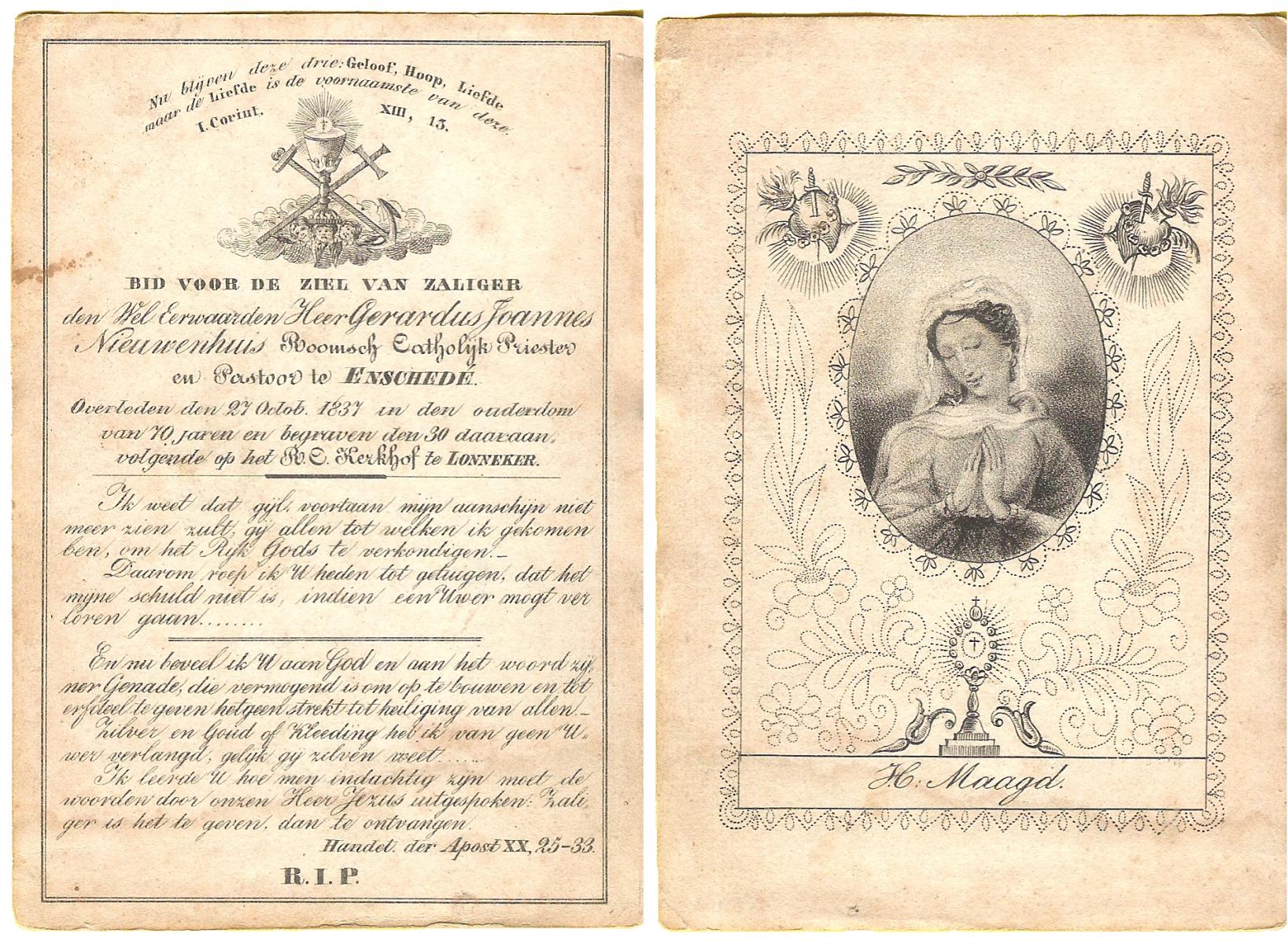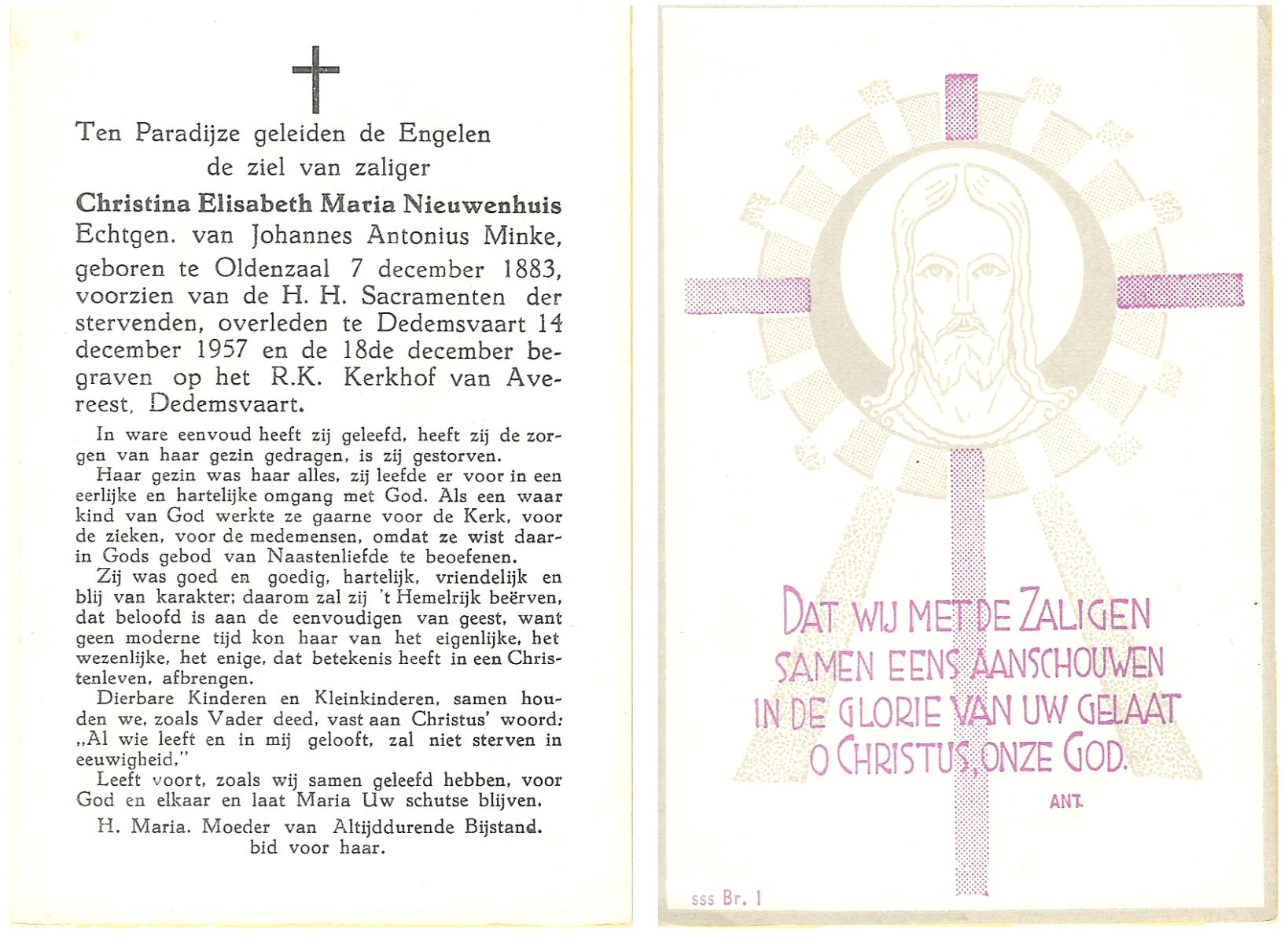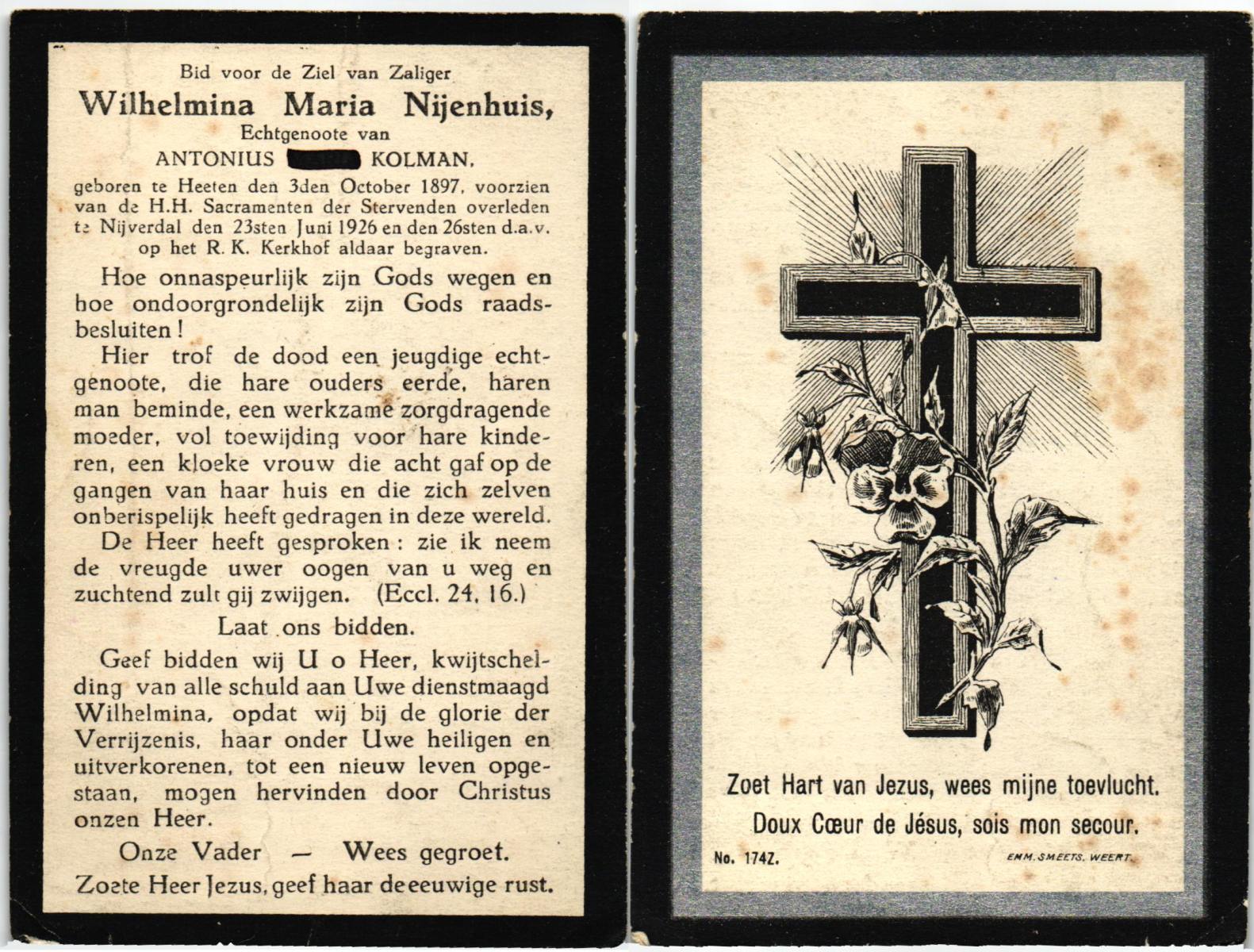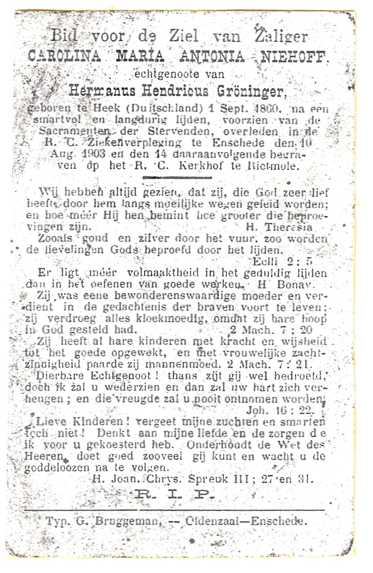 NIJHUIS, Maria, geboren op 22-02-1882 te Denekamp, overleden te Enschede op 71-jarige leeftijd, begraven op 25-1-1954 te Enschede.
