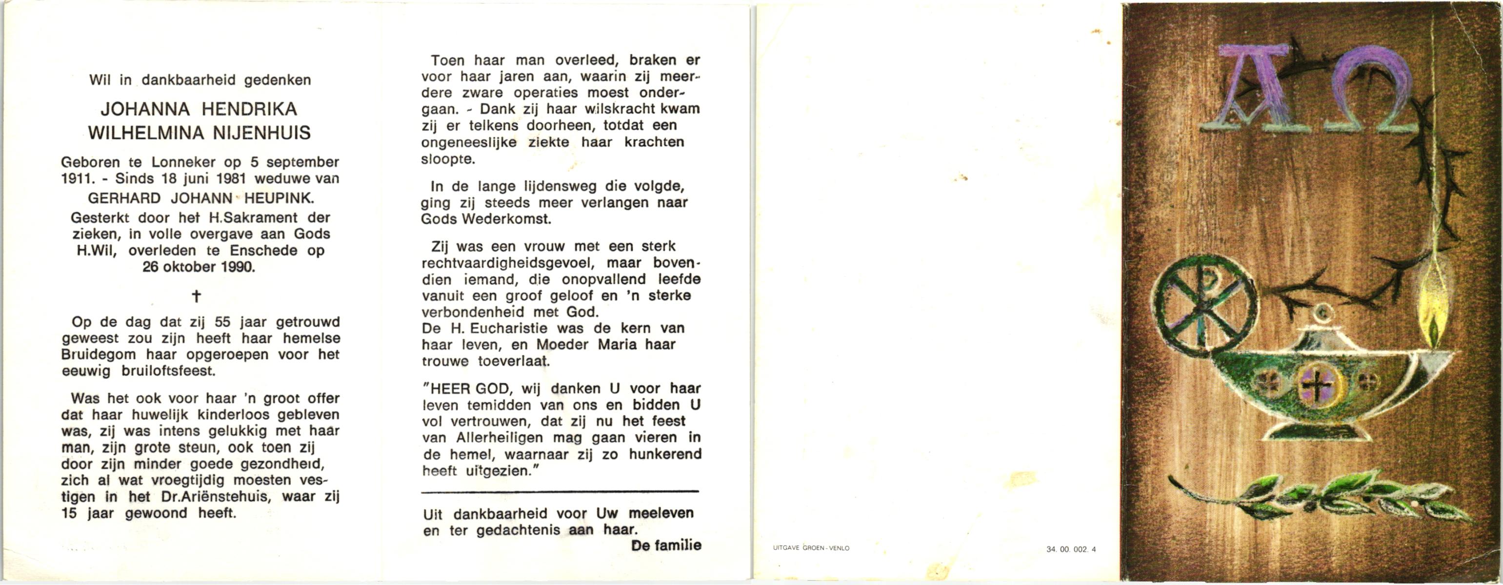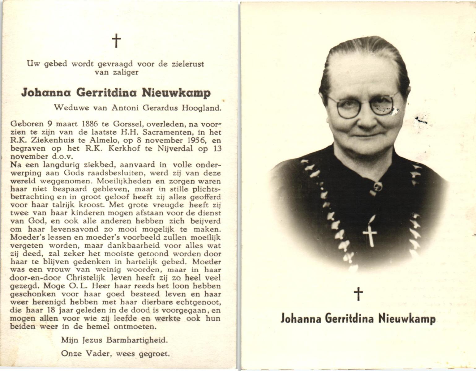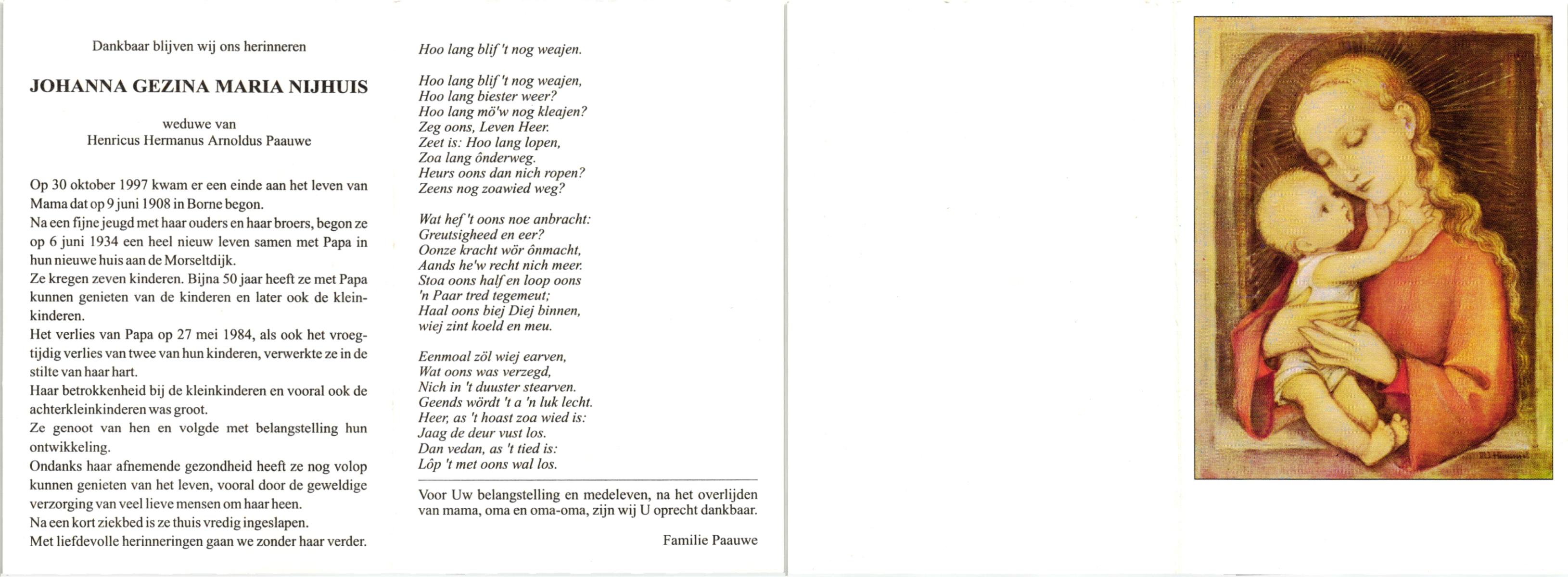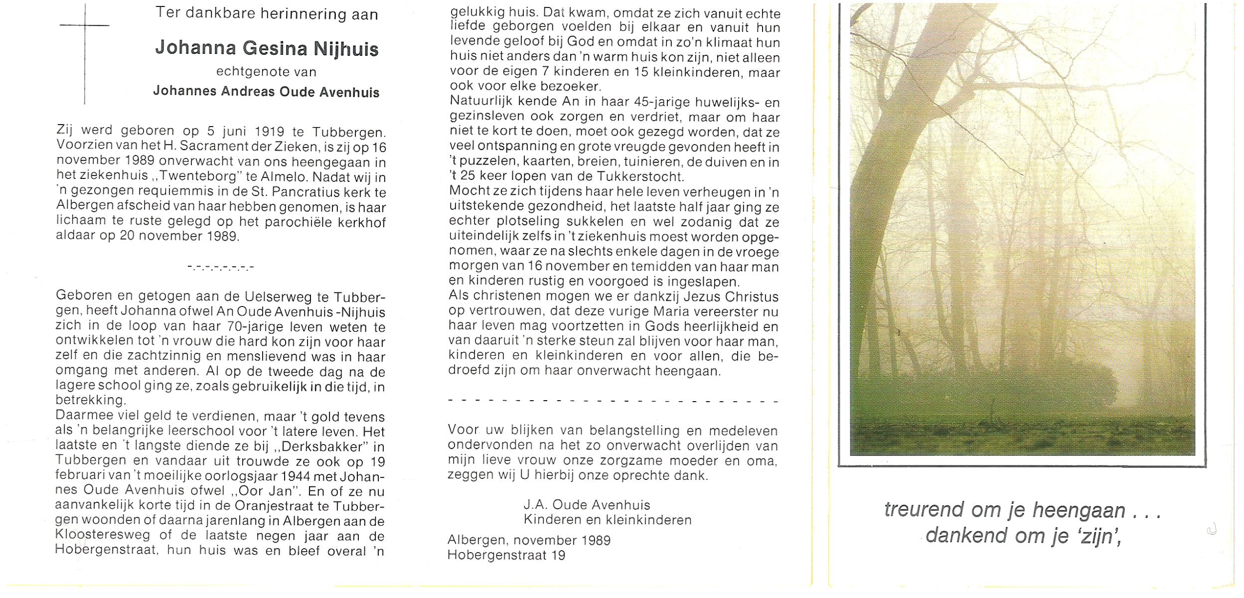NIJHUIS, Johanna Gesina, geboren op 5-6-1919 te Tubbergen, overleden op 16-11-1989 te Almelo op 70-jarige leeftijd, begraven op 20-11-1989 te Albergen.