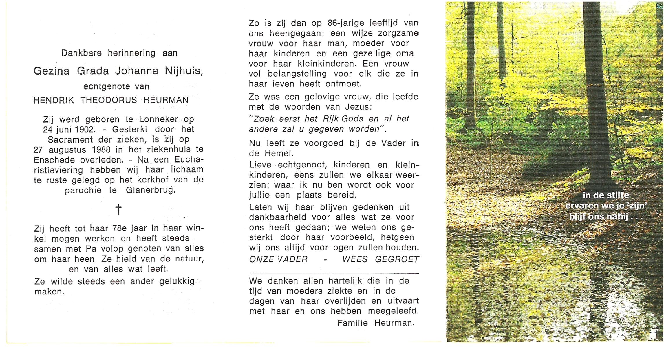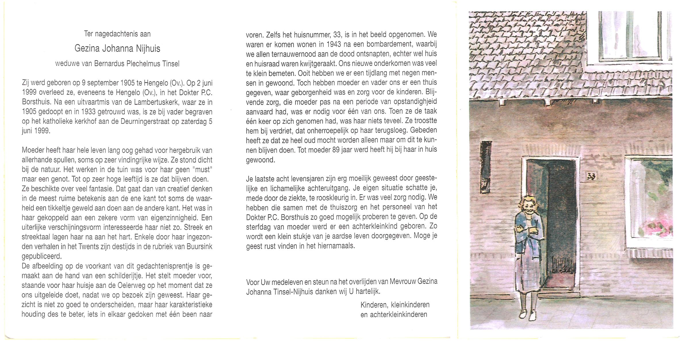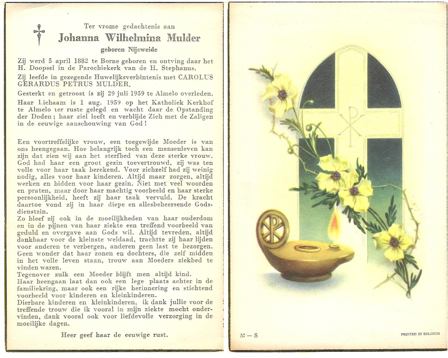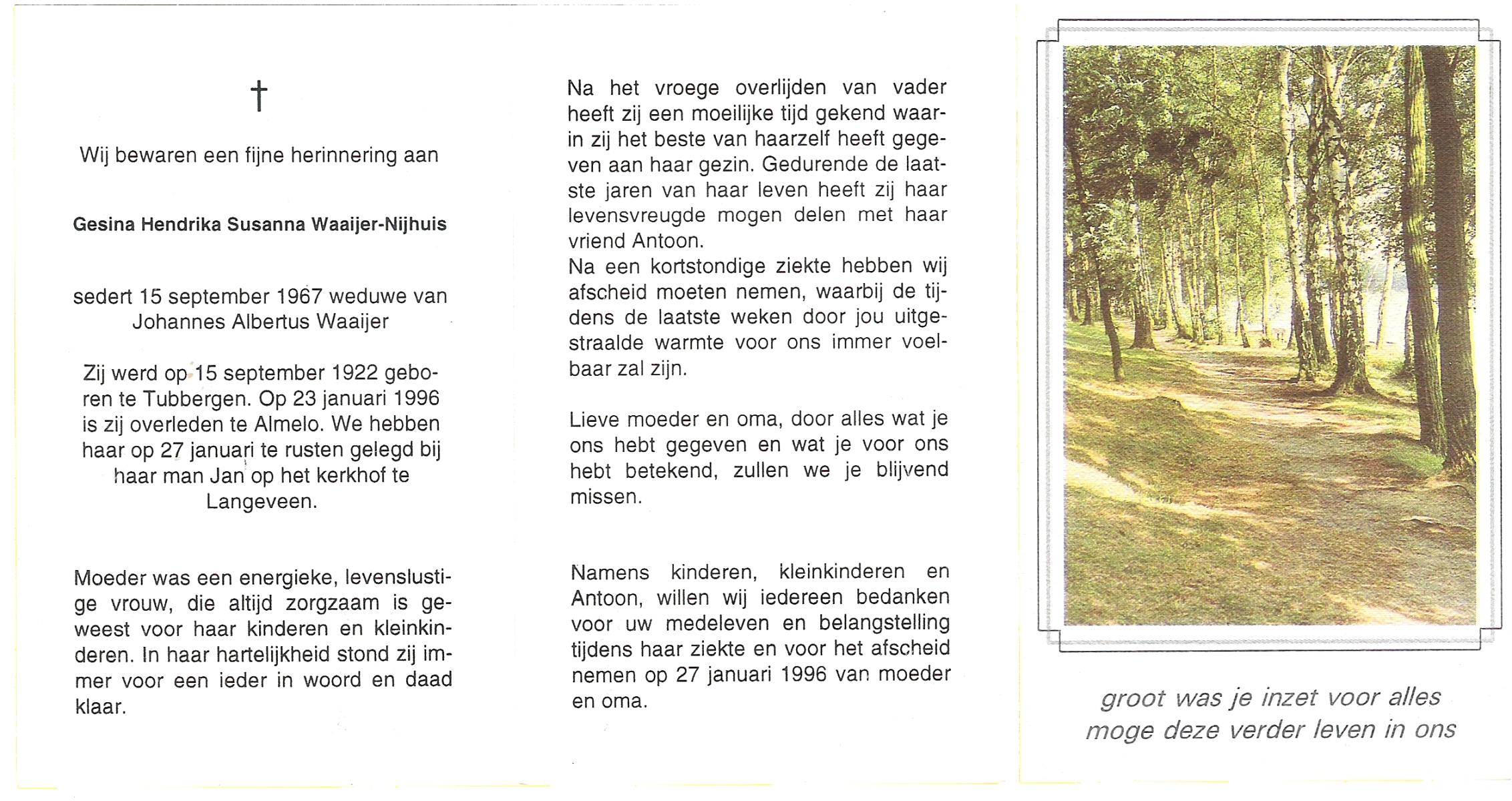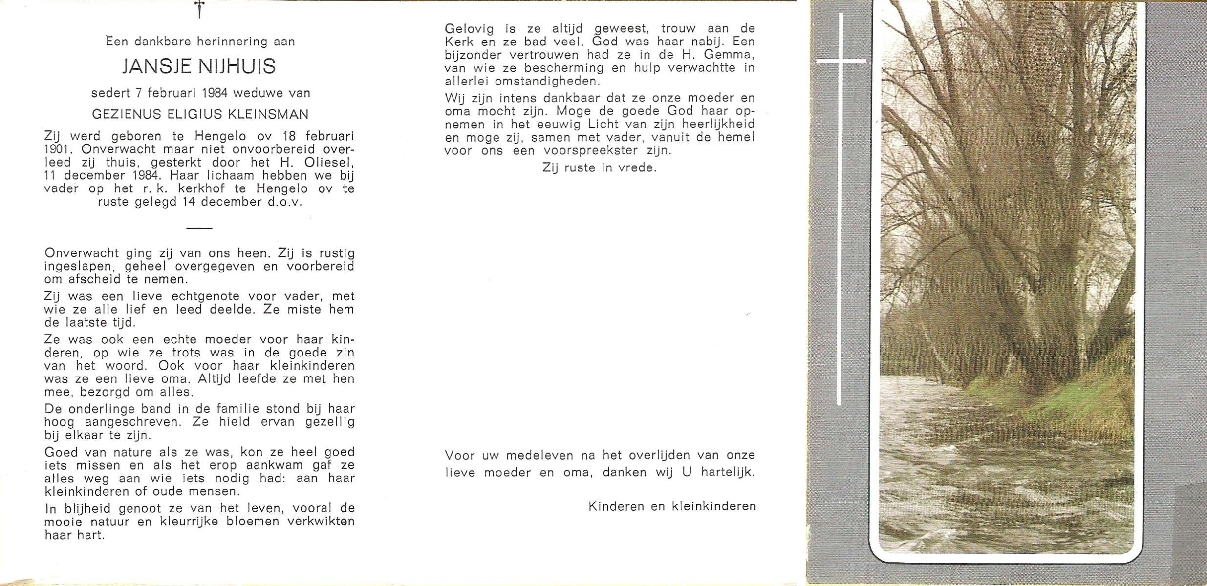 NIJHUIS, Johanna Gesina, geboren op 5-6-1919 te Tubbergen, overleden op 16-11-1989 te Almelo op 70-jarige leeftijd, begraven op 20-11-1989 te Albergen.