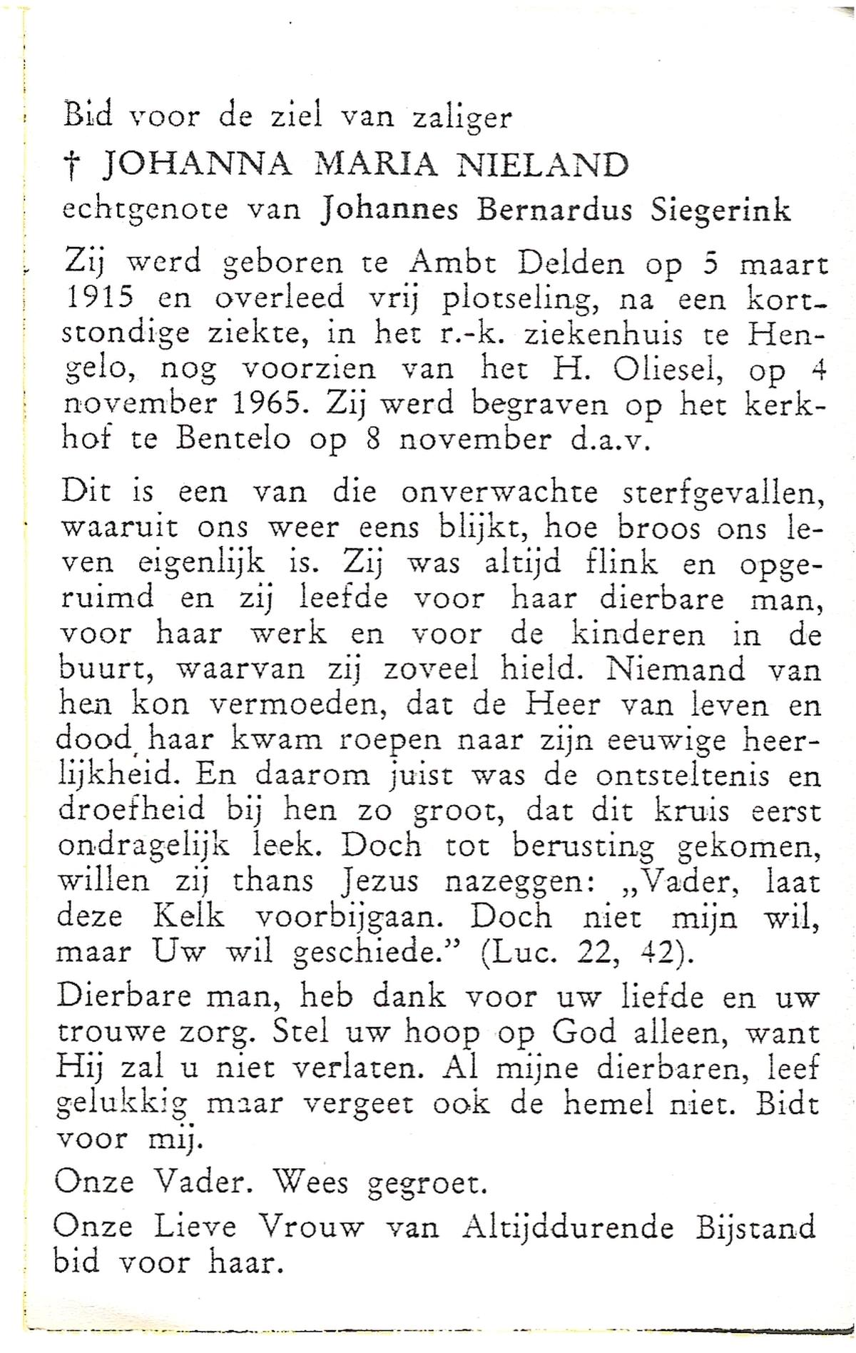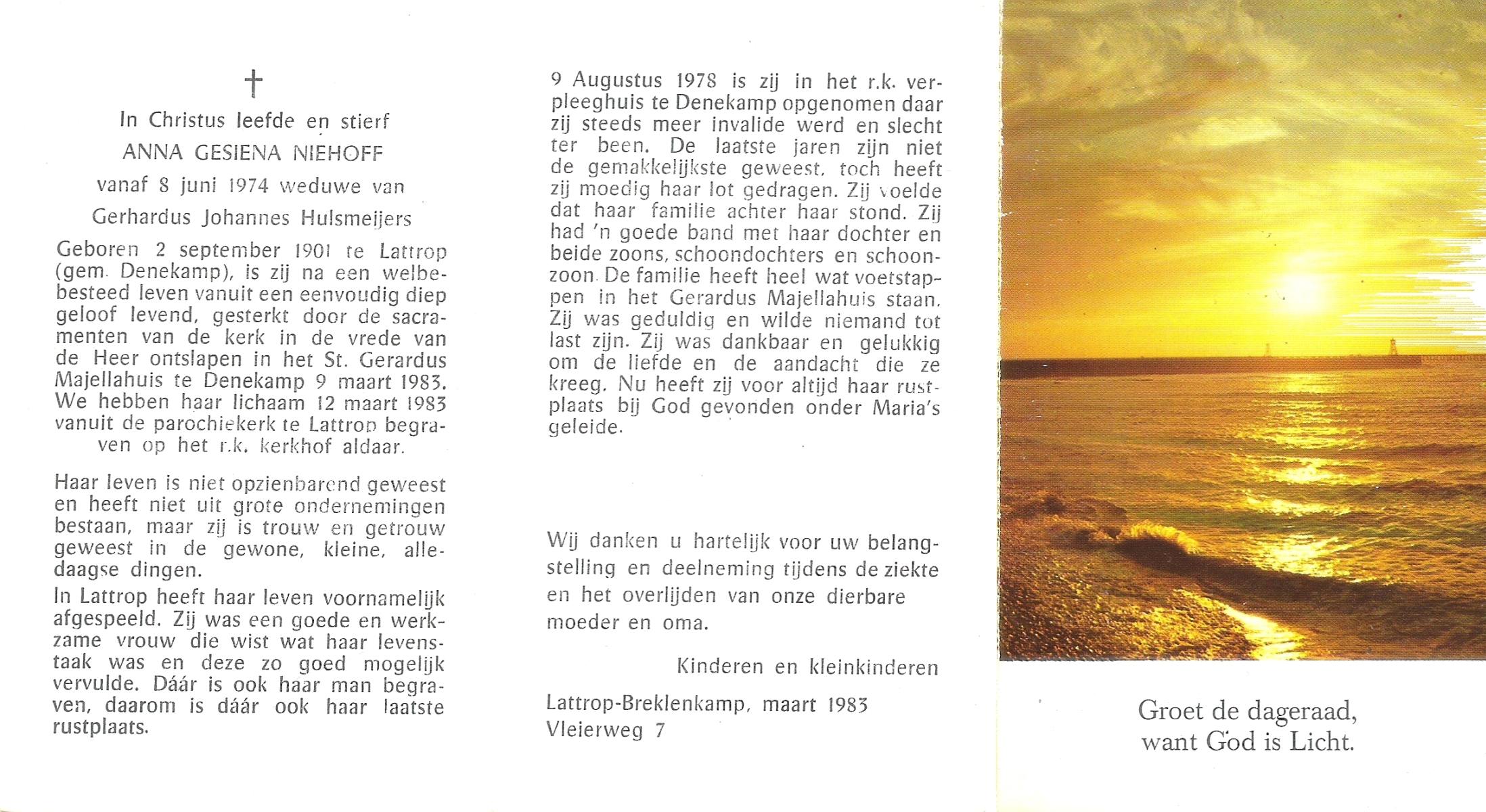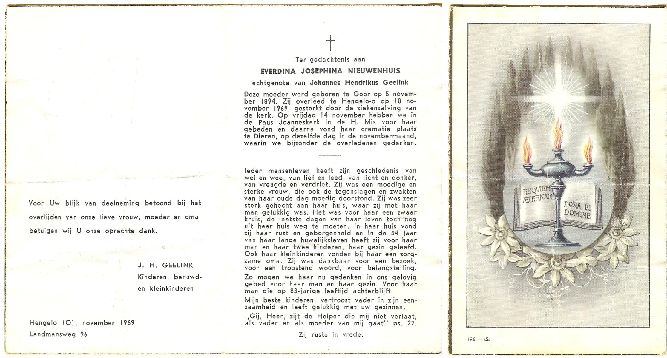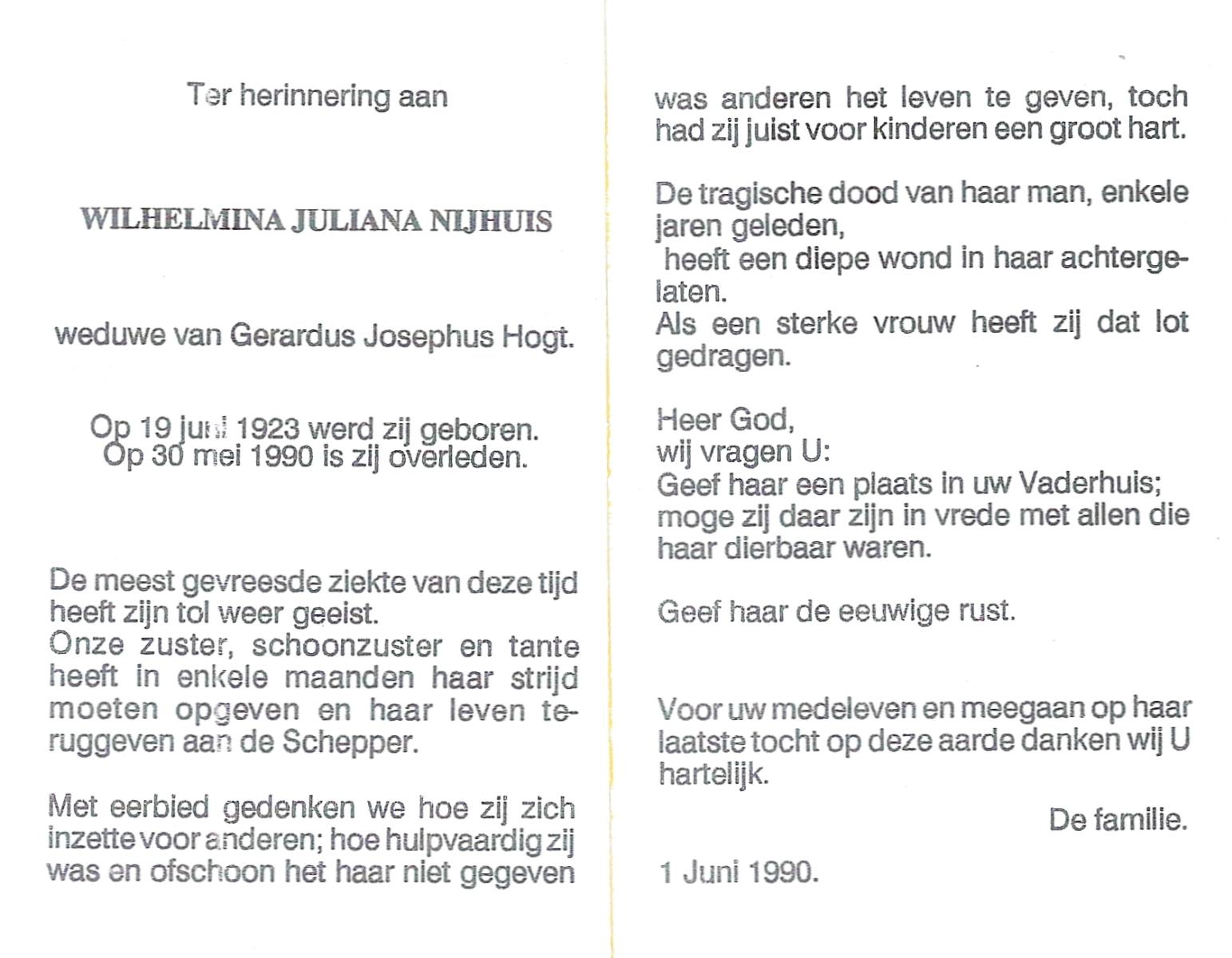 NIJHUIS, Johanna Gesina, geboren op 5-6-1919 te Tubbergen, overleden op 16-11-1989 te Almelo op 70-jarige leeftijd, begraven op 20-11-1989 te Albergen.
