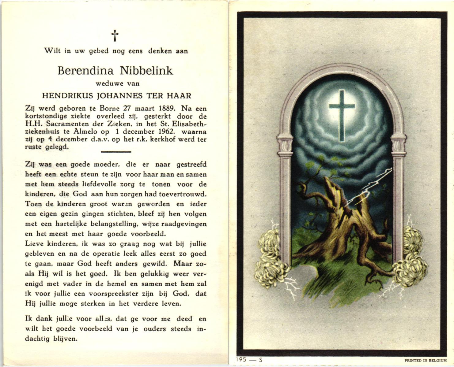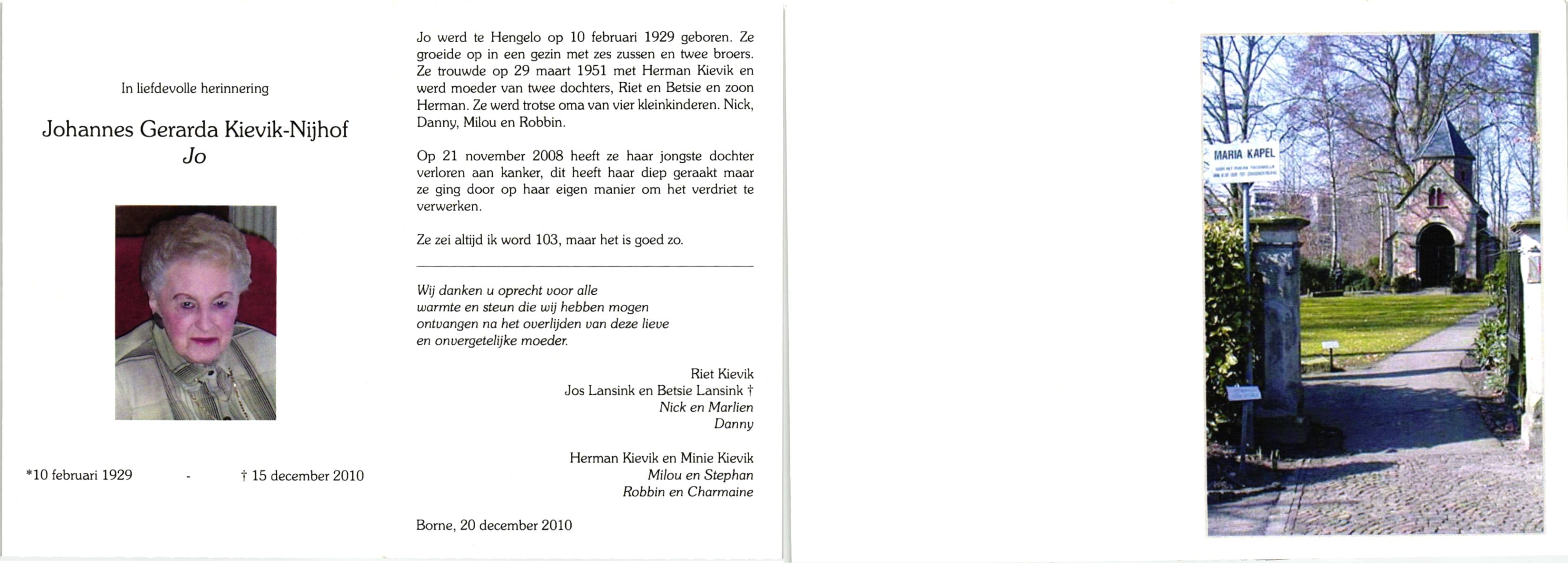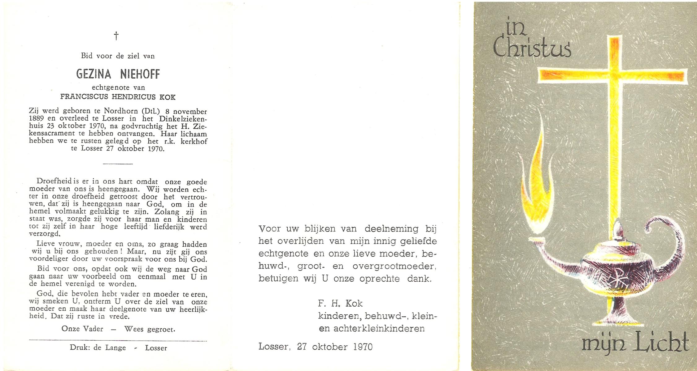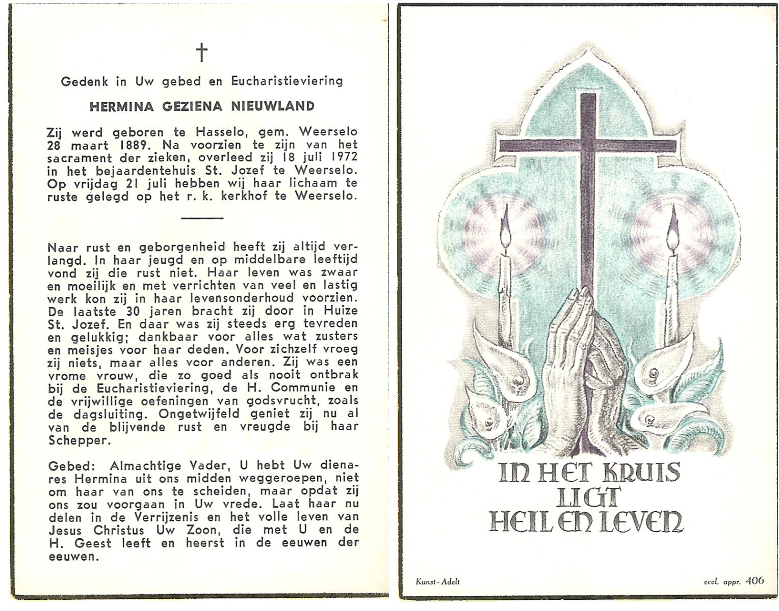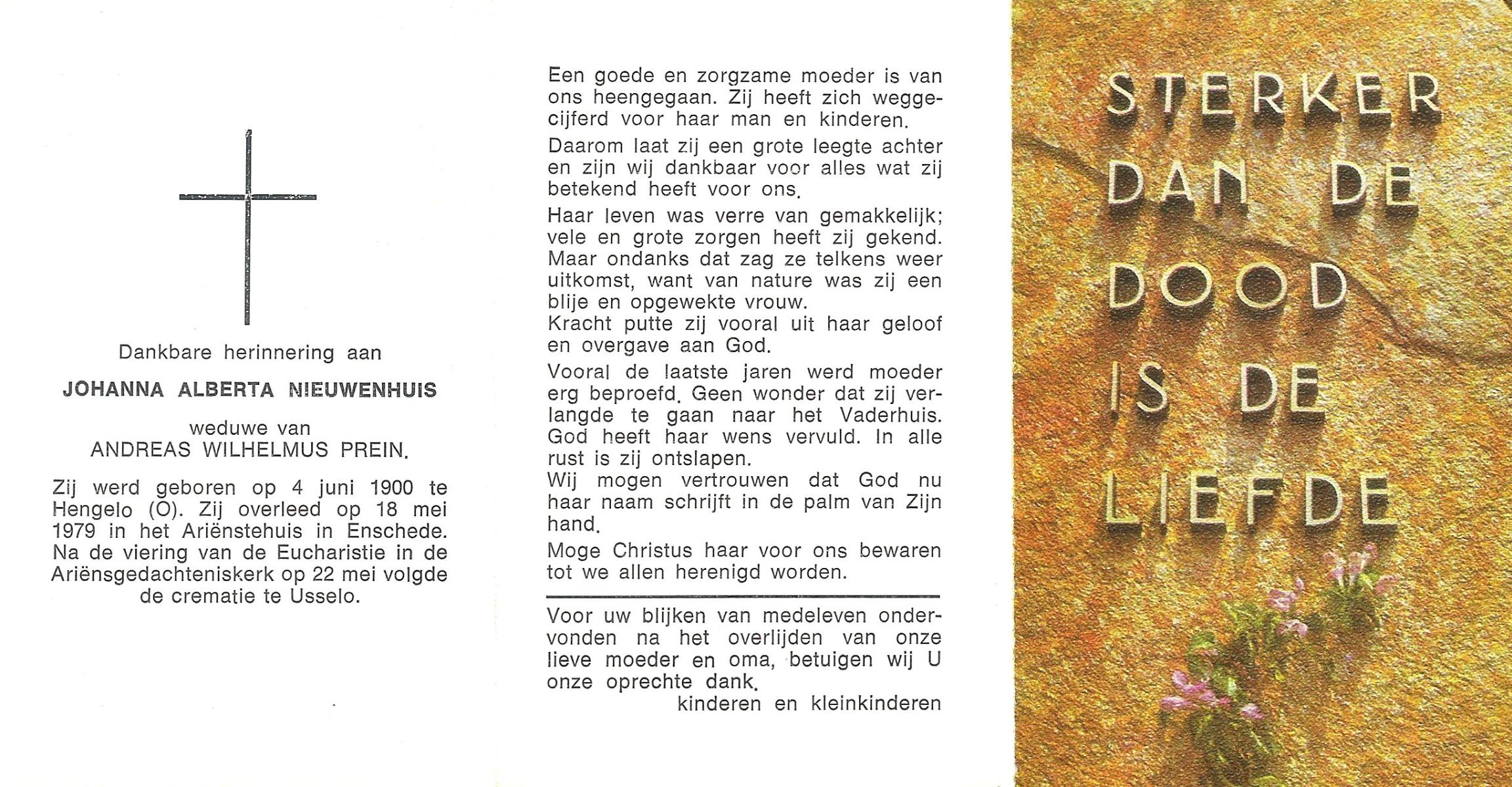NIJHUIS, Johanna Gesina, geboren op 5-6-1919 te Tubbergen, overleden op 16-11-1989 te Almelo op 70-jarige leeftijd, begraven op 20-11-1989 te Albergen.