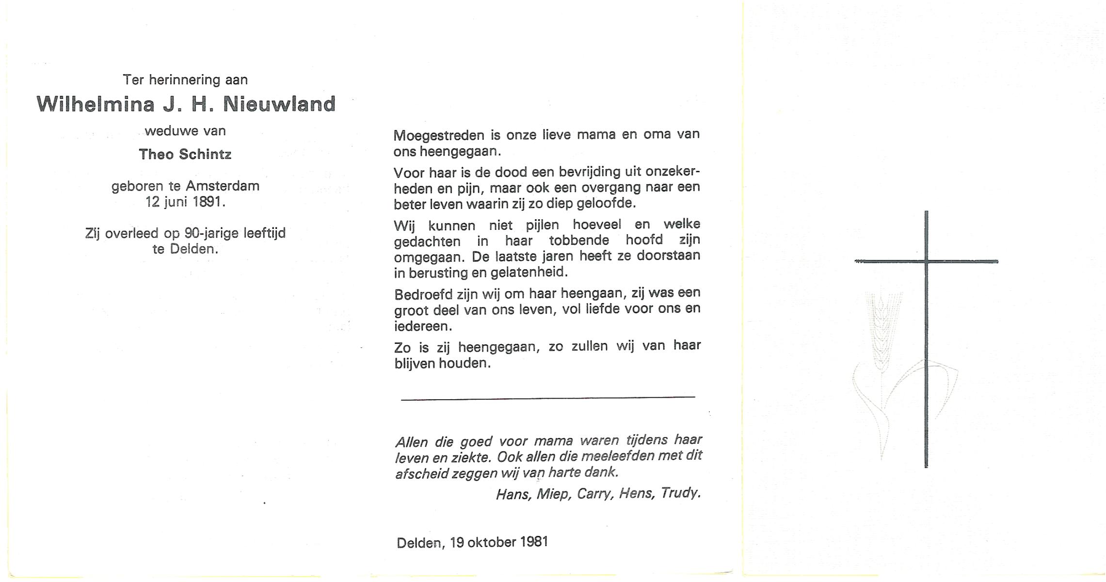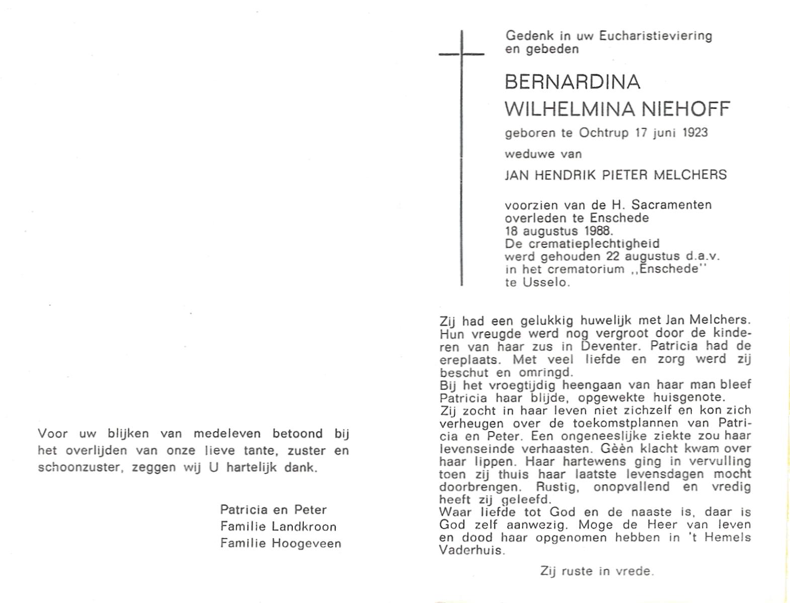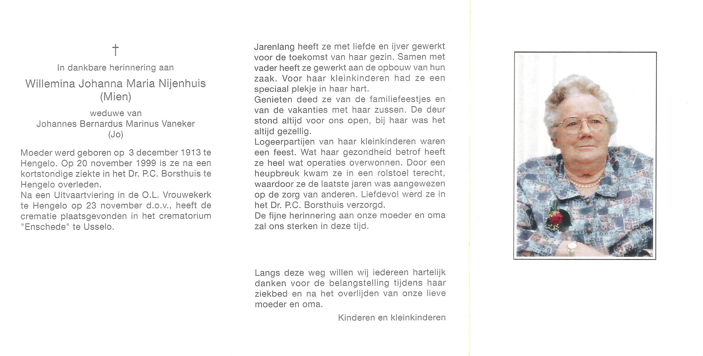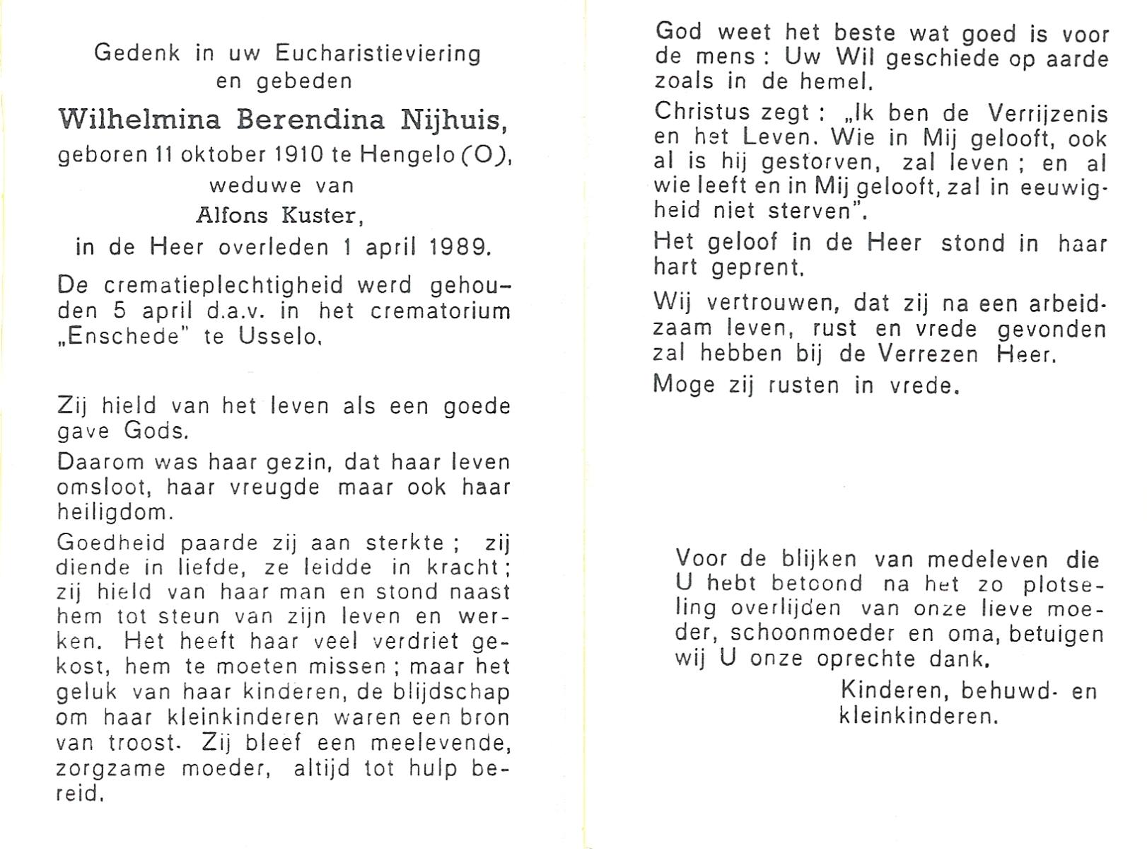 NIJHUIS, Wilhelmina Berendina, geboren op 11-10-1910 te Hengelo (O), overleden op 1-4-1989 op 78-jarige leeftijd, gecremeerd op 5-4-1989 te Usselo.
