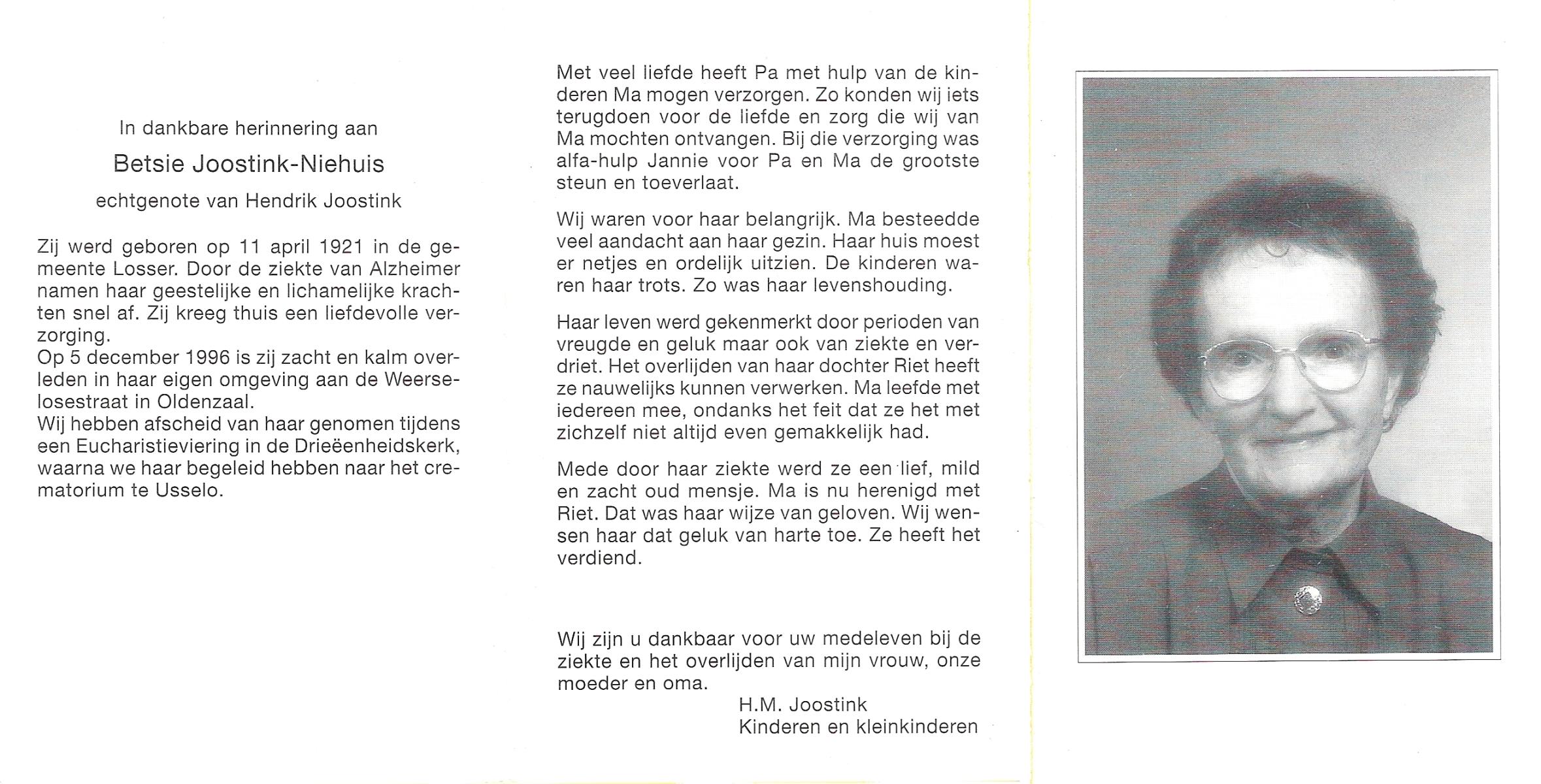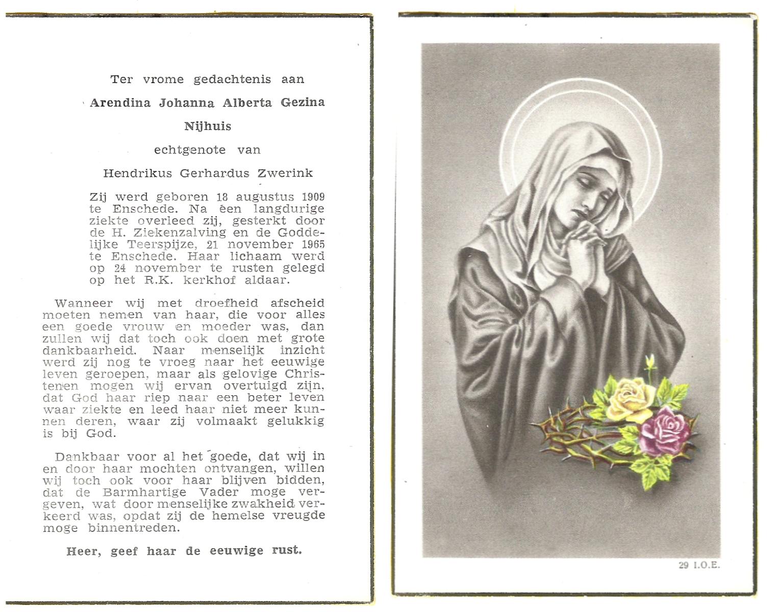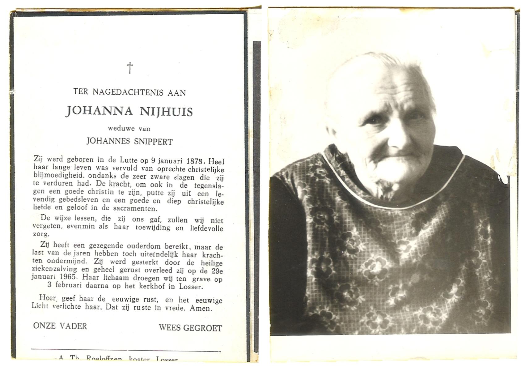 NIJHUIS, Johanna, geboren op 09-01-1878 te De Lutte, overleden op 29-1-1965 op 87-jarige leeftijd, begraven op 3-2-1965 te Losser.