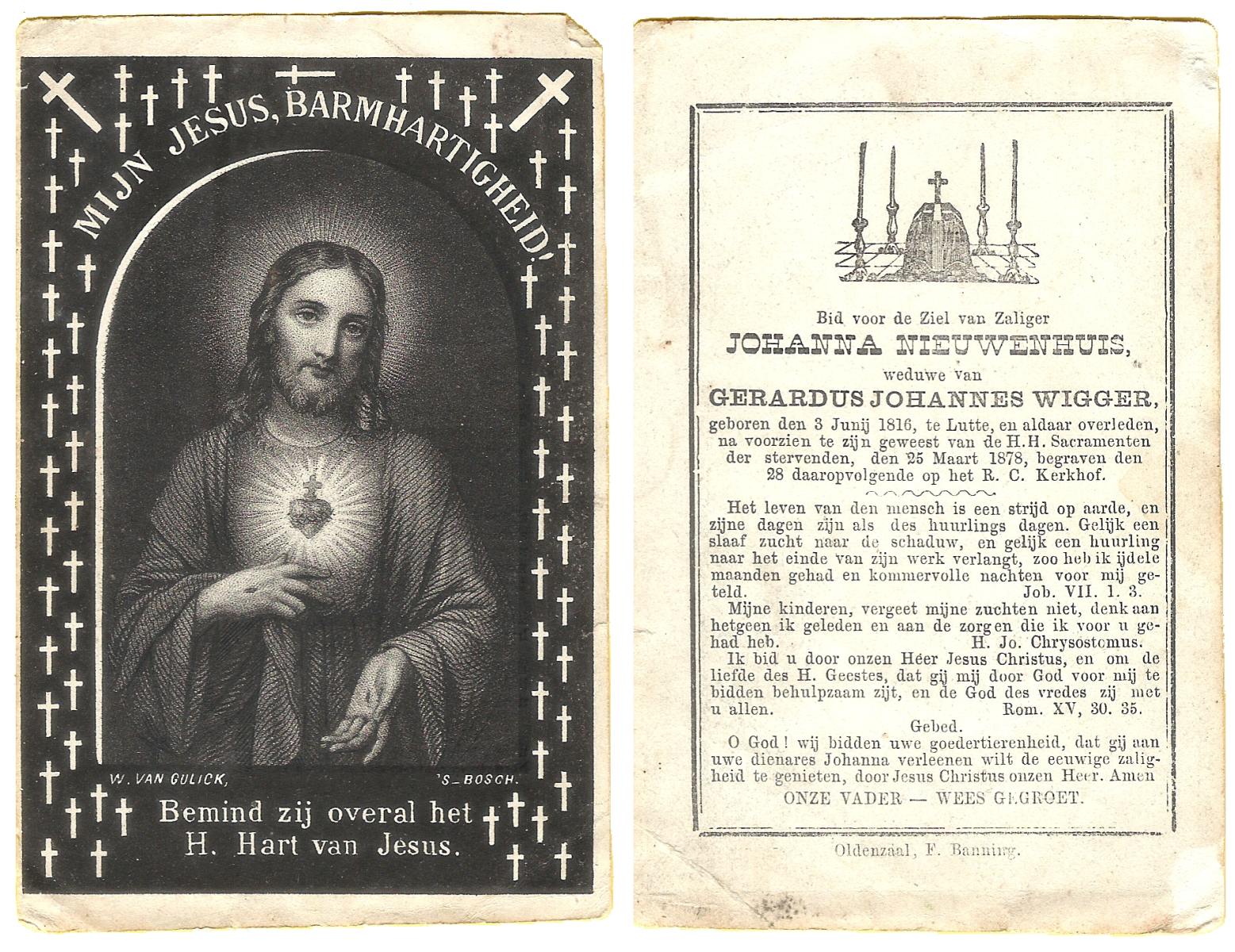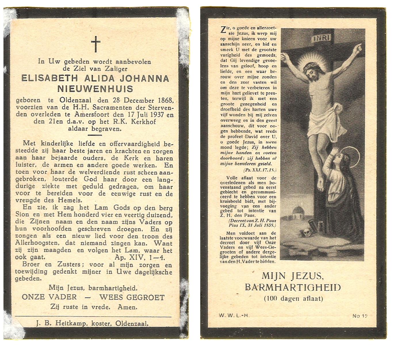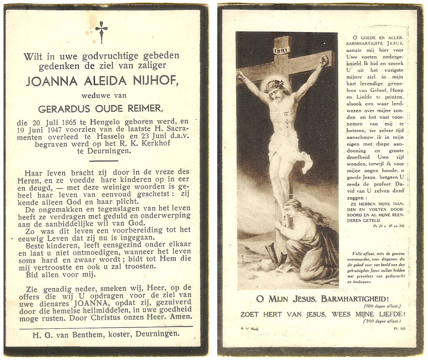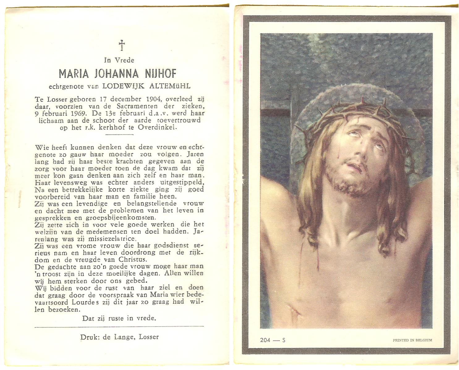 NIJHUIS, Johanna, geboren op 09-01-1878 te De Lutte, overleden op 29-1-1965 op 87-jarige leeftijd, begraven op 3-2-1965 te Losser.