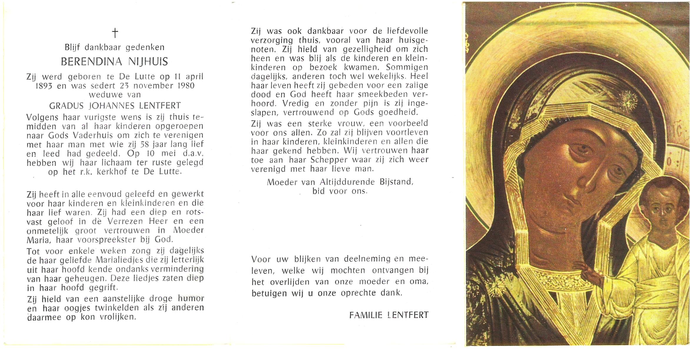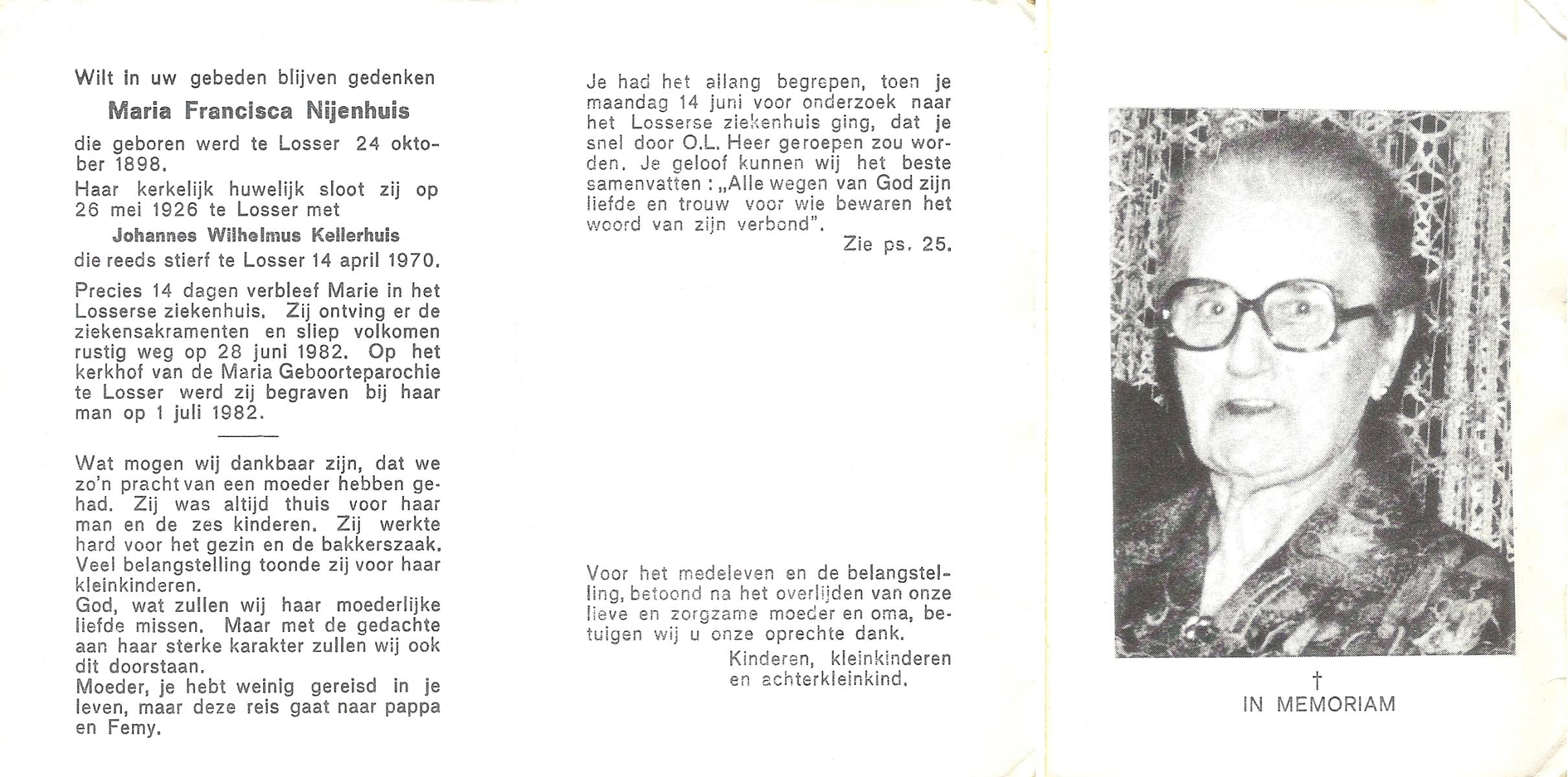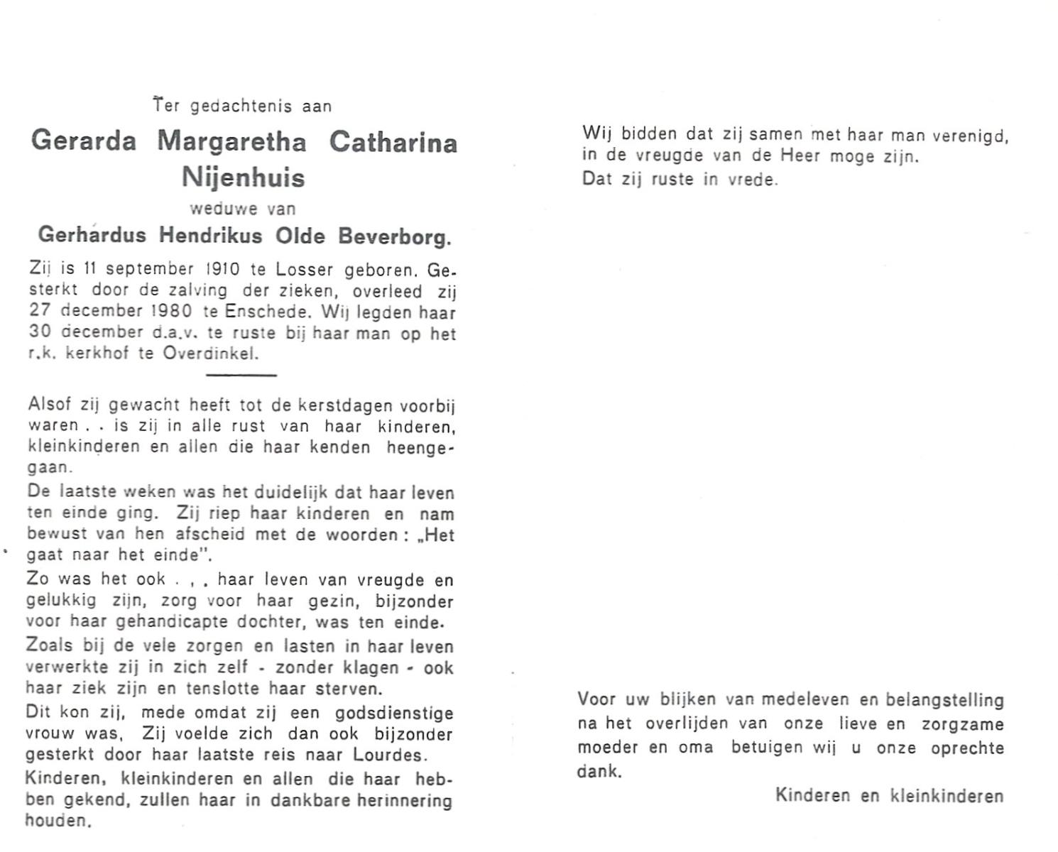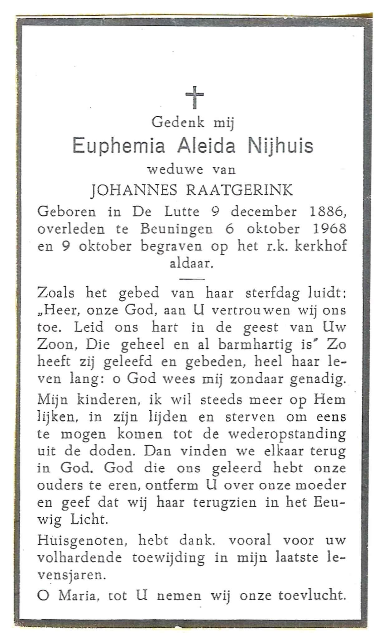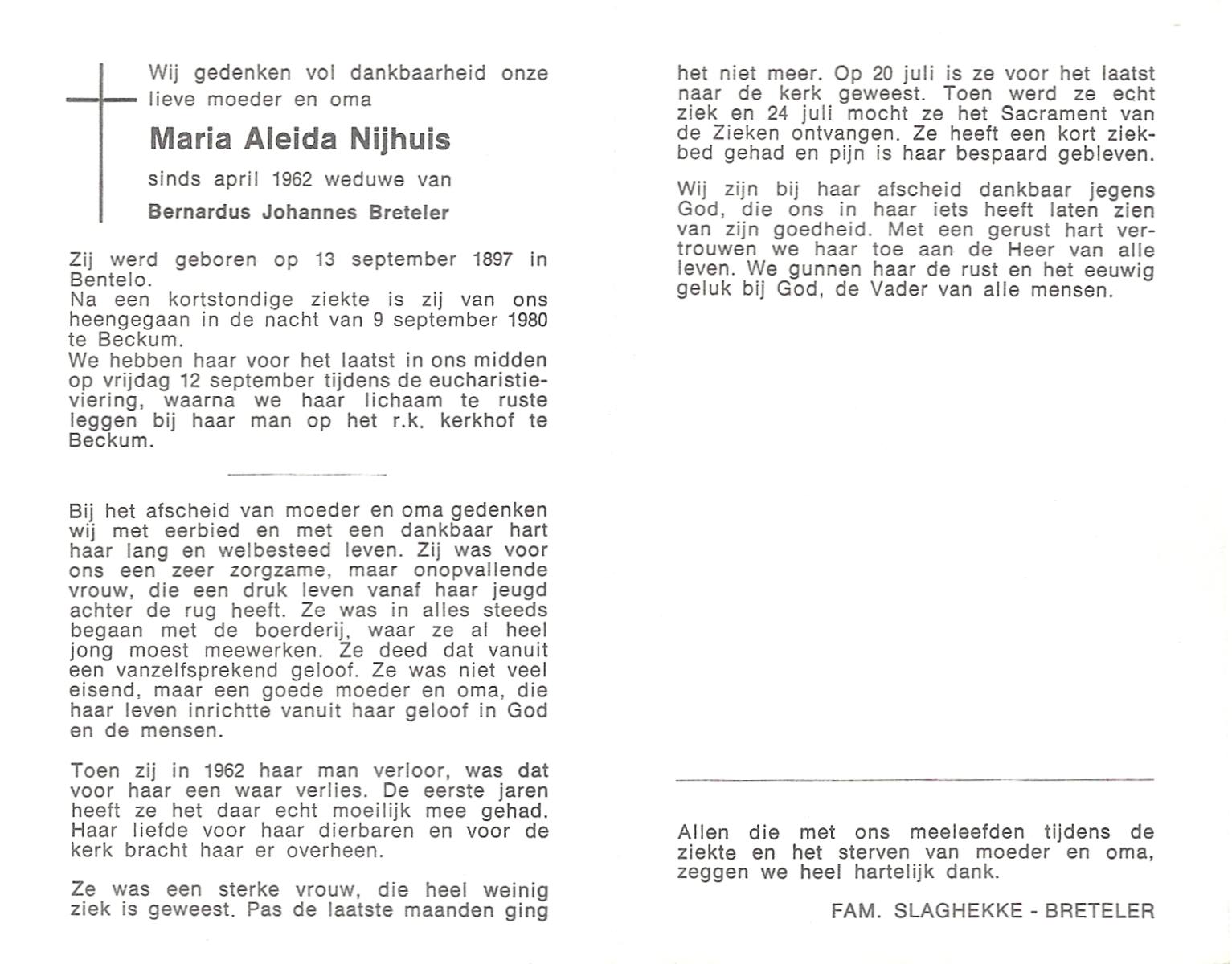 NIJHUIS, Maria Aleida, geboren op 13-09-1897 te Bentelo, overleden op 9-9-1980 te Beckum op 82-jarige leeftijd, begraven op 12-9-1980 te Beckum.