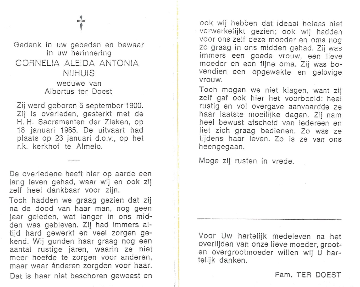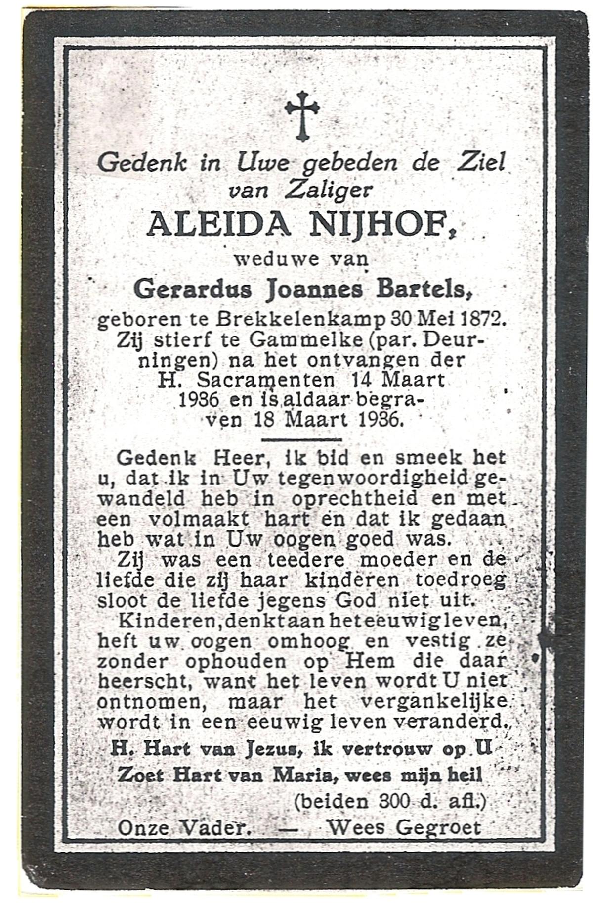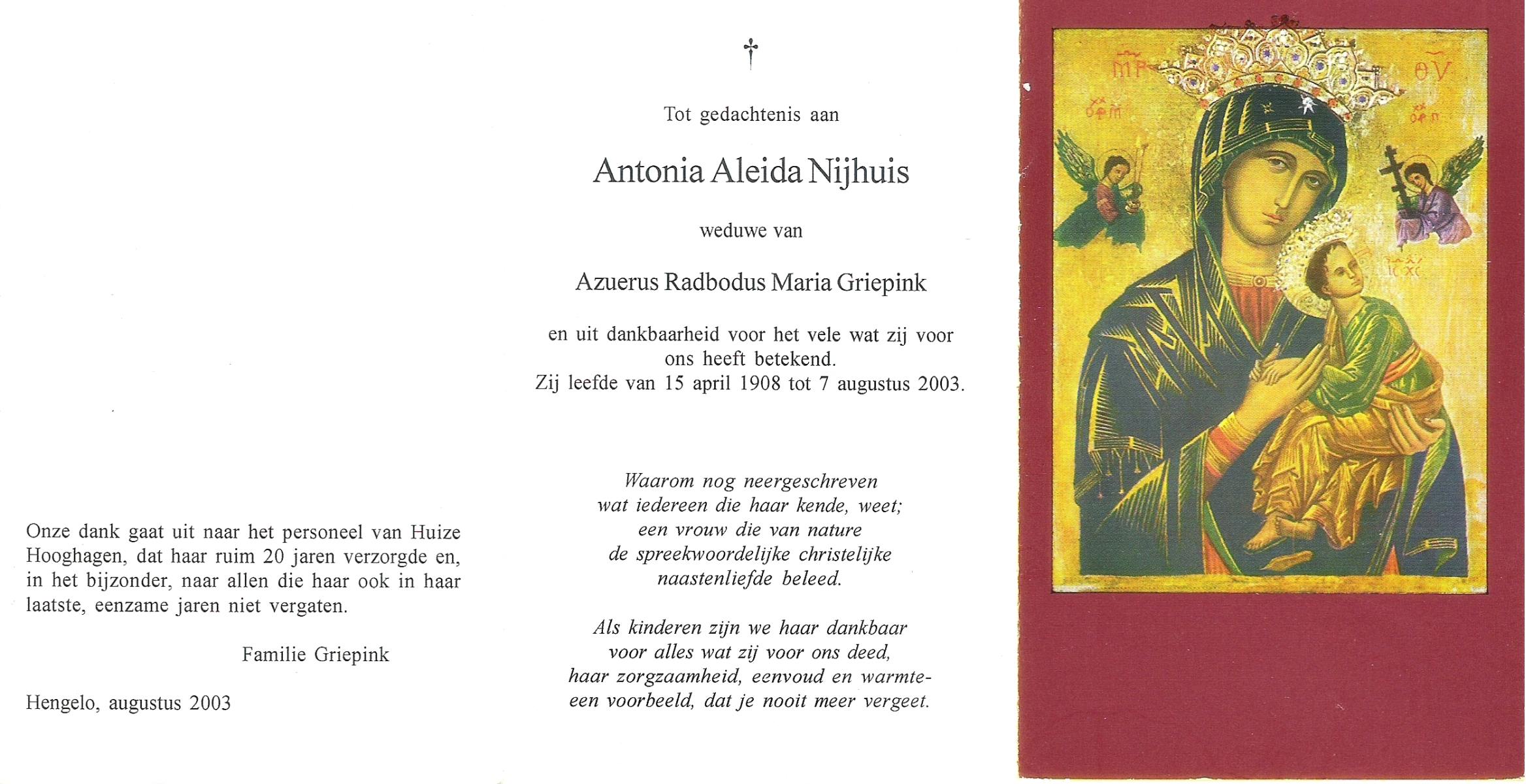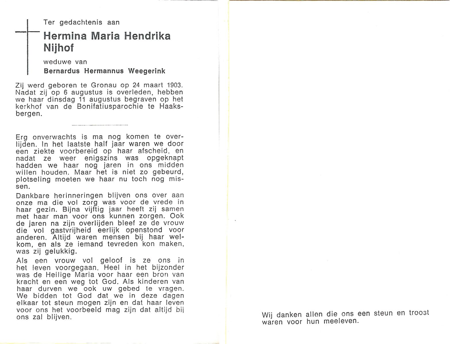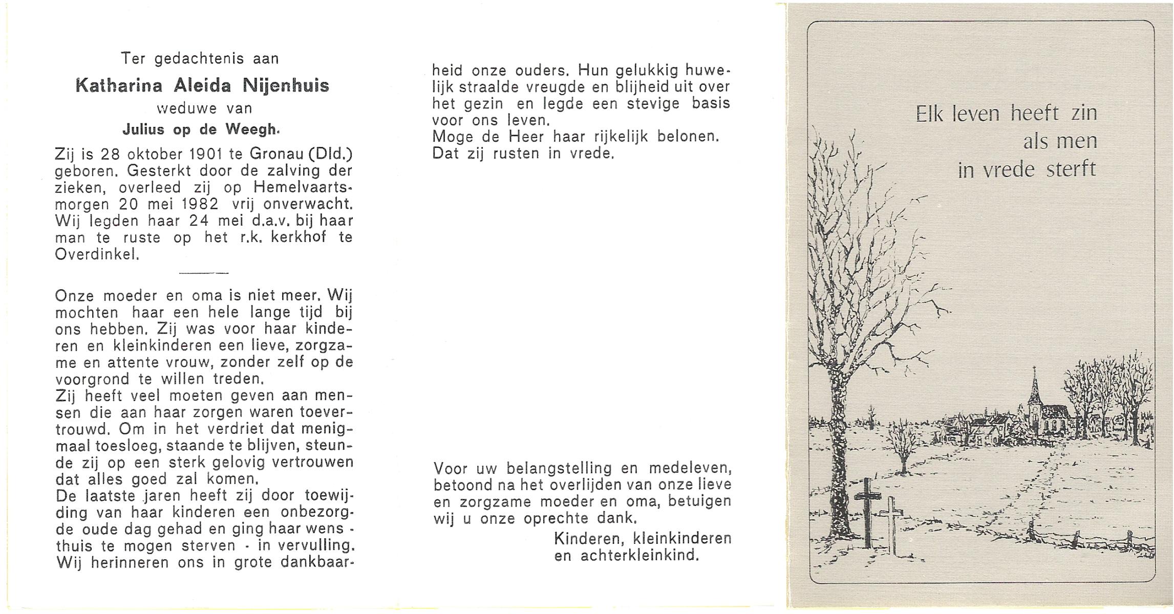 NIJHUIS, Maria Aleida, geboren op 13-09-1897 te Bentelo, overleden op 9-9-1980 te Beckum op 82-jarige leeftijd, begraven op 12-9-1980 te Beckum.