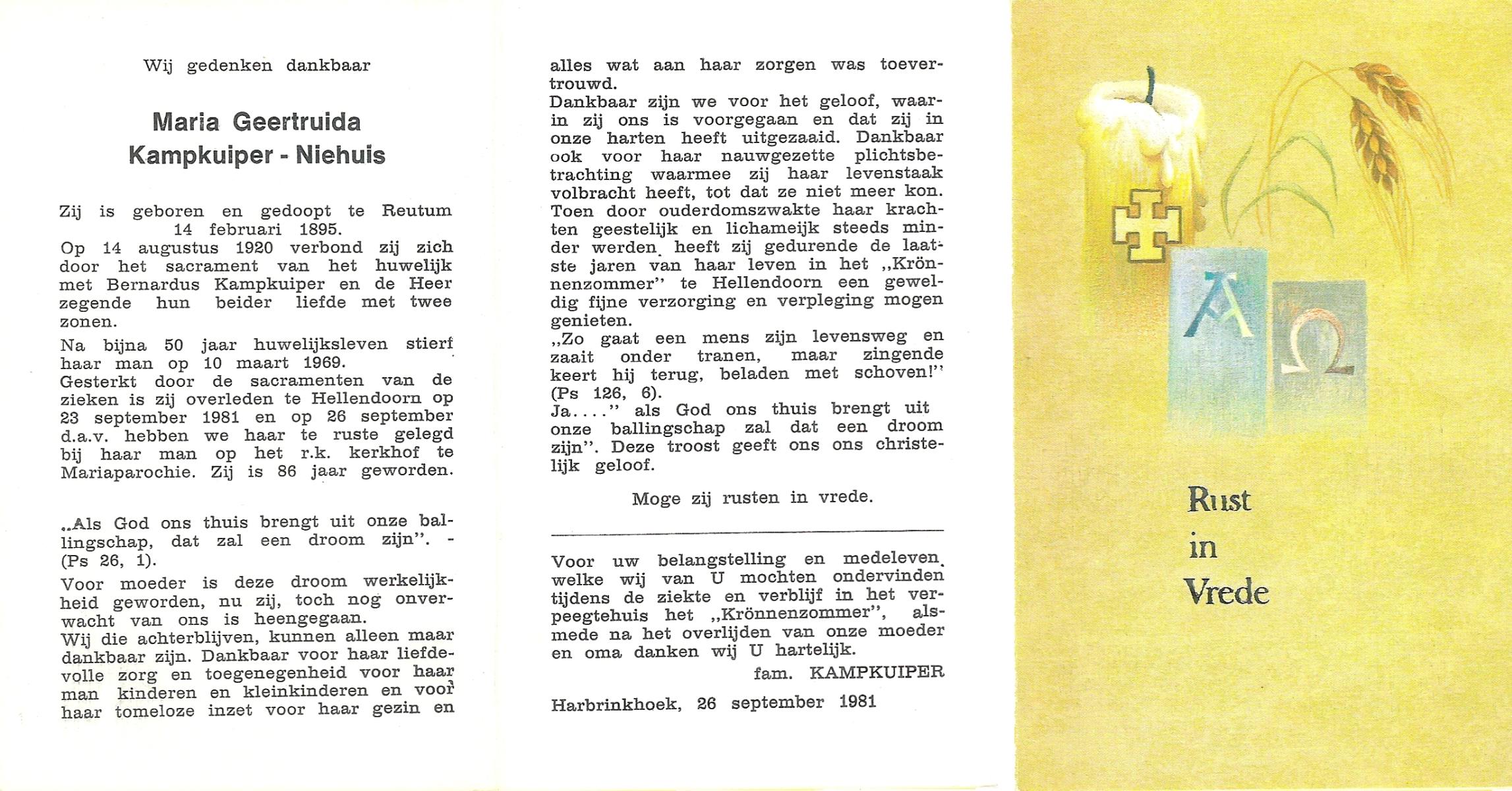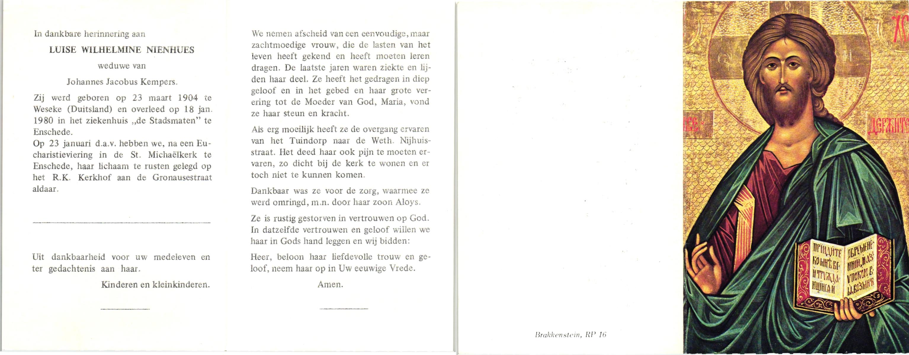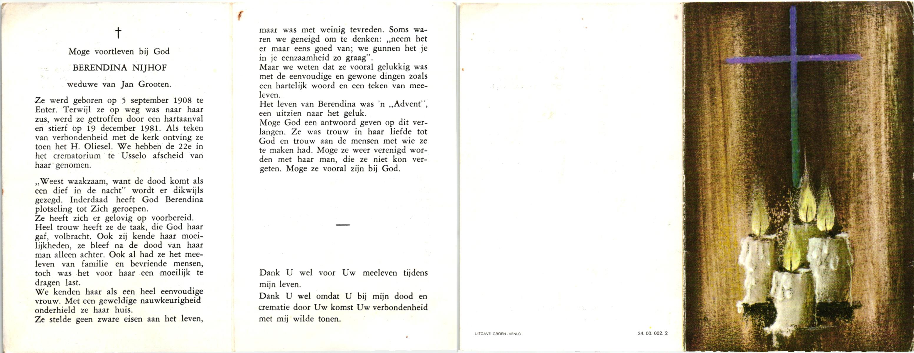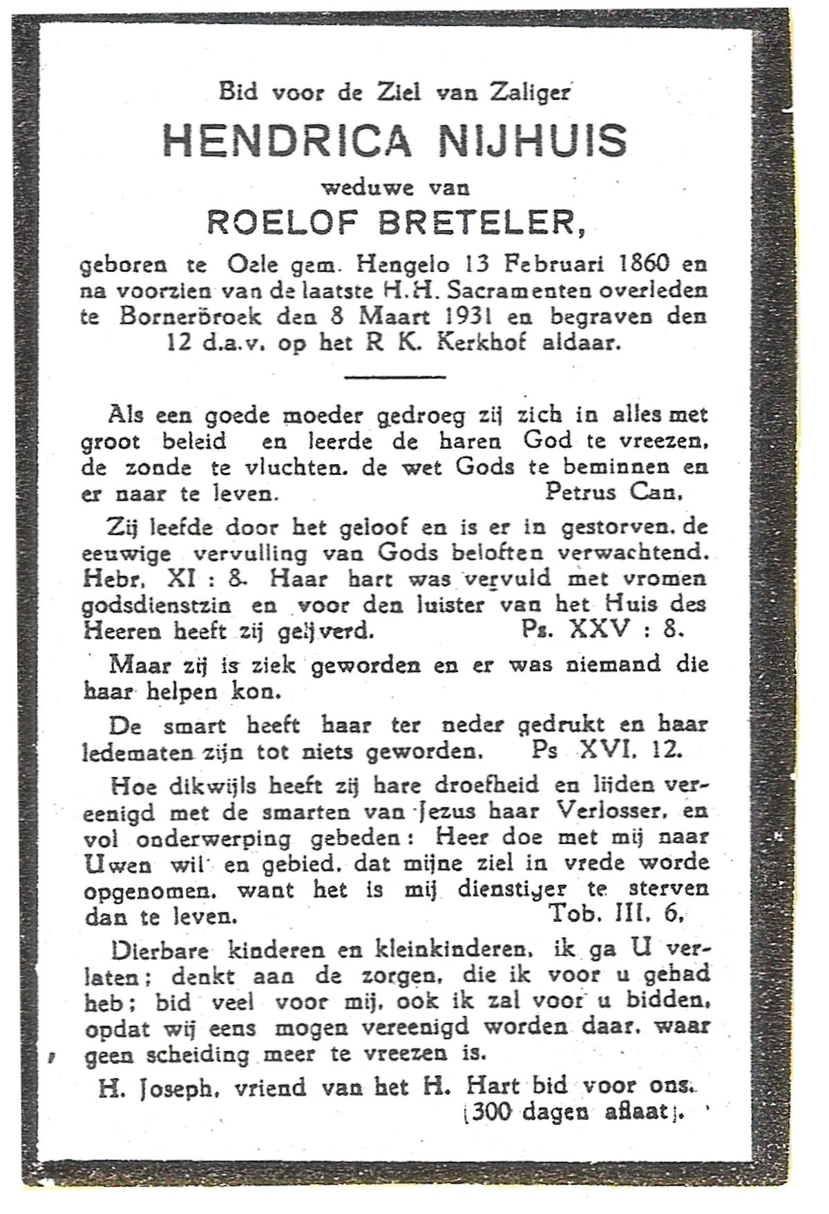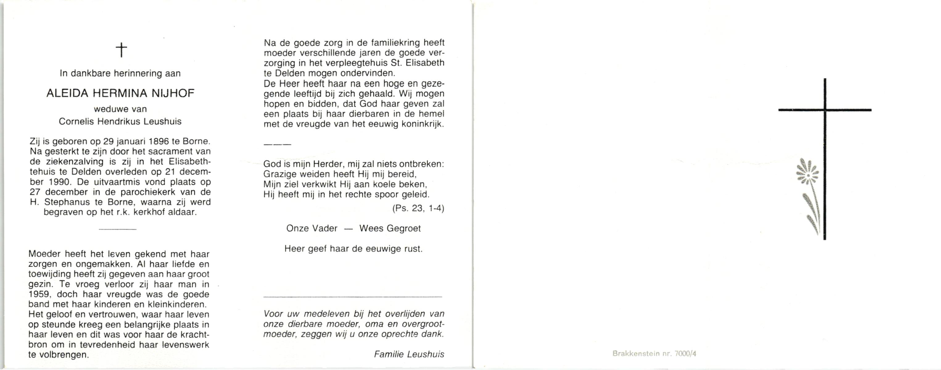 NIJHUIS, Maria Aleida, geboren op 13-09-1897 te Bentelo, overleden op 9-9-1980 te Beckum op 82-jarige leeftijd, begraven op 12-9-1980 te Beckum.