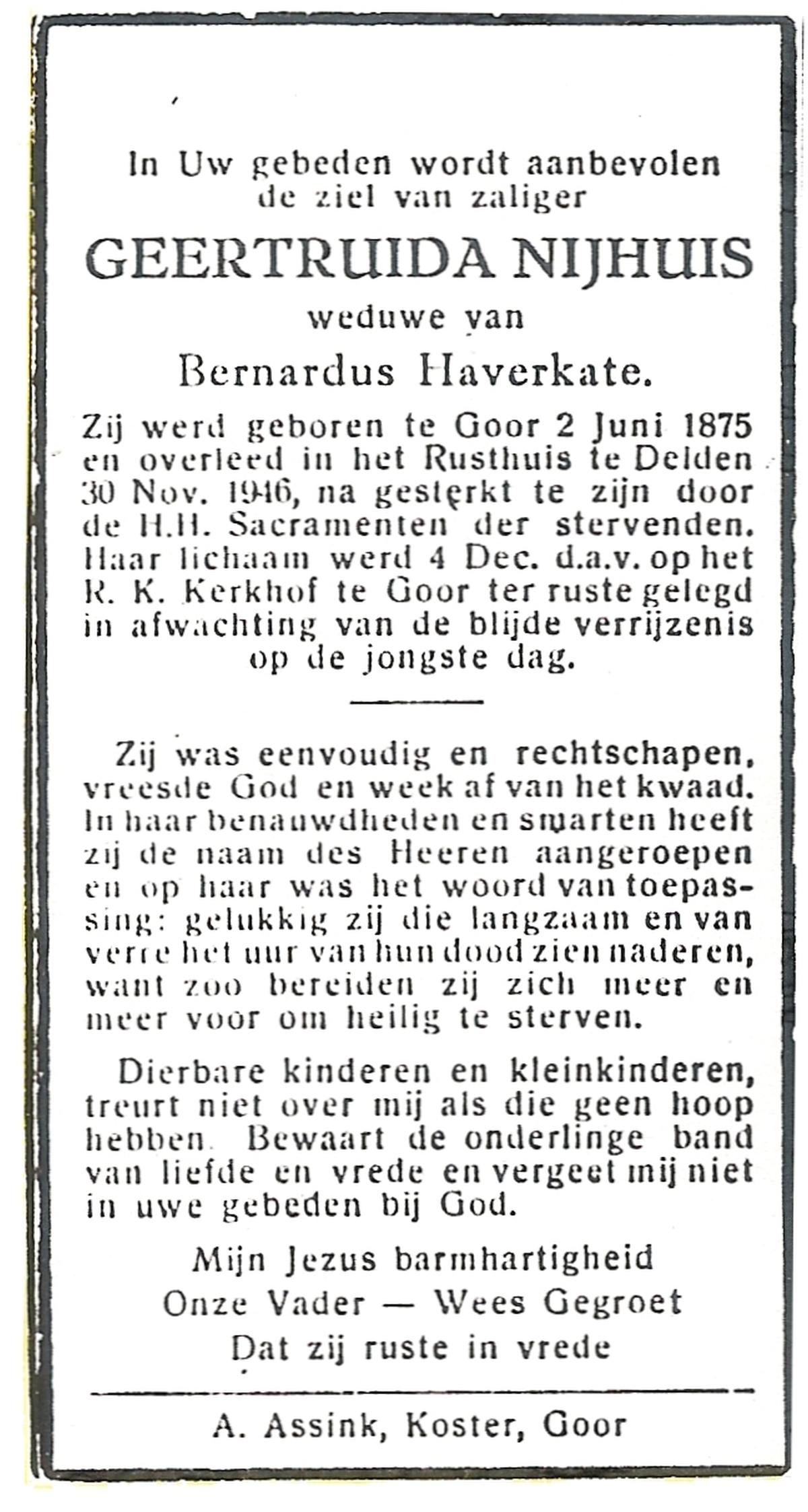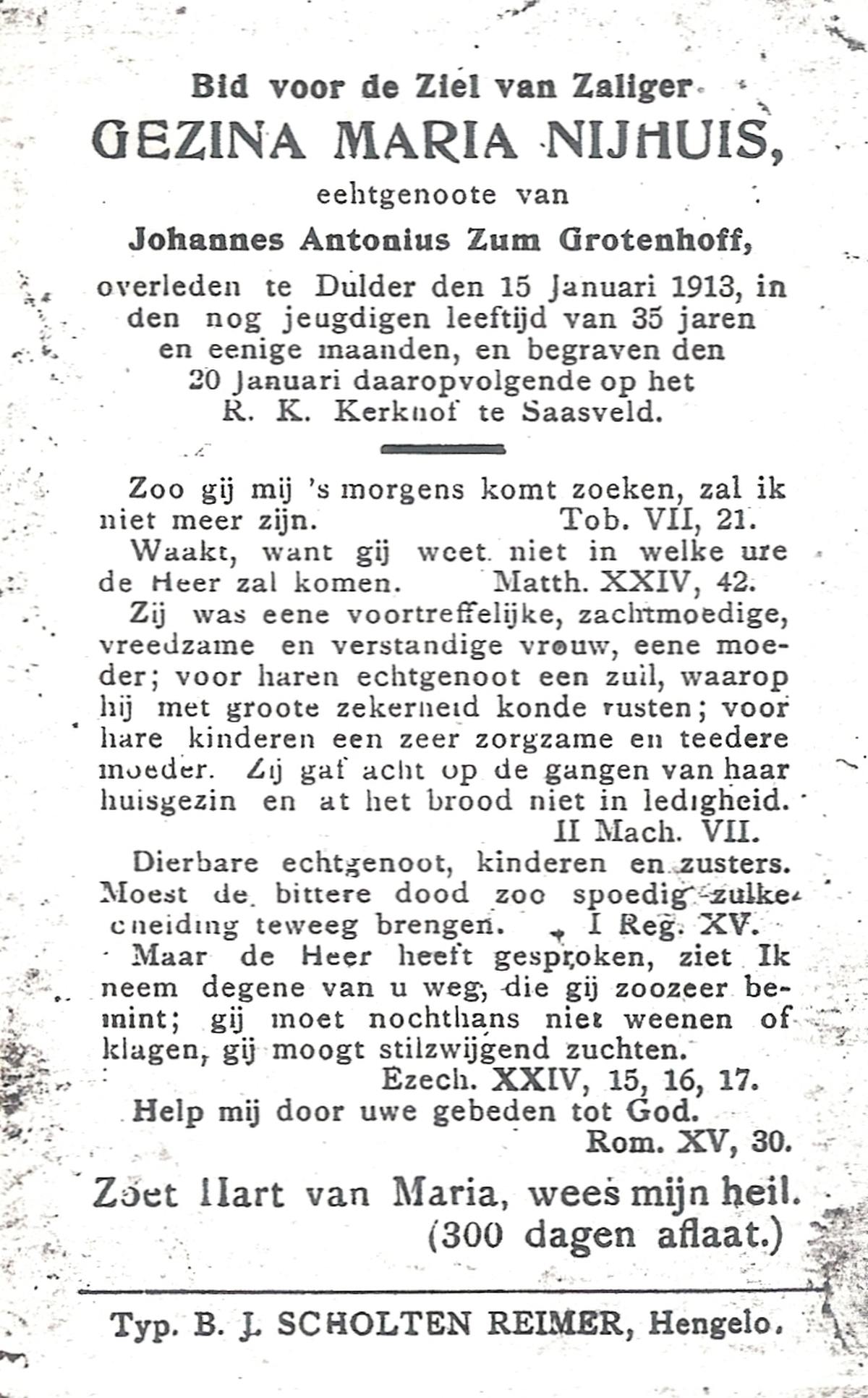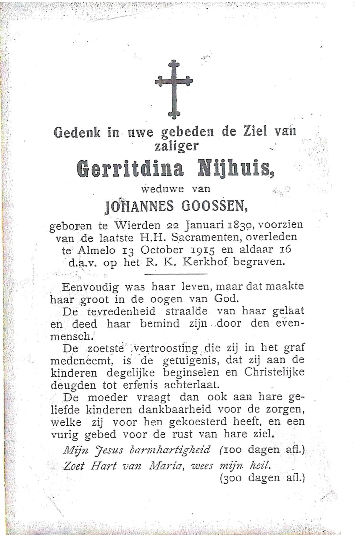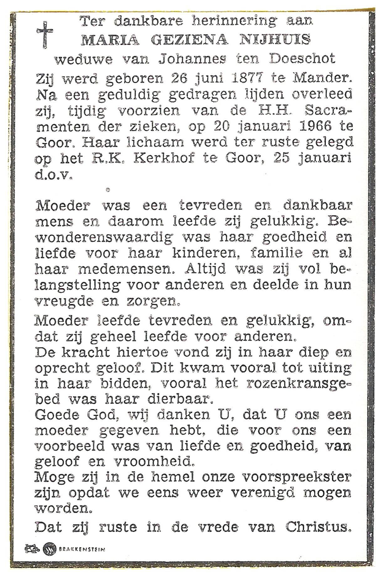 NIJHUIS, Maria Geziena, geboren op 26-06-1877 te Mander, overleden op 20-1-1966 te Goor op 88-jarige leeftijd, begraven op 25-1-1966 te Goor.