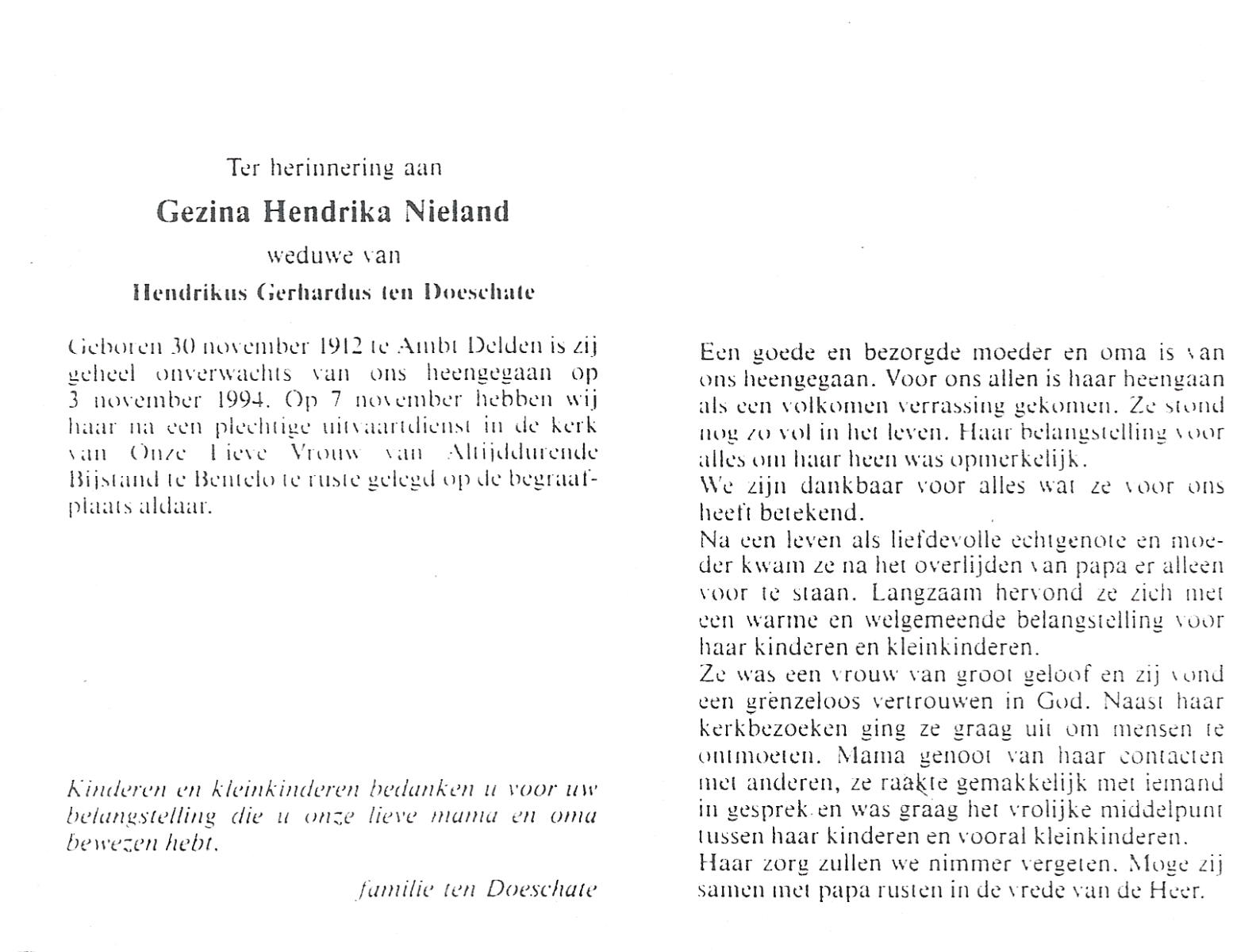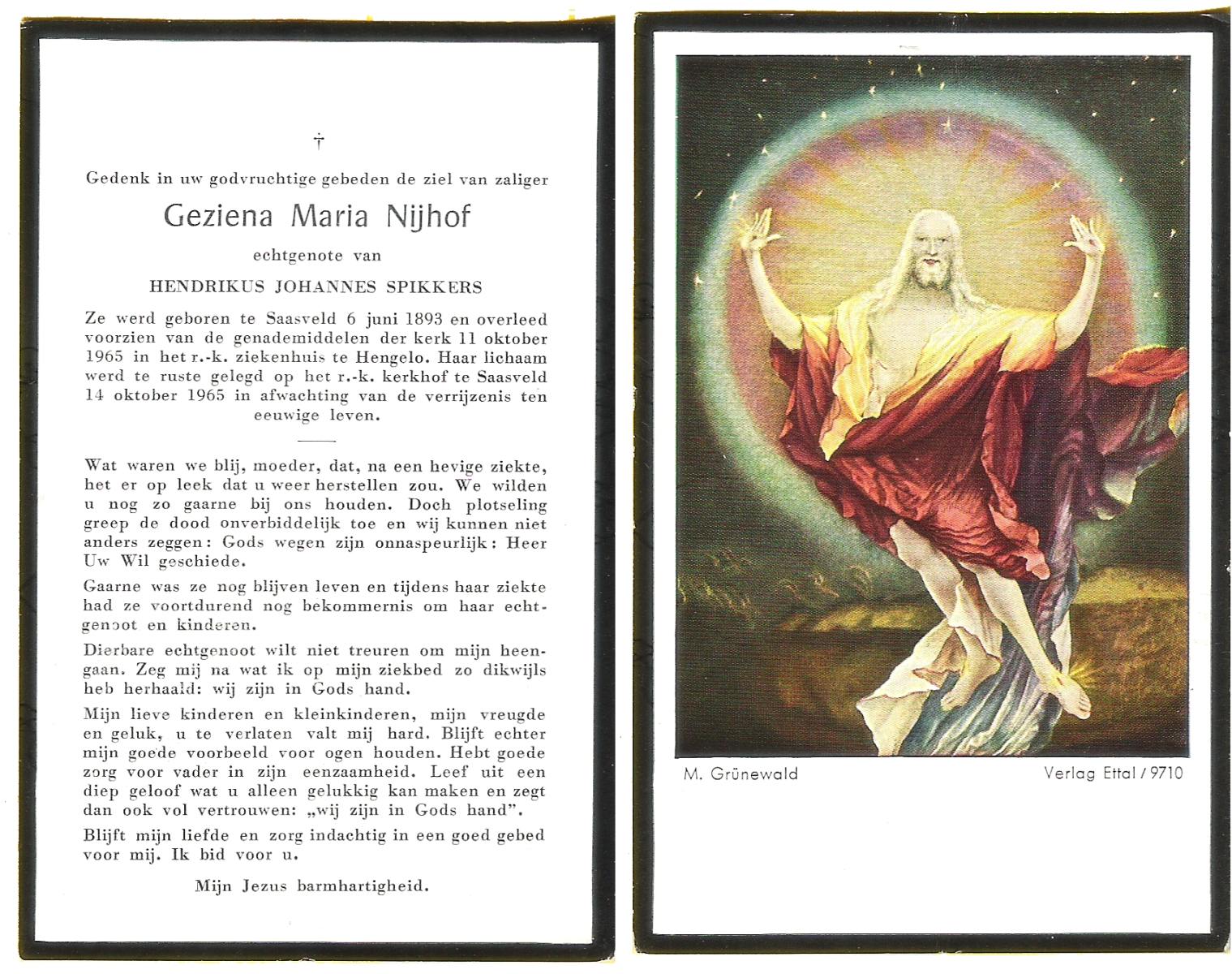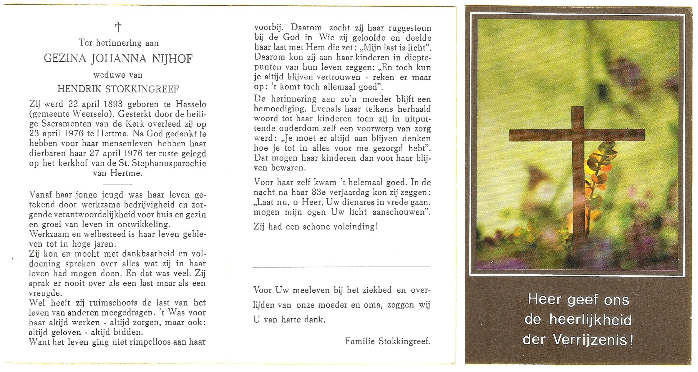 NIJHUIS, Maria Geziena, geboren op 26-06-1877 te Mander, overleden op 20-1-1966 te Goor op 88-jarige leeftijd, begraven op 25-1-1966 te Goor.