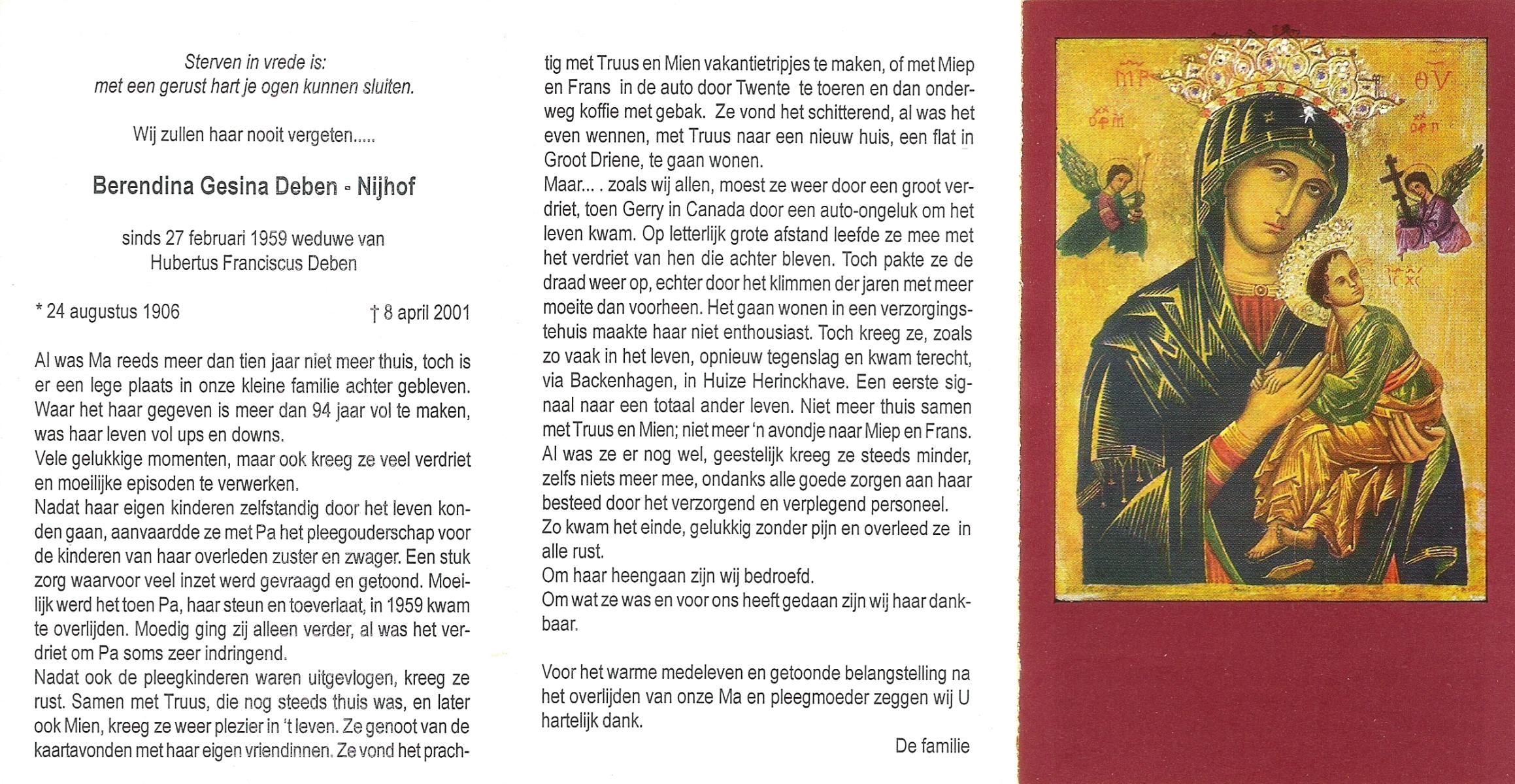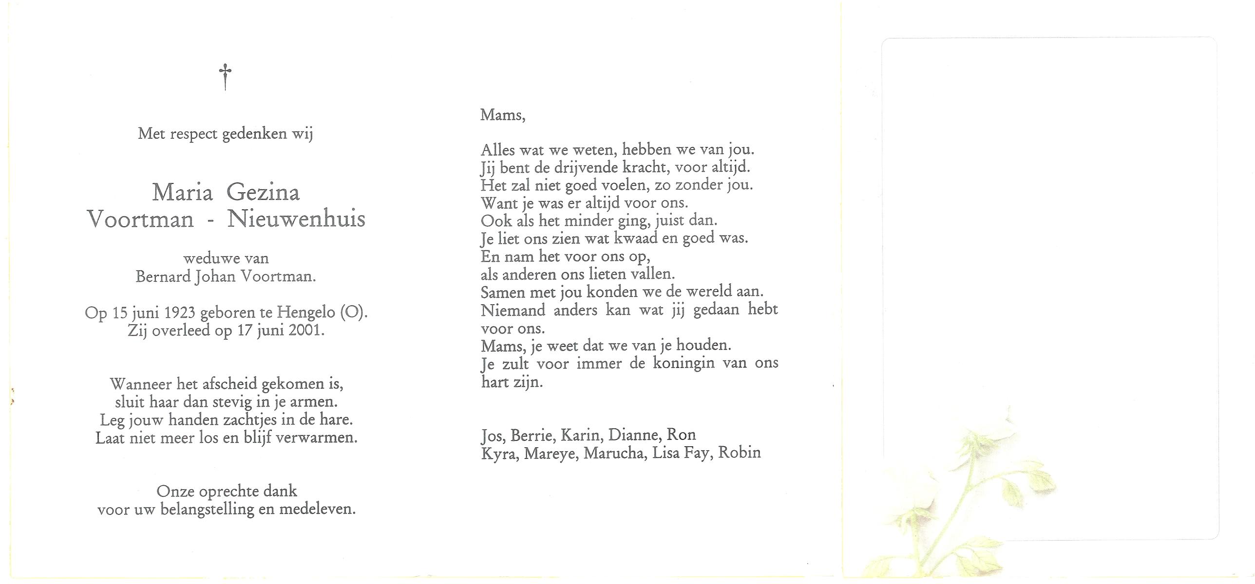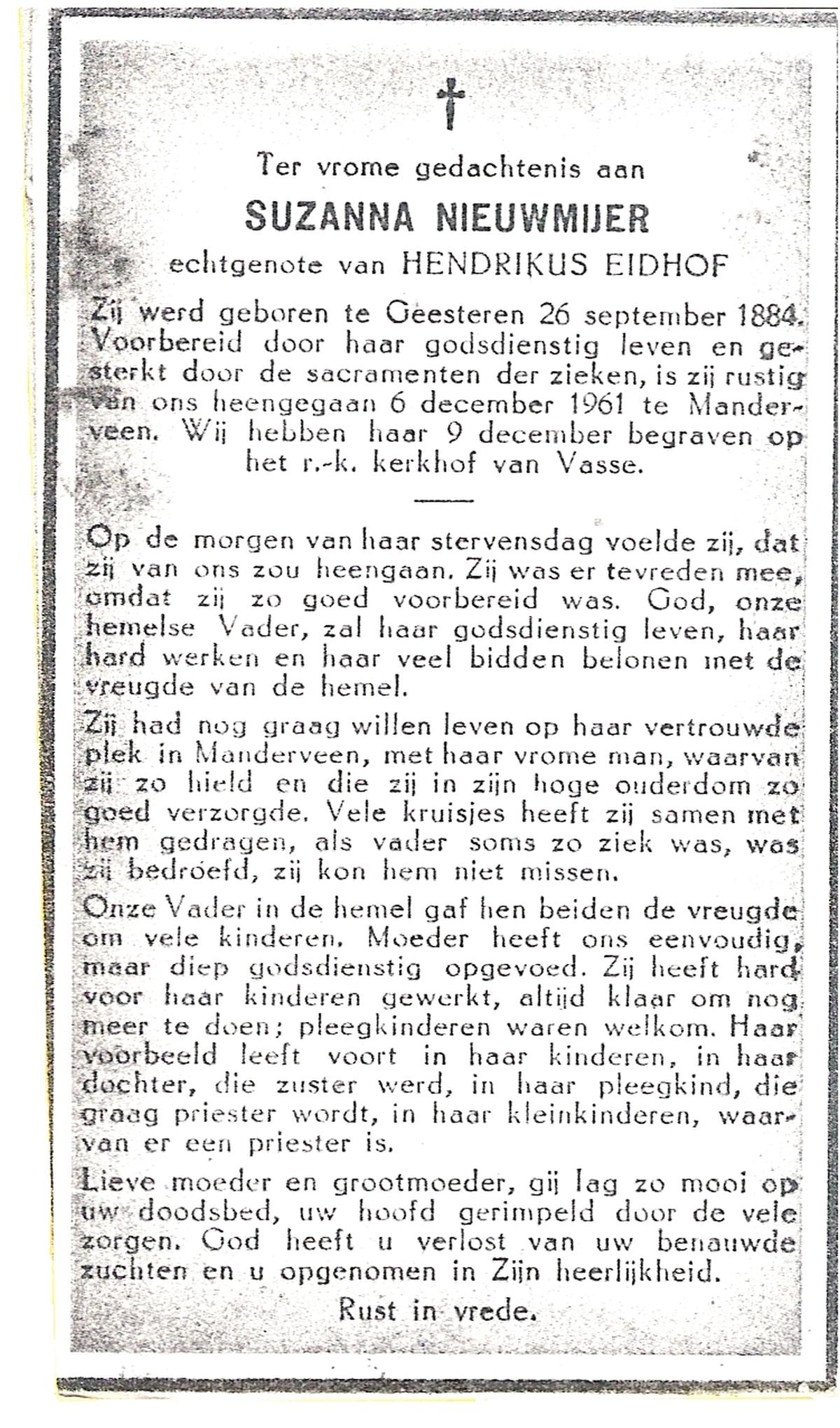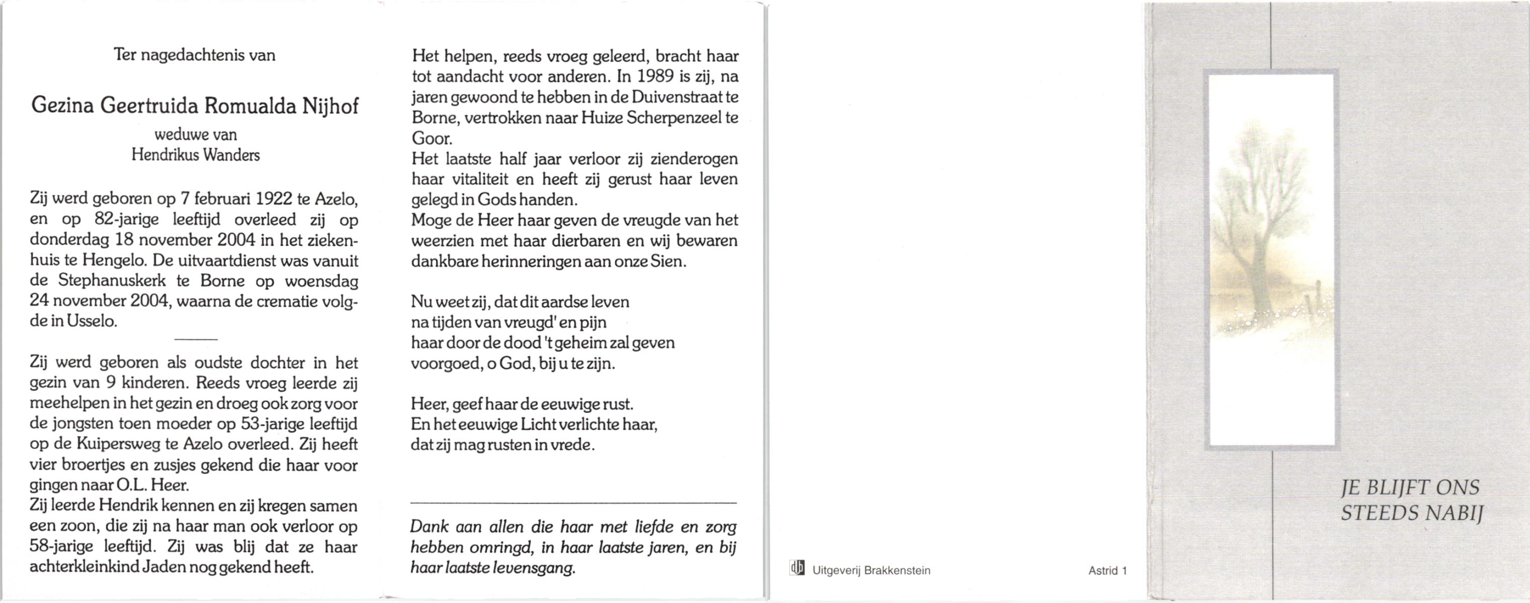 NIJHUIS, Maria Geziena, geboren op 26-06-1877 te Mander, overleden op 20-1-1966 te Goor op 88-jarige leeftijd, begraven op 25-1-1966 te Goor.