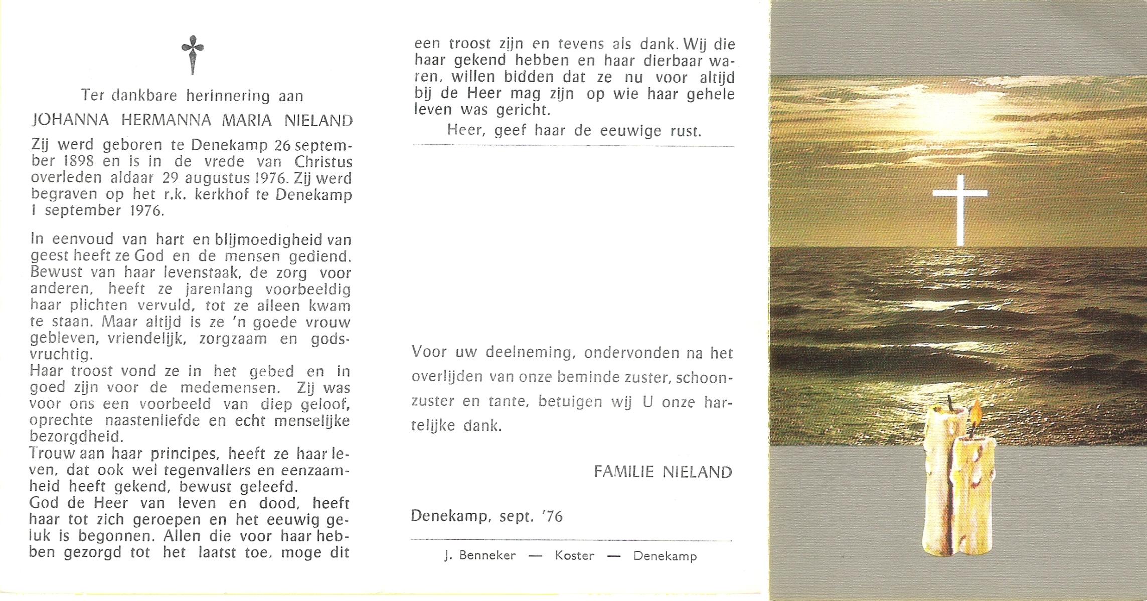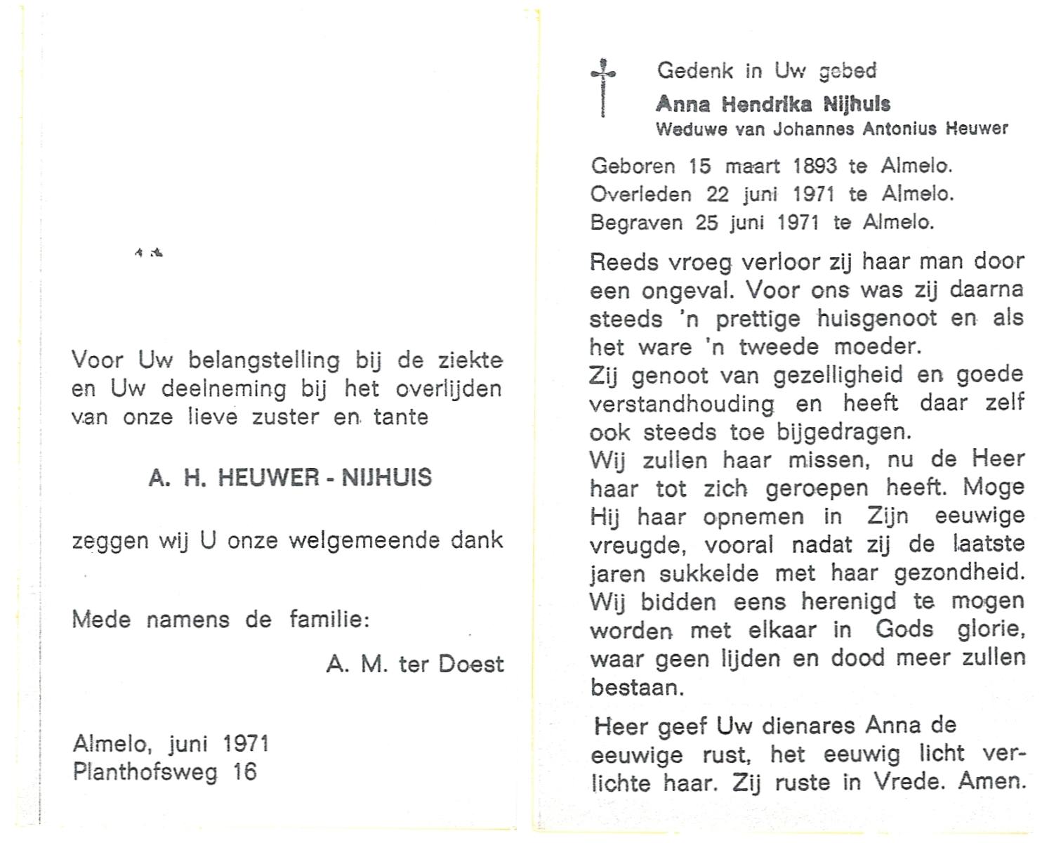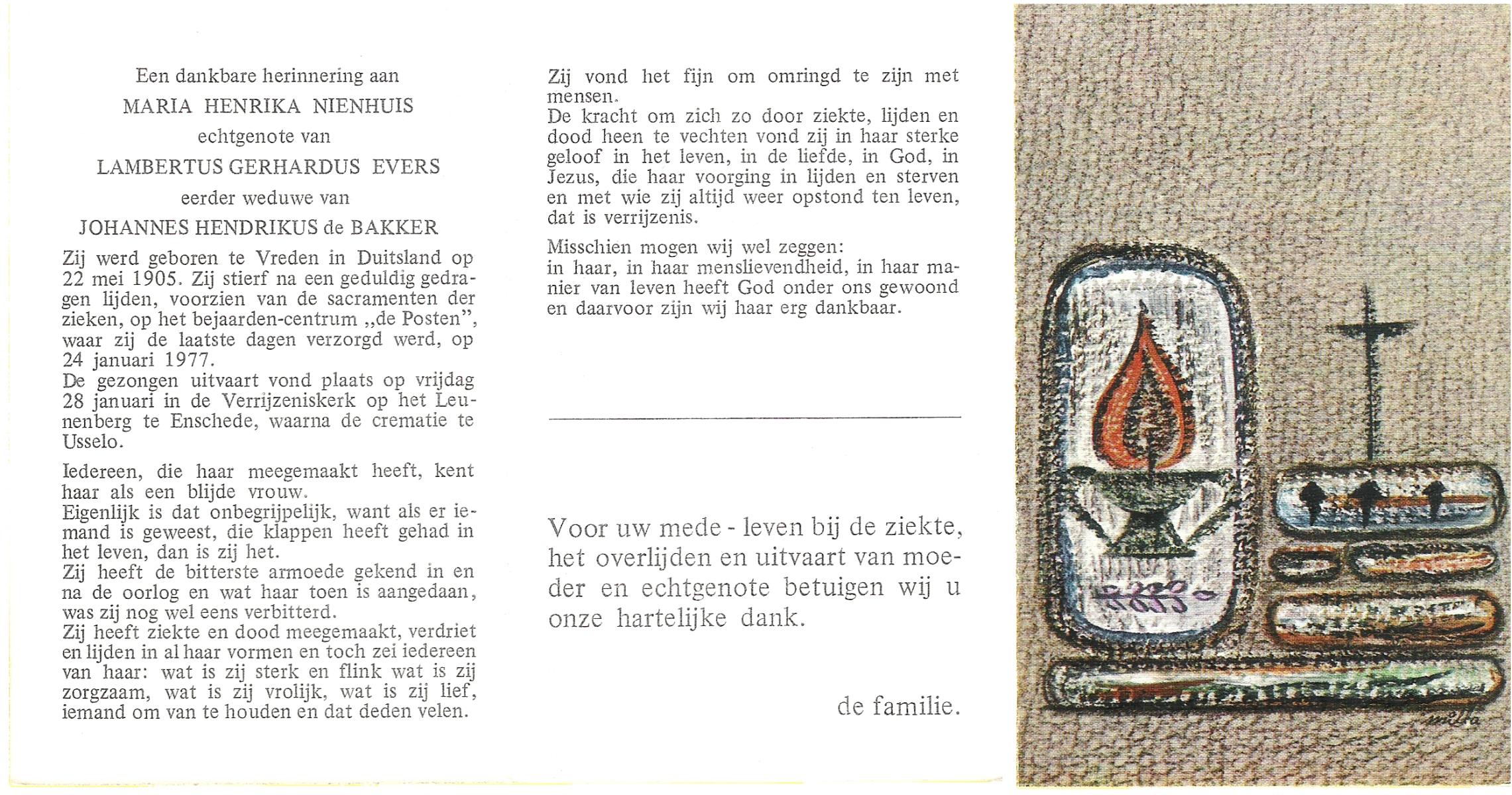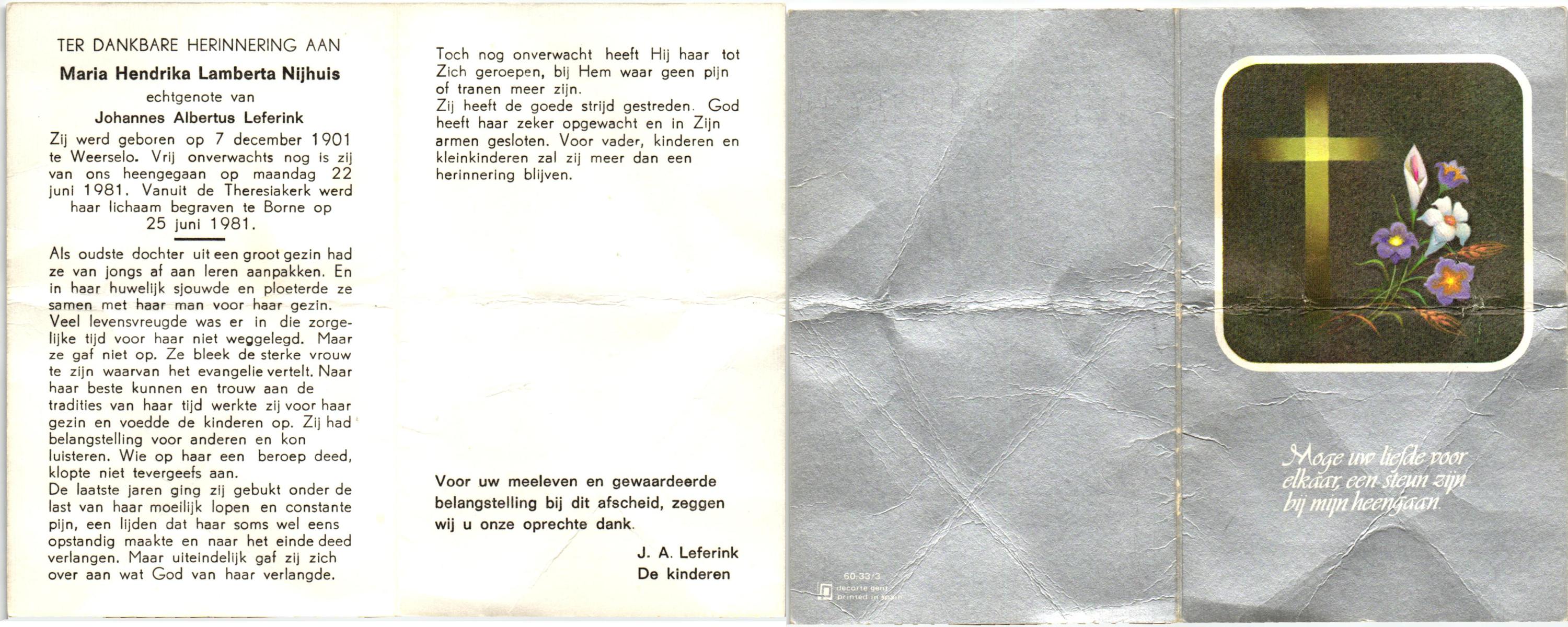 NIJHUIS, Maria Hendrika Lamberta, geboren op 7-12-1901 te Weerselo, overleden op 22-6-1981 op 79-jarige leeftijd, begraven op 25-6-1981 te Borne.