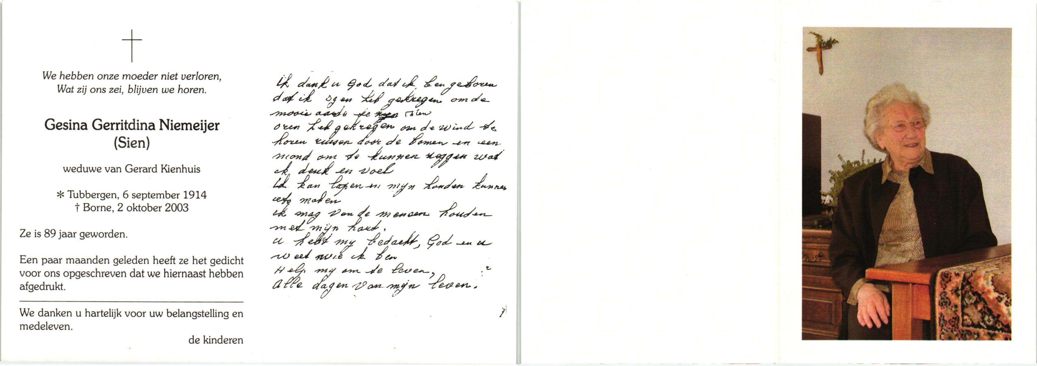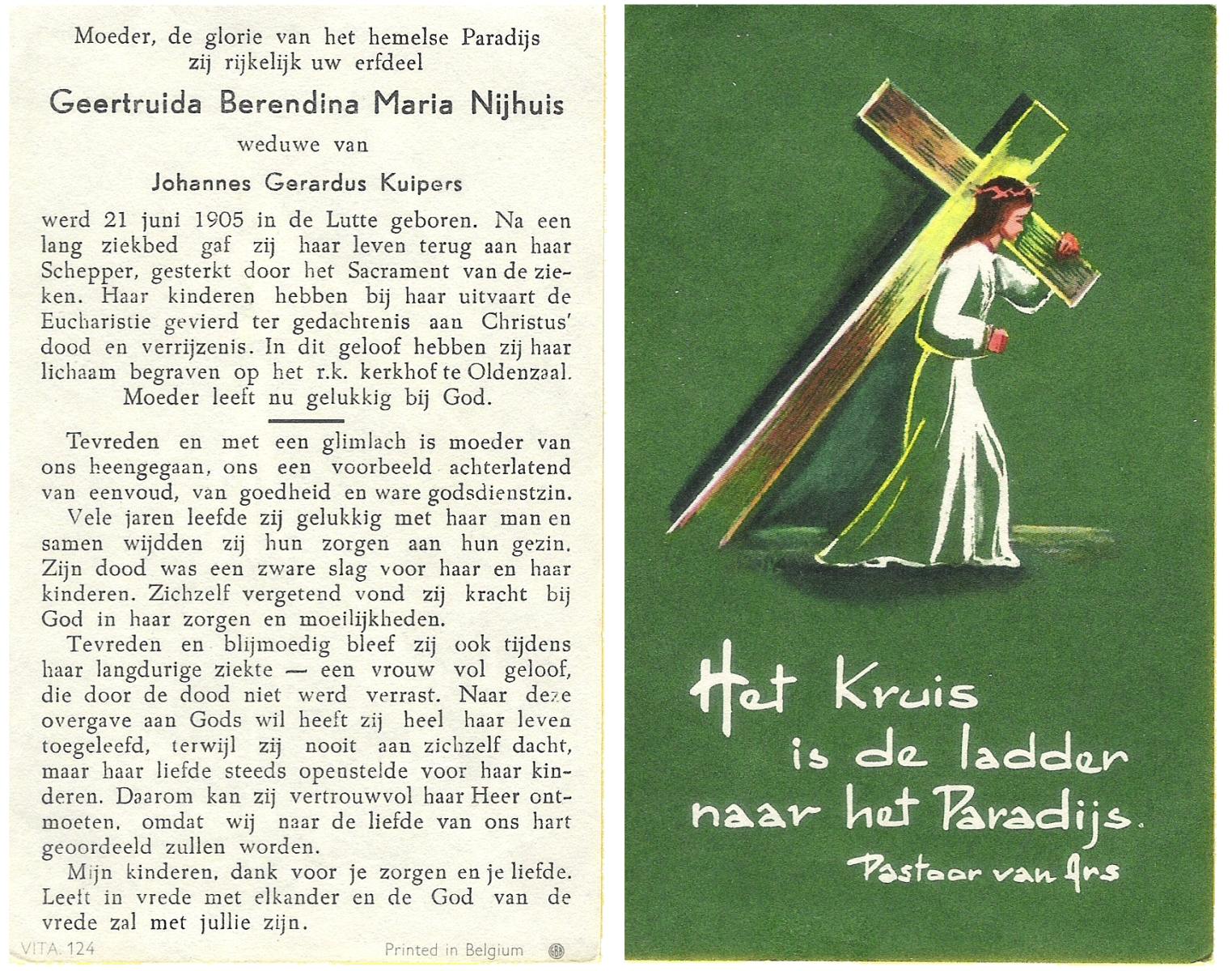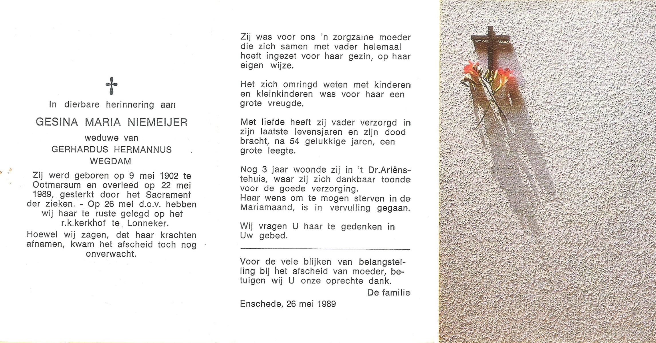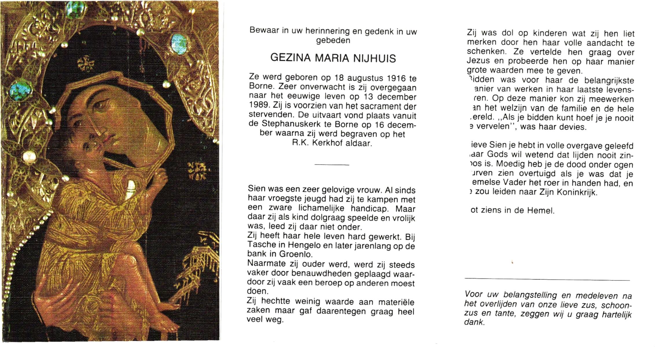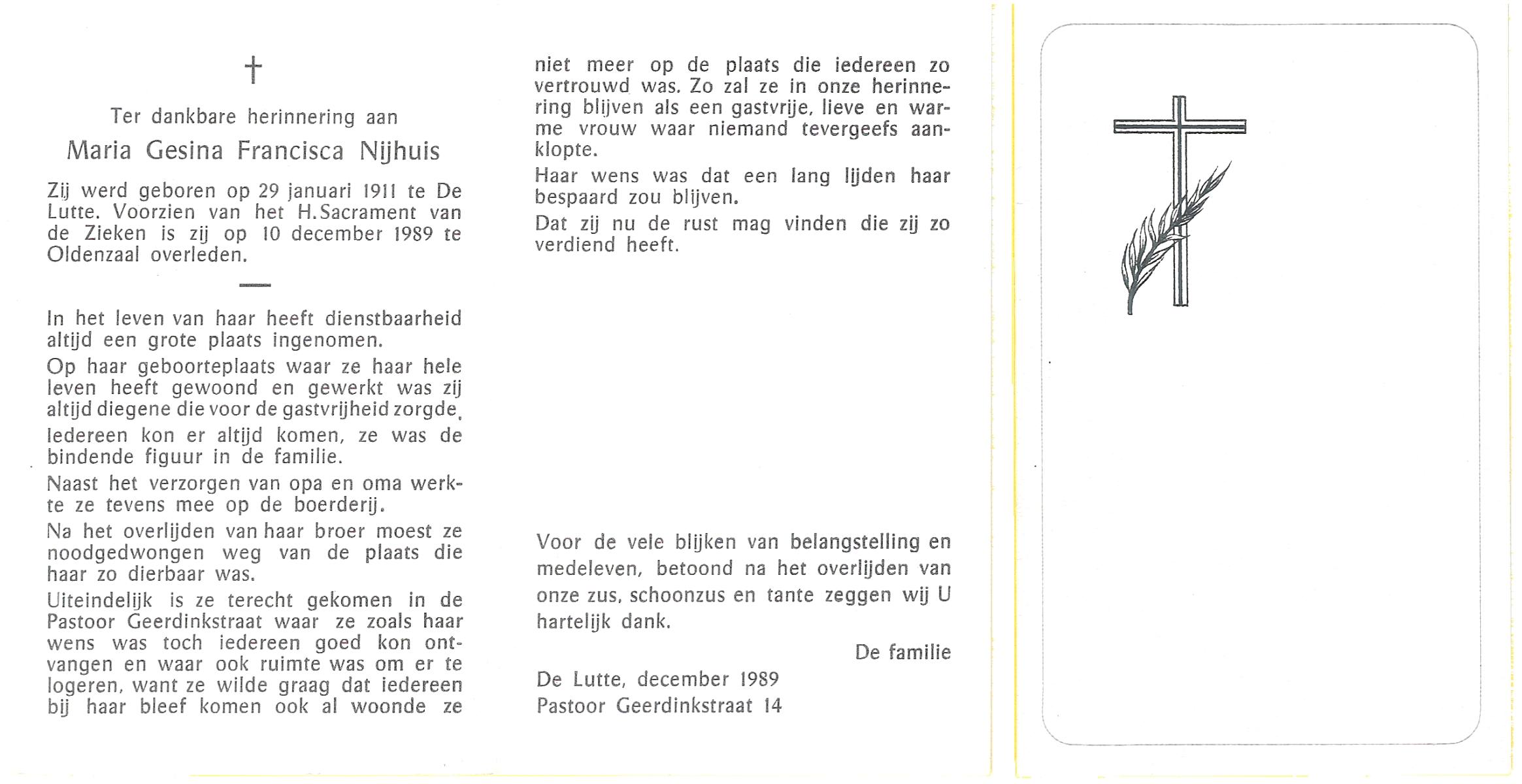 NIJHUIS, Maria Gesina Francisca, geboren op 29-1-1911 te De Lutte, overleden op 10-12-1989 te Oldenzaal op 78-jarige leeftijd.