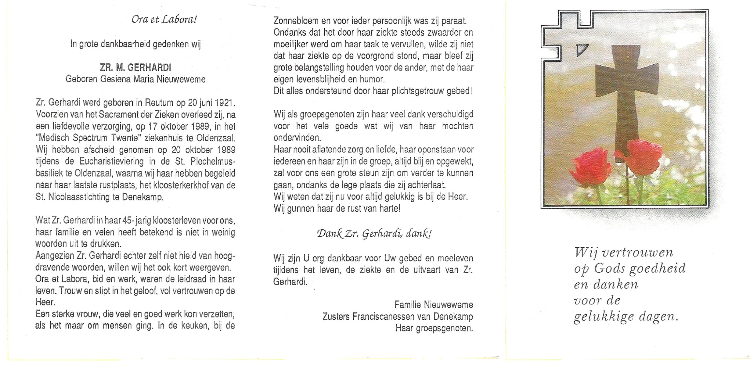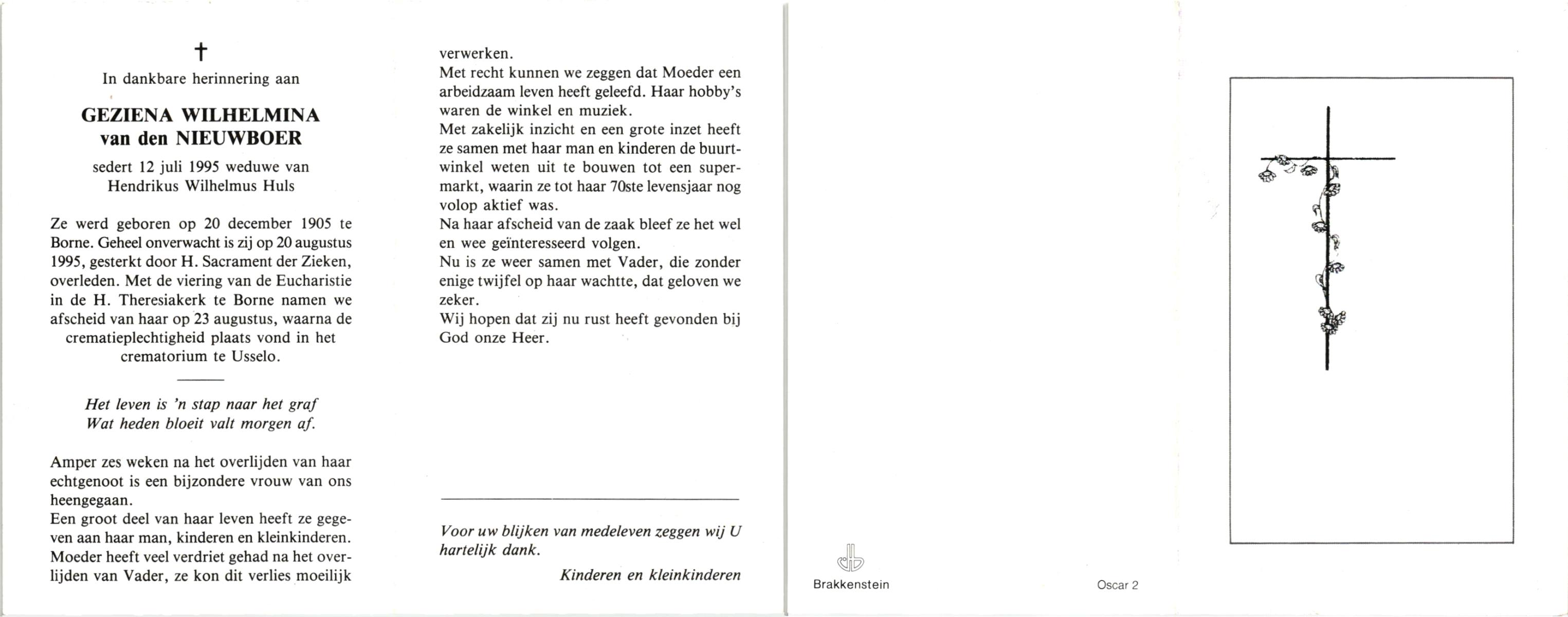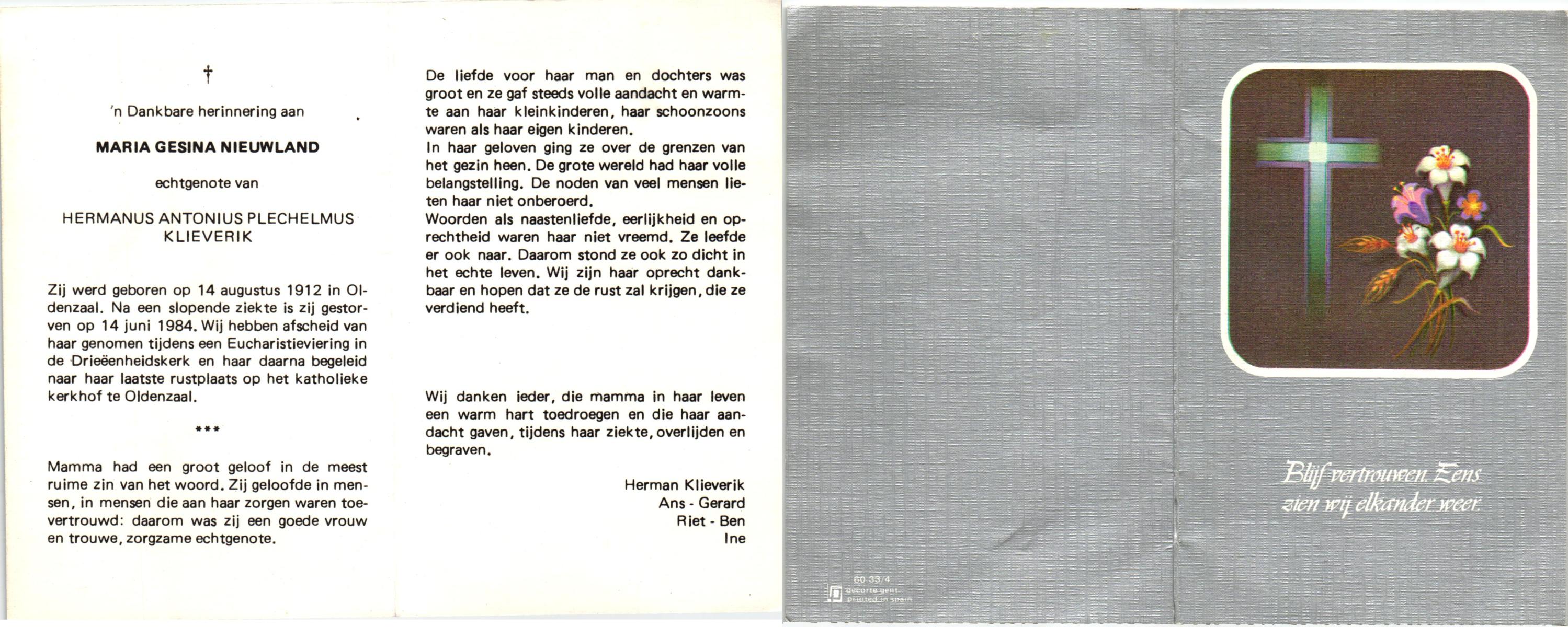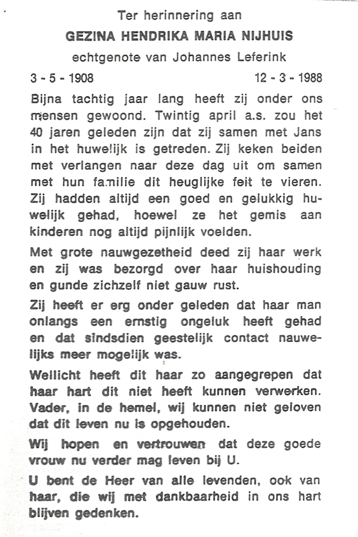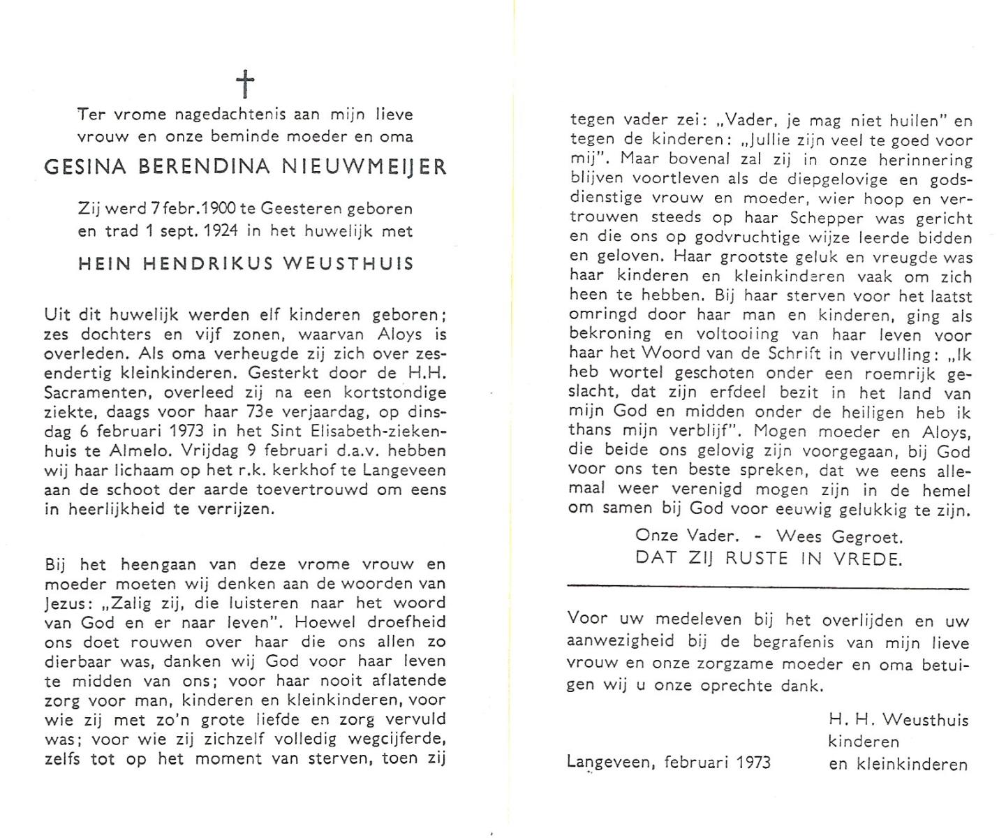 NIJHUIS, Maria Gesina Francisca, geboren op 29-1-1911 te De Lutte, overleden op 10-12-1989 te Oldenzaal op 78-jarige leeftijd.