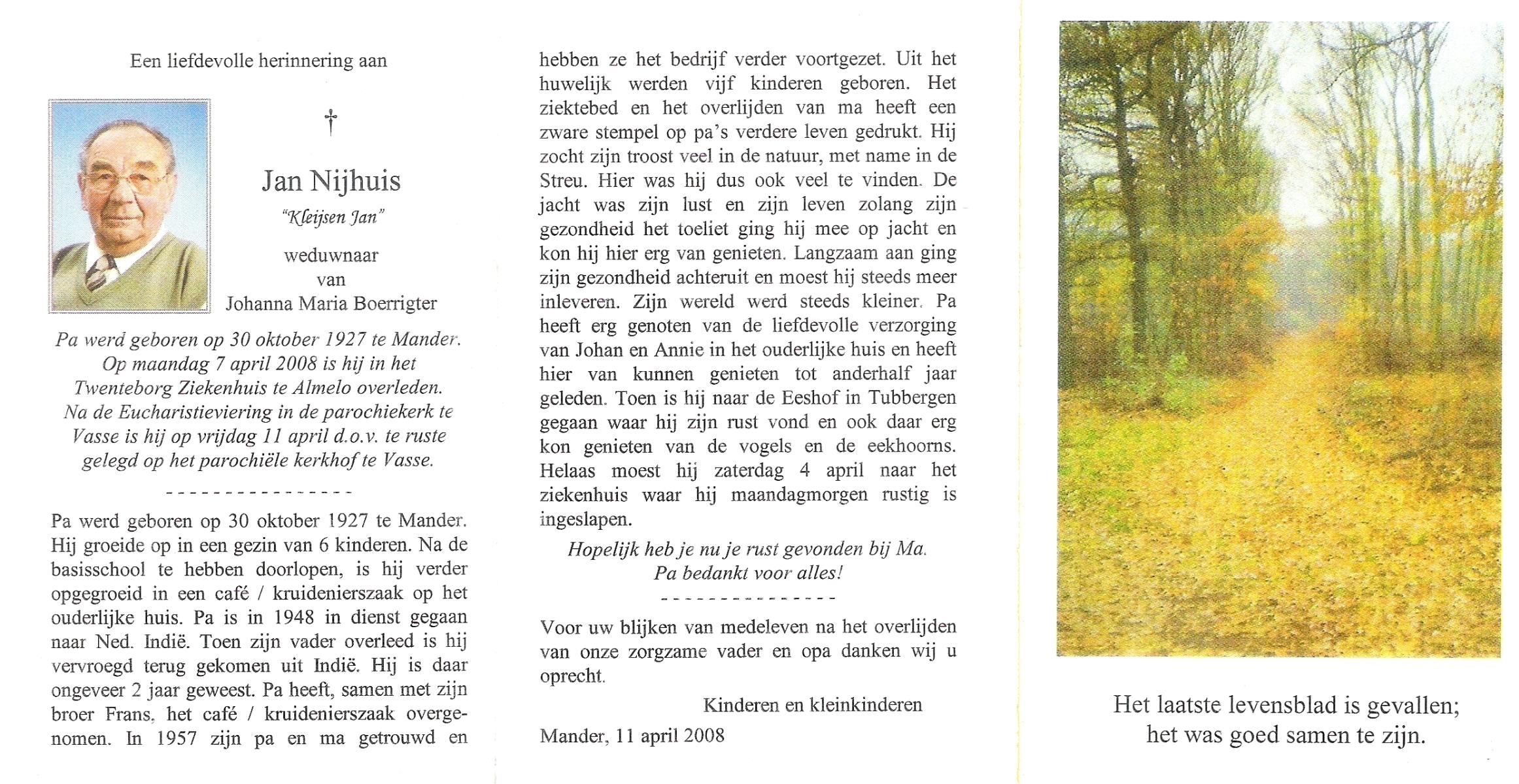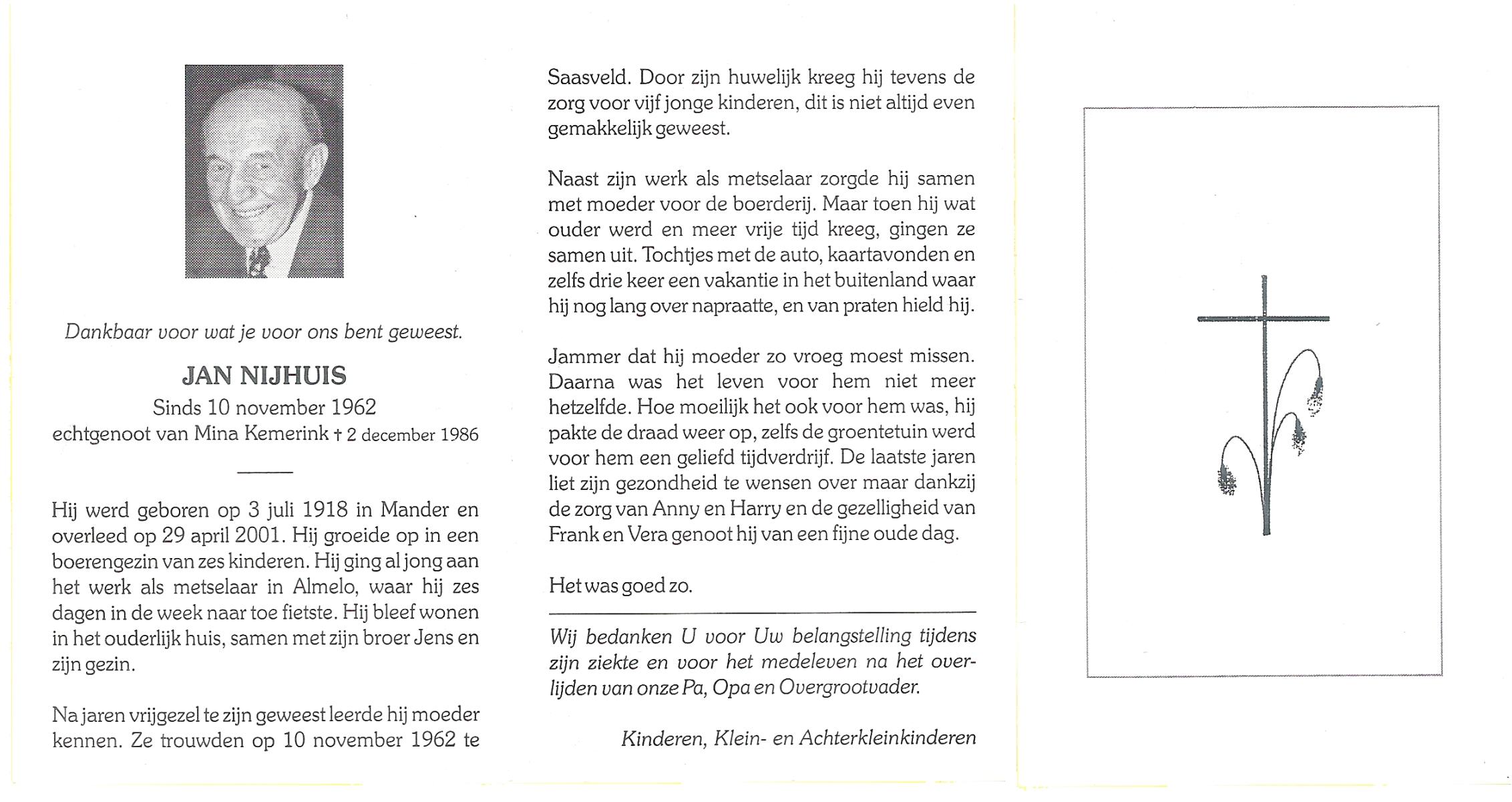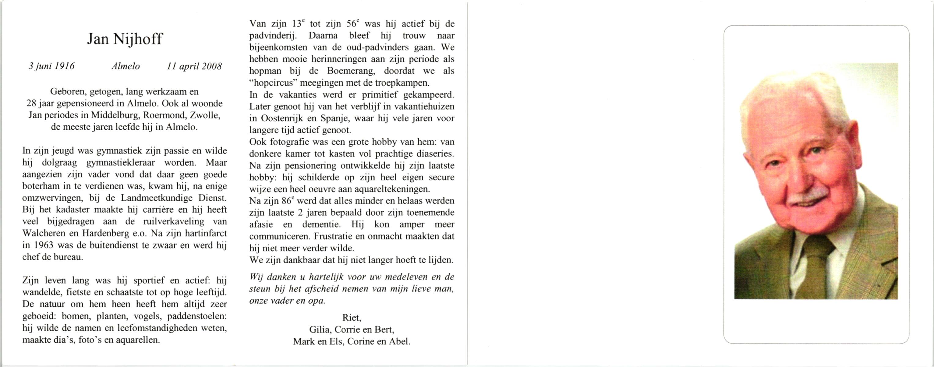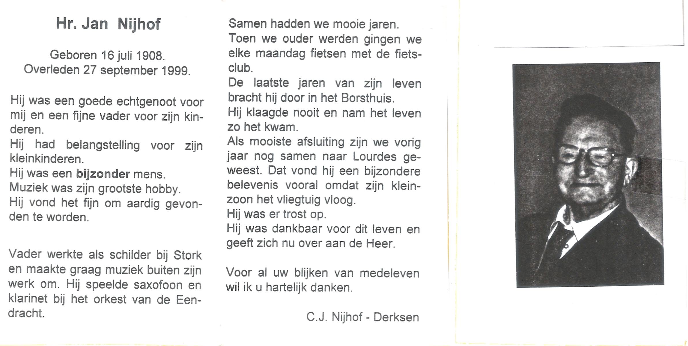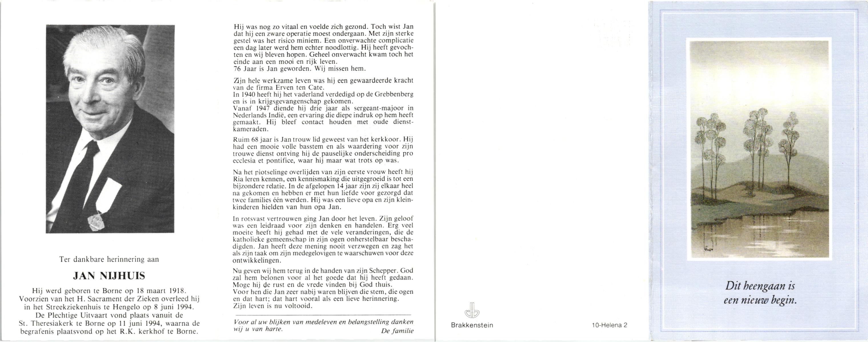 NIJHUIS, , Jan, geboren op 18-3-1918 te Borne, overleden op 8-6-1994 te Hengelo (O) op 76-jarige leeftijd, begraven op 11-6-1994 te Borne.