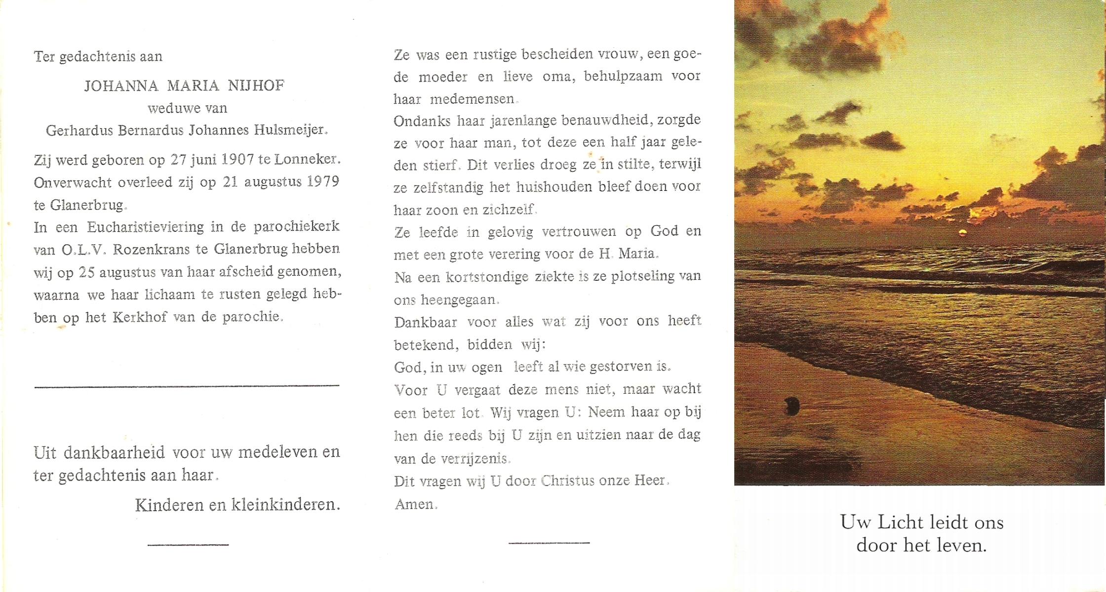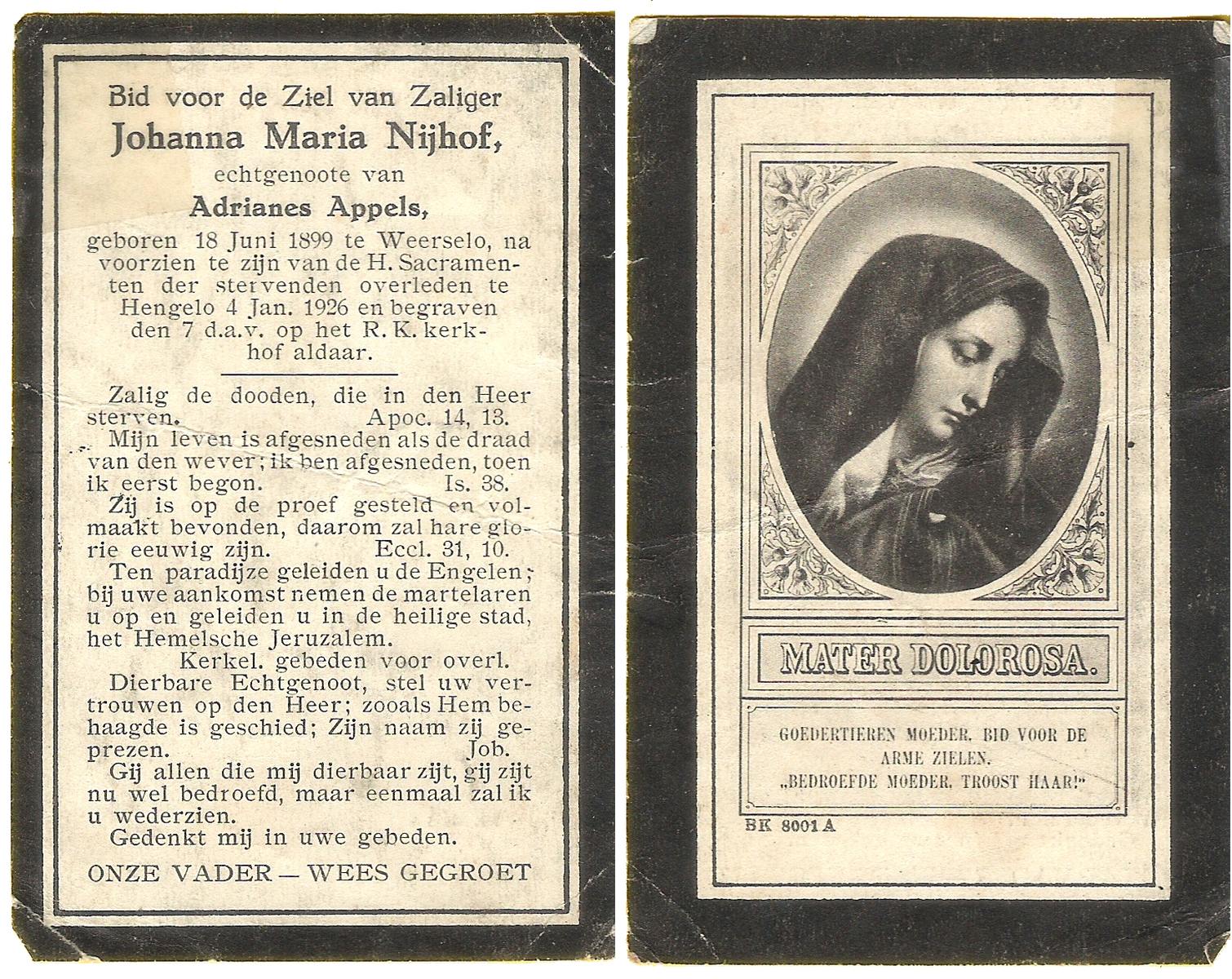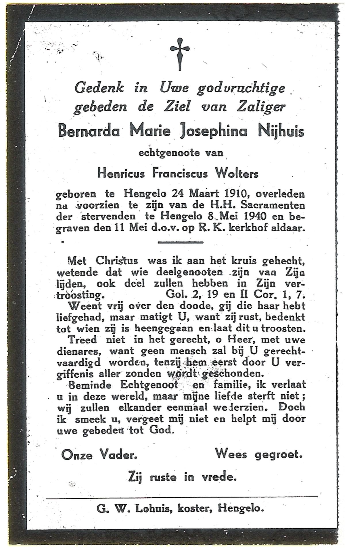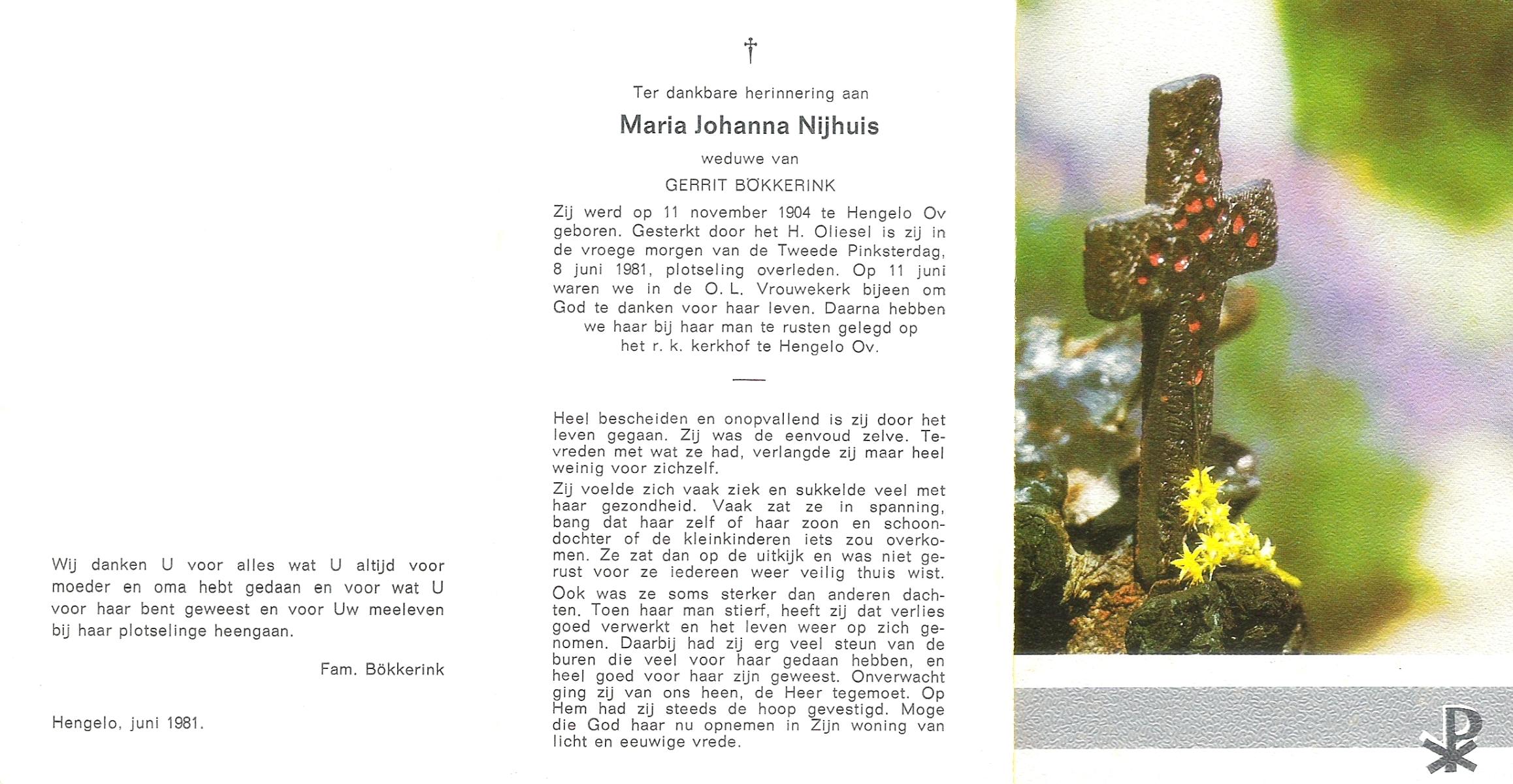 NIJHUIS, Maria Johanna, geboren op 11-11-1904 te Hengelo (O), overleden op 8-6-1981 op 76-jarige leeftijd, begraven op 11-6-1981 te Hengelo (Ov.).
