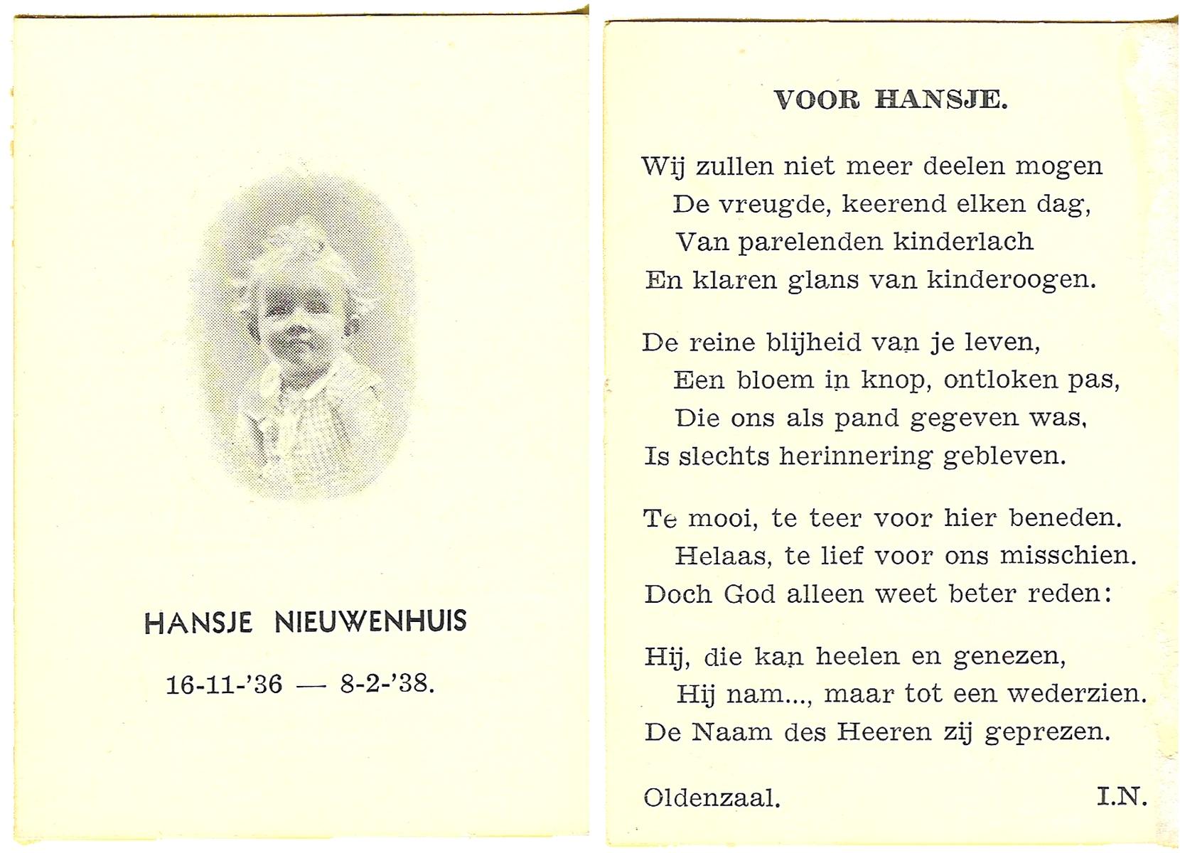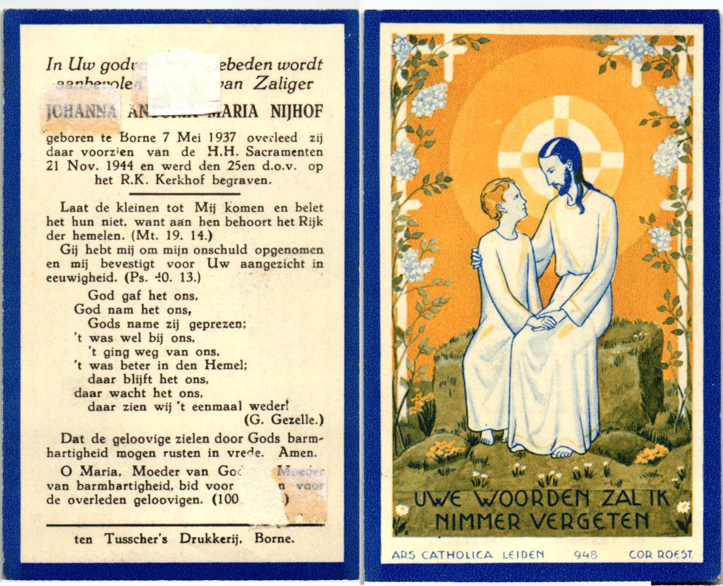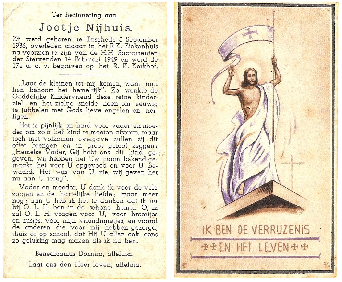 NIJHUIS, Jootje, geboren op 5-9-1936 te Enschede, overleden op 14-2-1949 te Enschede op 12-jarige leeftijd, begraven op 17-2-1949 te Enschede.