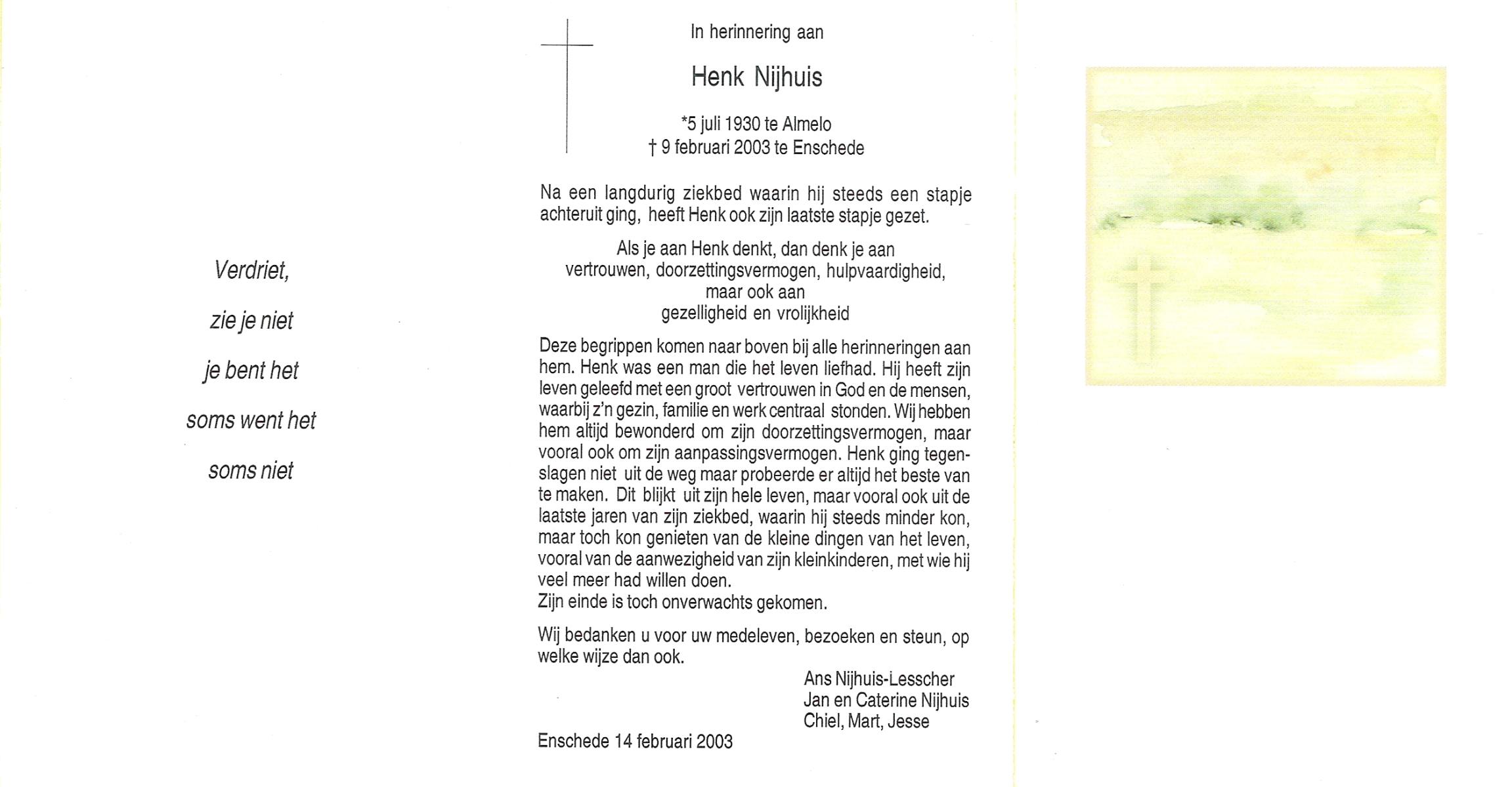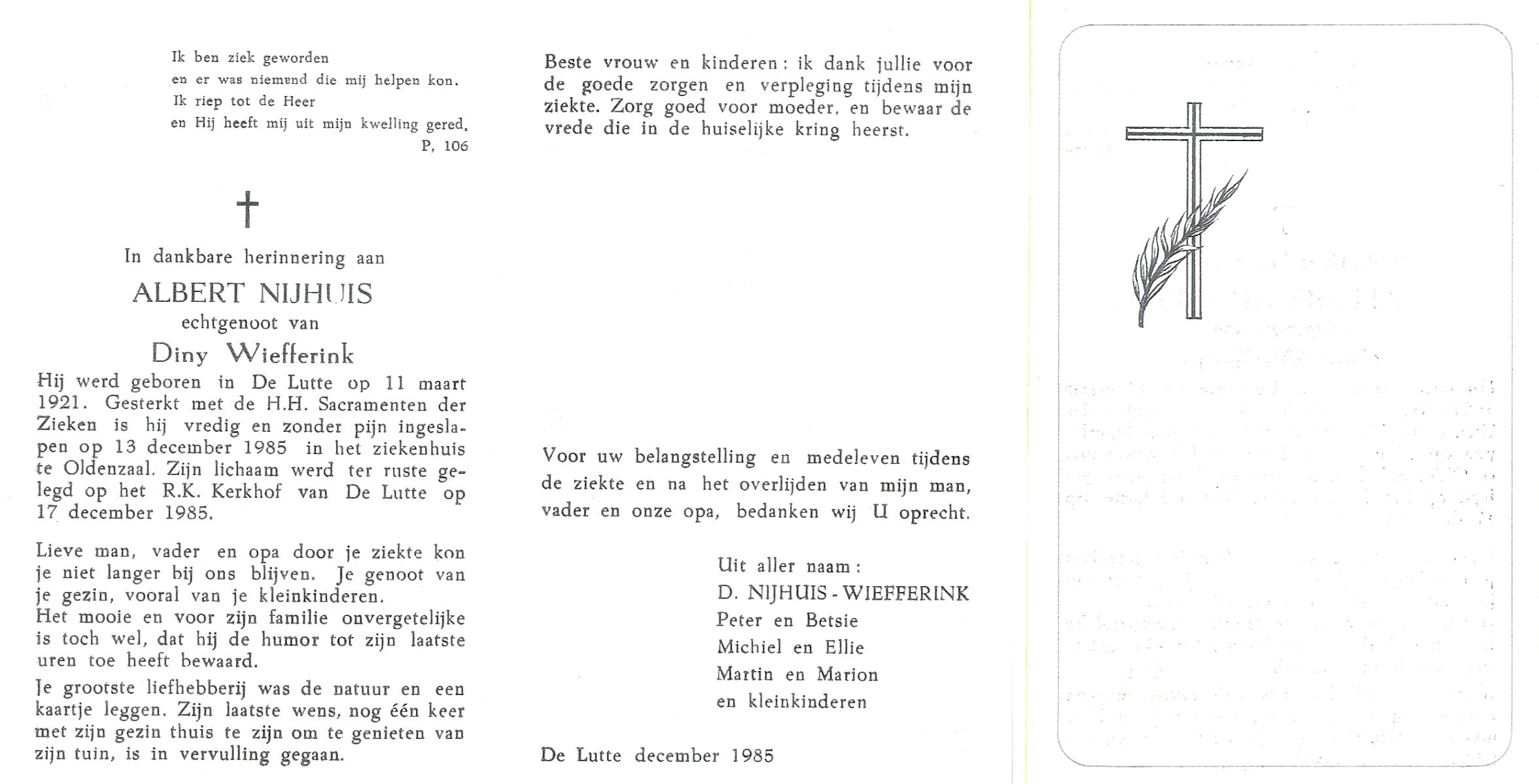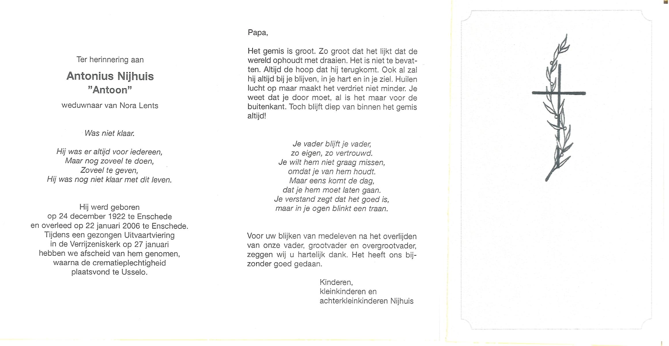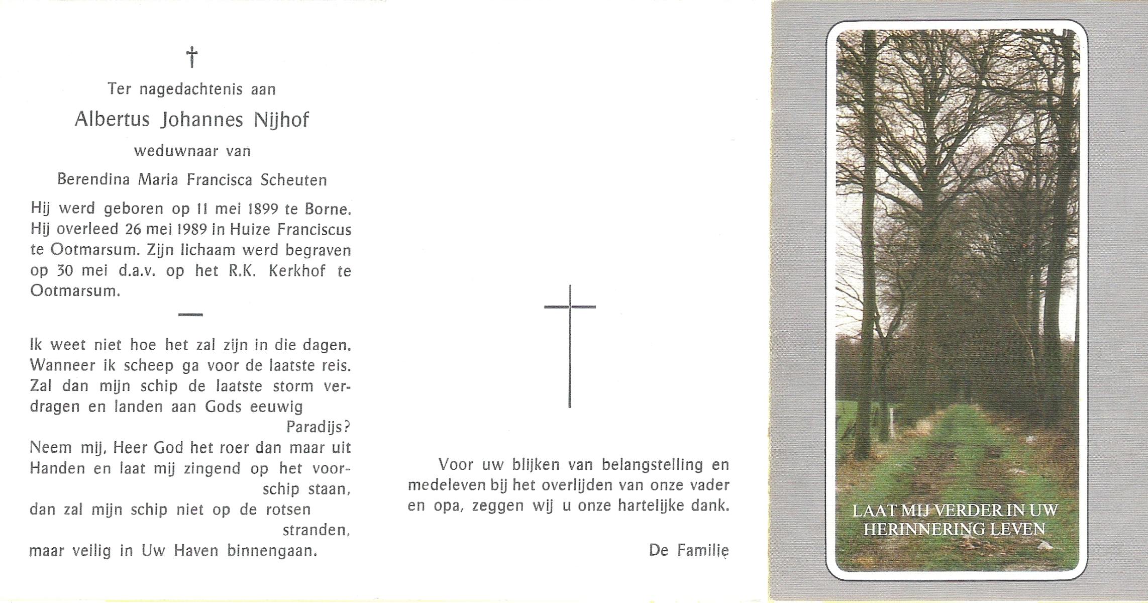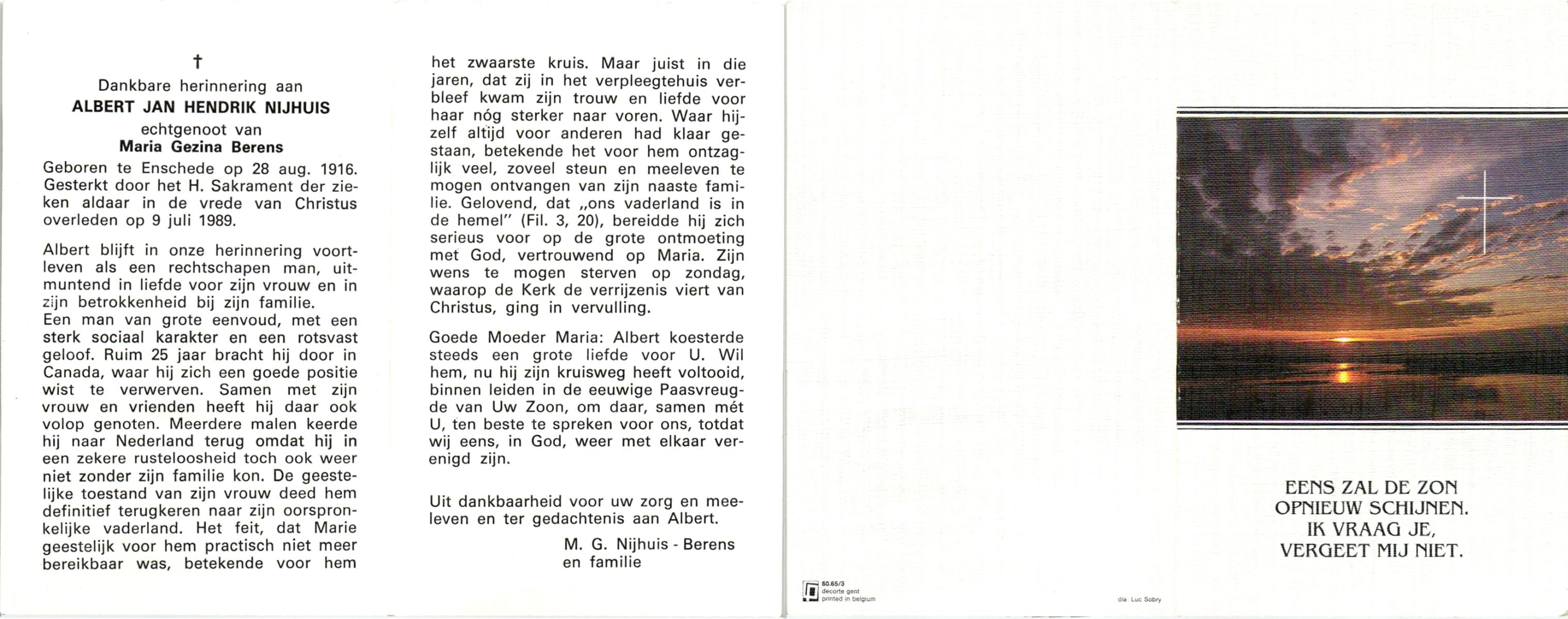 NIJHUIS, , Albert Jan Hendrik, geboren op 28-8-1916 te Enschede, overleden op 9-7-1989 te Enschede op 73-jarige leeftijd.