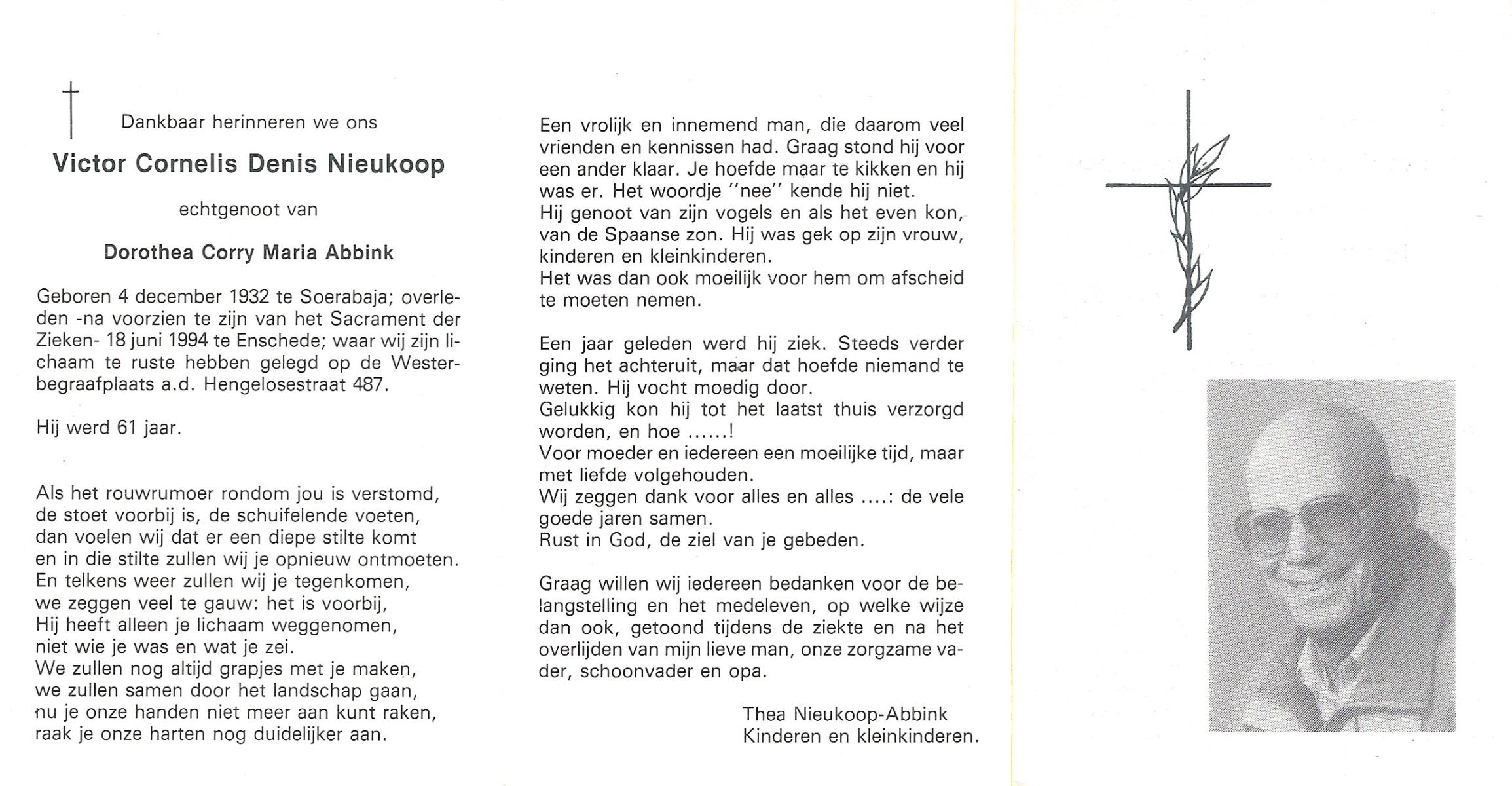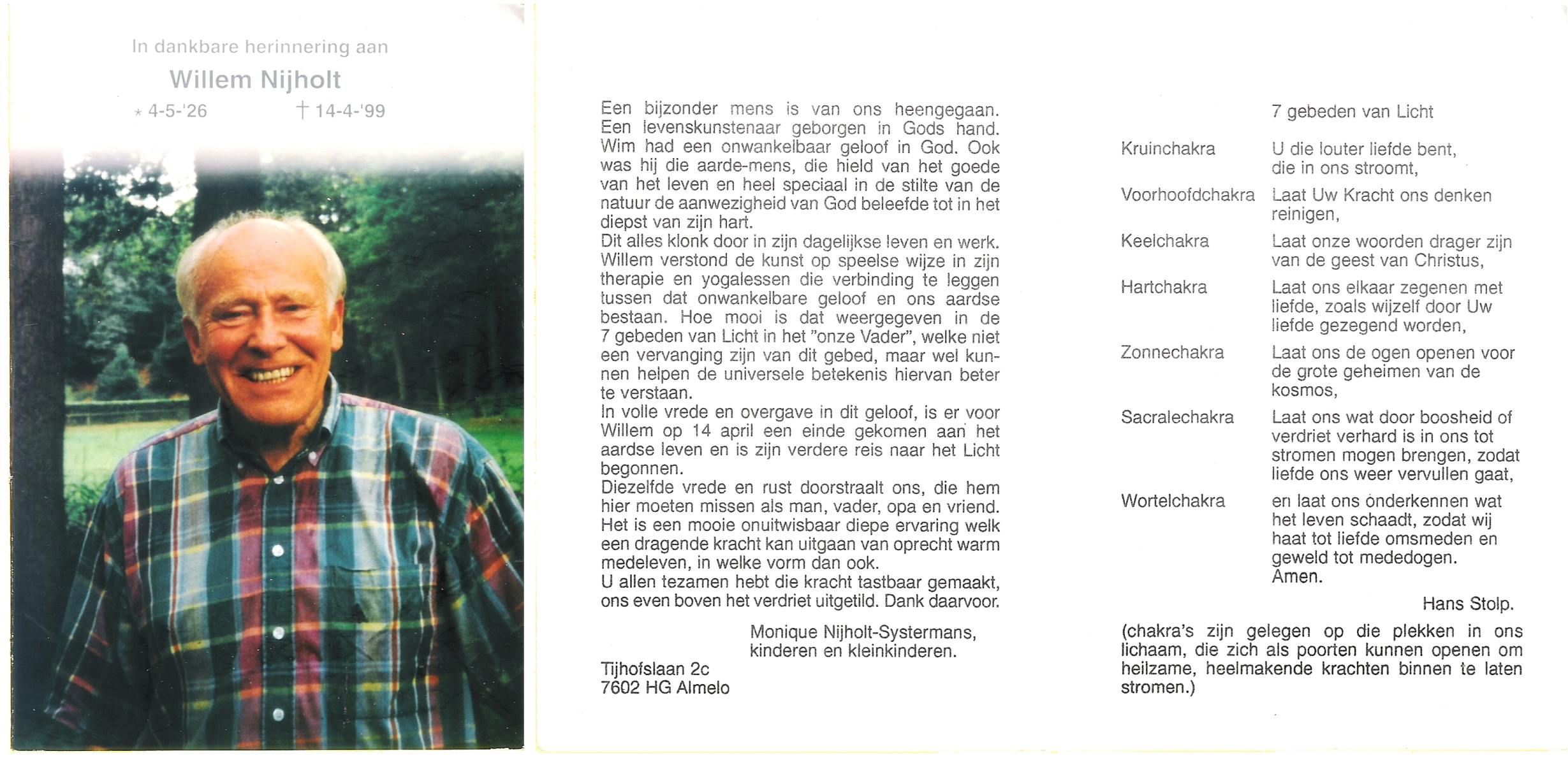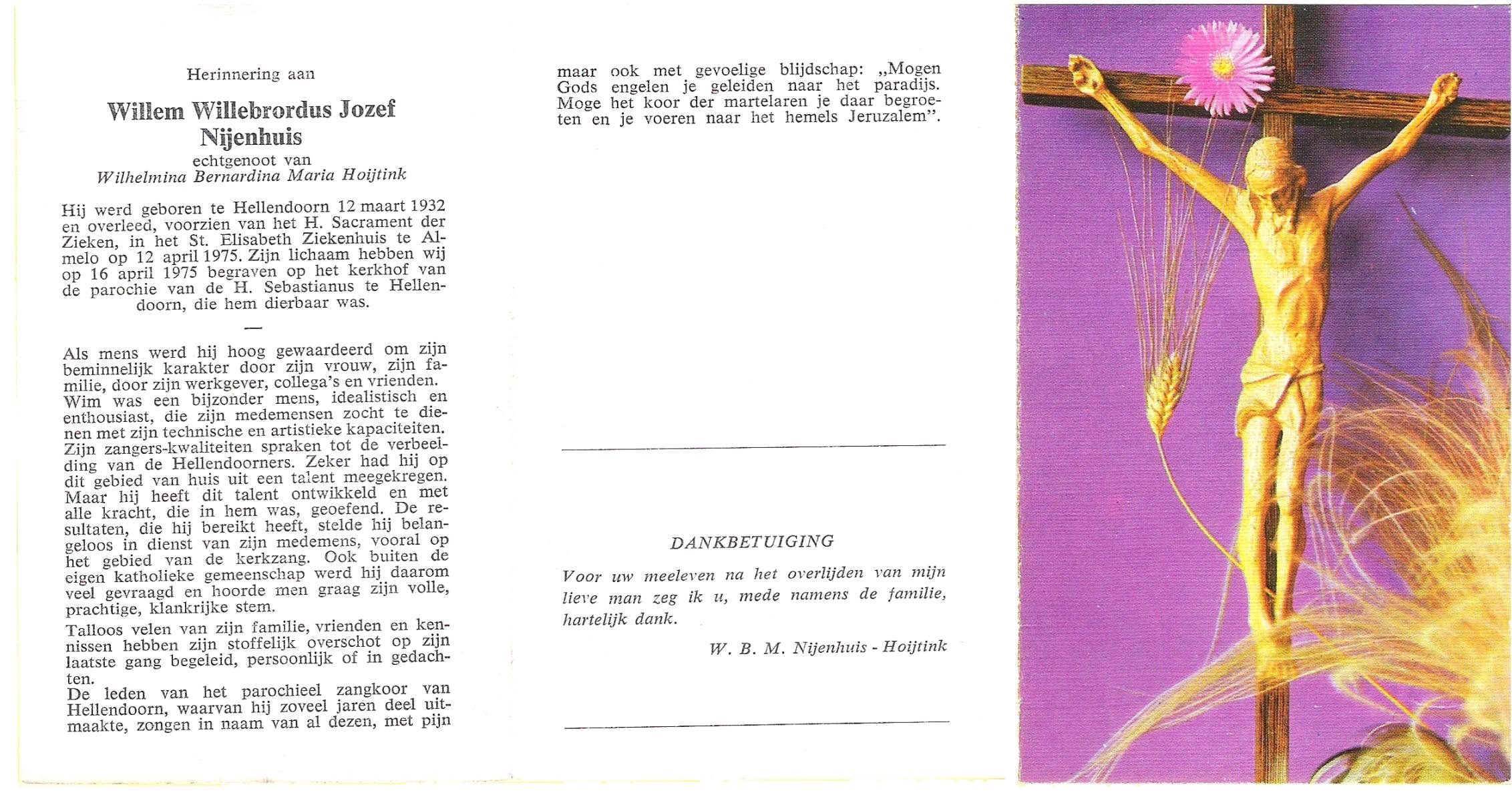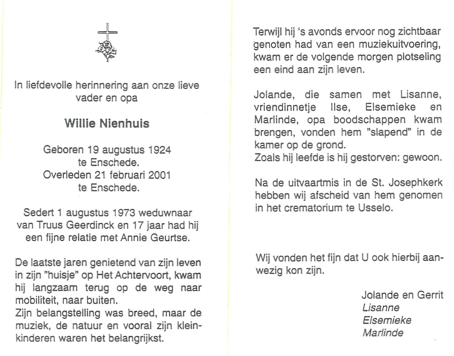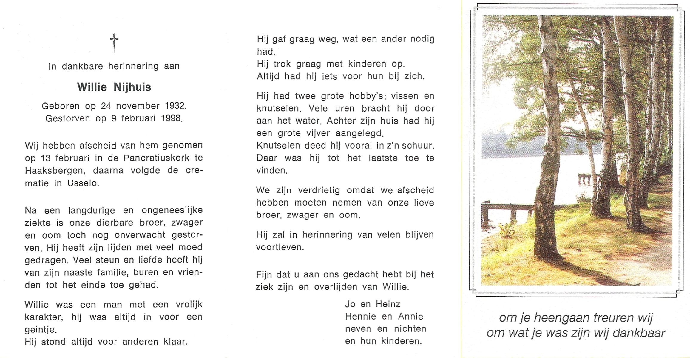 NIJHUIS, Willie, geboren op 24-11-1932, overleden op 9-2-1998 op 65-jarige leeftijd, gecremeerd op 13-2-1998 te Usselo.