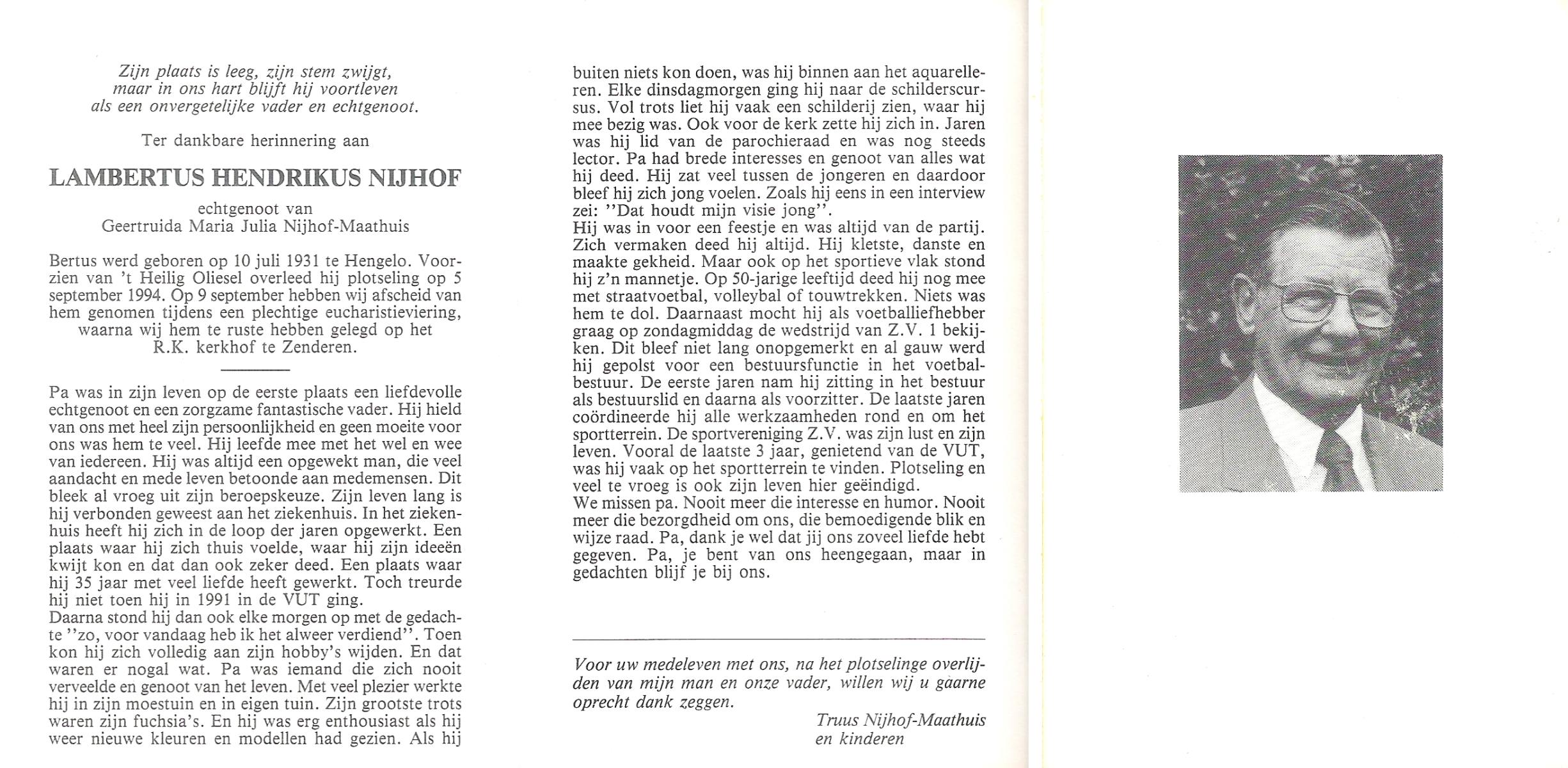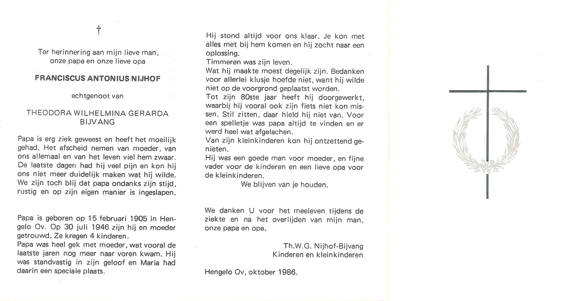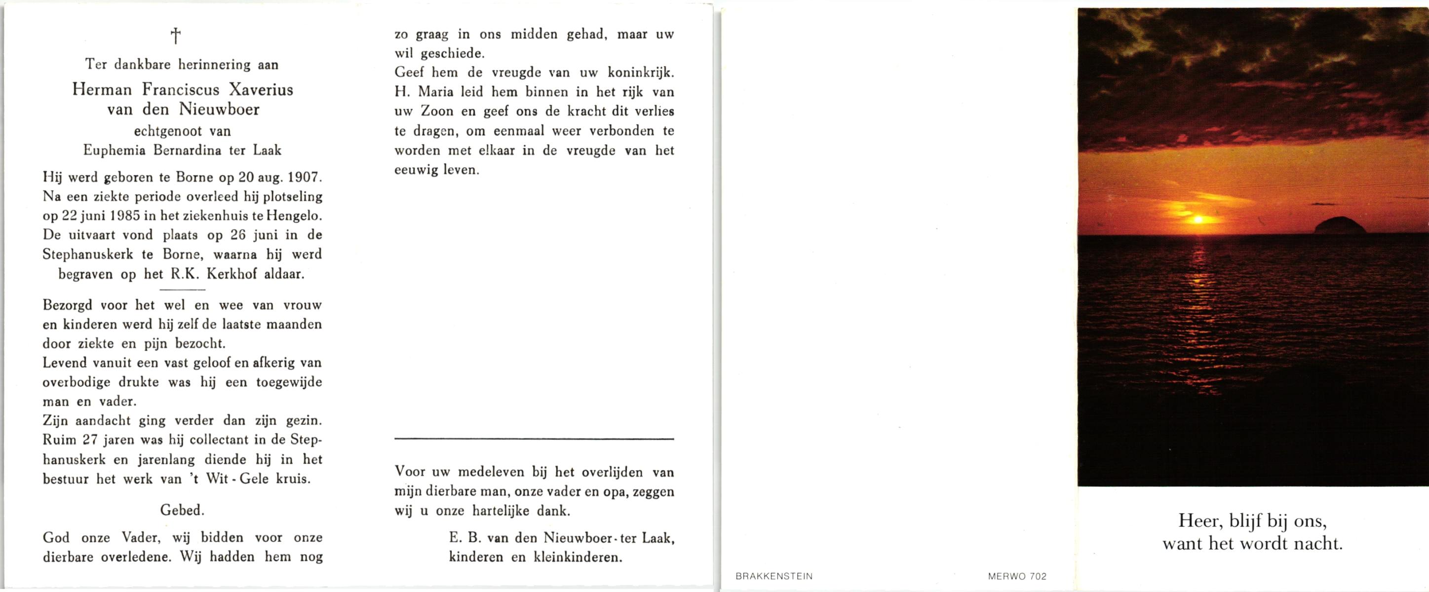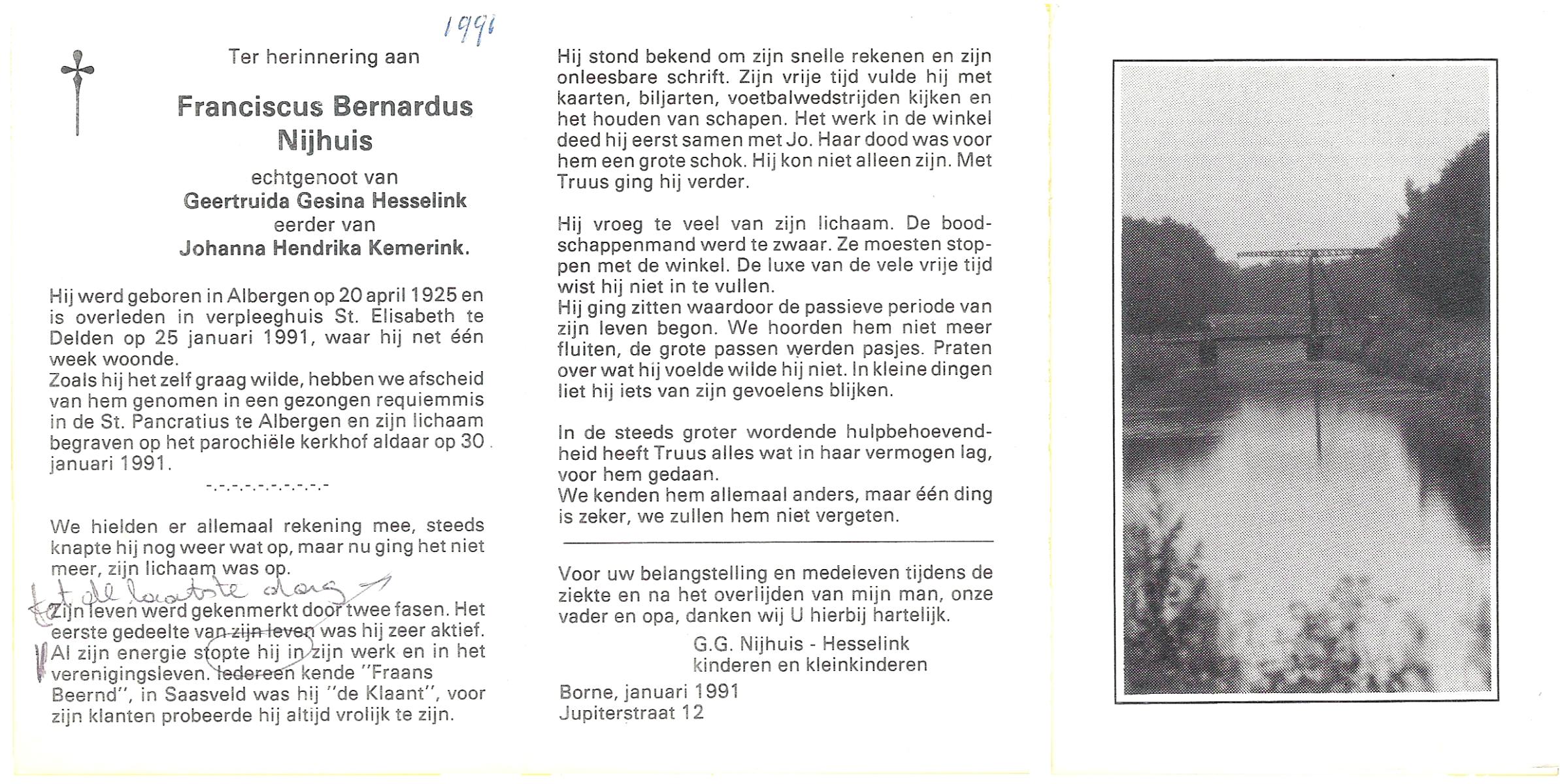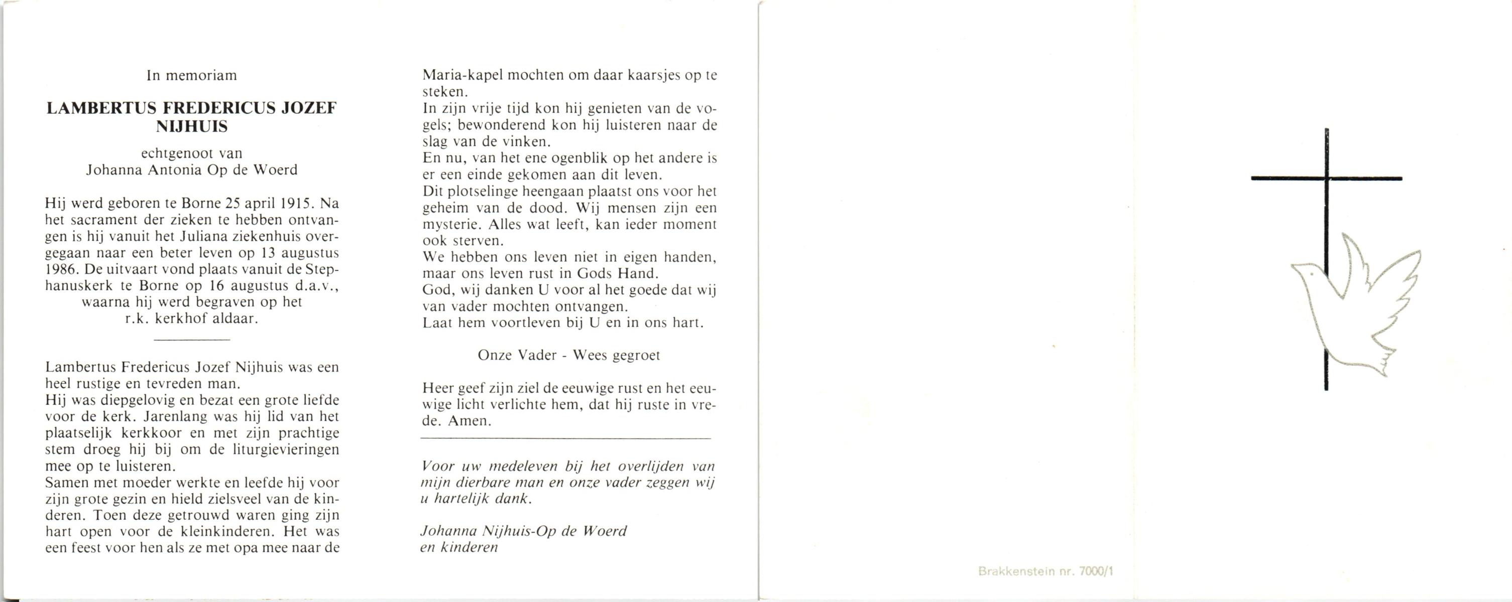 NIJHUIS, Lambertus Fredericus Jozef, geboren op 25-4-1915 te Borne, overleden op 13-8-1986 te Hengelo op 71-jarige leeftijd, begraven op 16-8-1986 te Borne.
