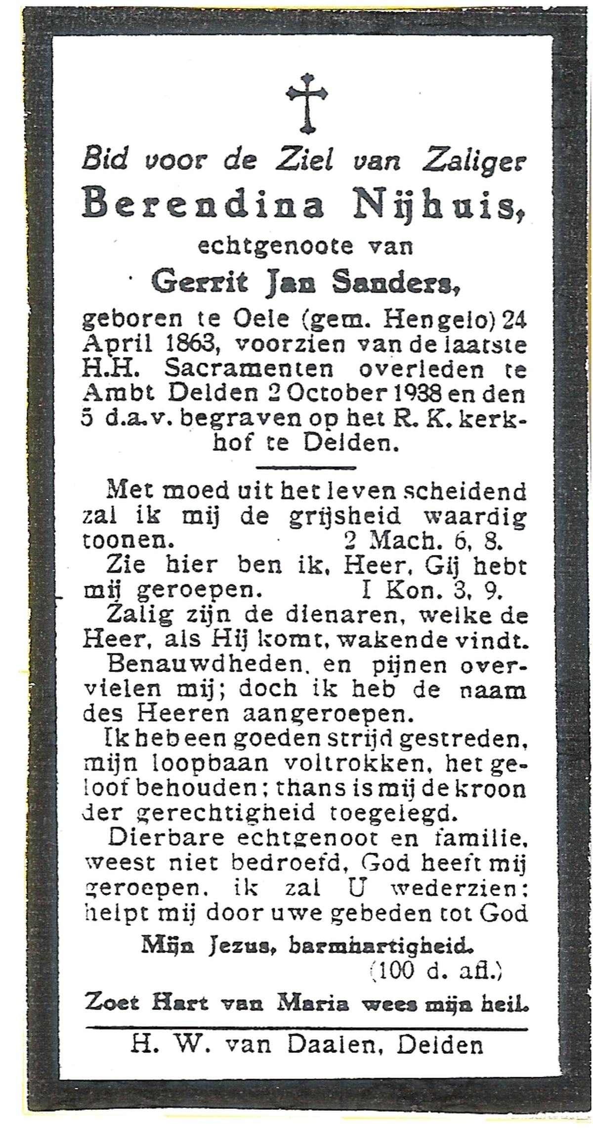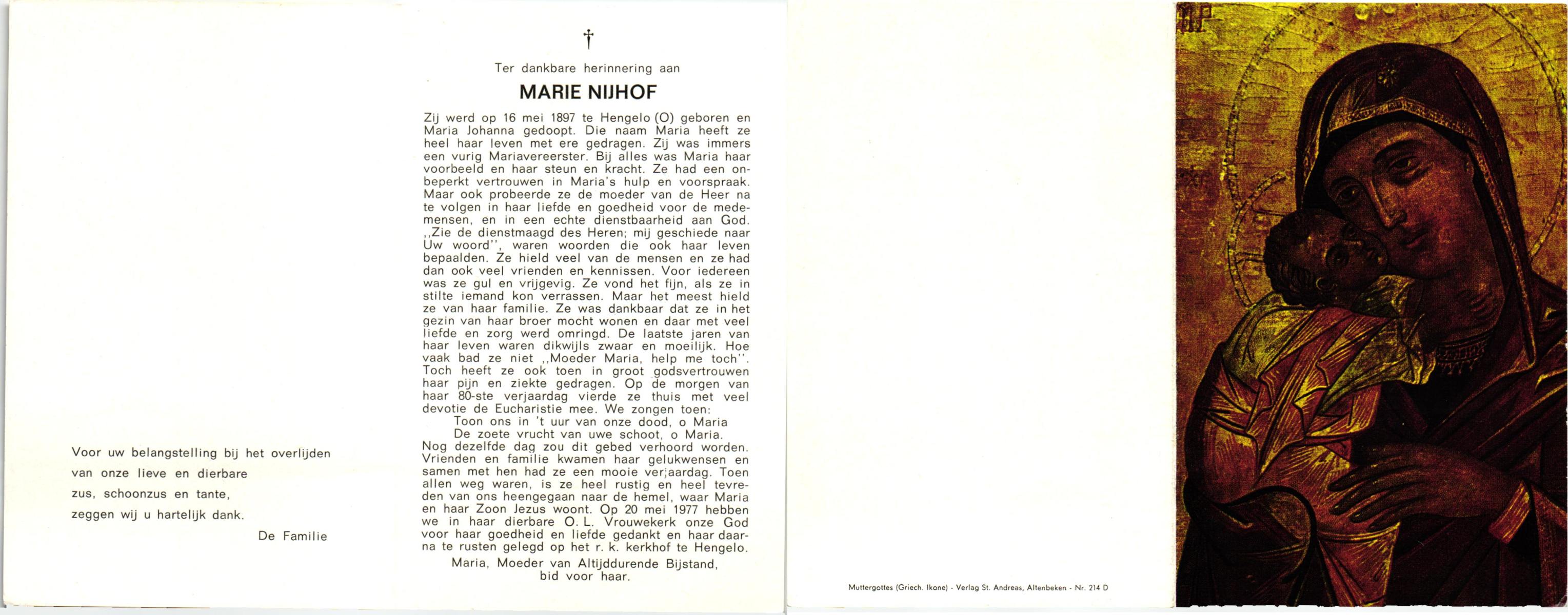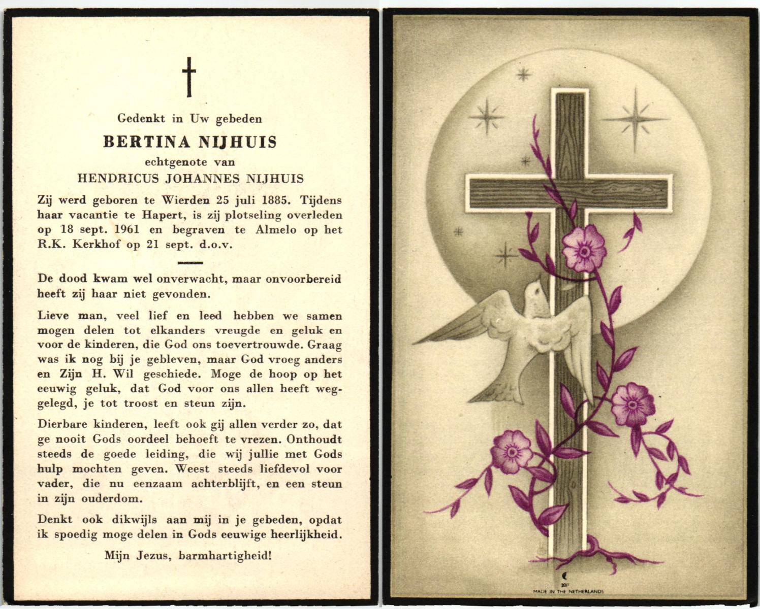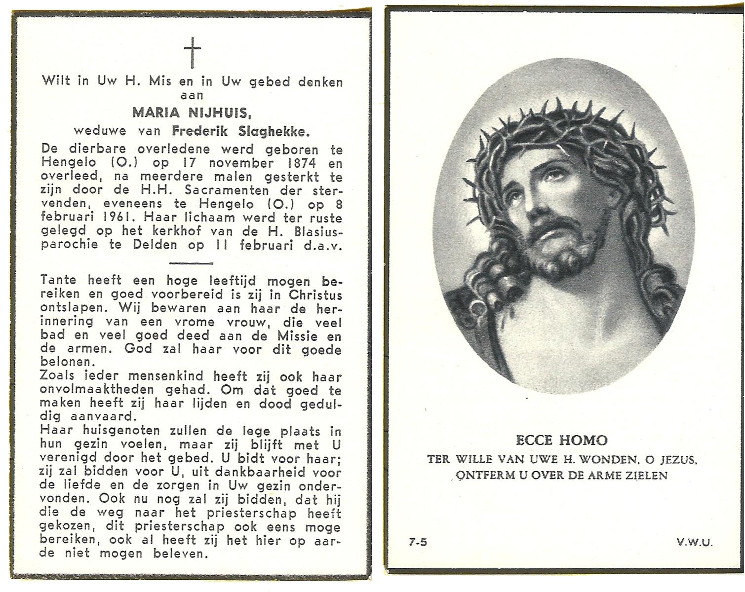 NIJHUIS, Maria, geboren op 17-11-1874 te Hengelo (O), overleden op 8-2-1961 te Hengelo (Ov.) op 86-jarige leeftijd, begraven op 11-2-1961 te Delden parochie-kerkhof H.Blasius.