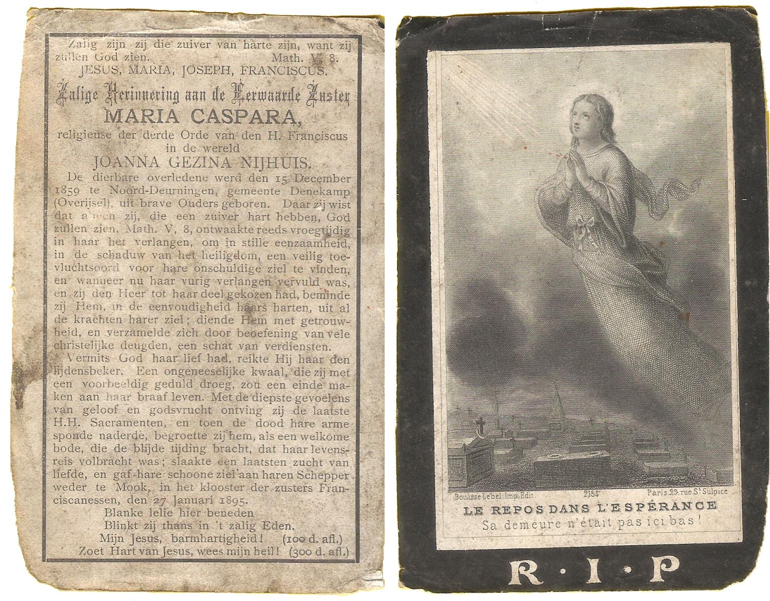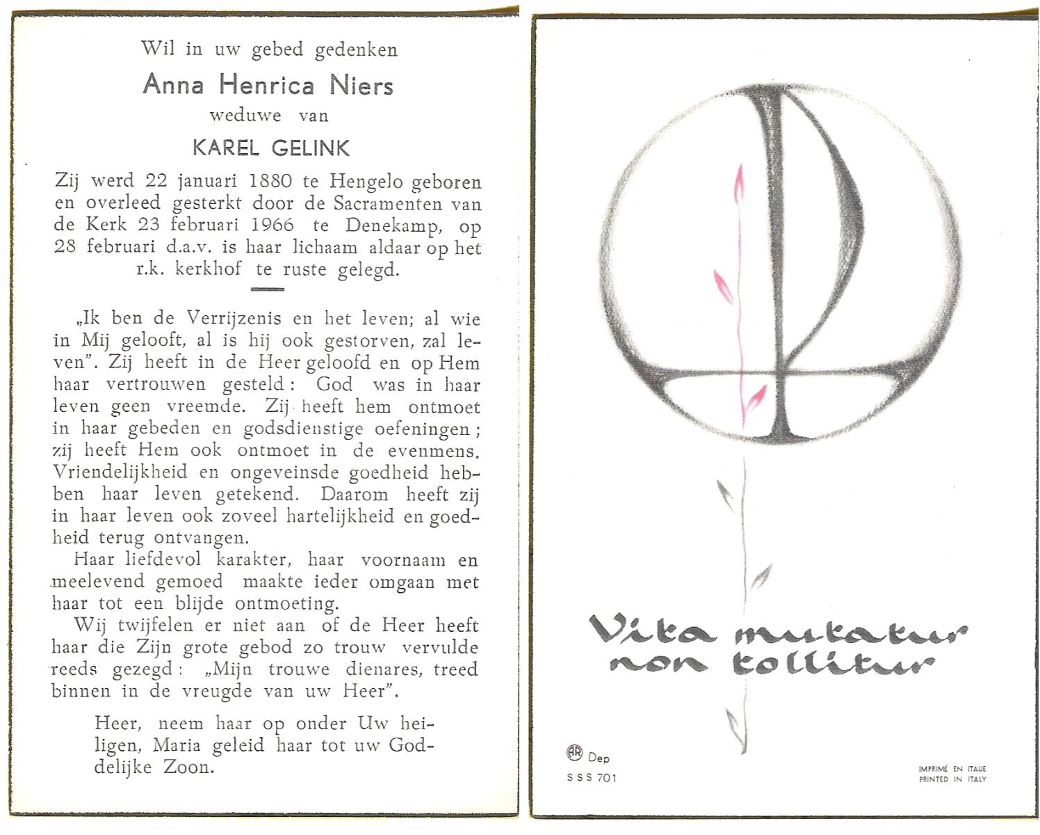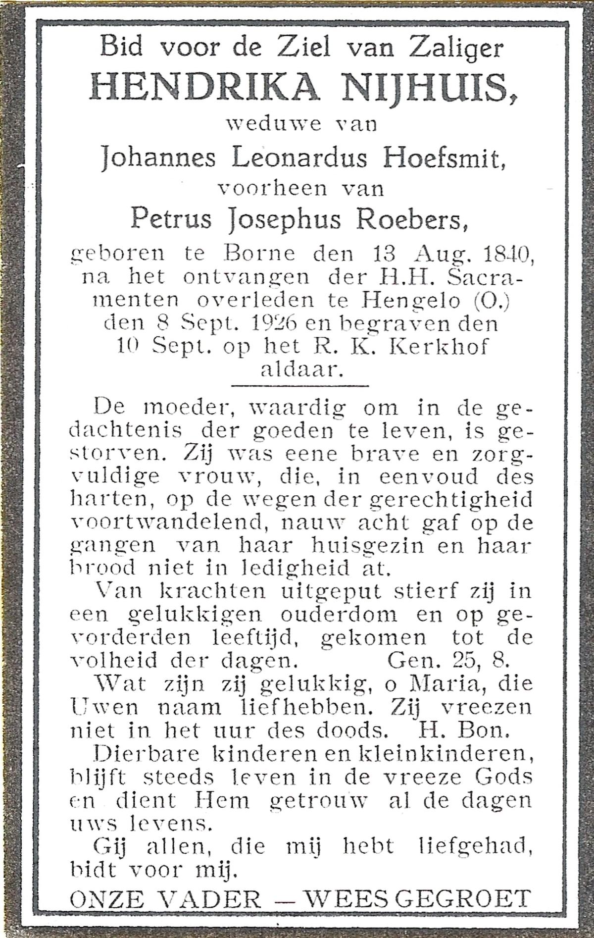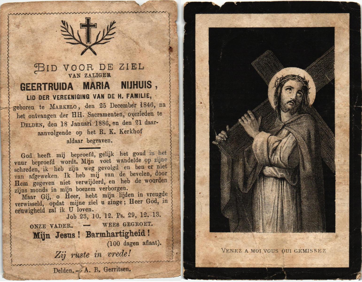 NIJHUIS, Maria, geboren op 17-11-1874 te Hengelo (O), overleden op 8-2-1961 te Hengelo (Ov.) op 86-jarige leeftijd, begraven op 11-2-1961 te Delden parochie-kerkhof H.Blasius.
