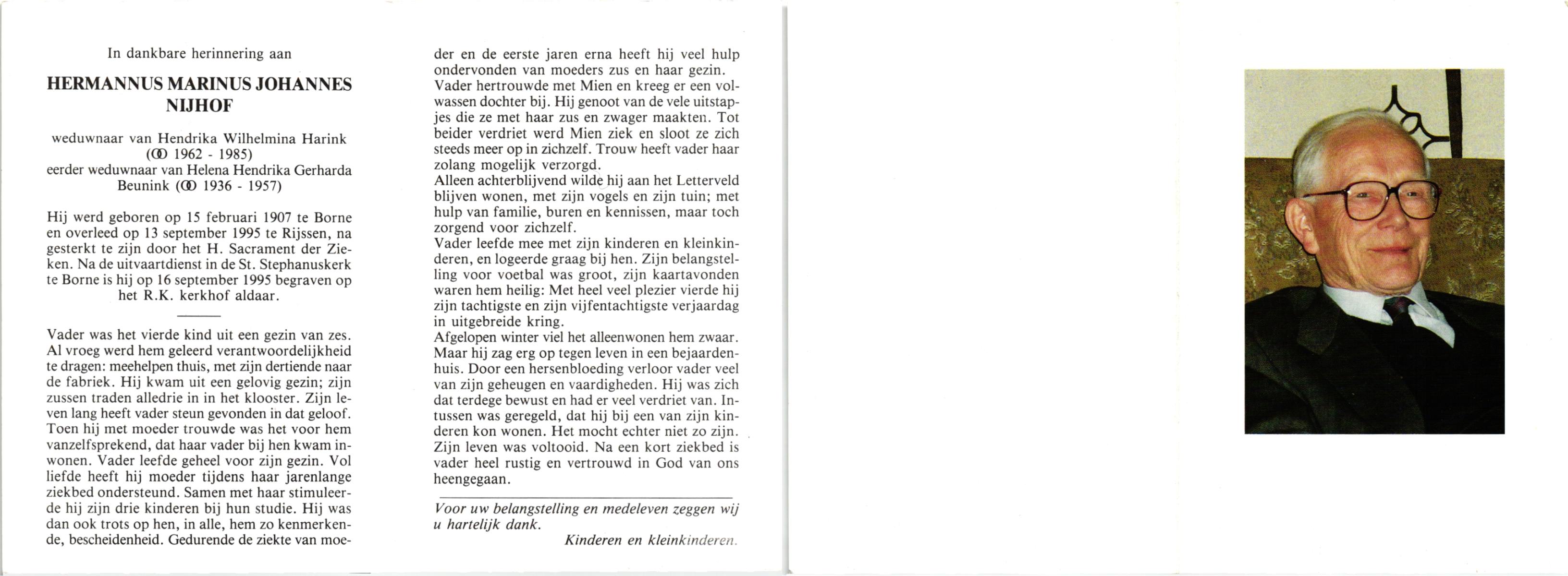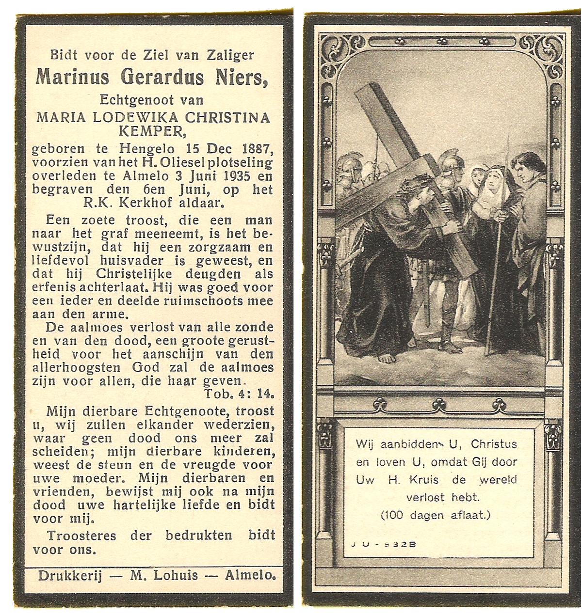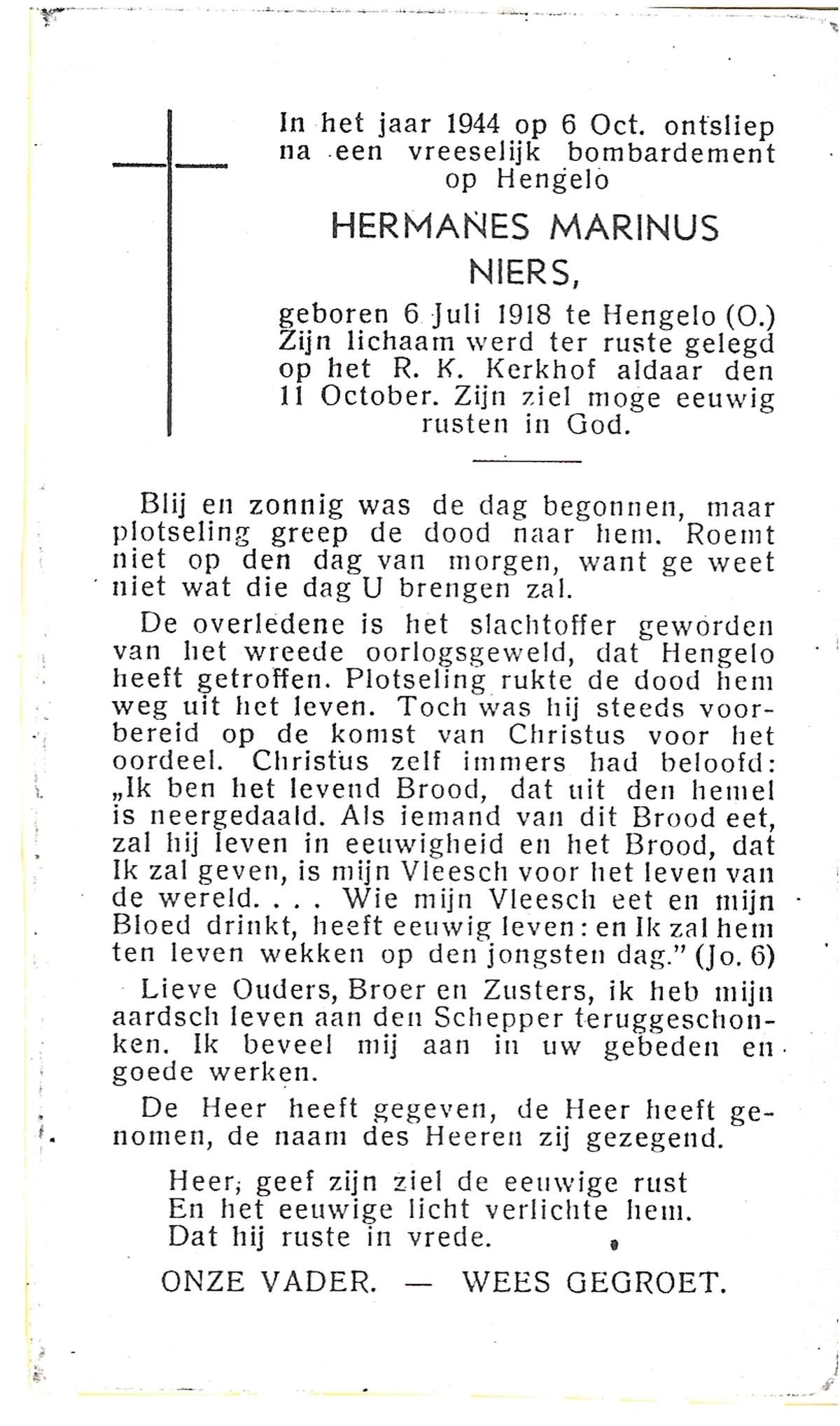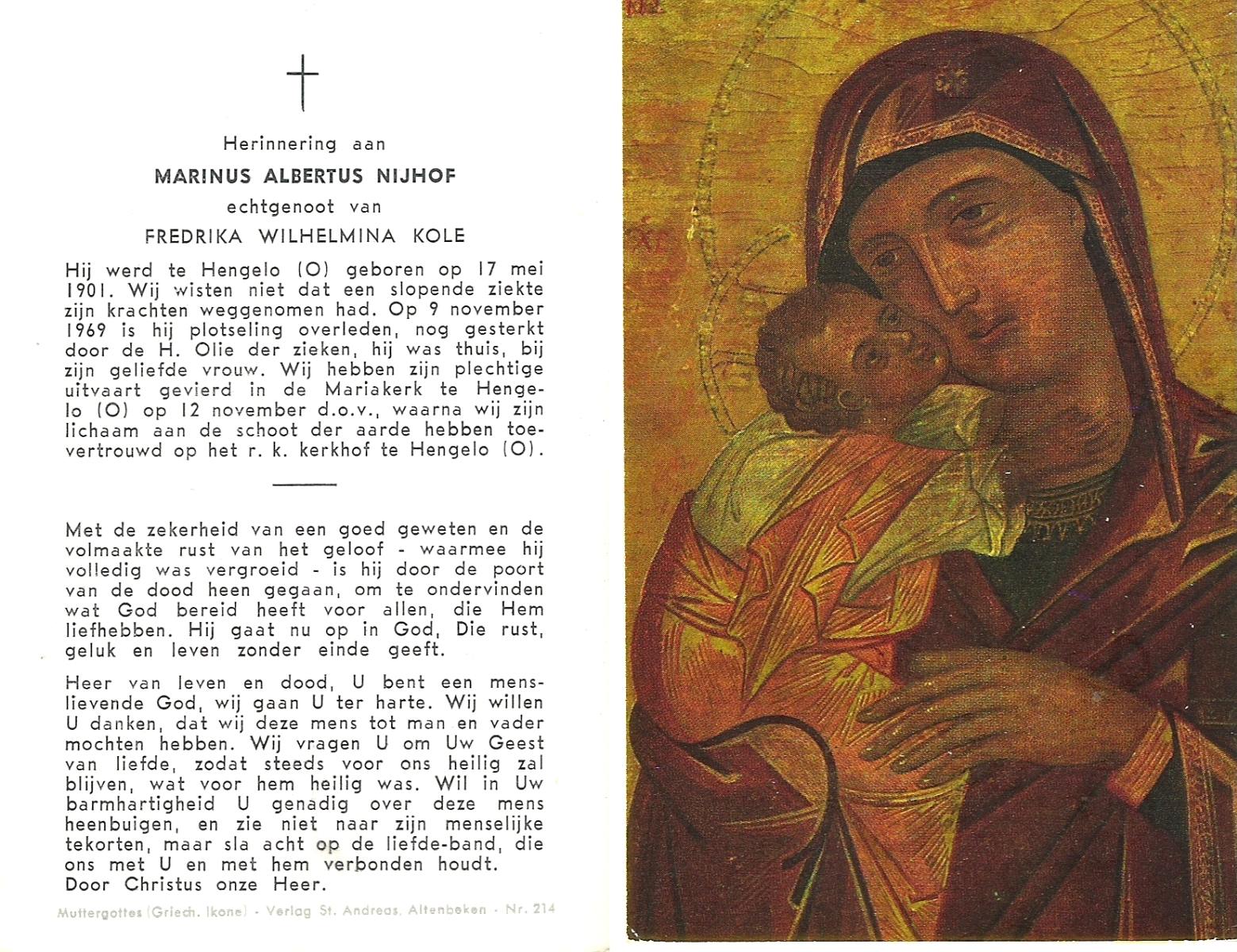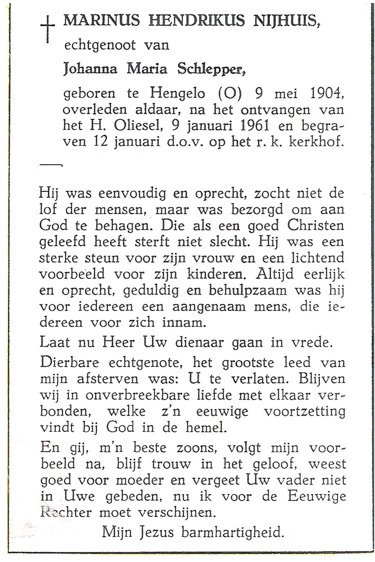NIJHUIS, Marinus Hendrikus, geboren op 9-5-1904 te Hengelo (O), overleden op 9-1-1961 te Hengelo (Ov.) op 56-jarige leeftijd, begraven op 12-1-1961 te Hengelo (Ov.).