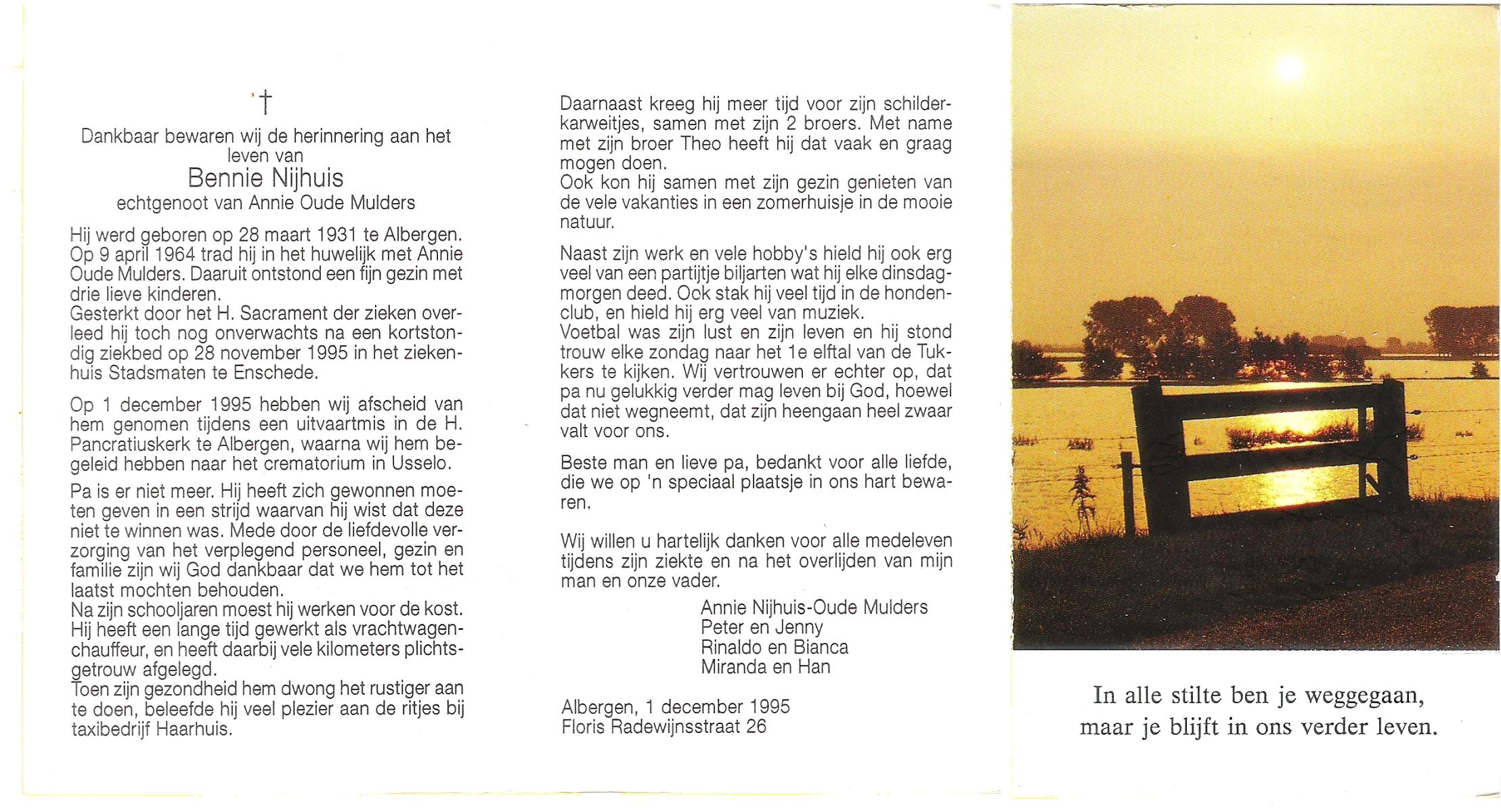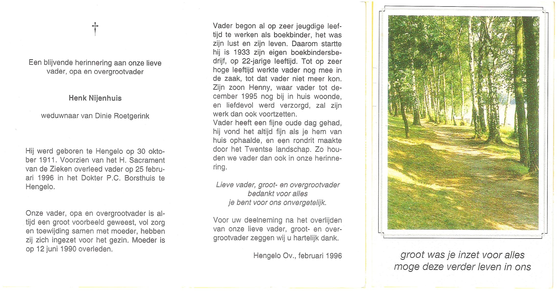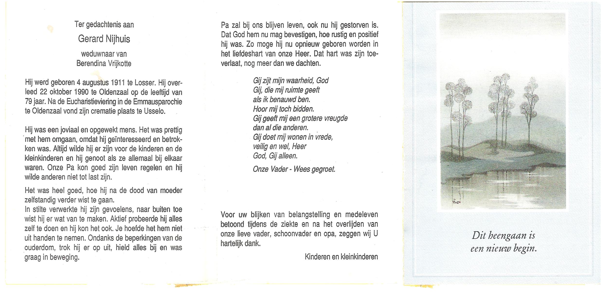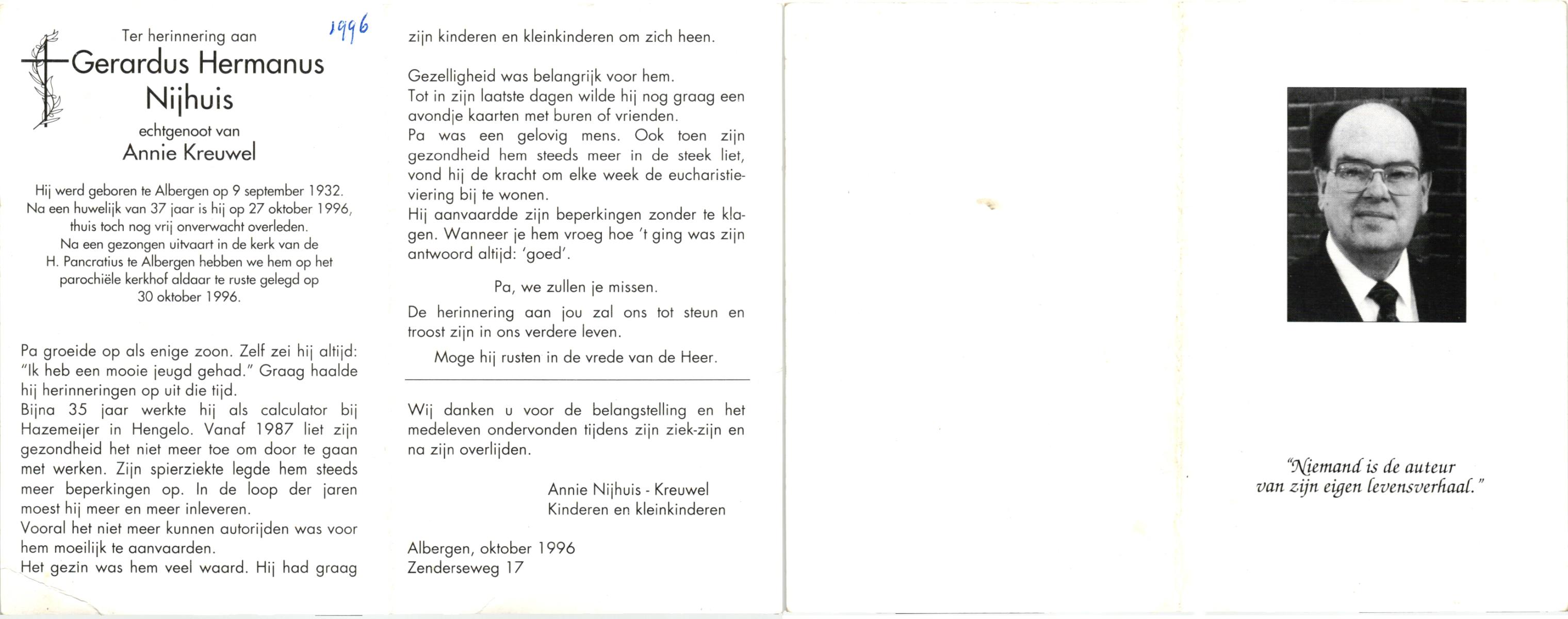 NIJHUIS, , Gerardus Hermanus, geboren op 9-9-1932 te Albergen, overleden op 27-10-1996 te Albergen op 64-jarige leeftijd, begraven op 30-10-1996 te Albergen.