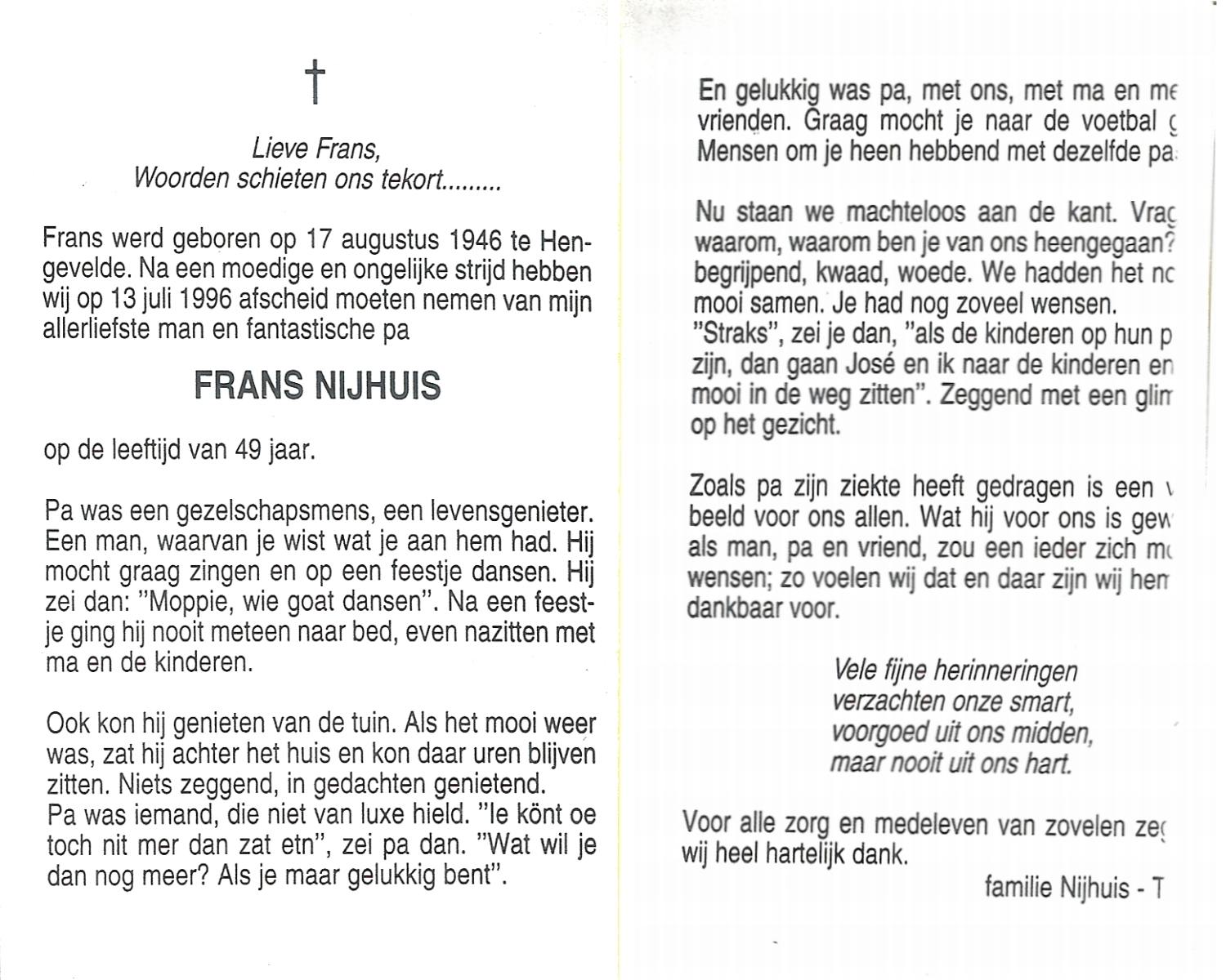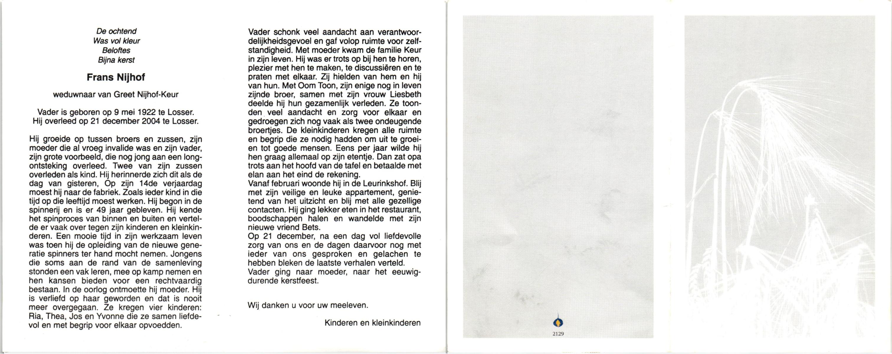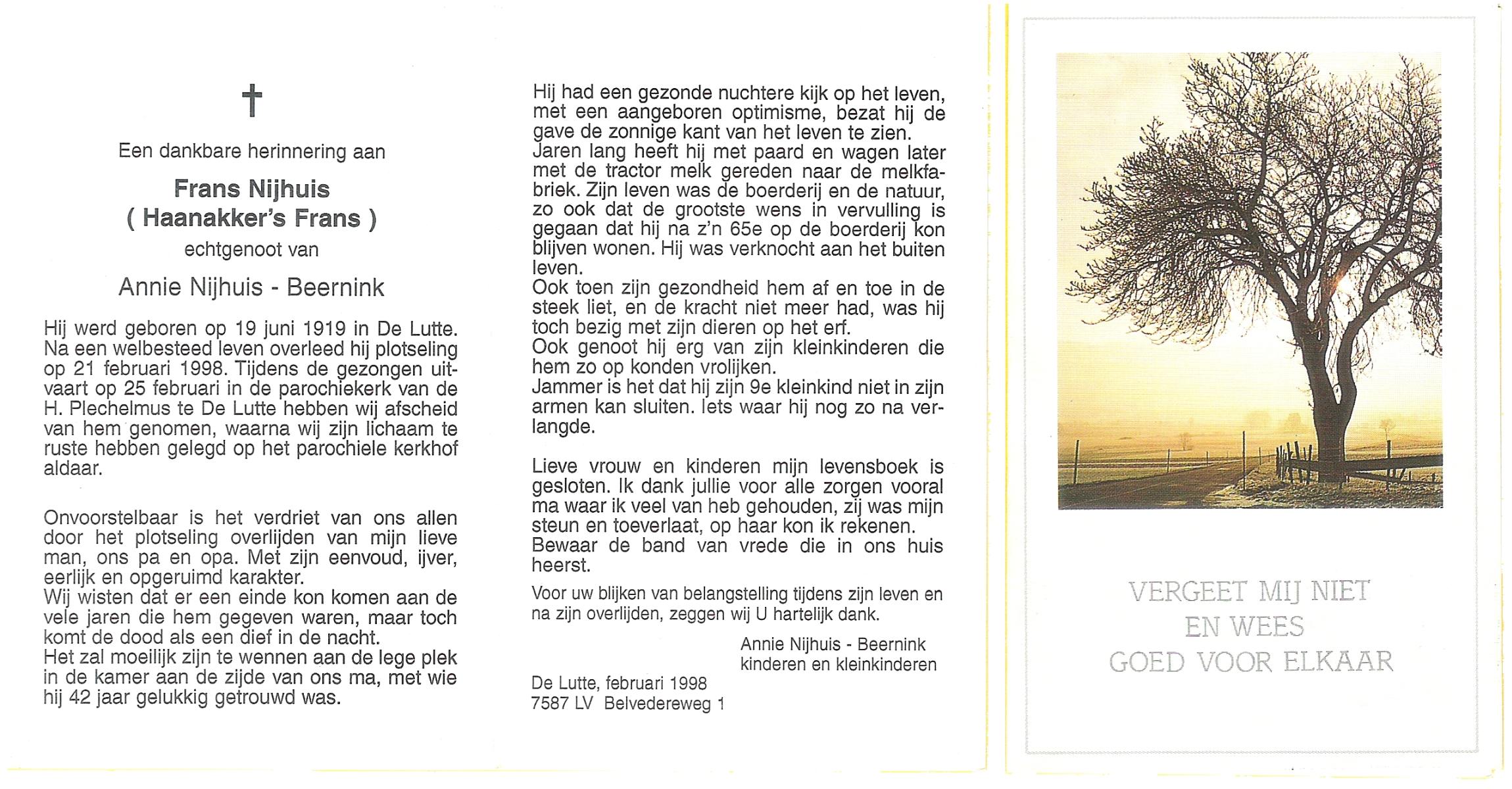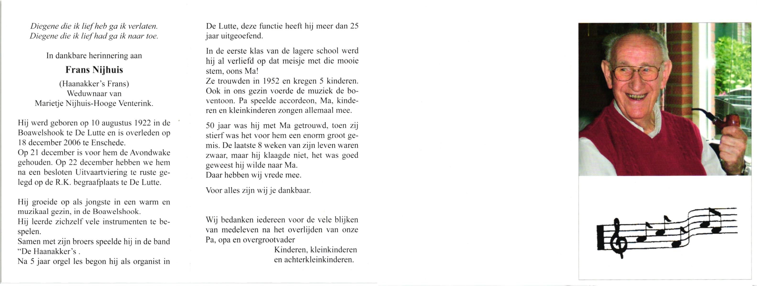 NIJHUIS, , Frans, geboren op 10-8-1922 te De Lutte, overleden op 18-12-2006 te Enschede op 84-jarige leeftijd, begraven op 22-12-2006 te De Lutte.