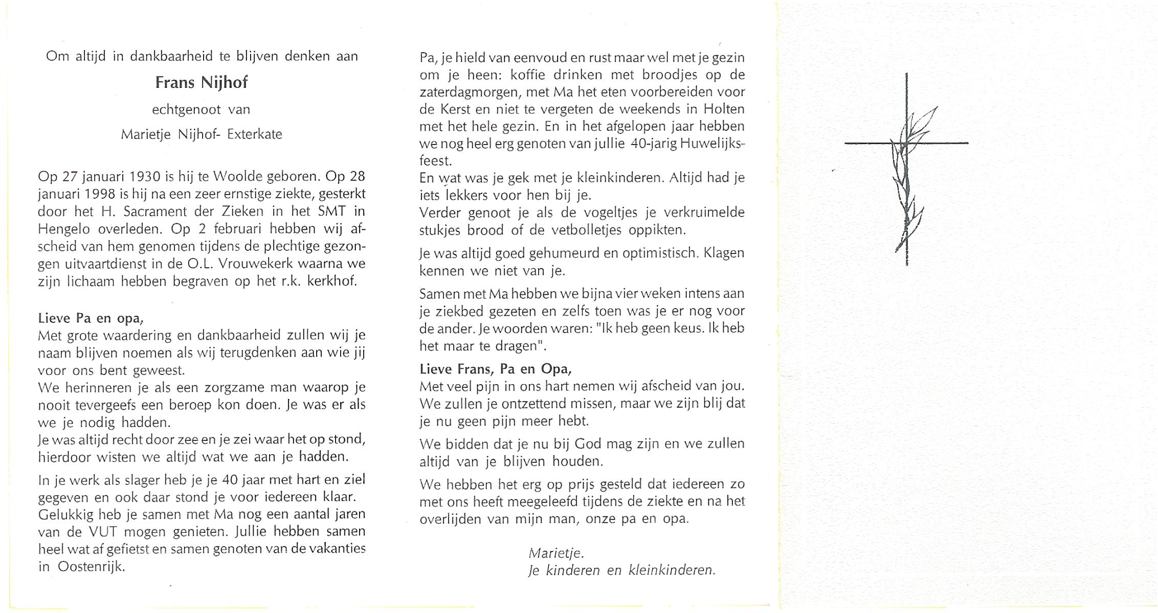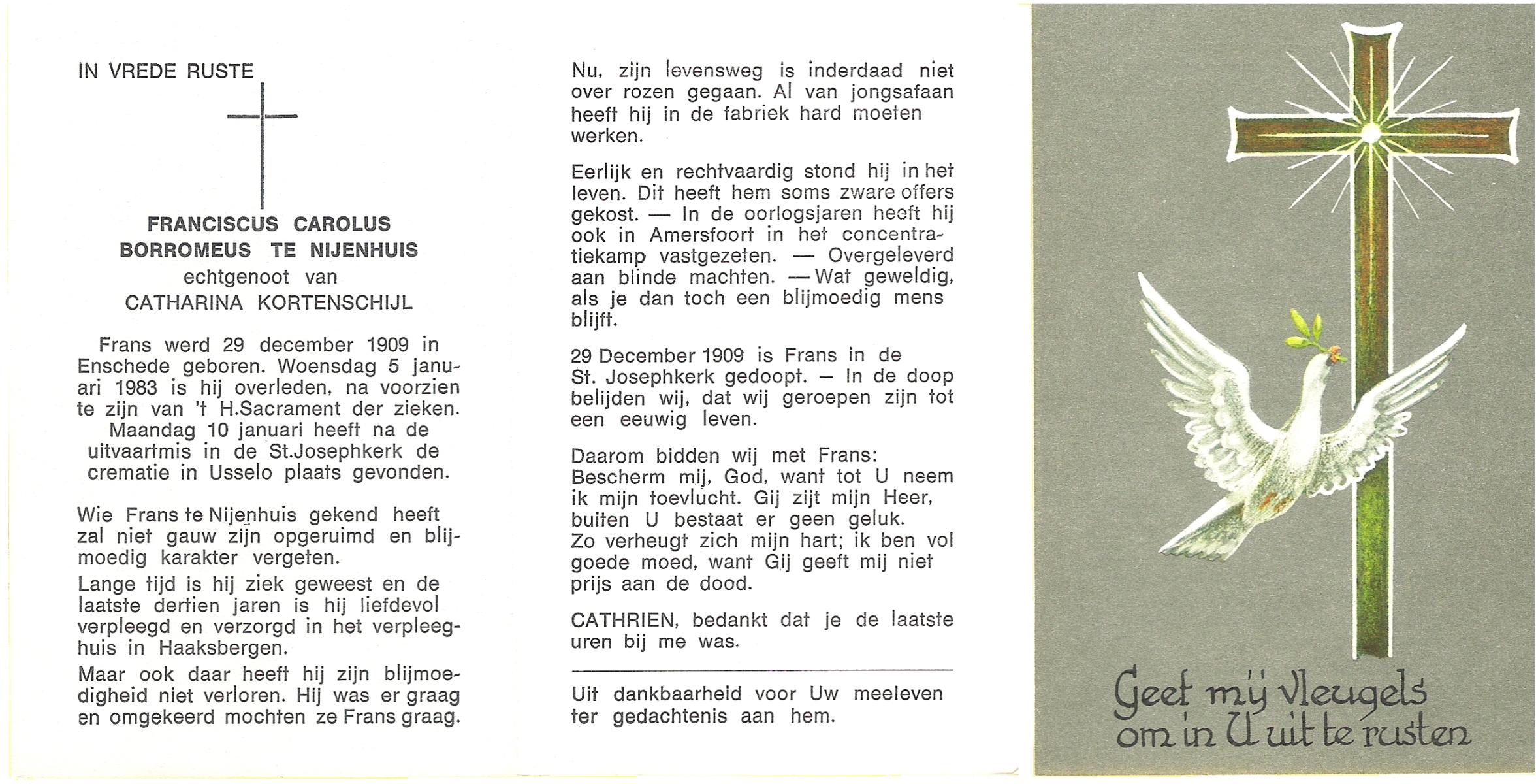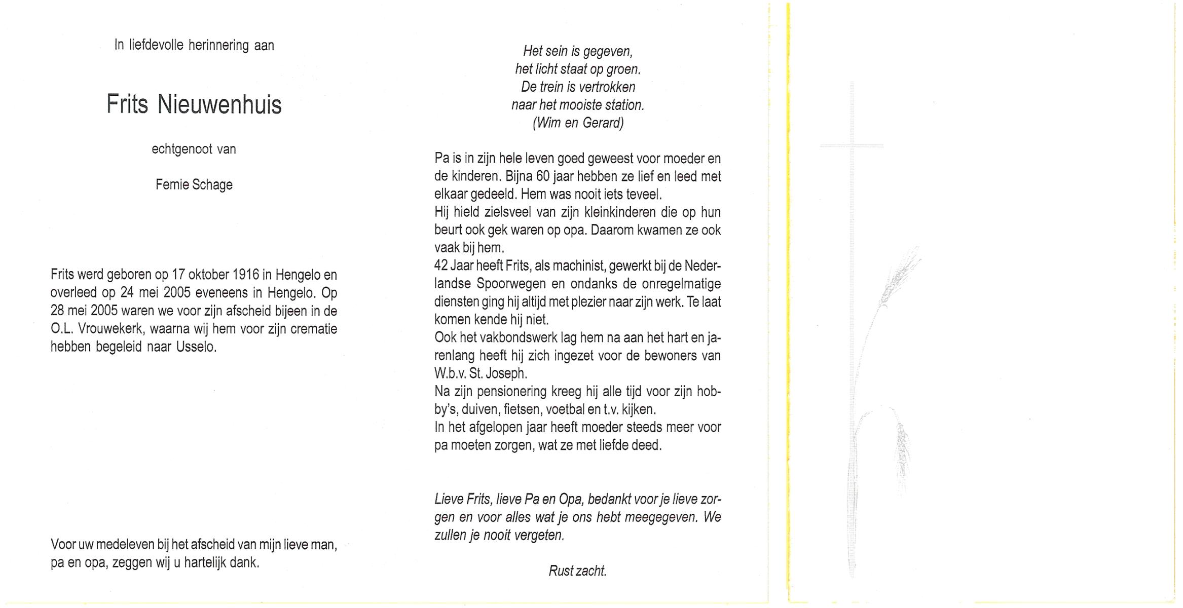NIJHUIS, , Frans, geboren op 10-8-1922 te De Lutte, overleden op 18-12-2006 te Enschede op 84-jarige leeftijd, begraven op 22-12-2006 te De Lutte.
