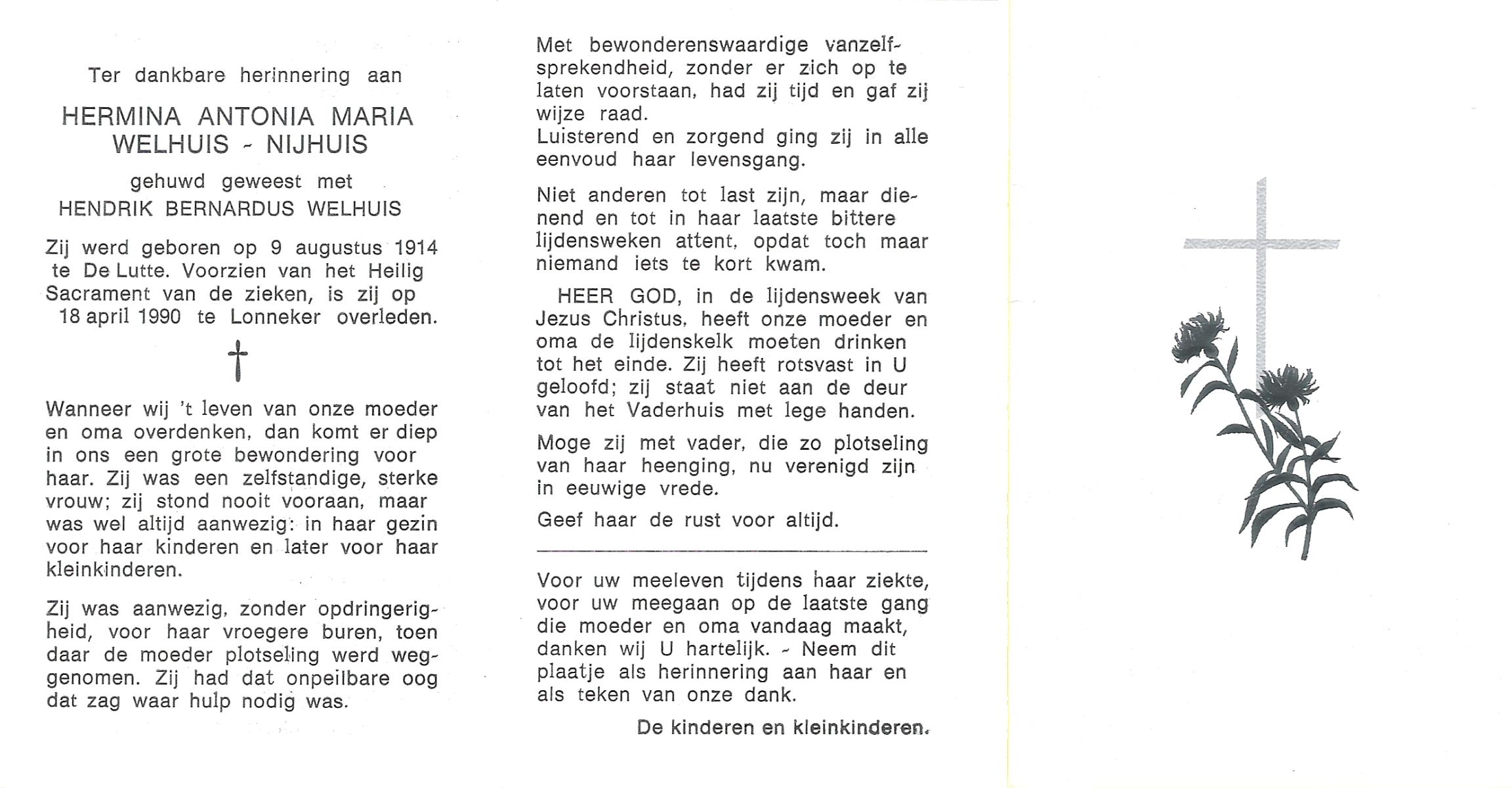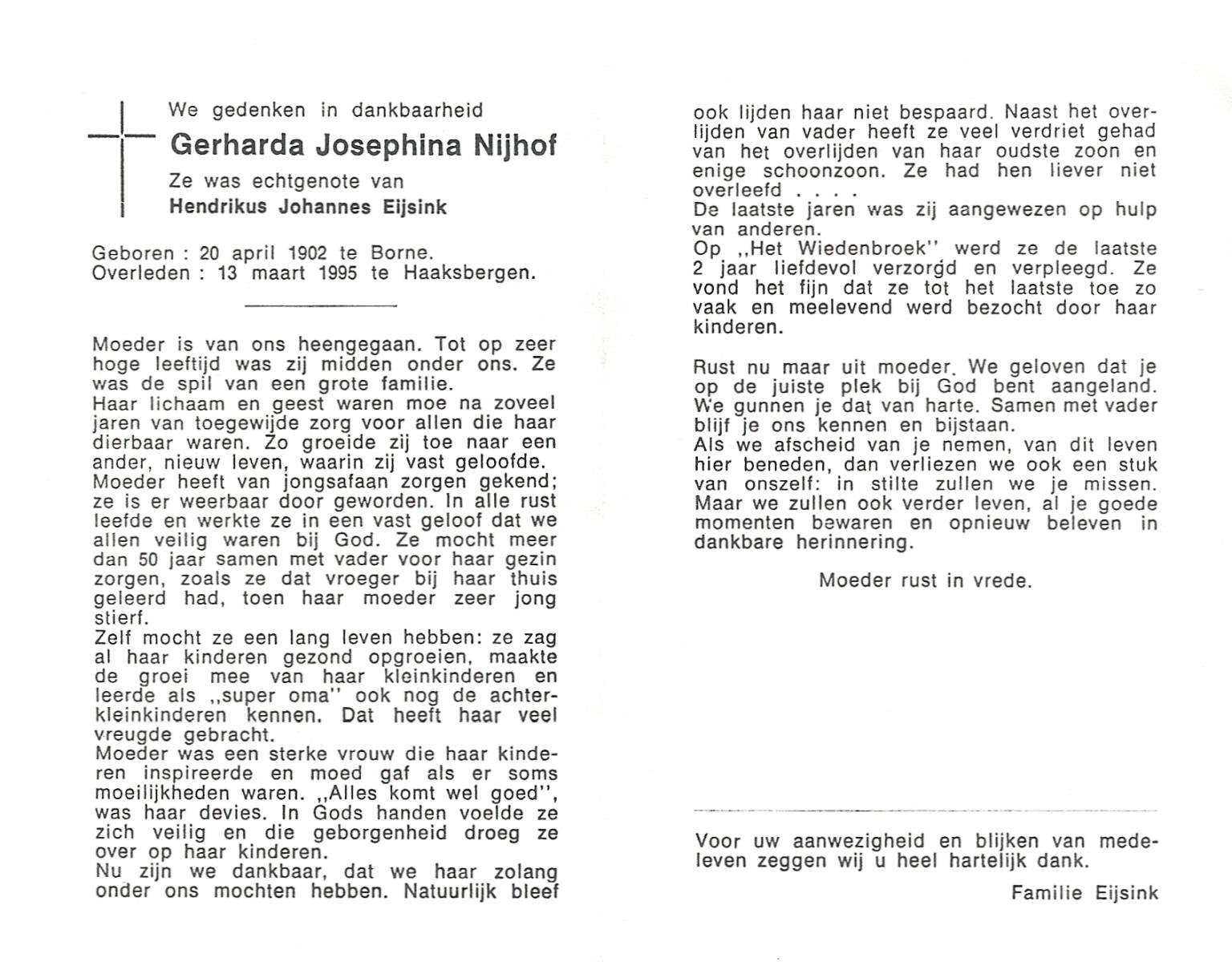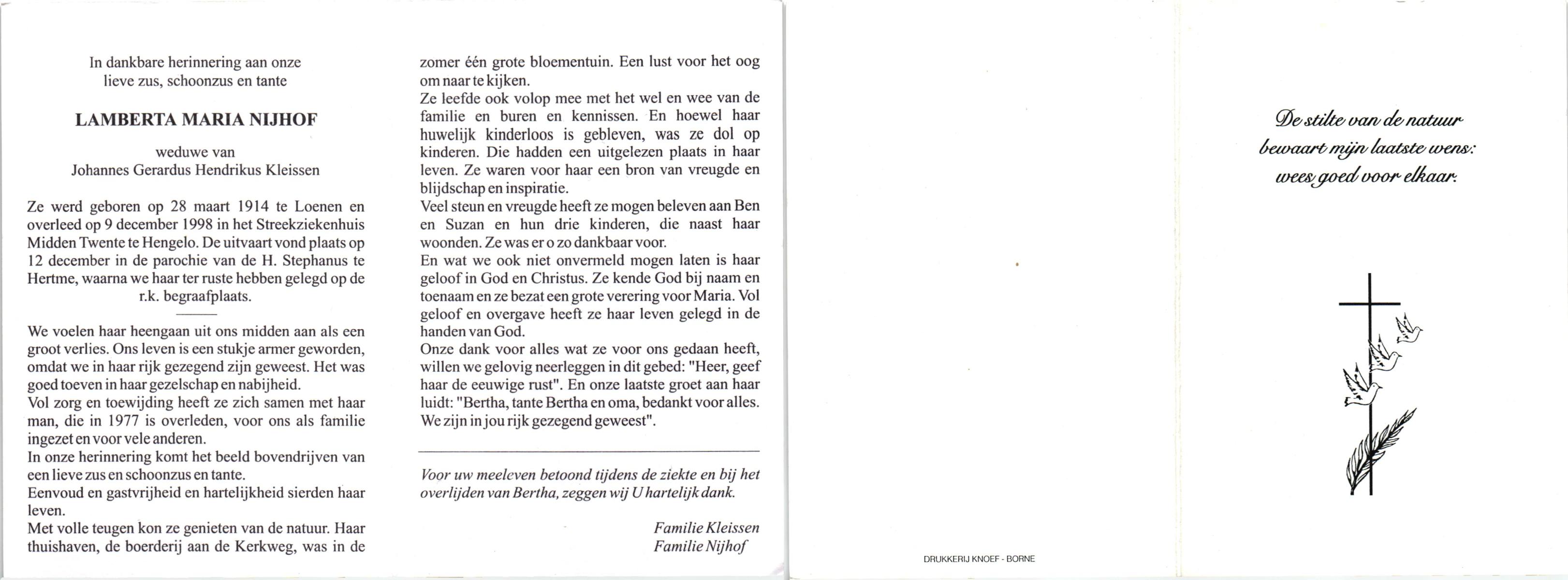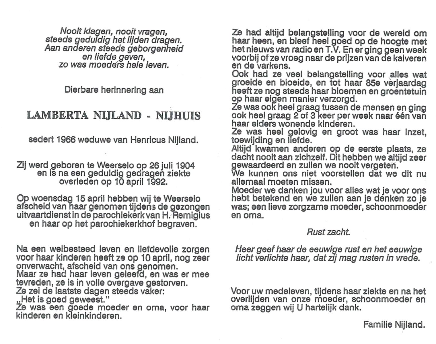 NIJHUIS, Lamberta, geboren op 26-7-1904 te Weerselo, overleden op 10-4-1992 op 87-jarige leeftijd, begraven op 15-4-1992 te Weerselo.