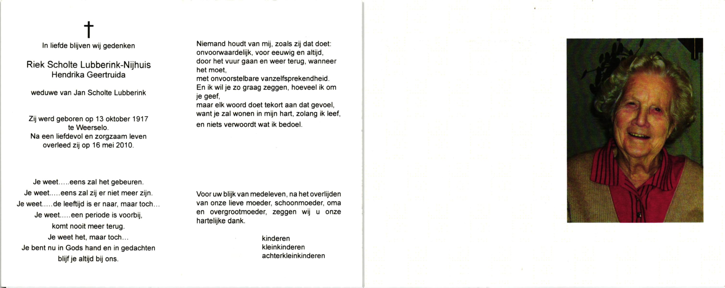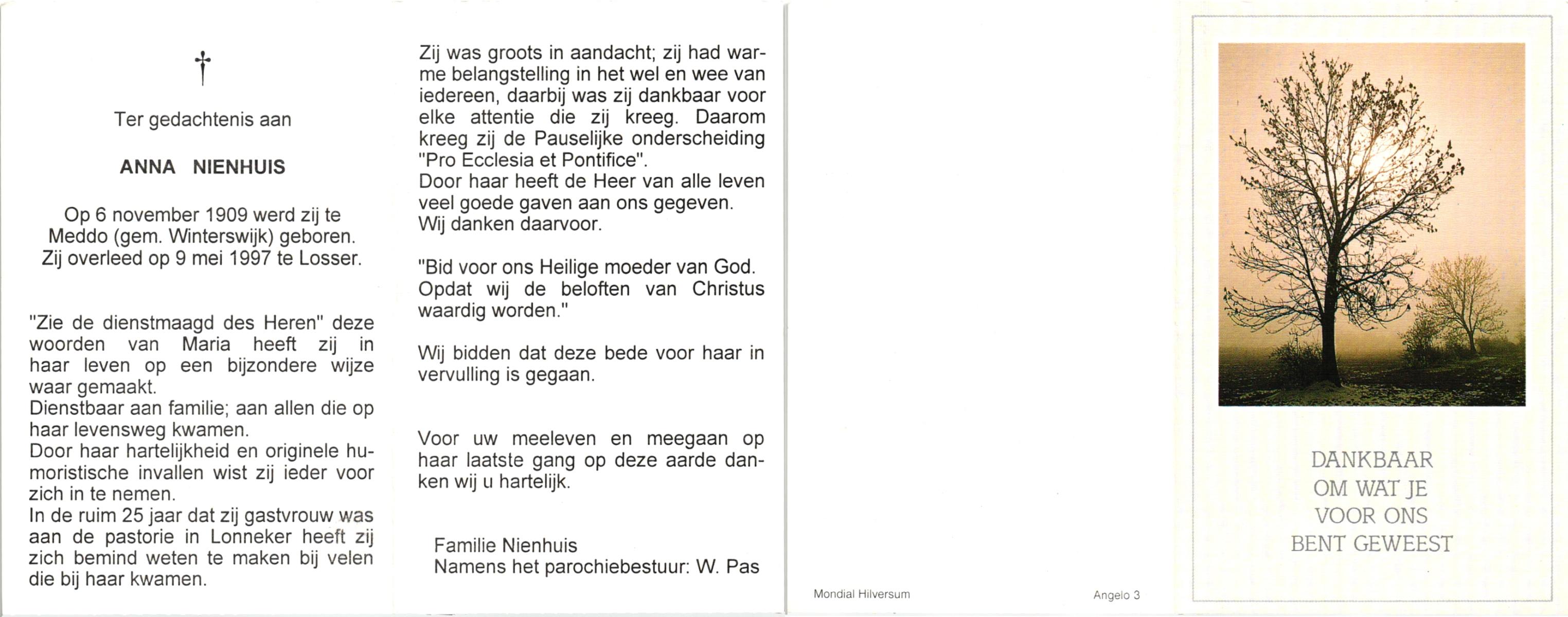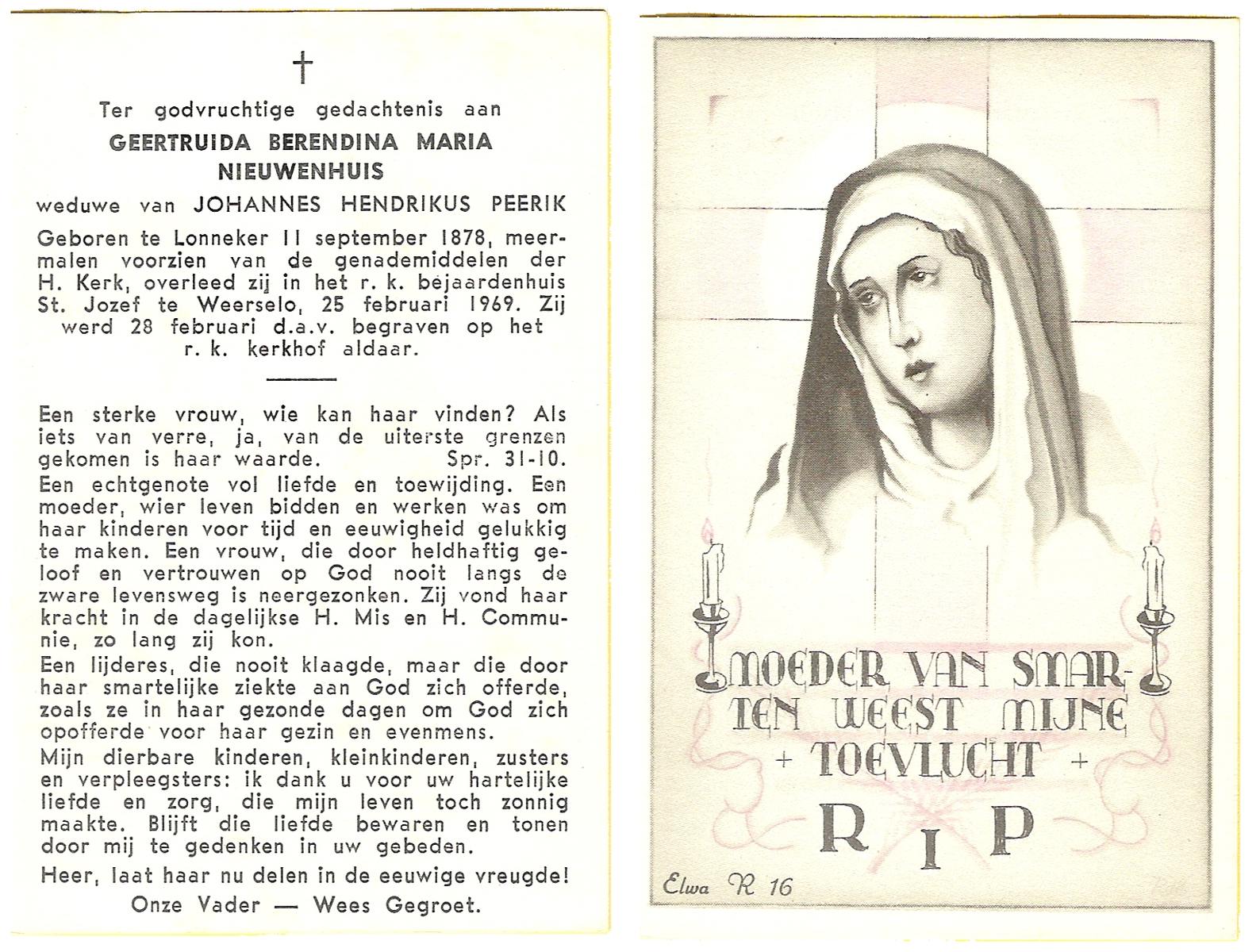 NIJHUIS, Lamberta, geboren op 26-7-1904 te Weerselo, overleden op 10-4-1992 op 87-jarige leeftijd, begraven op 15-4-1992 te Weerselo.