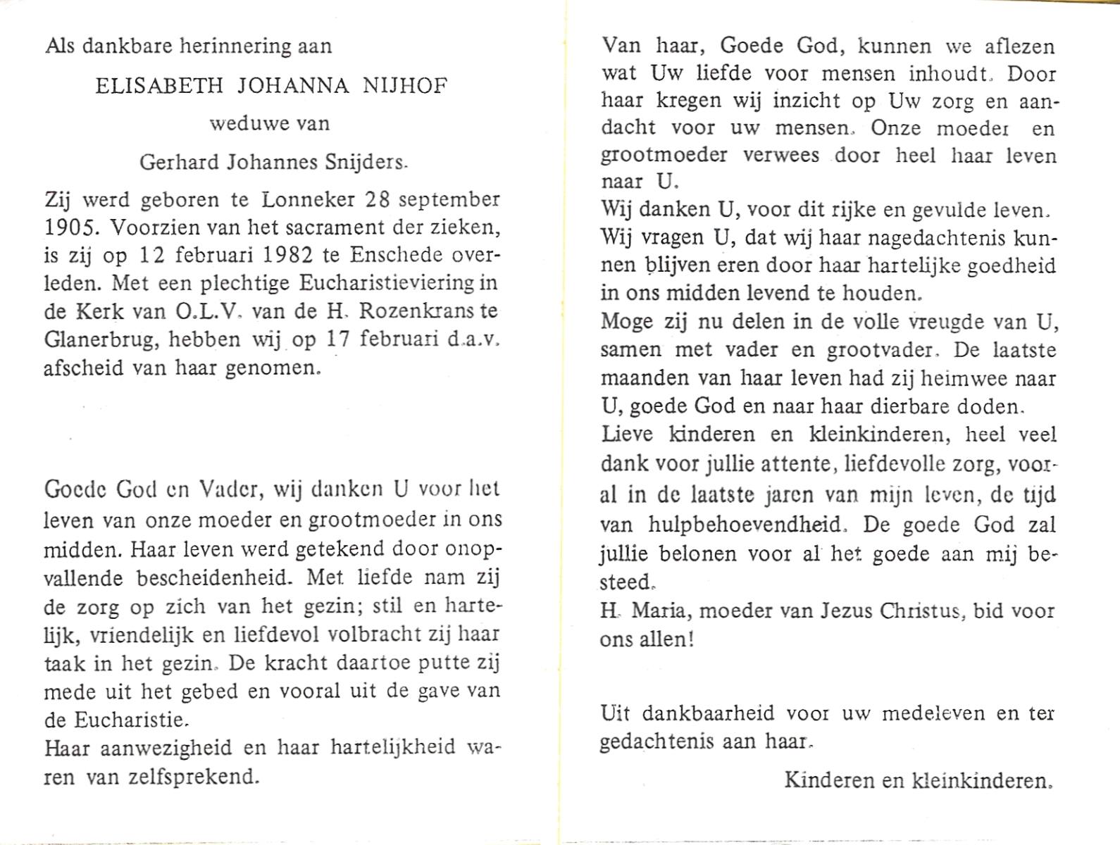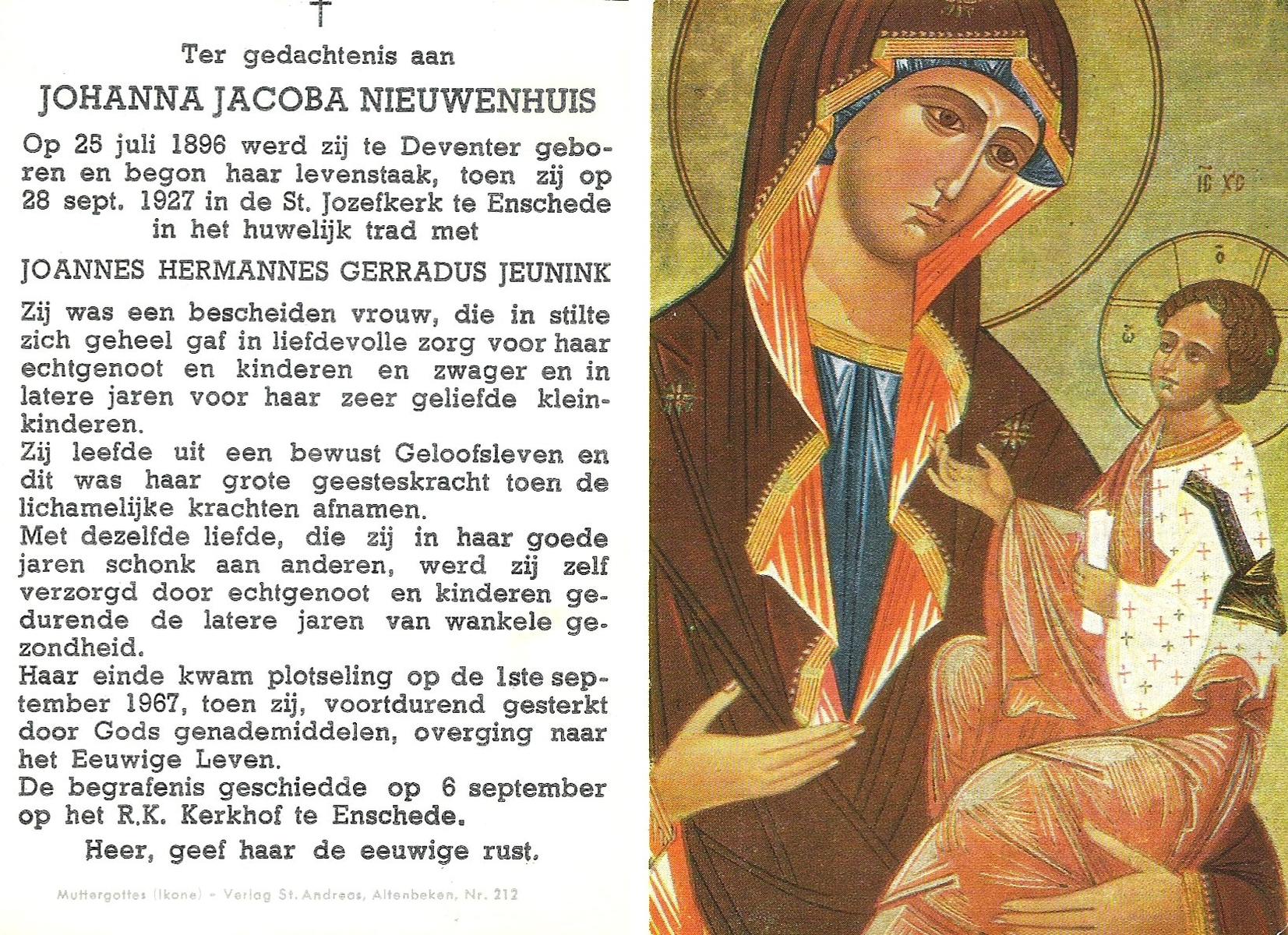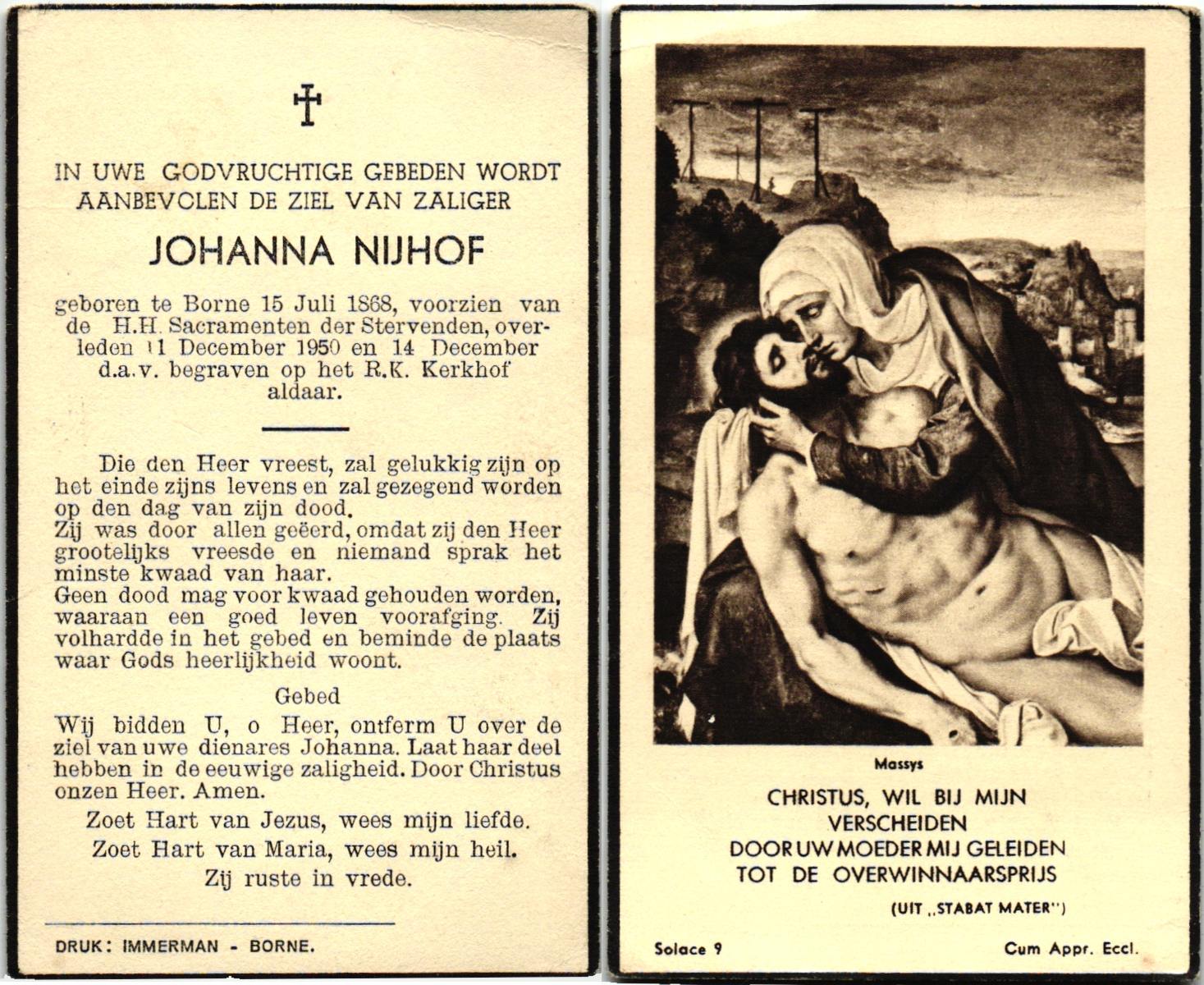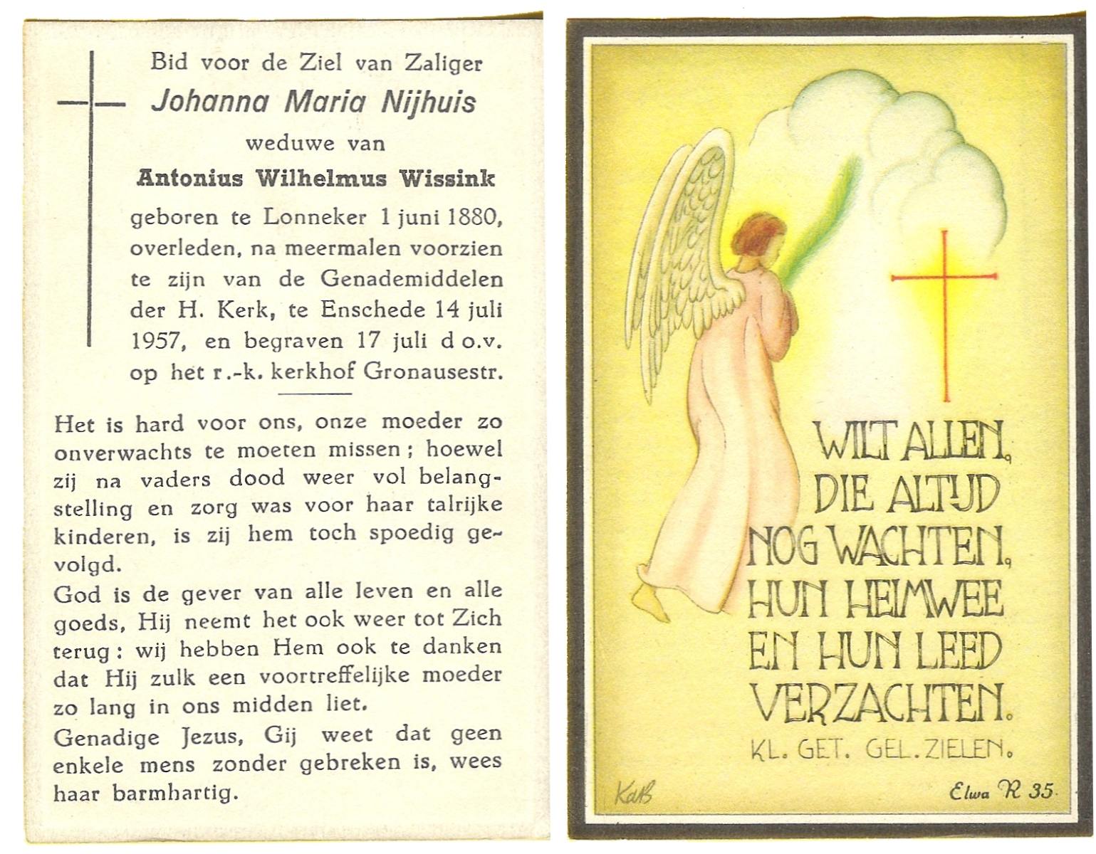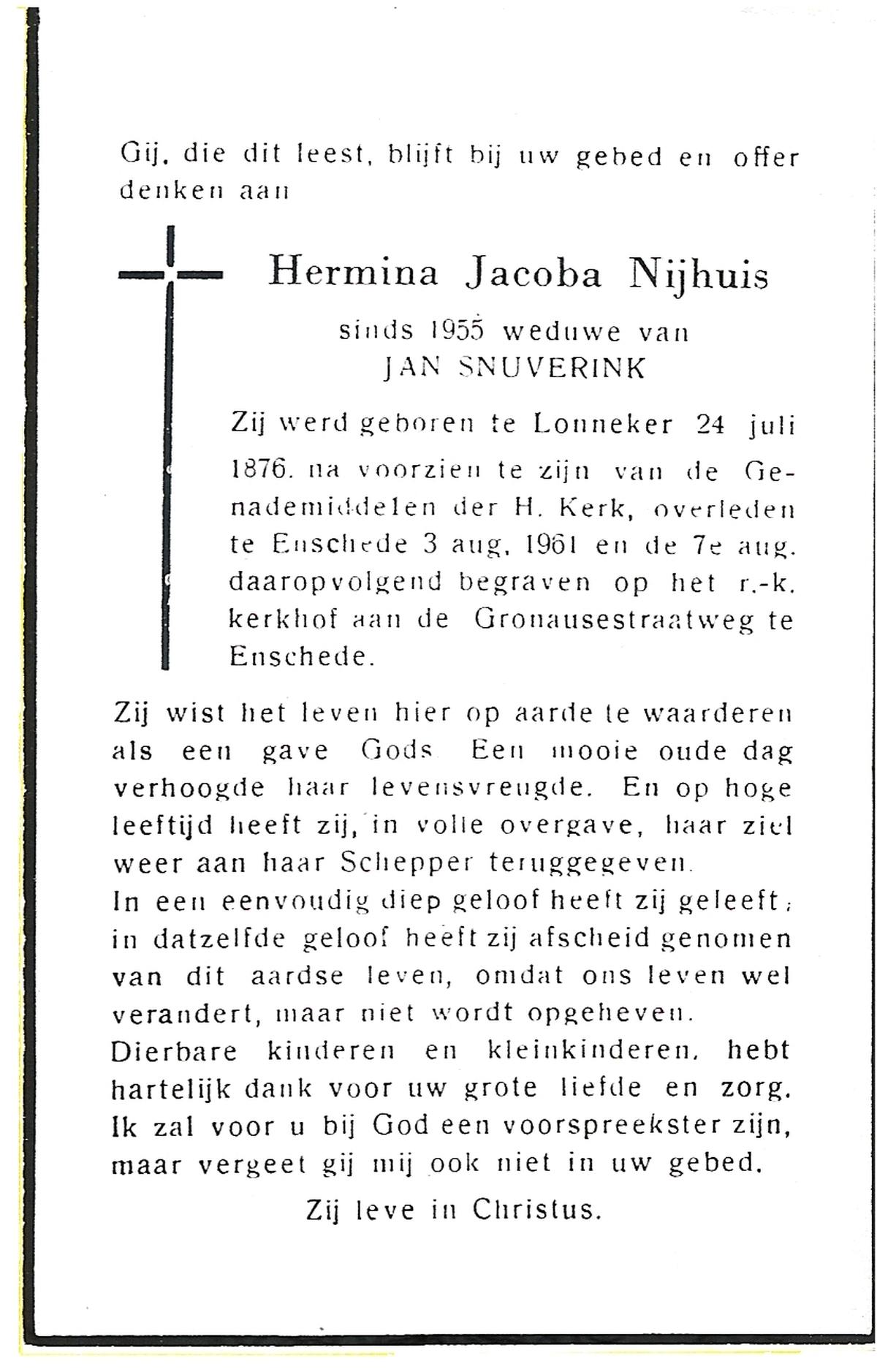 NIJHUIS, Johanna Maria, geboren op 01-06-1880 te Lonneker, overleden op 14-7-1957 te Enschede op 77-jarige leeftijd, begraven op 17-7-1957 te Enschede.