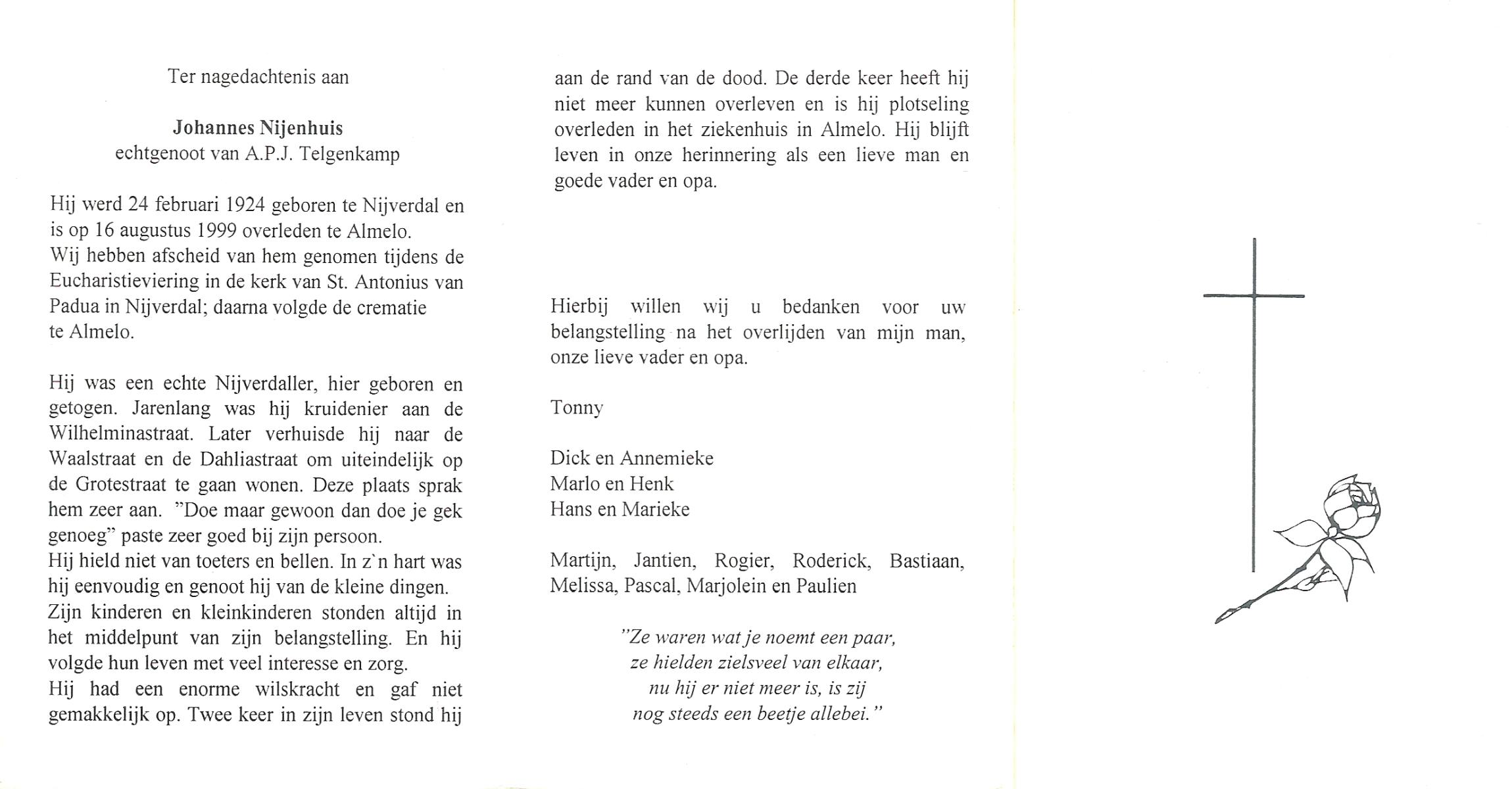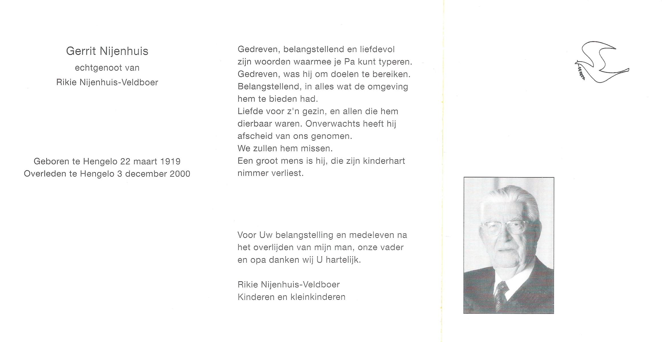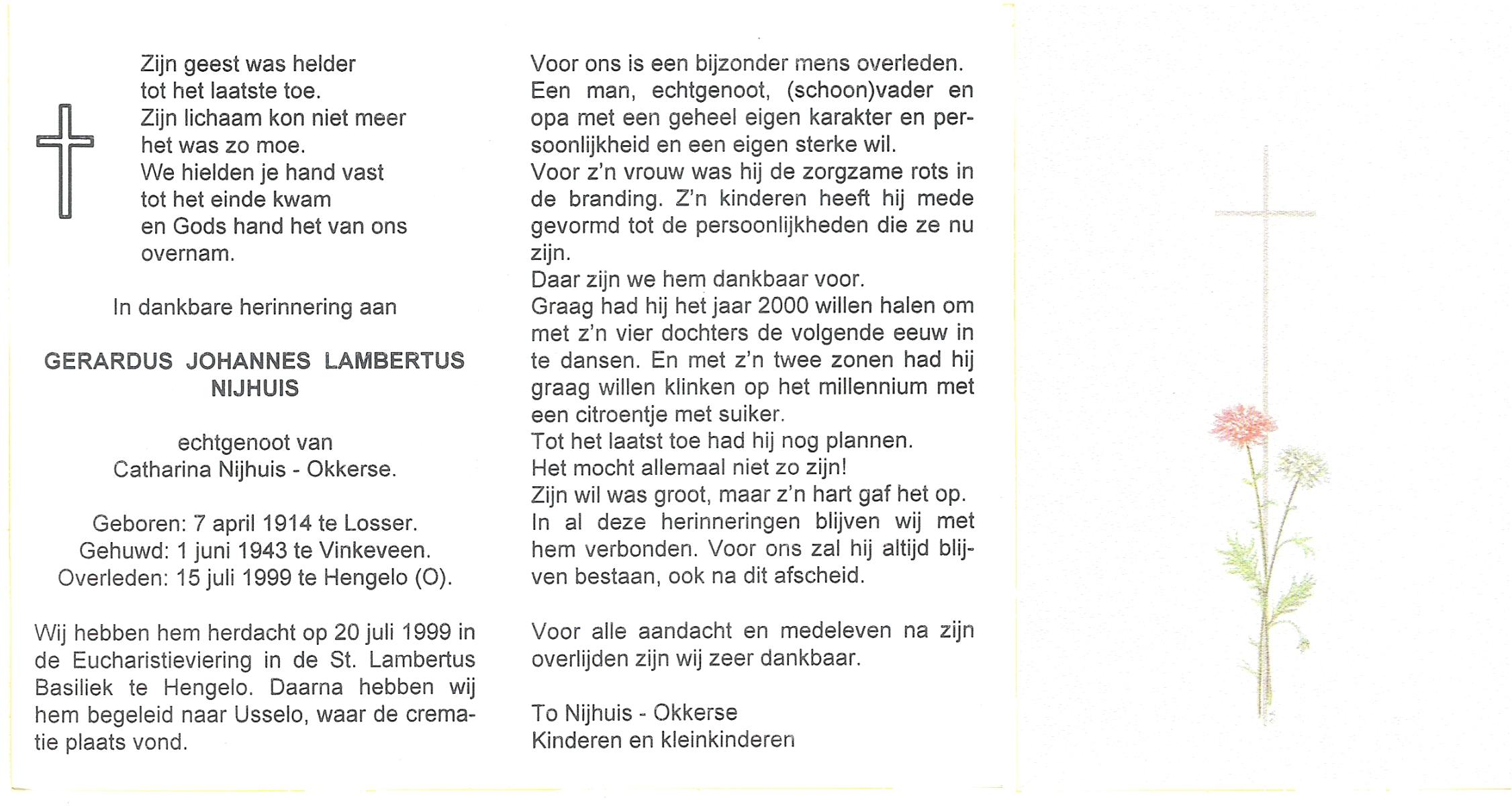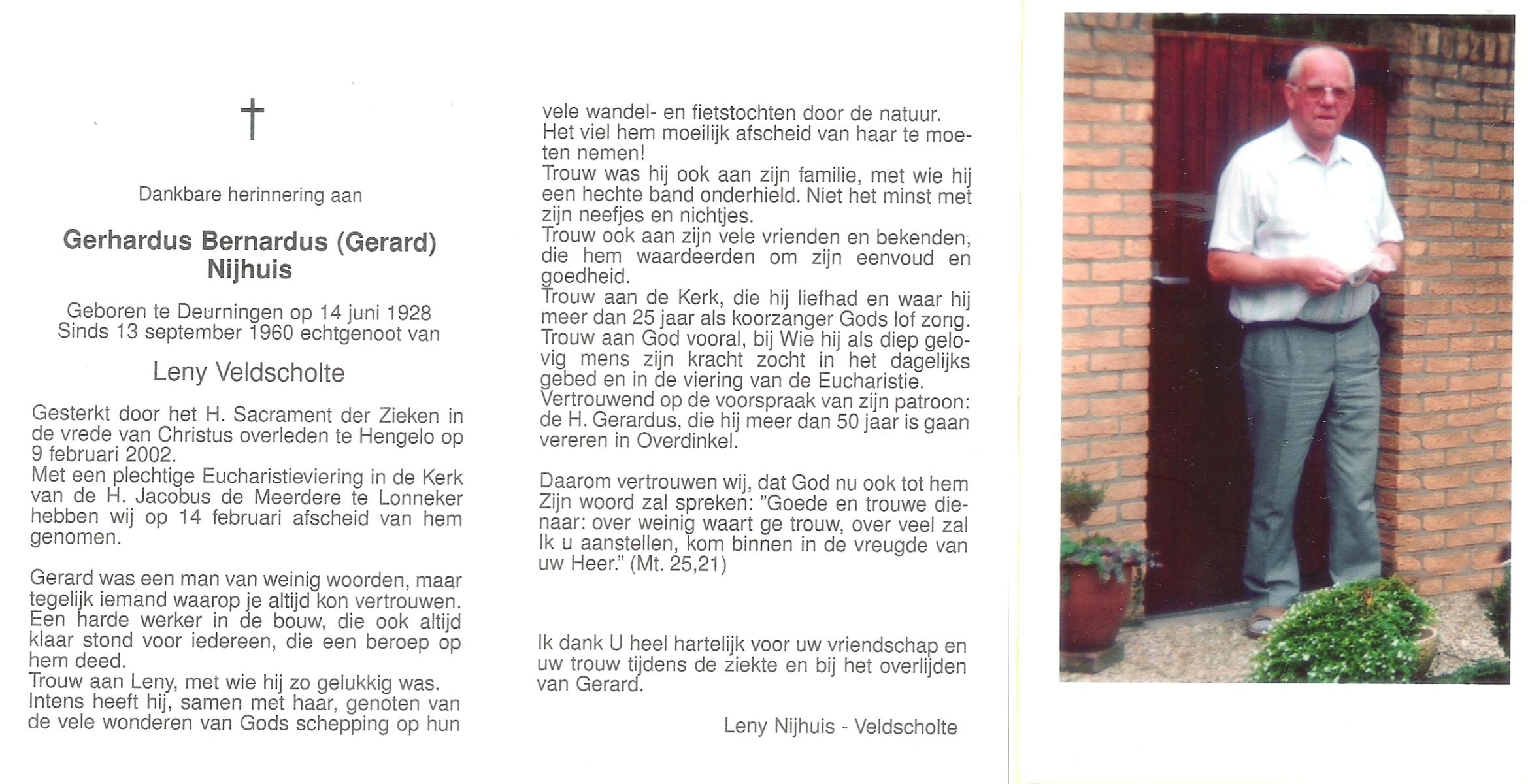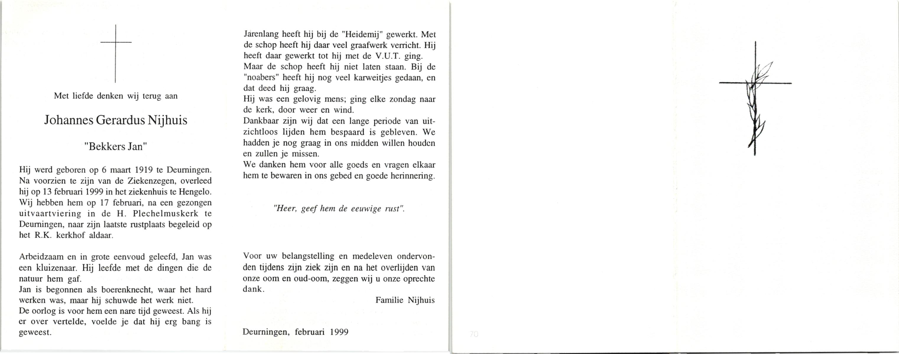 NIJHUIS, , Johannes Gerardus, geboren op 6-3-1919 te Deurningen, overleden op 13-2-1999 te Hengelo (O) op 79-jarige leeftijd, begraven op 17-2-1999 te Deurningen.