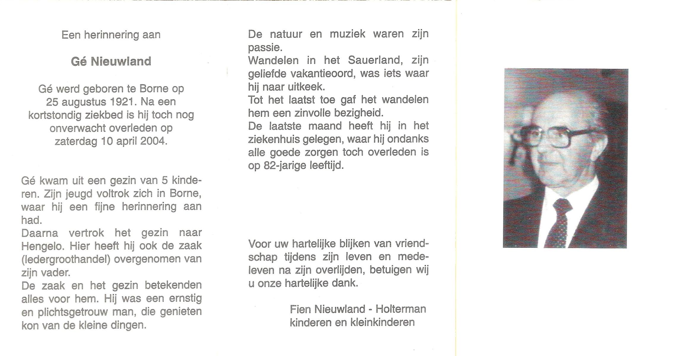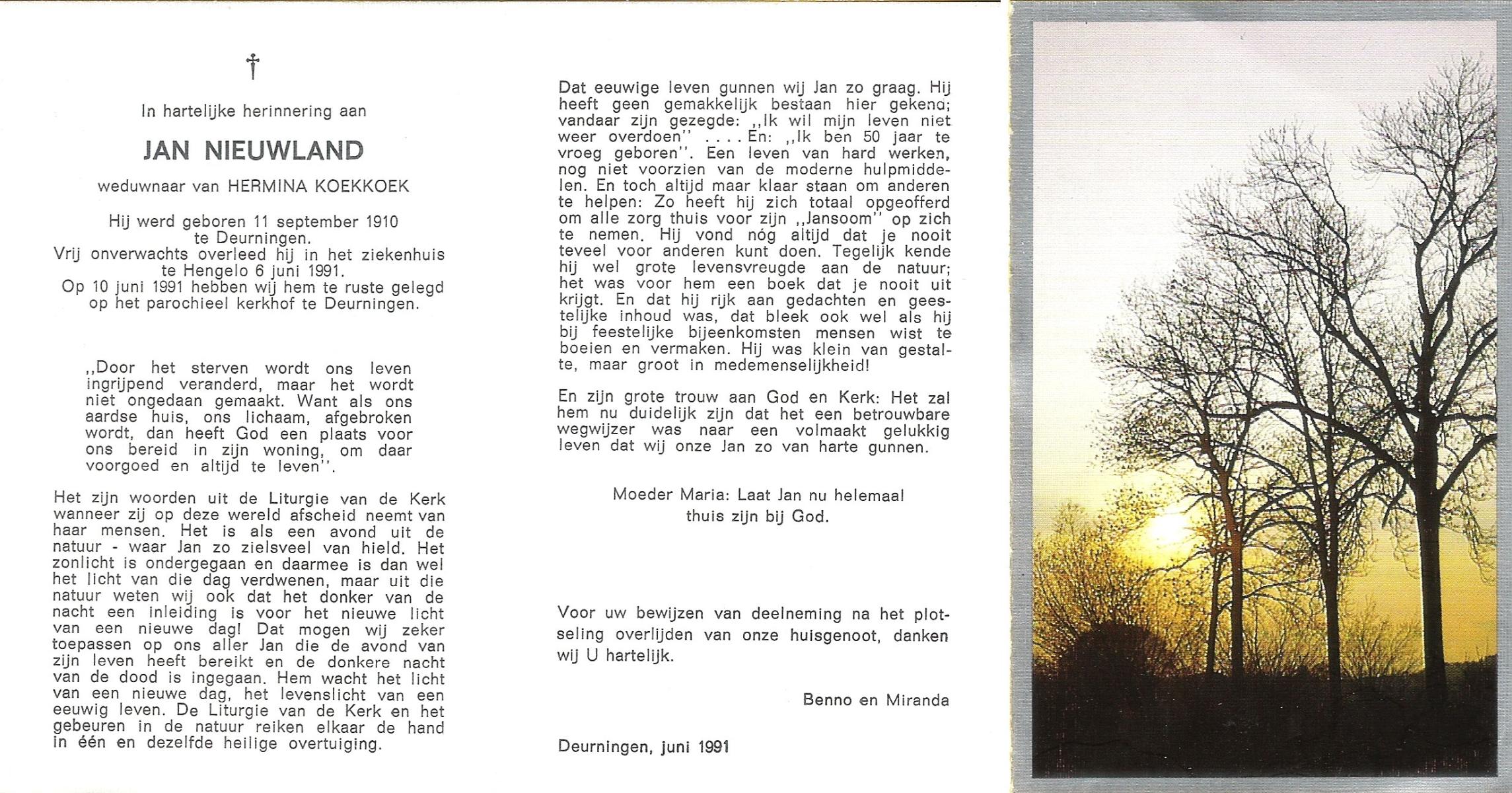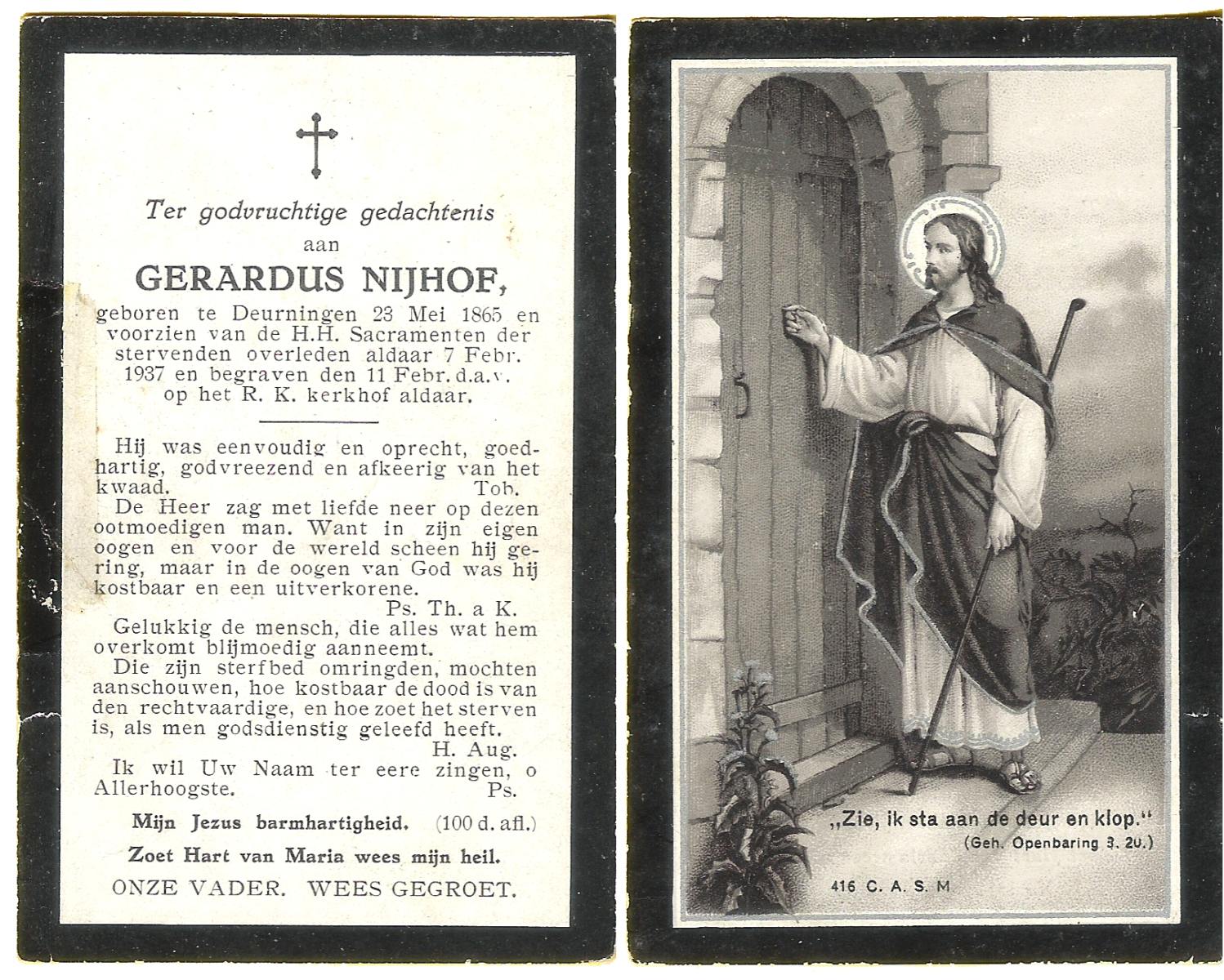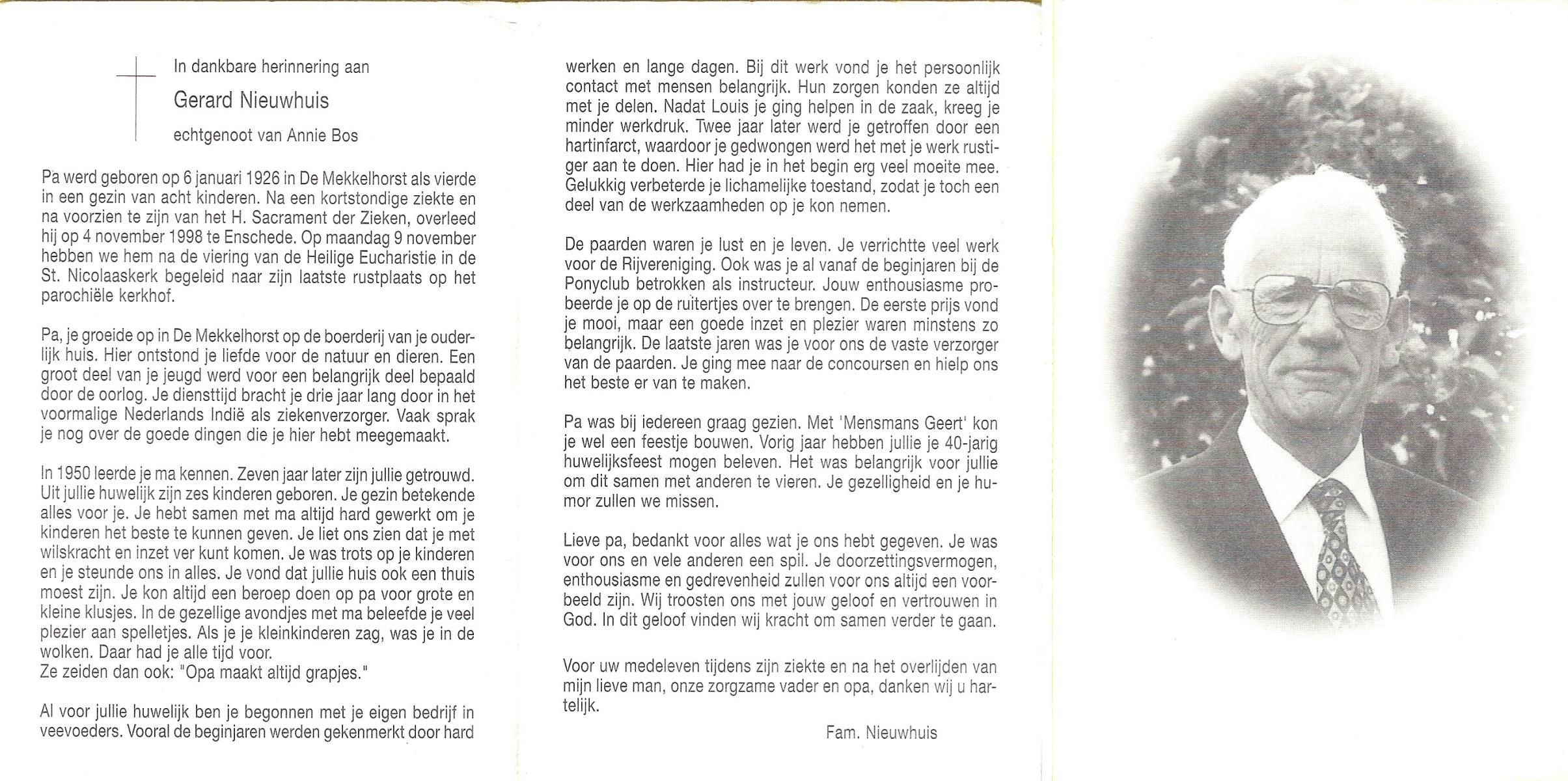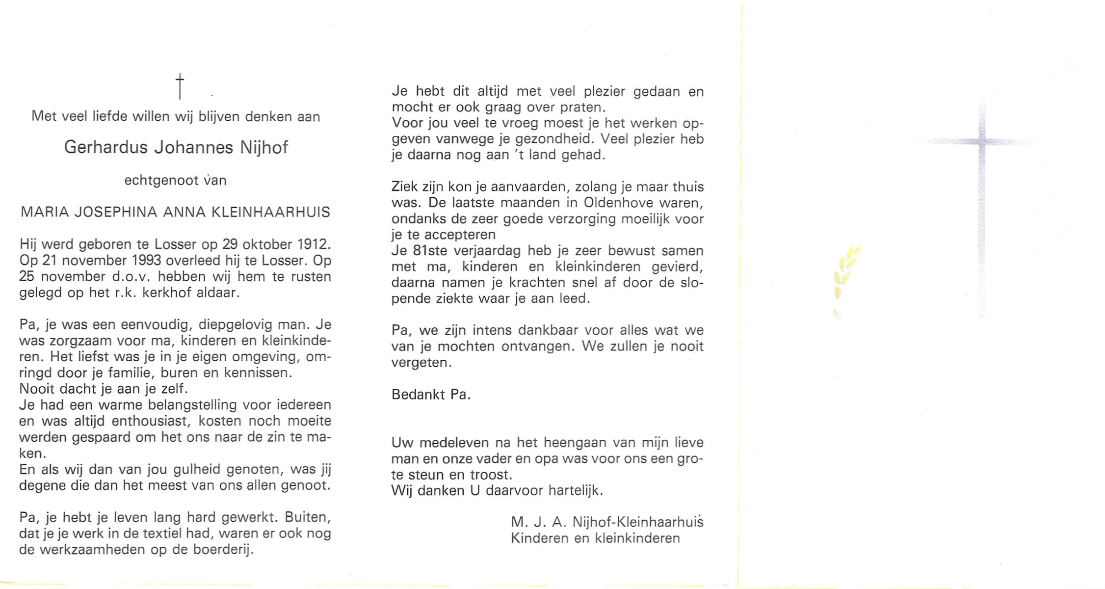 NIJHUIS, , Johannes Gerardus, geboren op 6-3-1919 te Deurningen, overleden op 13-2-1999 te Hengelo (O) op 79-jarige leeftijd, begraven op 17-2-1999 te Deurningen.