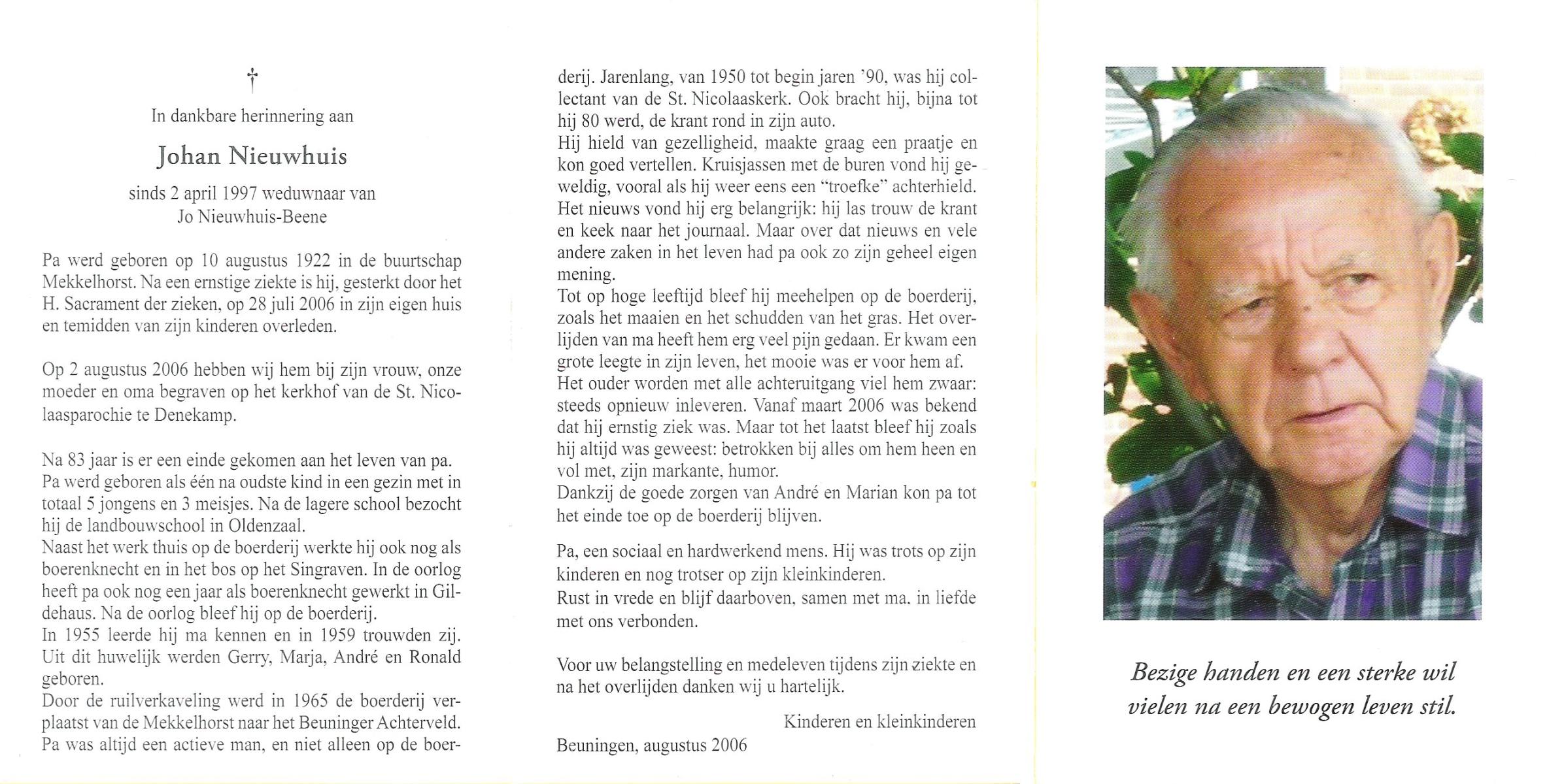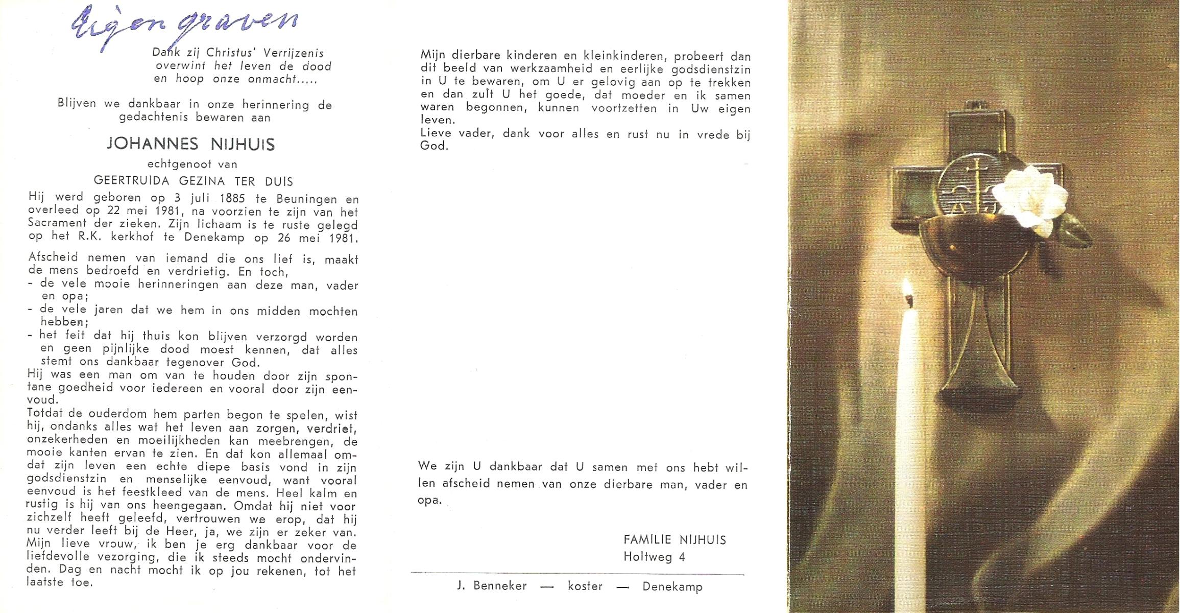 NIJHUIS, Johannes, geboren op 03-07-1885 te Beuningen (Ov.), overleden op 22-5-1981 op 95-jarige leeftijd, begraven op 26-5-1981 te Denekamp.