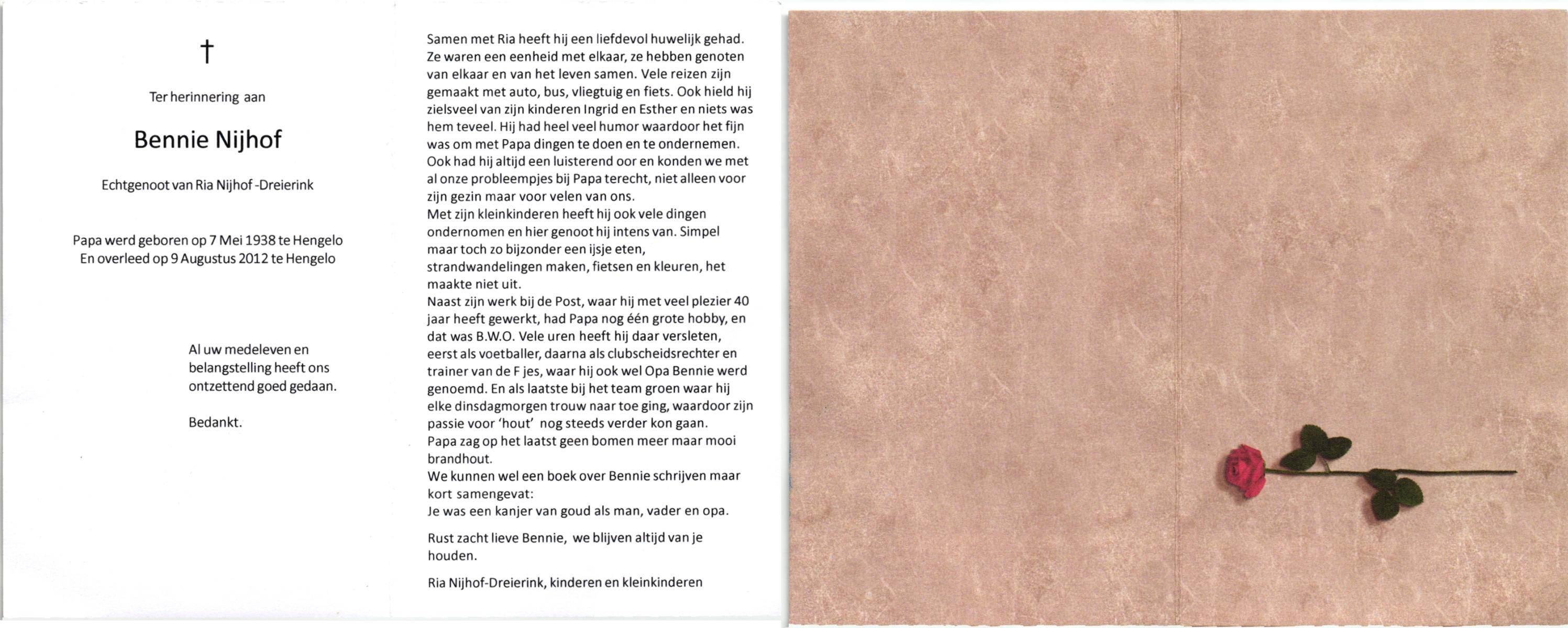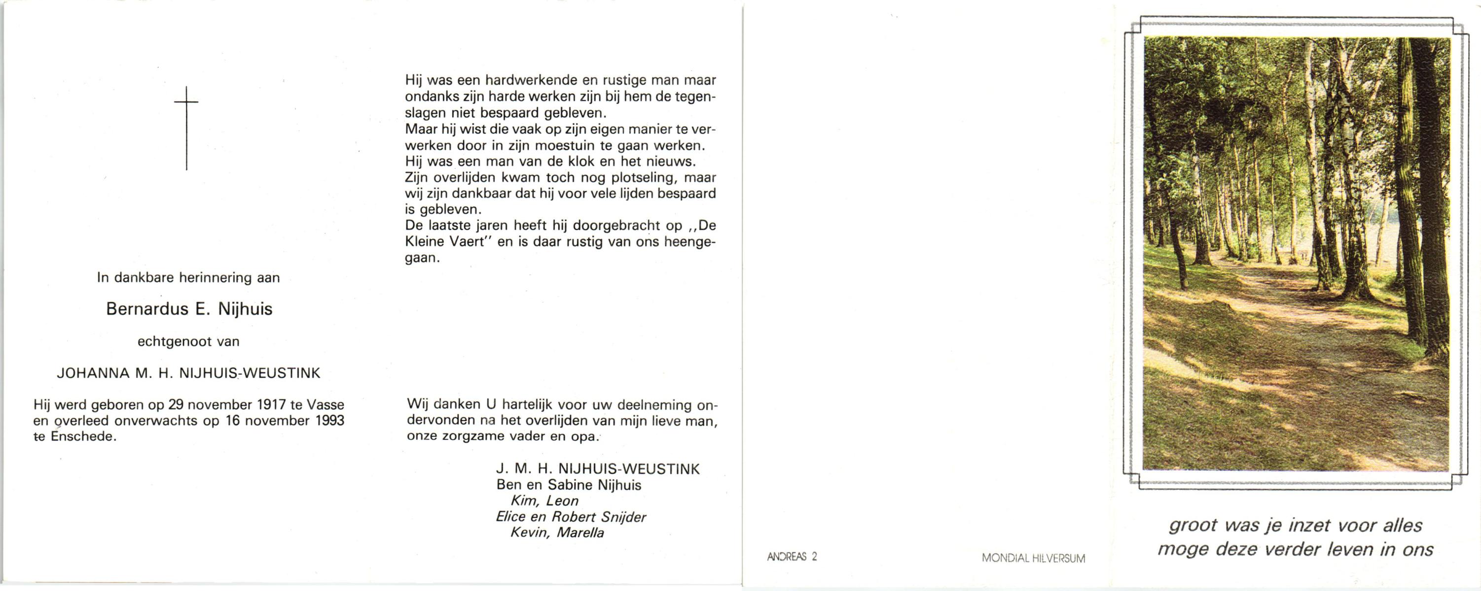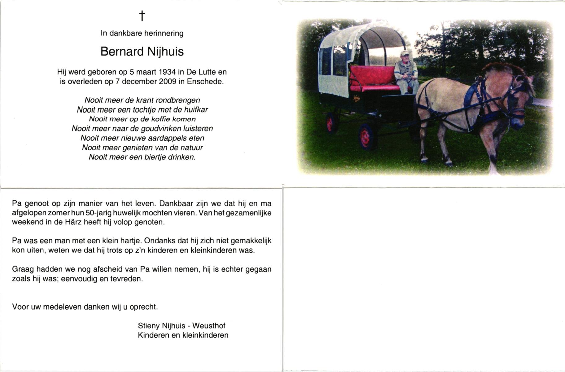 NIJHUIS, , Bernard, geboren op 5-3-1934 te De Lutte, overleden op 7-12-2009 te Enschede op 75-jarige leeftijd.