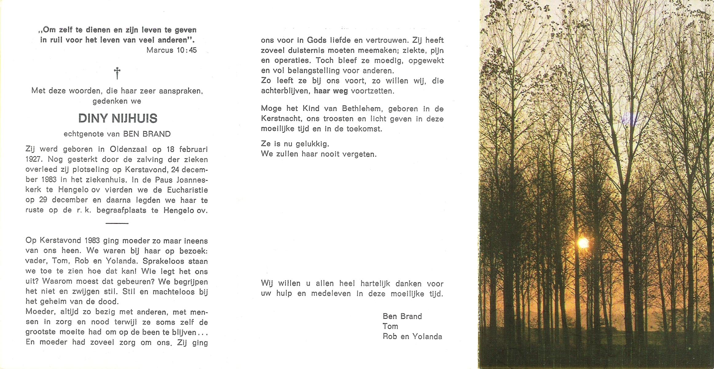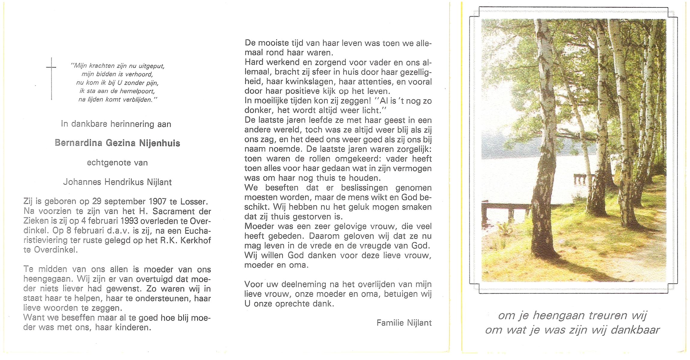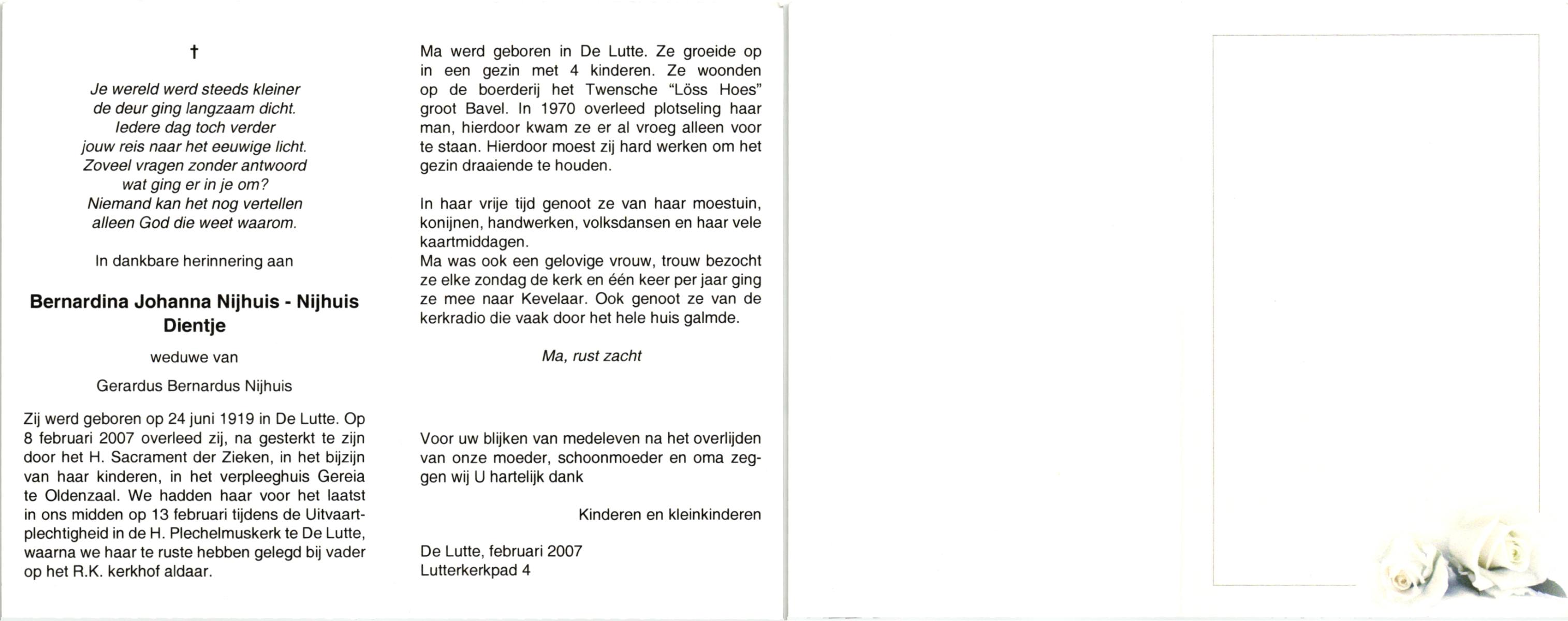 NIJHUIS, , Bernardina Johanna (Dientje), geboren op 24-6-1919 te De Lutte, overleden op 8-2-2007 te Oldenzaal op 87-jarige leeftijd, begraven op 13-2-2007 te De Lutte.