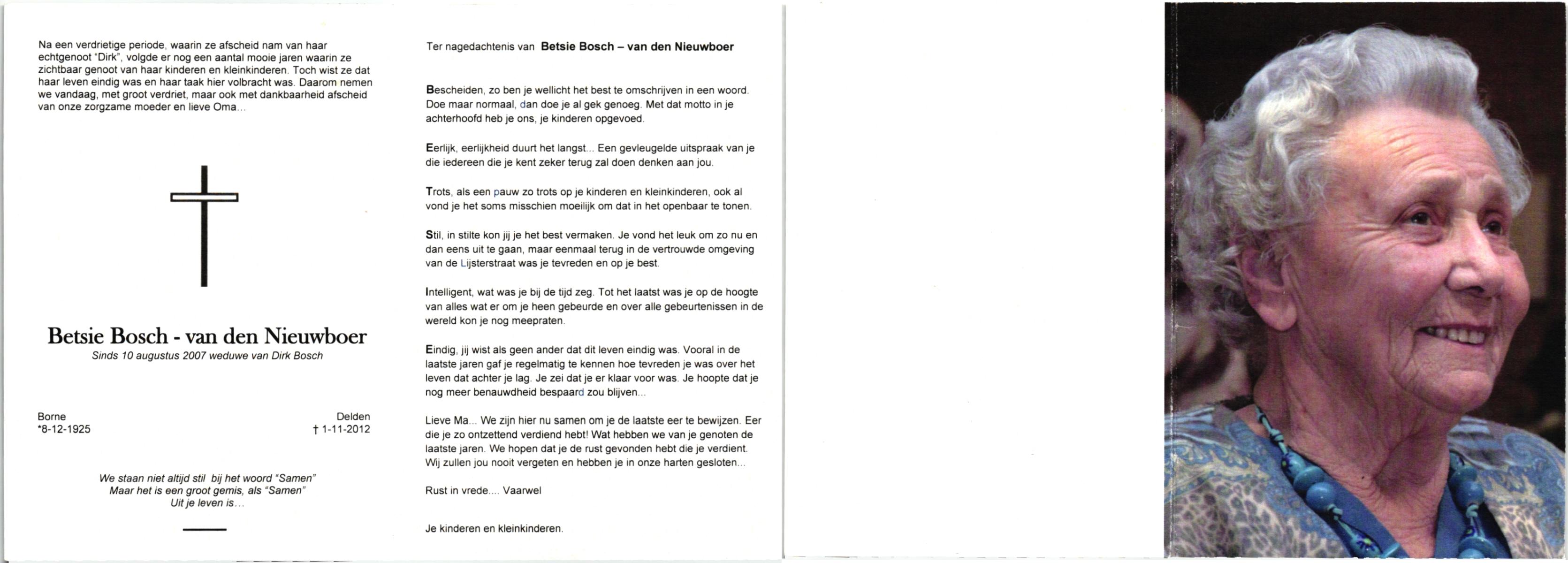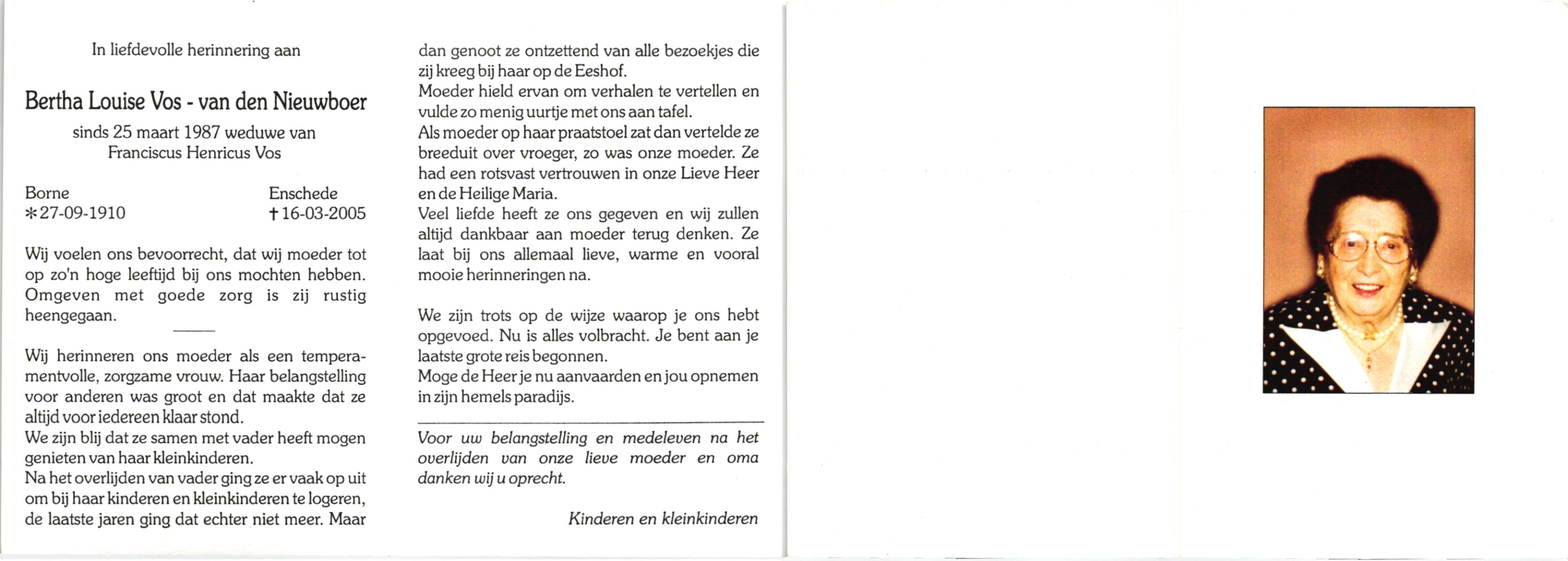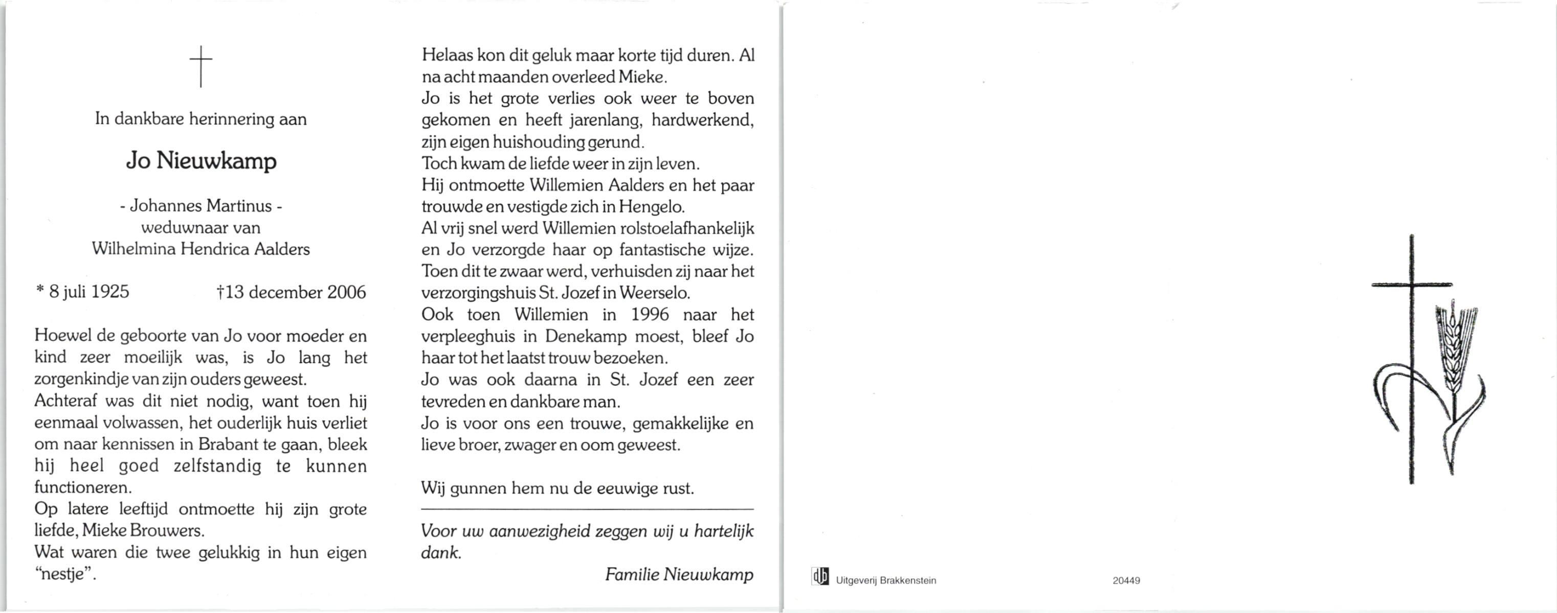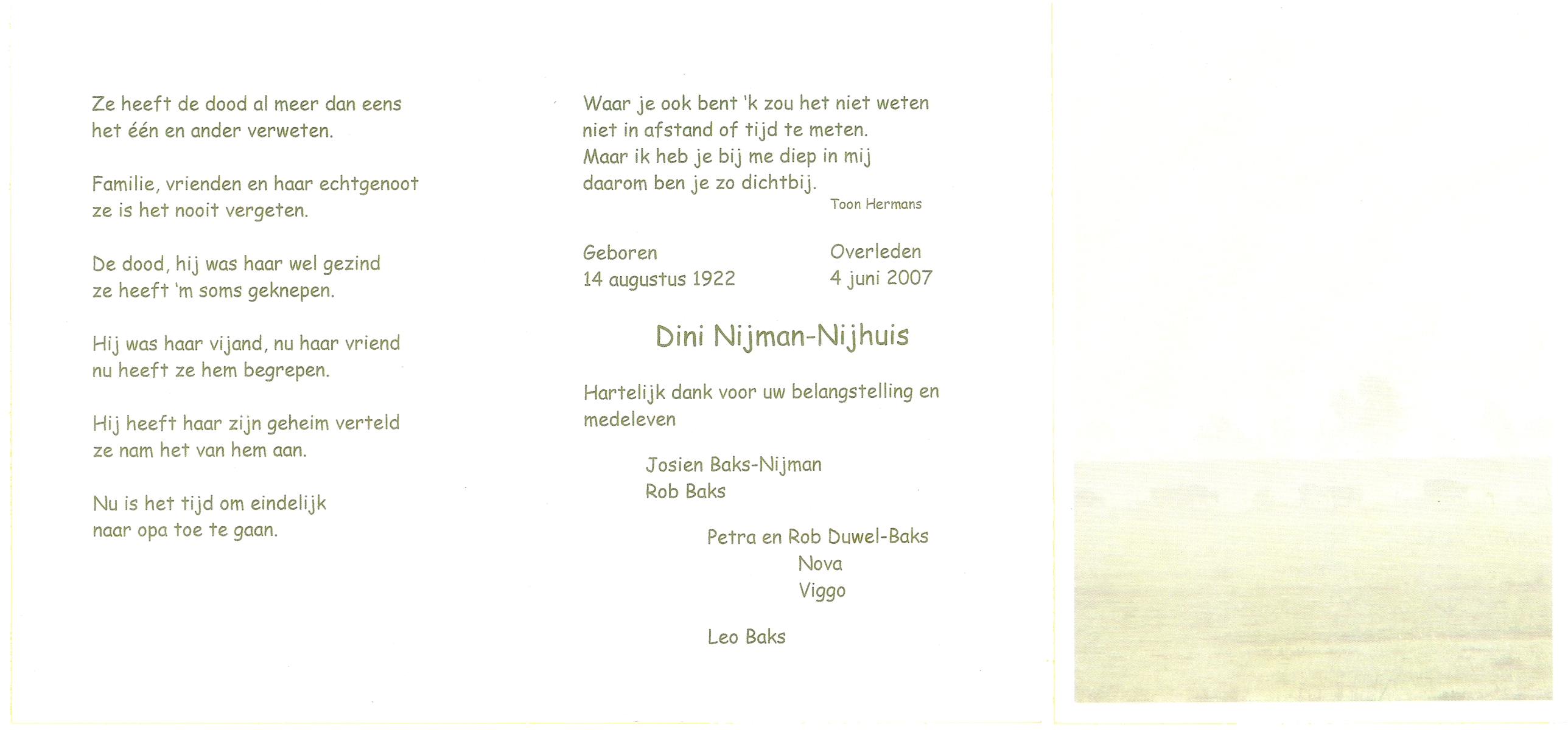 NIJHUIS, , Bernardina Johanna (Dientje), geboren op 24-6-1919 te De Lutte, overleden op 8-2-2007 te Oldenzaal op 87-jarige leeftijd, begraven op 13-2-2007 te De Lutte.