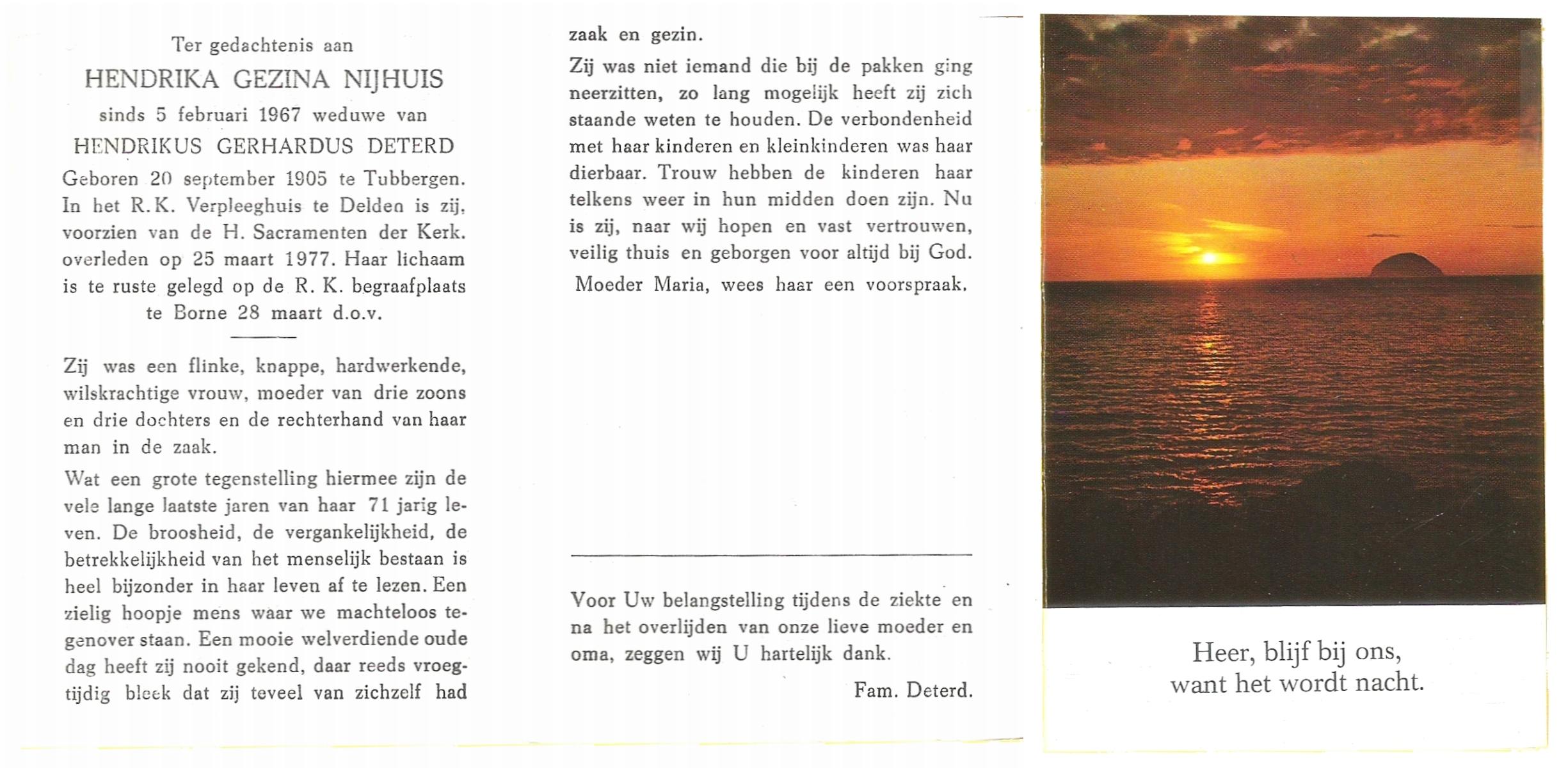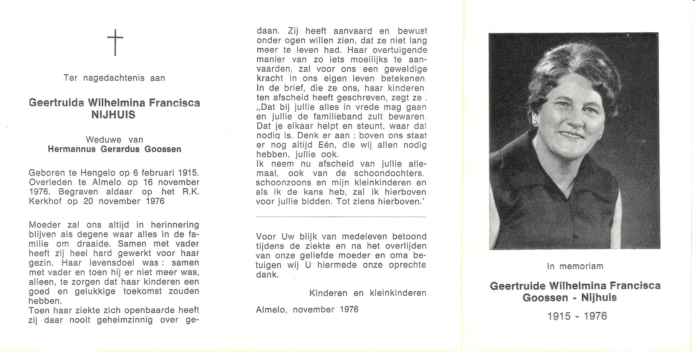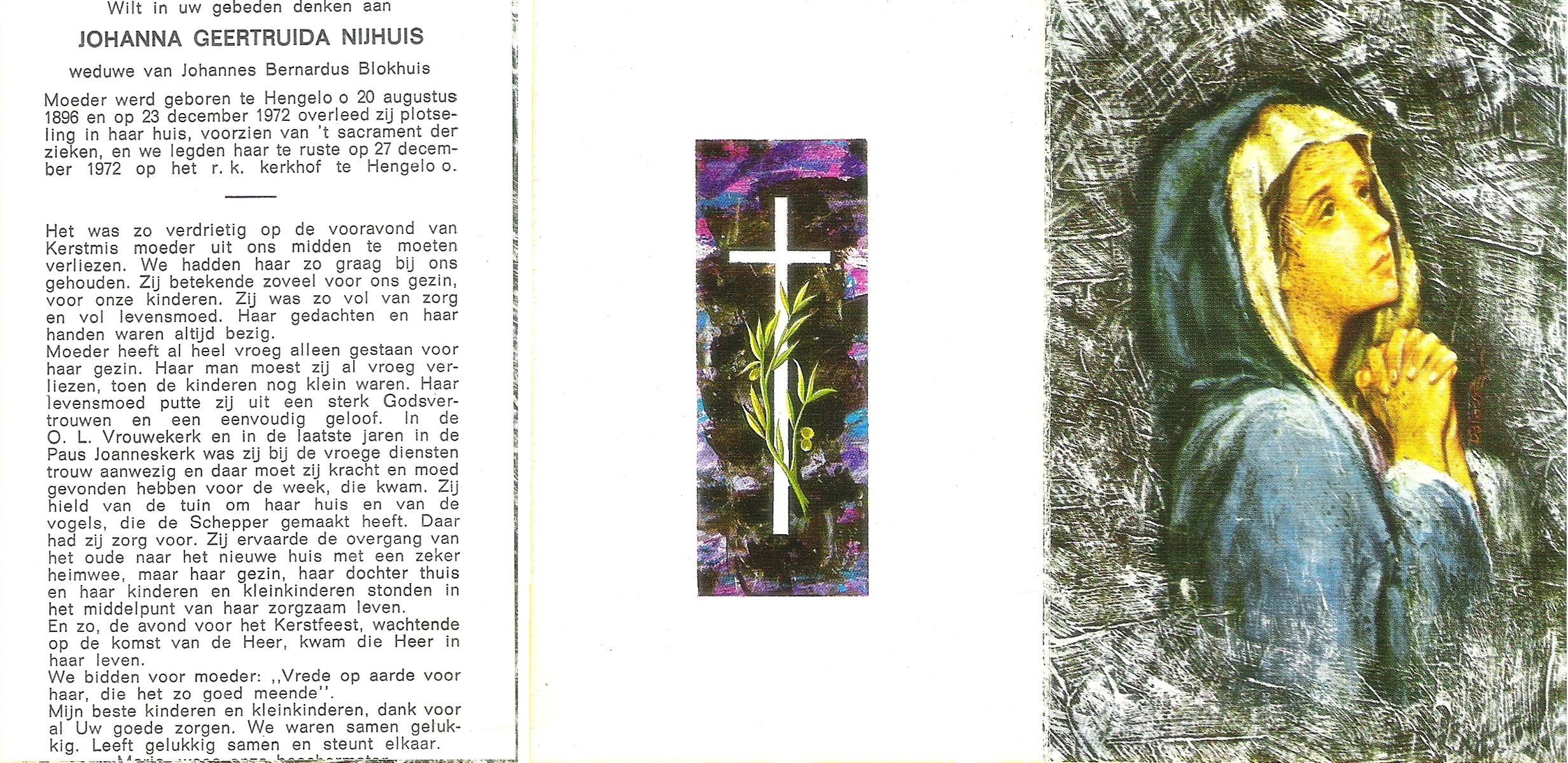 NIJHUIS, Johanna Geertruida, geboren op 20-08-1896 te Hengelo (O), overleden op 23-12-1972 te Hengelo (Ov.) op 76-jarige leeftijd, begraven op 27-12-1972 te Hengelo (Ov.).