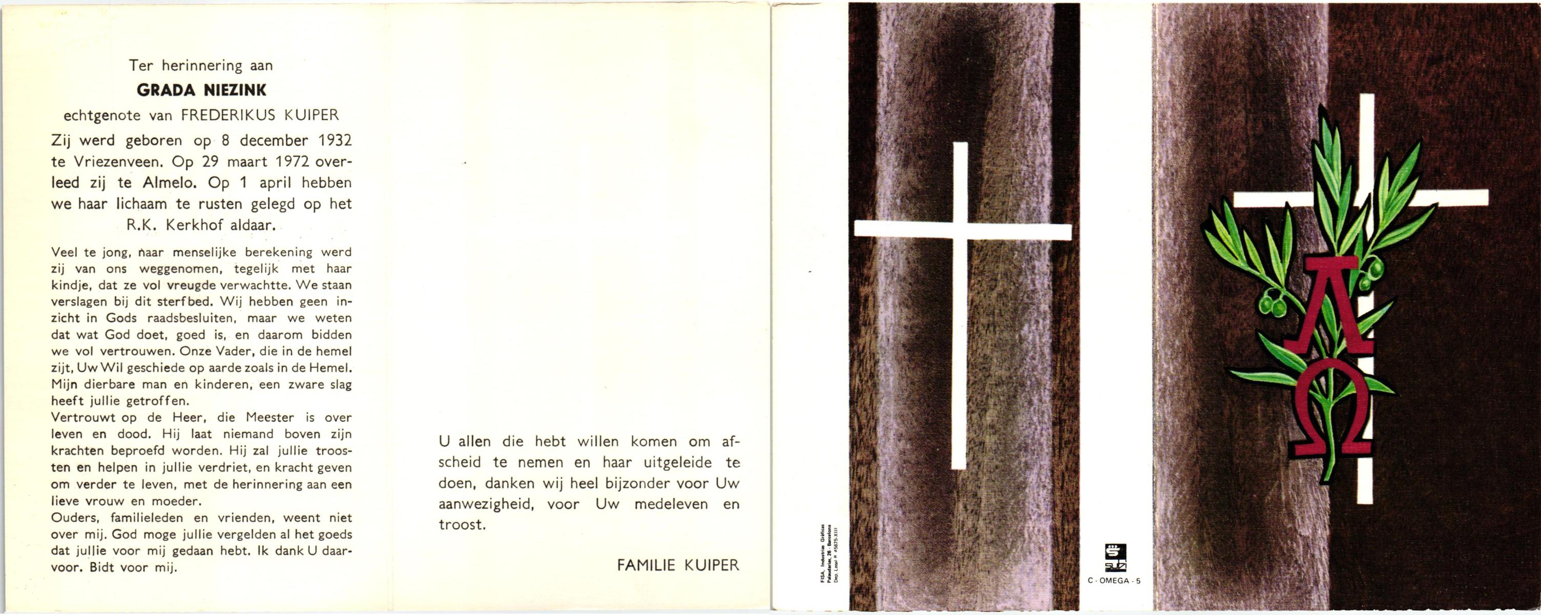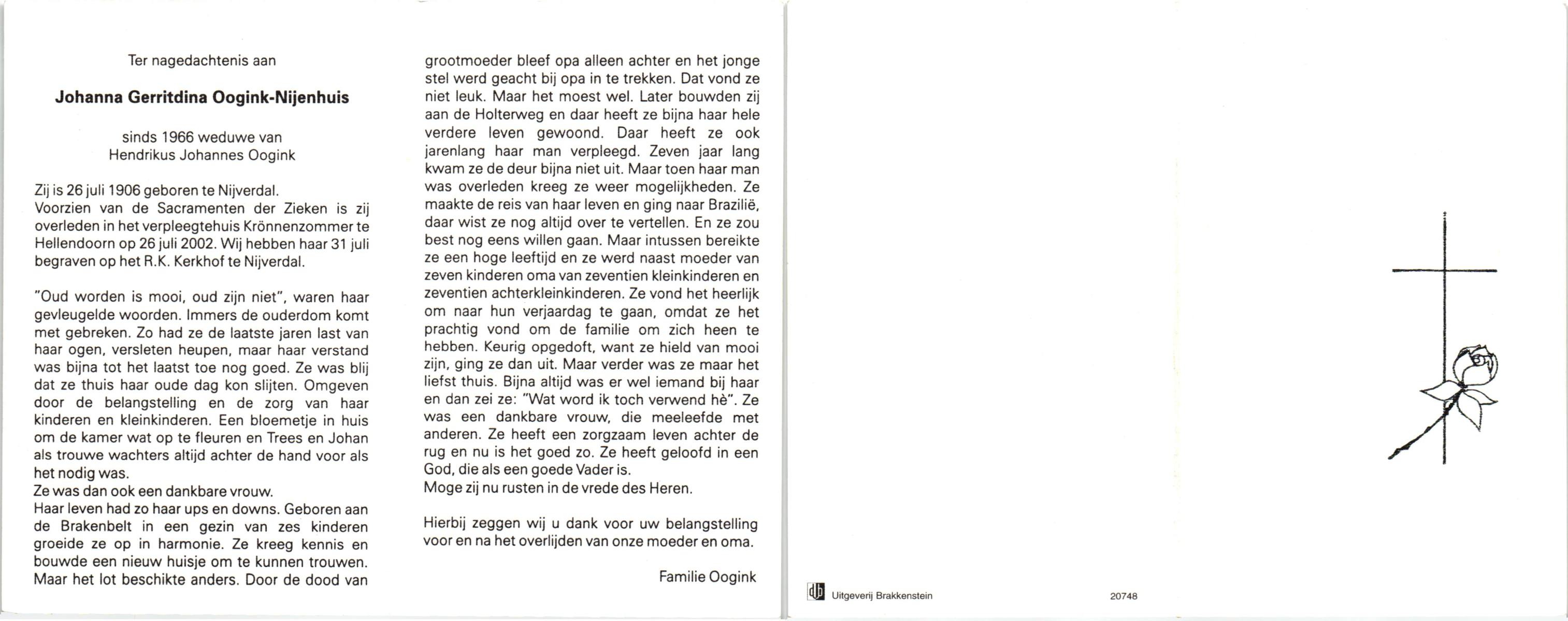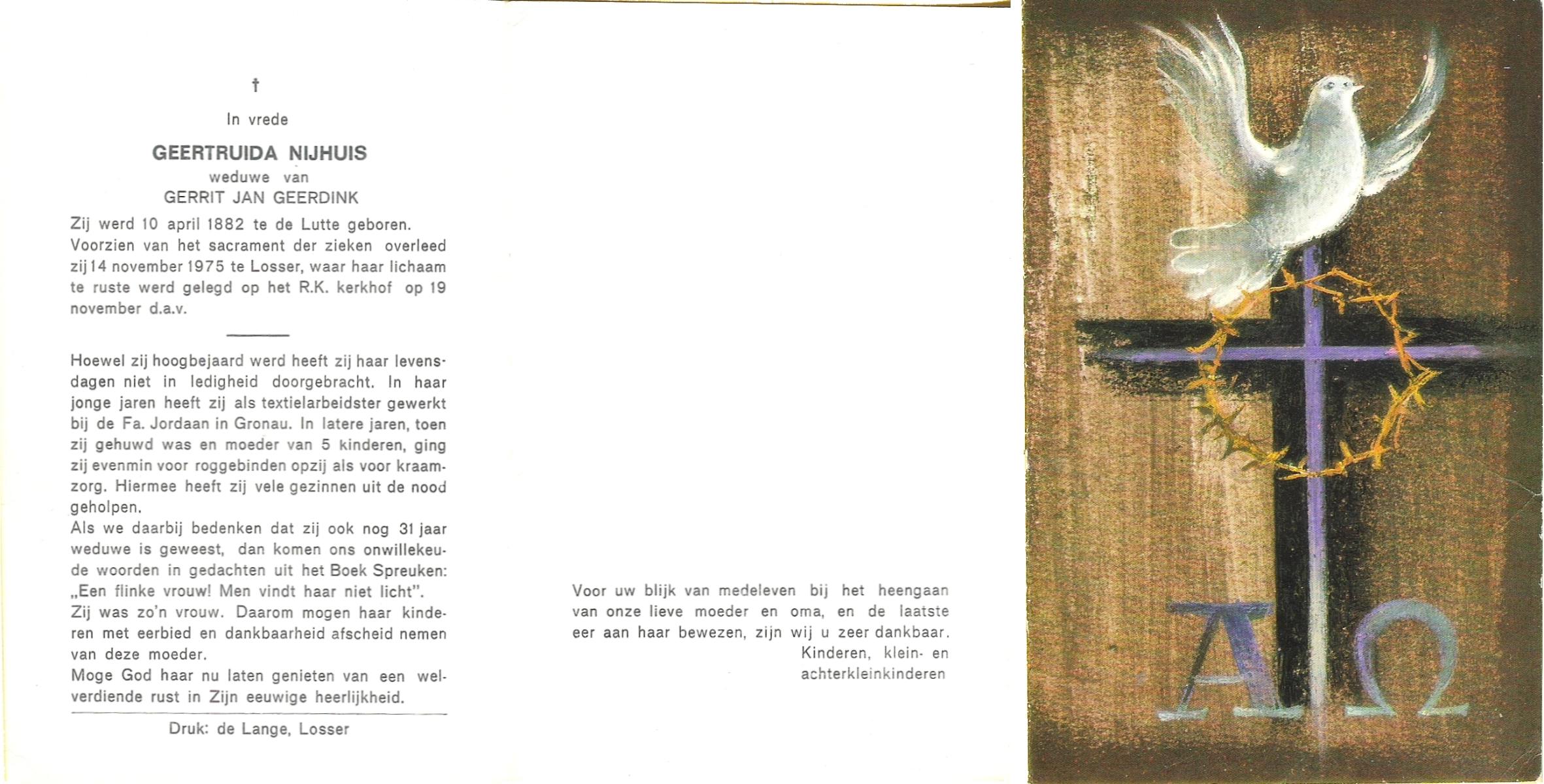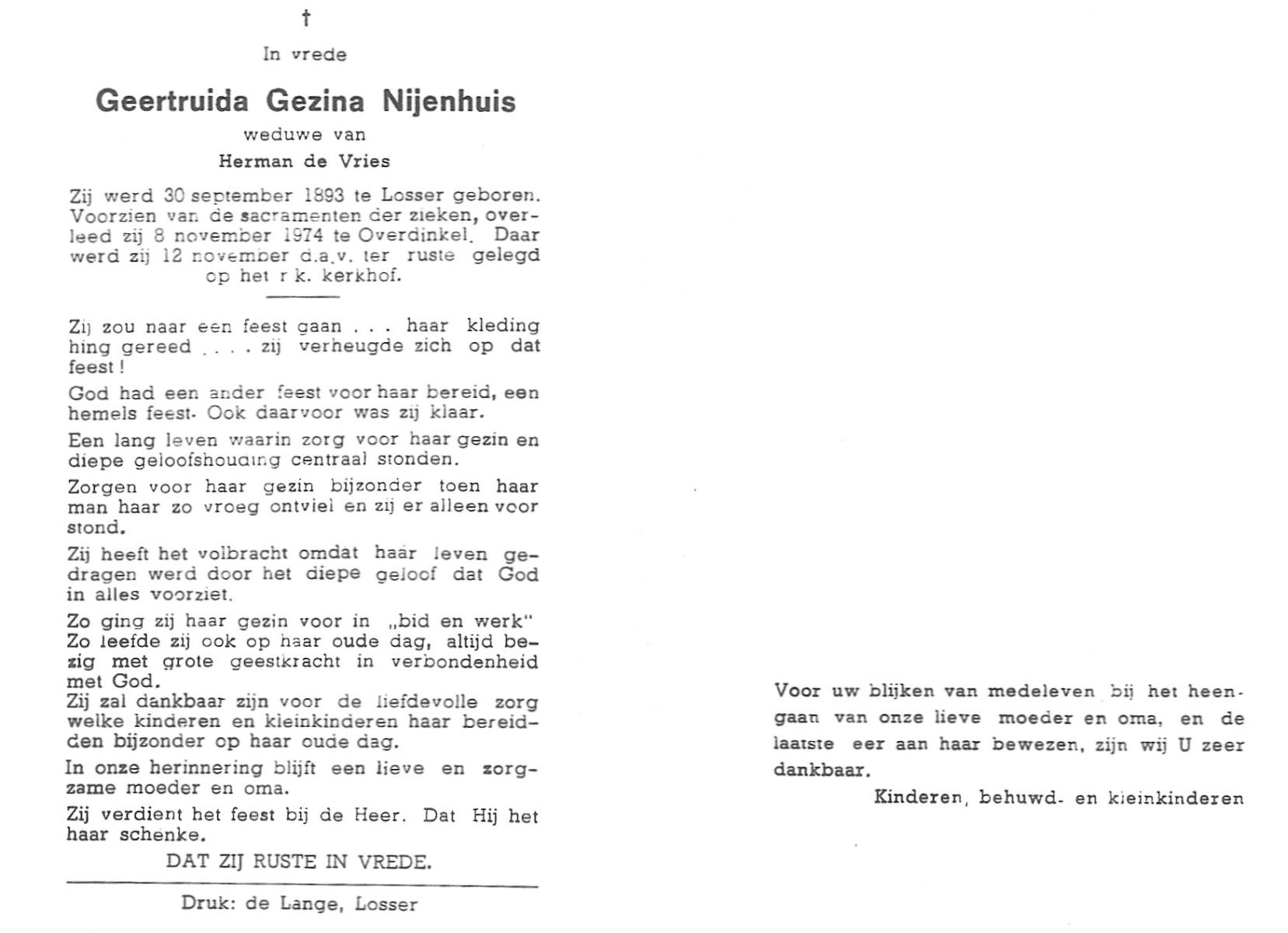 NIJHUIS, Johanna Geertruida, geboren op 20-08-1896 te Hengelo (O), overleden op 23-12-1972 te Hengelo (Ov.) op 76-jarige leeftijd, begraven op 27-12-1972 te Hengelo (Ov.).