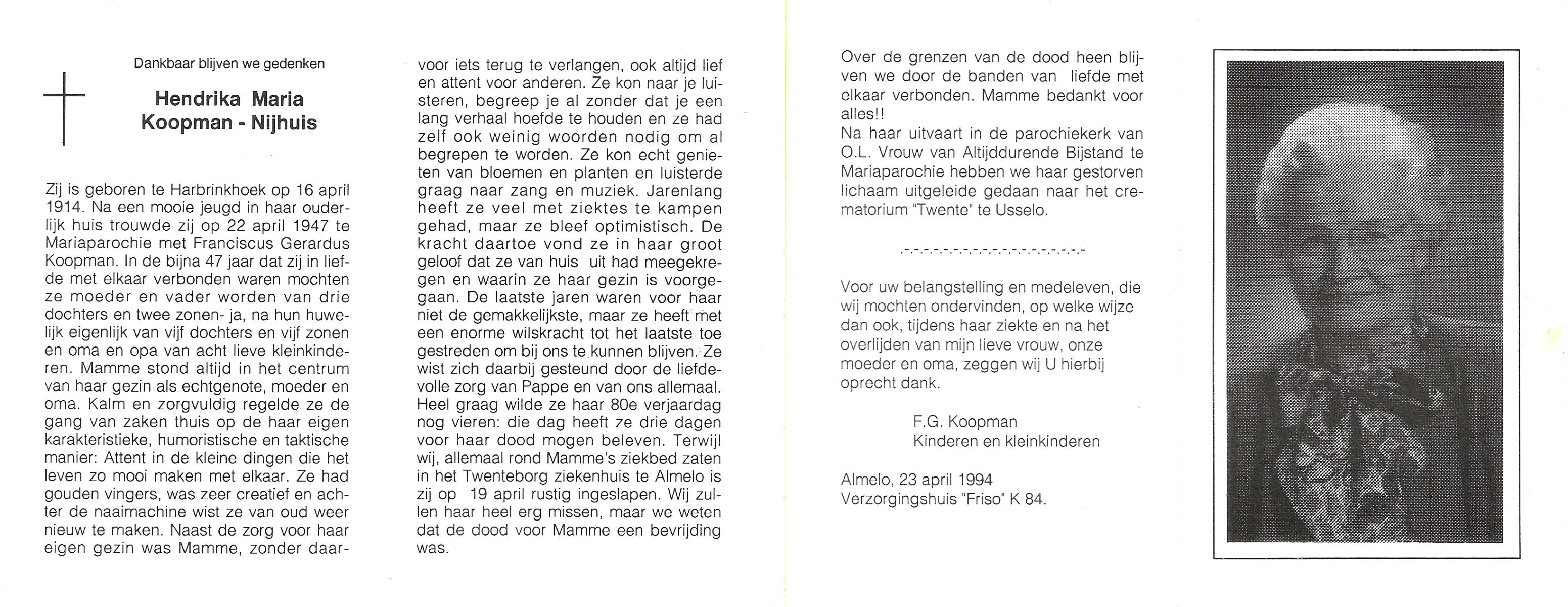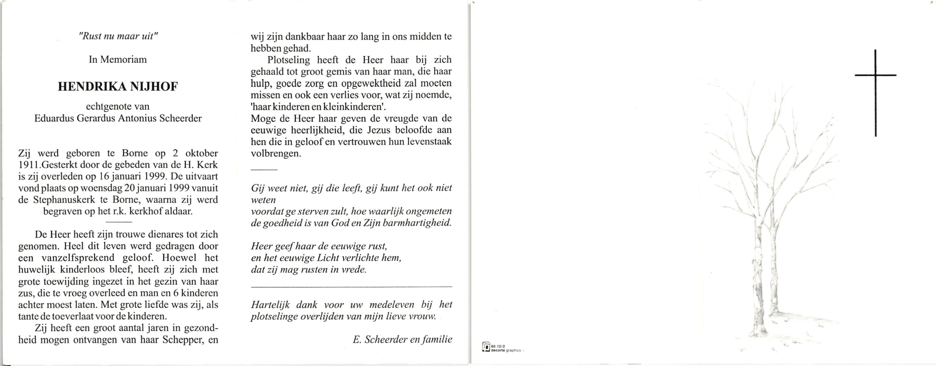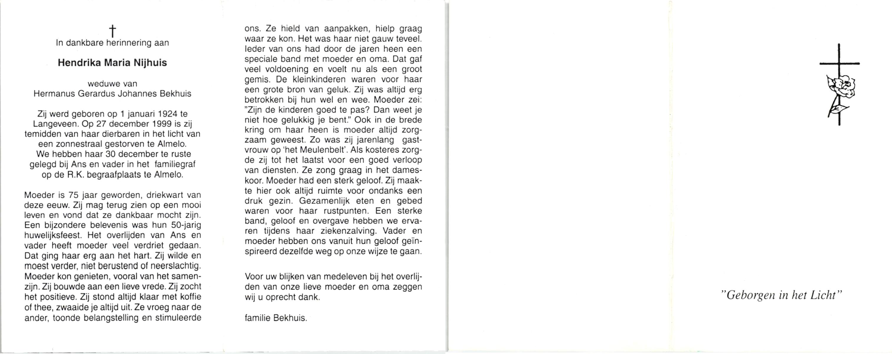 NIJHUIS, , Hendrika Maria, geboren op 1-1-1924 te Langeveen, overleden op 27-12-1999 te Almelo op 75-jarige leeftijd, begraven op 30-12-1999 te Almelo, rk.